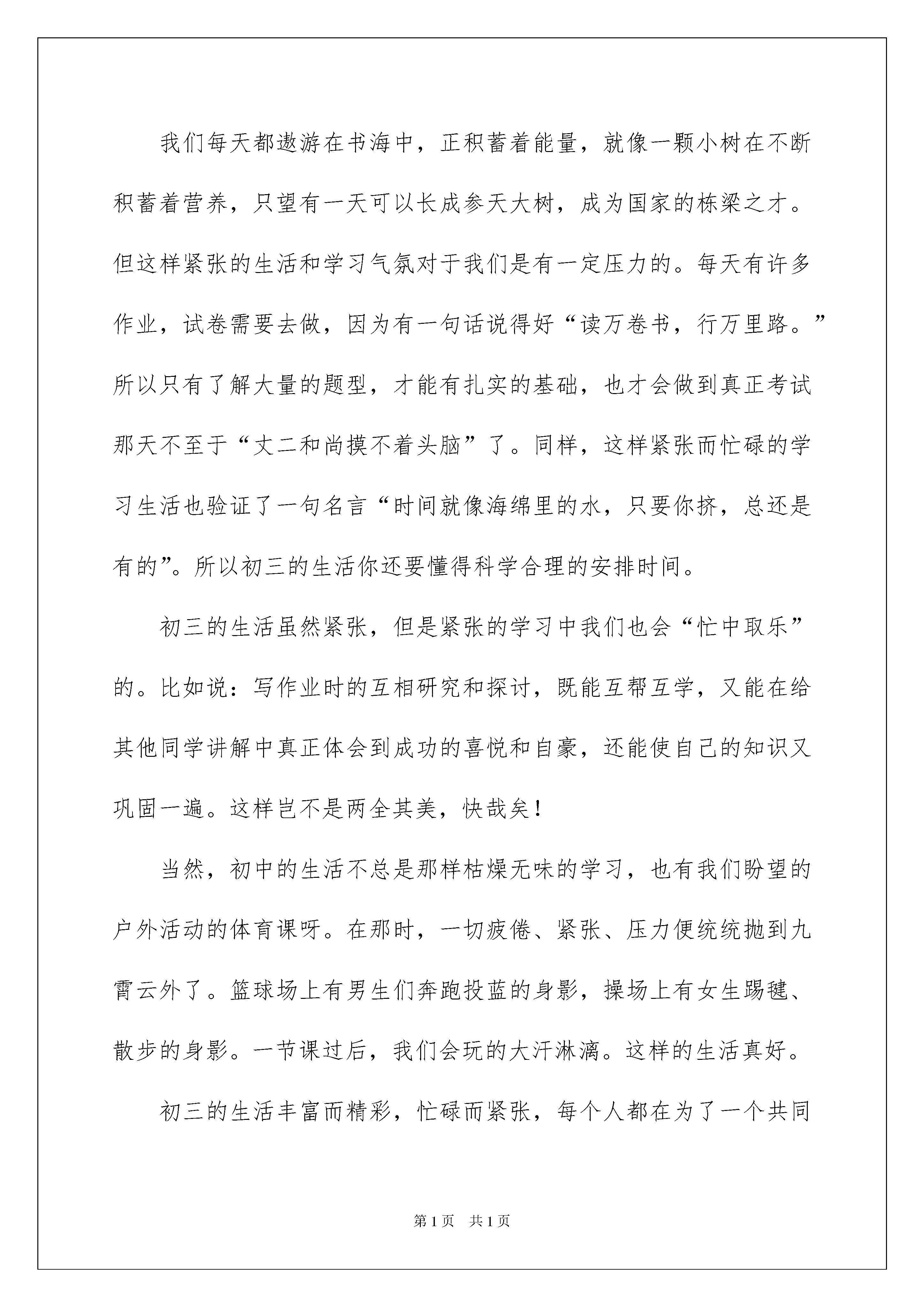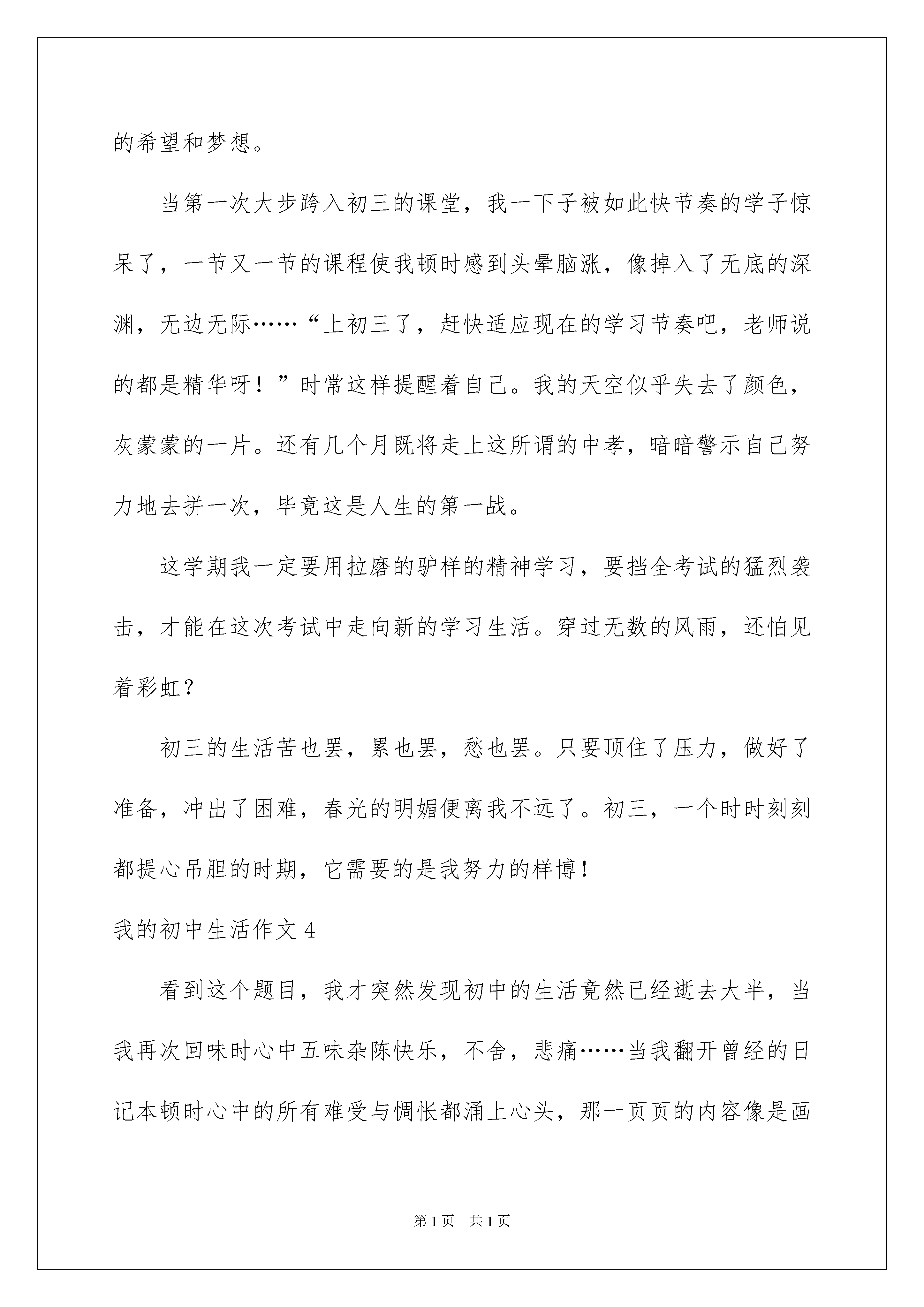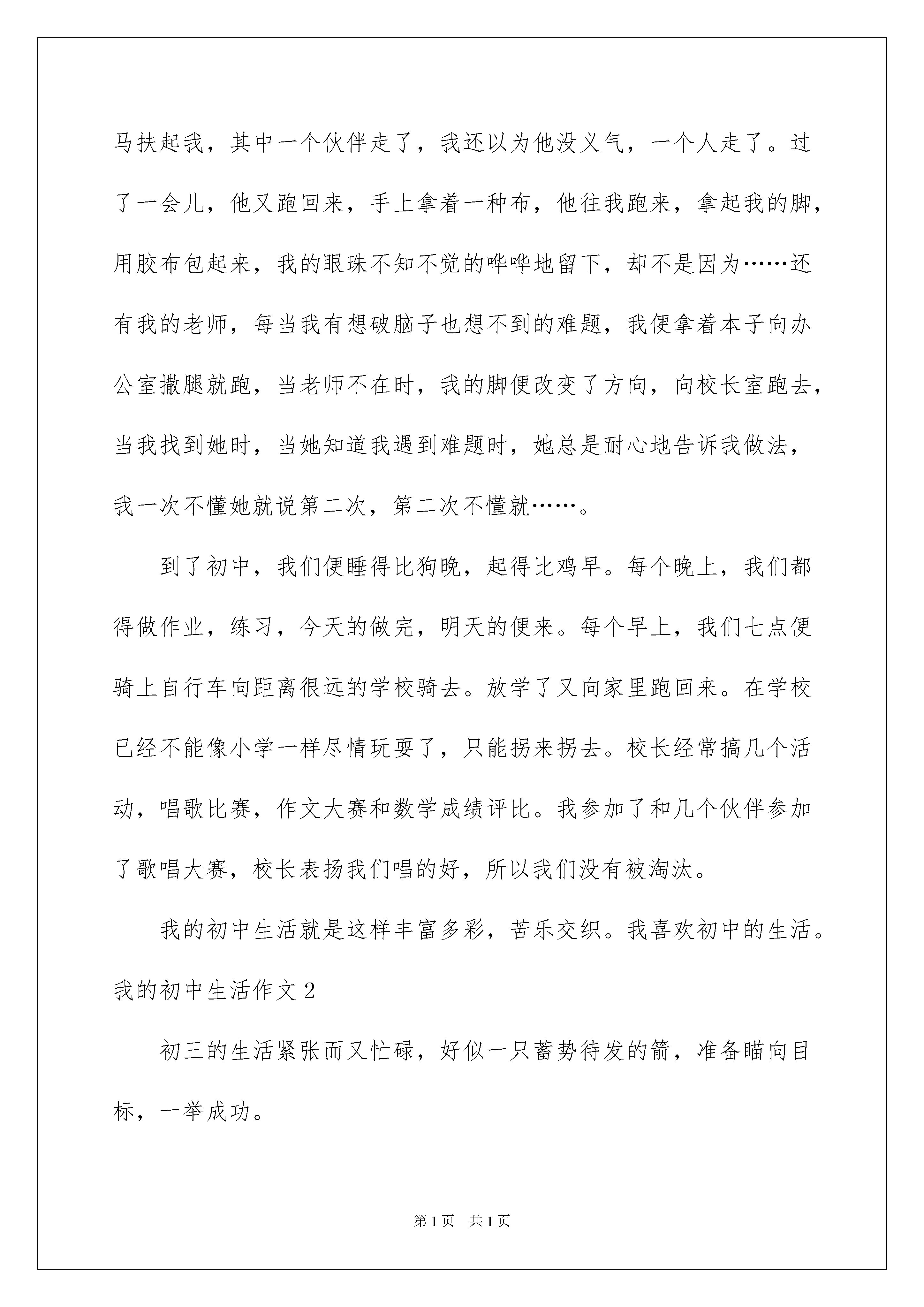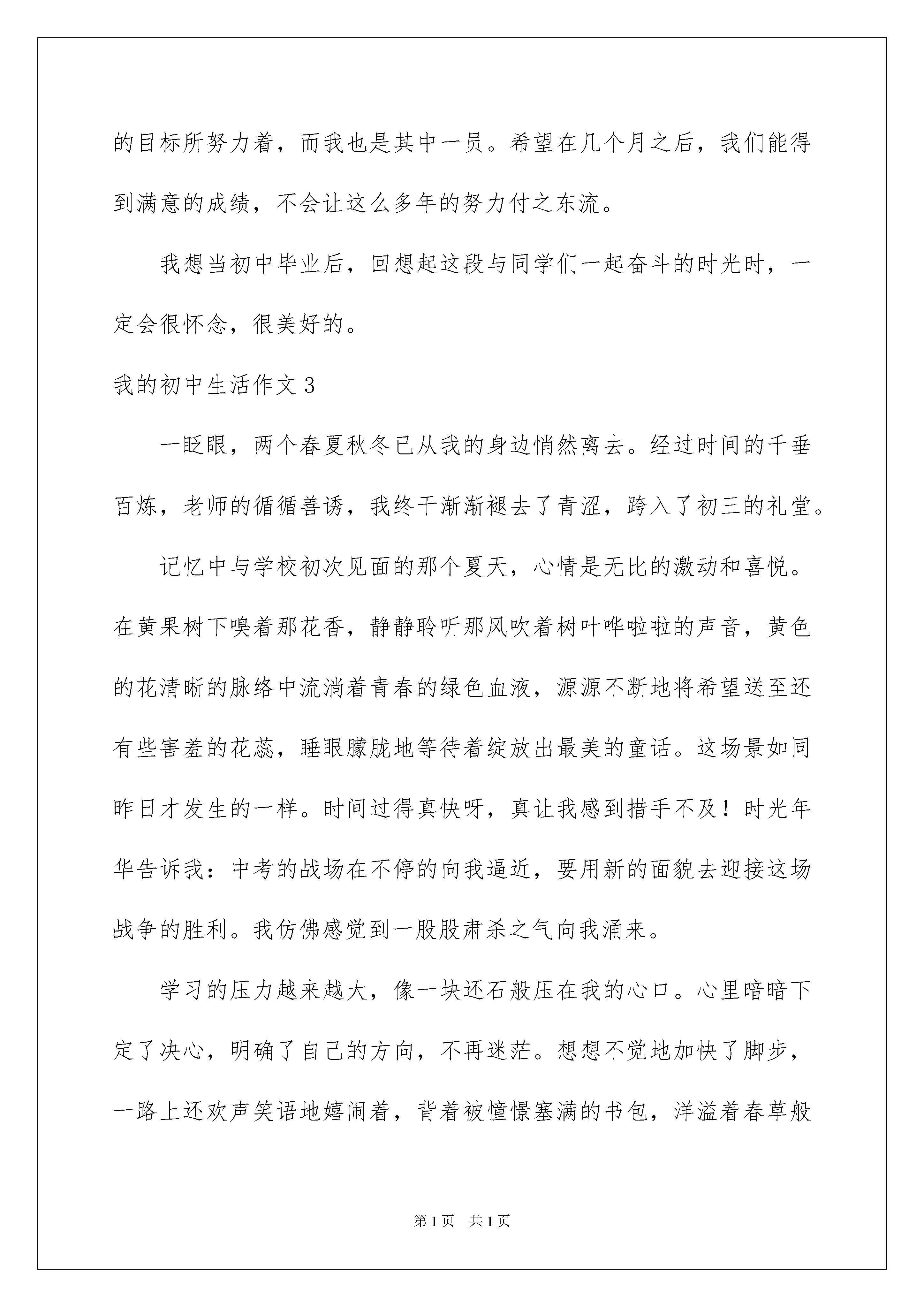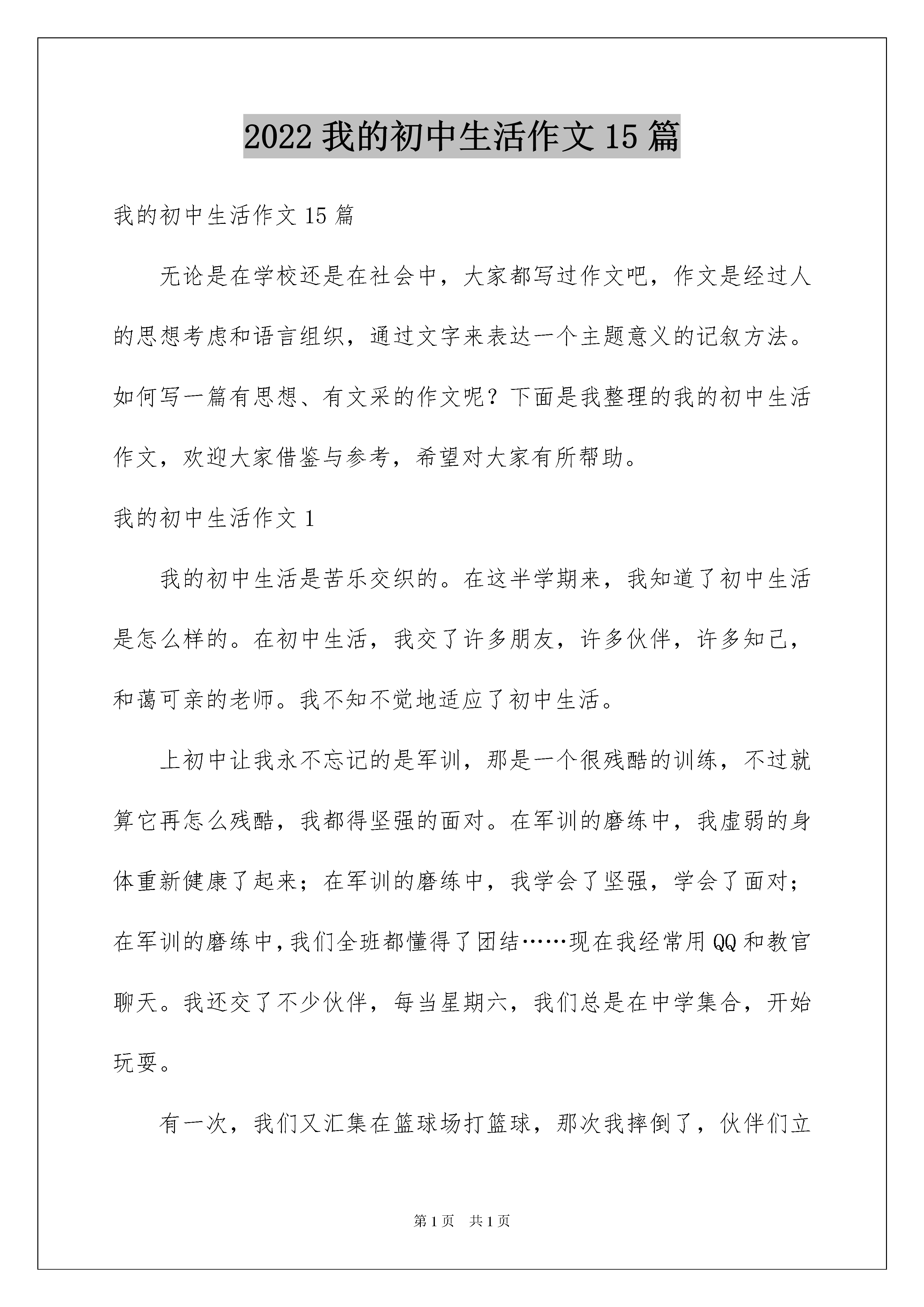 2022我的初中生活作文15篇我的初中生活作文15篇无论是在学校还是在社会中,大家都写过作文吧,作文是经过人的思想考虑和语言组织,通过文字来表达一个主题意义的记叙方法。如何写一篇有思想、有文采的作文呢?下面是我整理的我的初中生活作文,欢迎大家借鉴与参考,希望对大家有所帮助。我的初中生活作文1我的初中生活是苦乐交织的。在这半学期来,我知道了初中生活是怎么样的。在初中生活,我交了许多朋友,许多伙伴,许多知己,和蔼可亲的老师。我不知不觉地适应了初中生活。上初中让我永不忘记的是军训,那是一个很残酷的训练,不过就算它再怎么残酷,我都得坚强的面对。在军训的磨练中,我虚弱的身体重新健康了起来;在军训的磨练中,我学会了坚强,学会了面对;在军训的磨练中,我们全班都懂得了团结……现在我经常用QQ和教官聊天。我还交了不少伙伴,每当星期六,我们总是在中学集合,开始玩耍。有一次,我们又汇集在篮球场打篮球,那次我摔倒了,伙伴们立马扶起我,其中一个伙伴走了,我还以为他没义气,一个人走了。过了一会儿,他又跑回来,手上拿着一种布,他往我跑来,拿起我的脚,用胶布包起来,我的眼珠不知不觉的哗哗地留下,却不是因为……还有我的老师,每当我有想破脑子也想不到的难题,我便拿着本子向办公室撒腿就跑,当老师不在时,我的脚便改变了方向,向校长室跑去,当我找到她时,当她知道我遇到难题时,她总是耐心地告诉我做法,我一次不懂她就说第二次,第二次不懂就……。到了初中,我们便睡得比狗晚,起得比鸡早。每个晚上,我们都得做作业,练习,今天的做完,明天的便来。每个早上,我们七点便骑上自行车向距离很远的学校骑去。放学了又向家里跑回来。在学校已经不能像小学一样尽情玩耍了,只能拐来拐去。校长经常搞几个活动,唱歌比赛,作文大赛和数学成绩评比。我参加了和几个伙伴参加了歌唱大赛,校长表扬我们唱的好,所以我们没有被淘汰。我的初中生活就是这样丰富多彩,苦乐交织。我喜欢初中的生活。我的初中生活作文2初三的生活紧张而又忙碌,好似一只蓄势待发的箭,准备瞄向目标,一举成功。我们每天都遨游在书海中,正积蓄着能量,就像一颗小树在不断积蓄着营养,只望有一天可以长成参天大树,成为国家的栋梁之才。但这样紧张的生活和学习气氛对于我们是有一定压力的。每天有许多作业,试卷需要去做,因为有一句话说得好“读万卷书,行万里路。”所以只有了解大量的题型,才能有扎实的基础,也才会做到真正考试那天不至于“丈二和尚摸不着头脑”了。同样,这样紧张而忙碌的学习生活也验证了一句名言“时间就像海绵里的水,只要你挤,总还是有的”。所以初三的生活你还要懂得科学合理的安排时间。初三的生活虽然紧张,但是紧张的学习中我们也会“忙中取乐”的。比如说:写作业时的互相研究和探讨,既能互帮互学,又能在给其他同学讲解中真正体会到成功的喜悦和自豪,还能使自己的知识又巩固一遍。这样岂不是两全其美,快哉矣!当然,初中的生活不总是那样枯燥无味的学习,也有我们盼望的户外活动的体育课呀。在那时,一切疲倦、紧张、压力便统统抛到九霄云外了。篮球场上有男生们奔跑投蓝的身影,操场上有女生踢毽、散步的身影。一节课过后,我们会玩的大汗淋漓。这样的生活真好。初三的生活丰富而精彩,忙碌而紧张,每个人都在为了一个共同的目标所努力着,而我也是其中一员。希望在几个月之后,我们能得到满意的成绩,不会让这么多年的努力付之东流。我想当初中毕业后,回想起这段与同学们一起奋斗的时光时,一定会很怀念,很美好的。我的初中生活作文3一眨眼,两个春夏秋冬已从我的身边悄然离去。经过时间的千垂百炼,老师的循循善诱,我终干渐渐褪去了青涩,跨入了初三的礼堂。记忆中与学校初次见面的那个夏天,心情是无比的激动和喜悦。在黄果树下嗅着那花香,静静聆听那风吹着树叶哗啦啦的声音,黄色的花清晰的脉络中流淌着青春的绿色血液,源源不断地将希望送至还有些害羞的花蕊,睡眼朦胧地等待着绽放出最美的童话。这场景如同昨日才发生的一样。时间过得真快呀,真让我感到措手不及!时光年华告诉我:中考的战场在不停的向我逼近,要用新的面貌去迎接这场战争的胜利。我仿佛感觉到一股股肃杀之气向我涌来。学习的压力越来越大,像一块还石般压在我的心口。心里暗暗下定了决心,明确了自己的方向,不再迷茫。想想不觉地加快了脚步,一路上还欢声笑语地嬉闹着,背着被憧憬塞满的书包,洋溢着春草般的希望和梦想。当第一次大步跨入初三的课堂,我一下子被如此快节奏的学子惊呆了,一节又一节的课程使我顿时感到头晕脑涨,像掉入了无底的深渊,无边无际……“上初三了,赶快适应现在的学习节奏吧,老师说的都是精华呀!”时常这样提醒着自己。我的天空似乎失去了颜色,灰蒙蒙