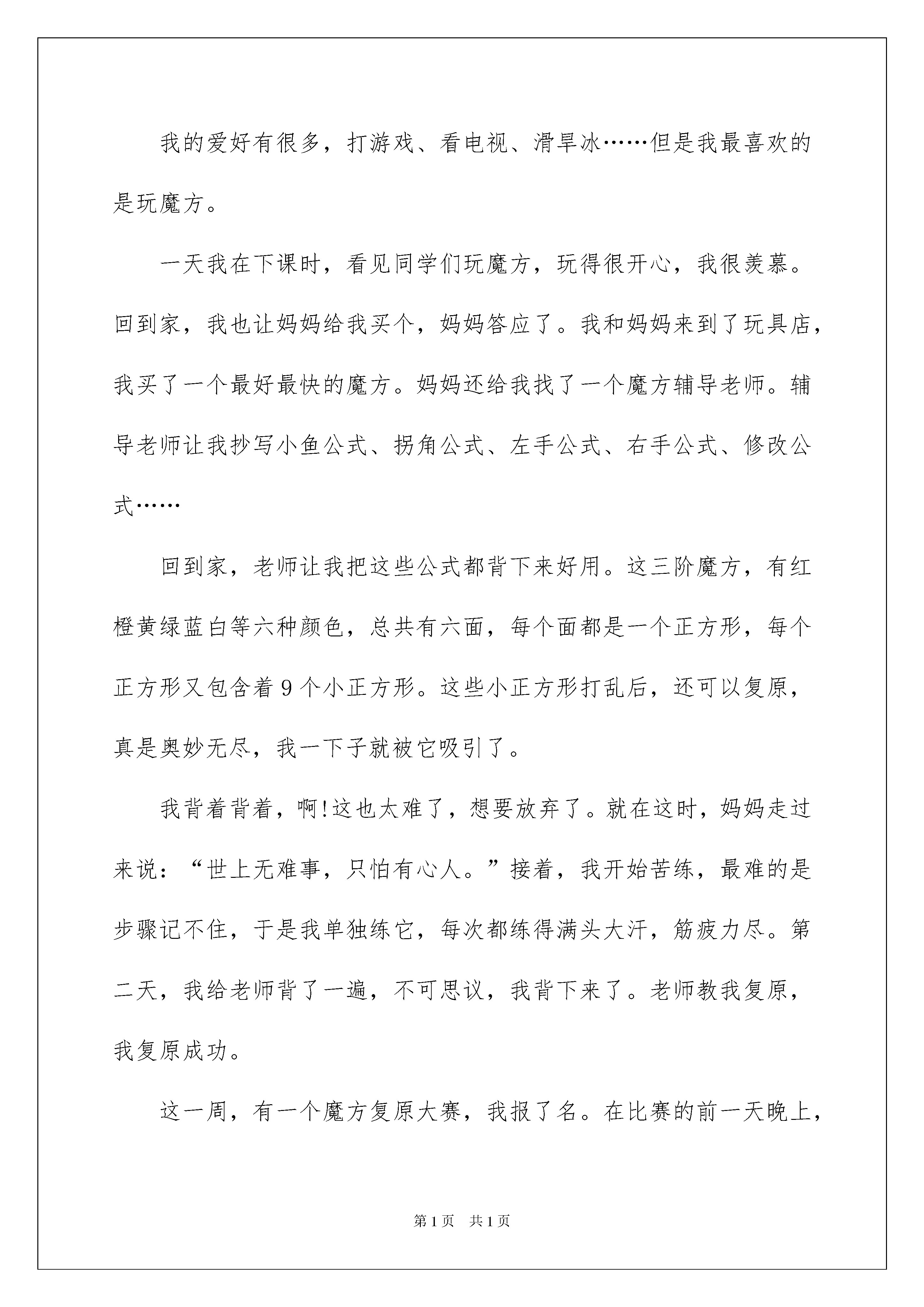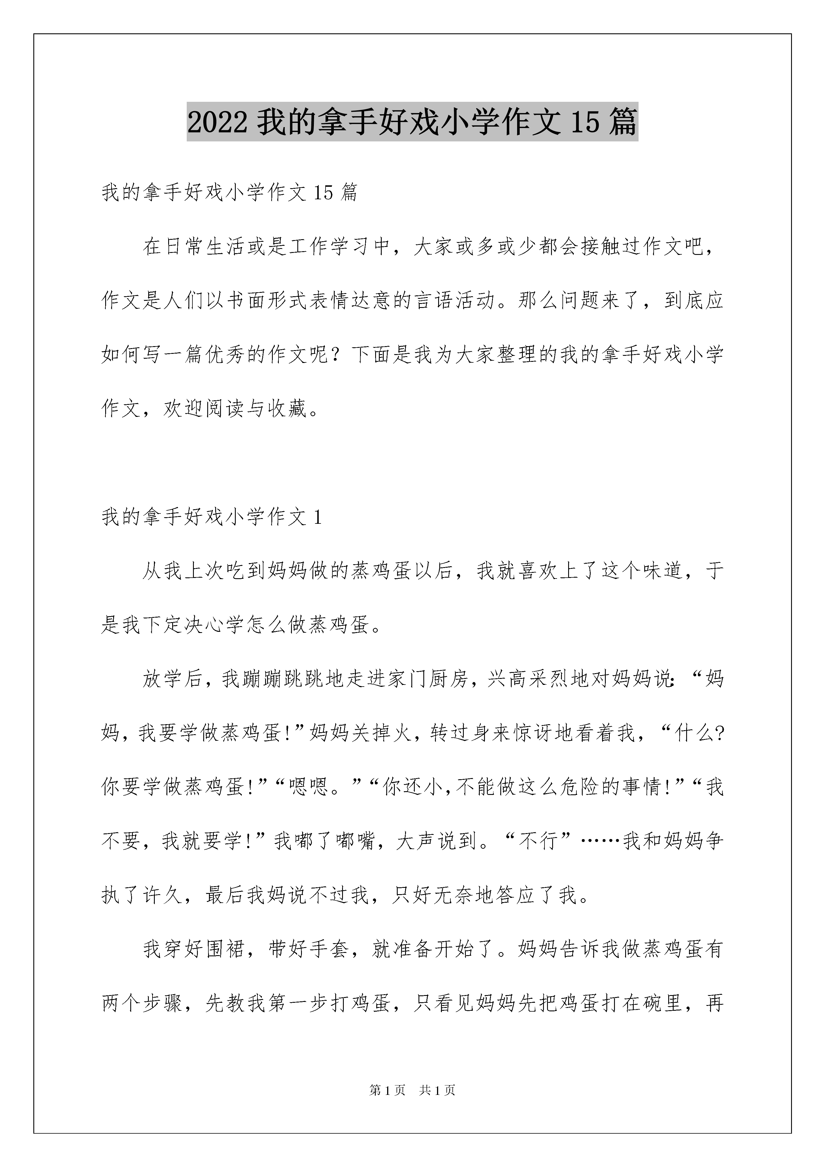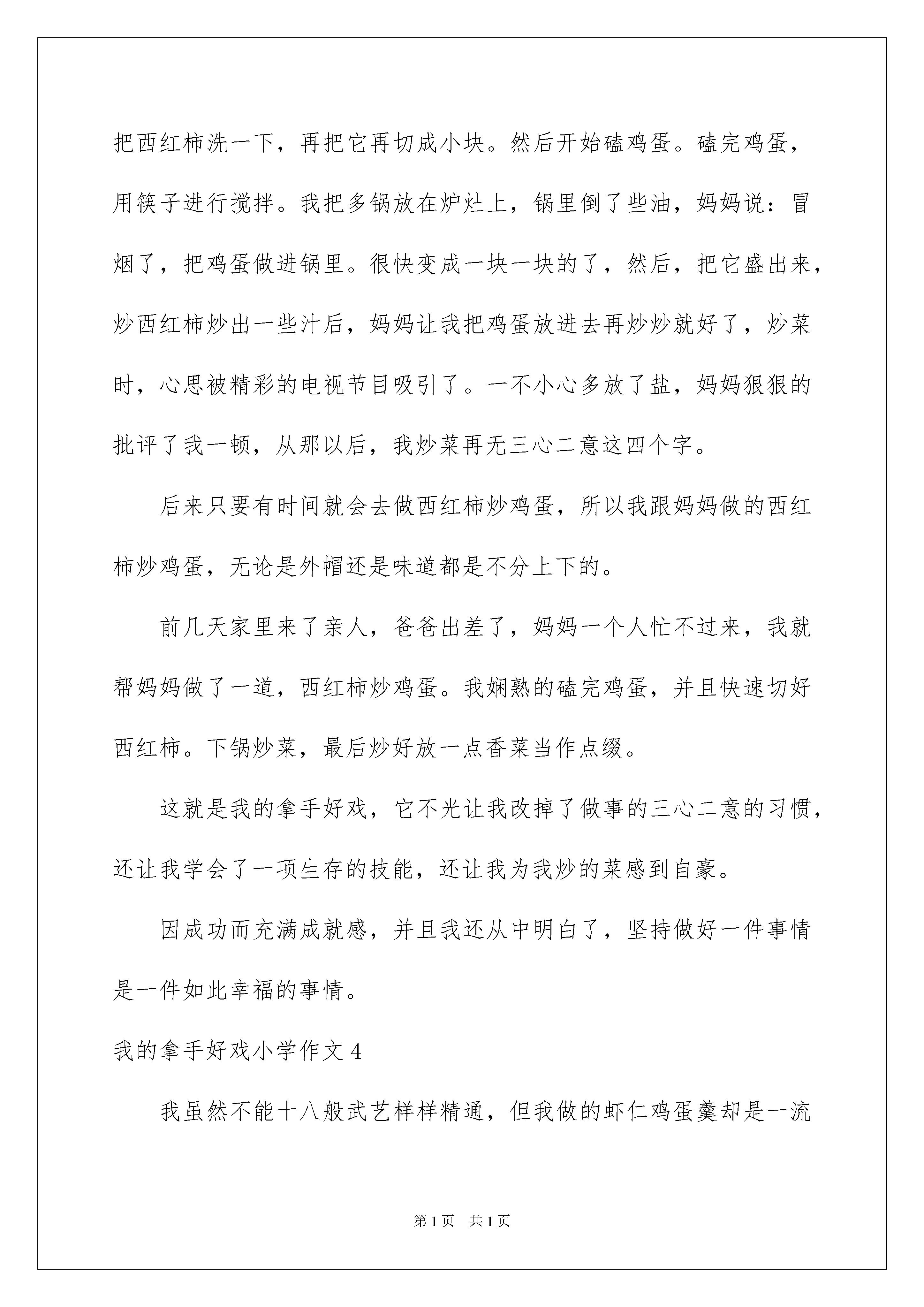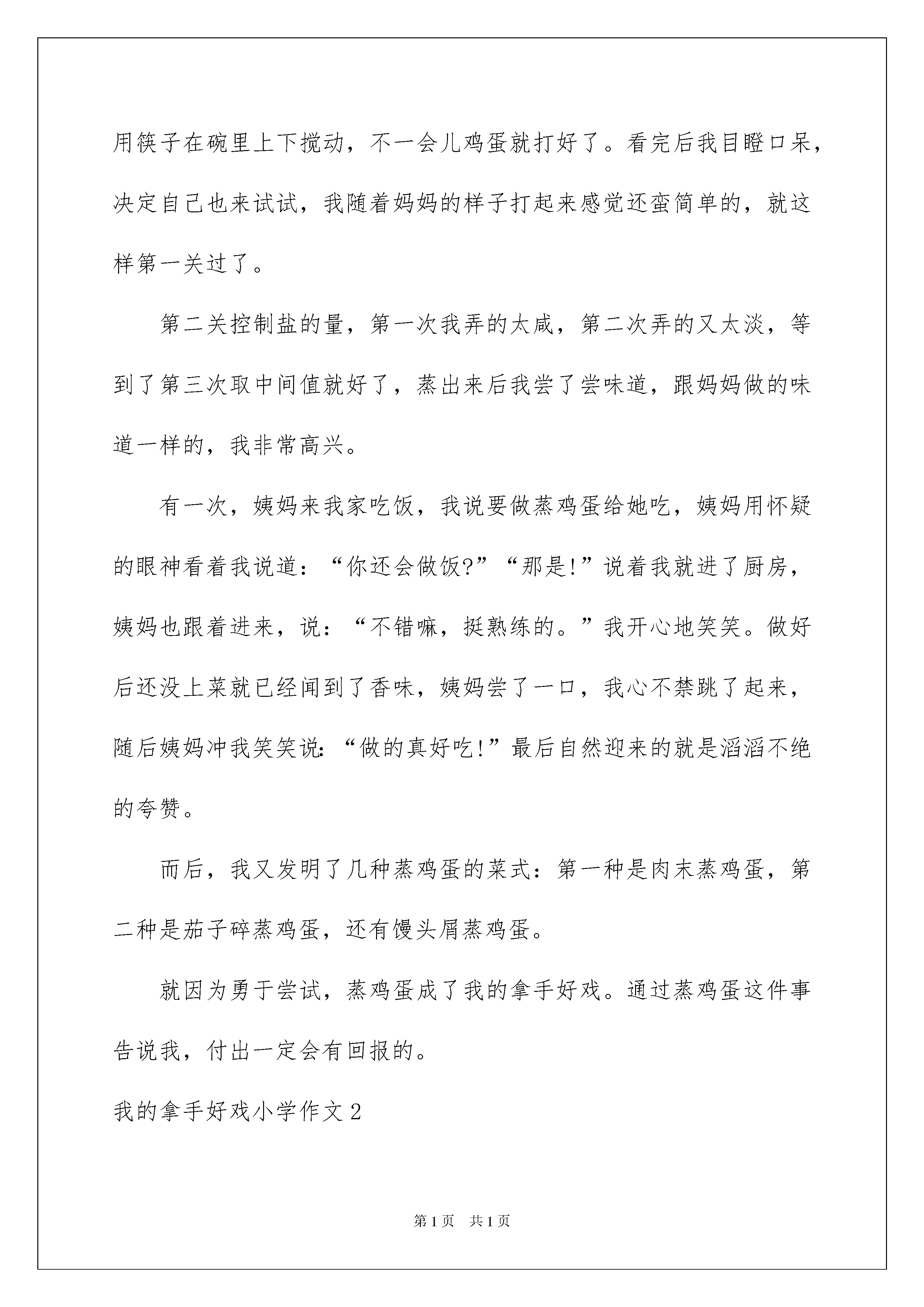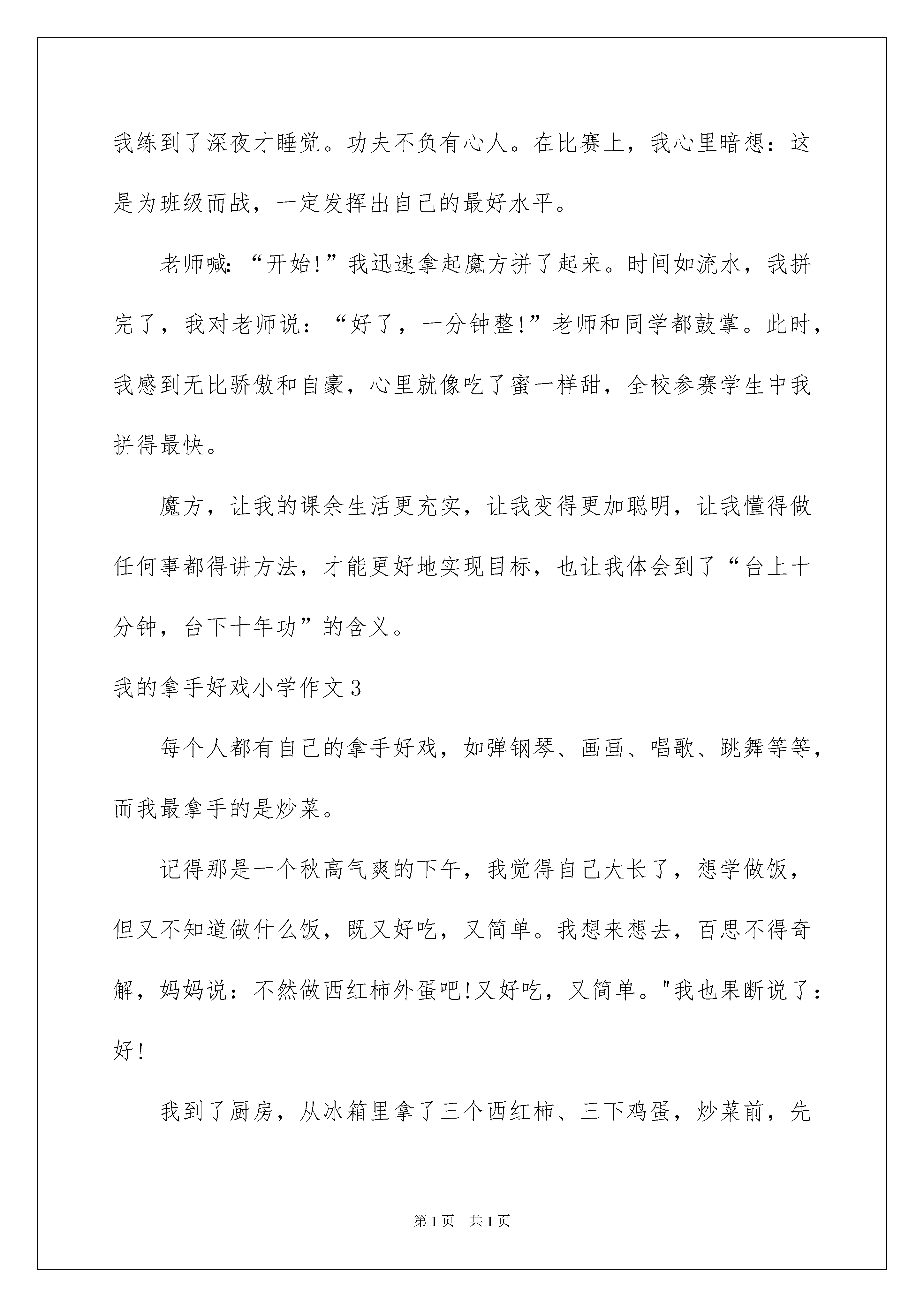 2022我的拿手好戏小学作文15篇我的拿手好戏小学作文15篇在日常生活或是工作学习中,大家或多或少都会接触过作文吧,作文是人们以书面形式表情达意的言语活动。那么问题来了,到底应如何写一篇优秀的作文呢?下面是我为大家整理的我的拿手好戏小学作文,欢迎阅读与收藏。我的拿手好戏小学作文1从我上次吃到妈妈做的蒸鸡蛋以后,我就喜欢上了这个味道,于是我下定决心学怎么做蒸鸡蛋。放学后,我蹦蹦跳跳地走进家门厨房,兴高采烈地对妈妈说:“妈妈,我要学做蒸鸡蛋!”妈妈关掉火,转过身来惊讶地看着我,“什么?你要学做蒸鸡蛋!”“嗯嗯。”“你还小,不能做这么危险的事情!”“我不要,我就要学!”我嘟了嘟嘴,大声说到。“不行”……我和妈妈争执了许久,最后我妈说不过我,只好无奈地答应了我。我穿好围裙,带好手套,就准备开始了。妈妈告诉我做蒸鸡蛋有两个步骤,先教我第一步打鸡蛋,只看见妈妈先把鸡蛋打在碗里,再用筷子在碗里上下搅动,不一会儿鸡蛋就打好了。看完后我目瞪口呆,决定自己也来试试,我随着妈妈的样子打起来感觉还蛮简单的,就这样第一关过了。第二关控制盐的量,第一次我弄的太咸,第二次弄的又太淡,等到了第三次取中间值就好了,蒸出来后我尝了尝味道,跟妈妈做的味道一样的,我非常高兴。有一次,姨妈来我家吃饭,我说要做蒸鸡蛋给她吃,姨妈用怀疑的眼神看着我说道:“你还会做饭?”“那是!”说着我就进了厨房,姨妈也跟着进来,说:“不错嘛,挺熟练的。”我开心地笑笑。做好后还没上菜就已经闻到了香味,姨妈尝了一口,我心不禁跳了起来,随后姨妈冲我笑笑说:“做的真好吃!”最后自然迎来的就是滔滔不绝的夸赞。而后,我又发明了几种蒸鸡蛋的菜式:第一种是肉末蒸鸡蛋,第二种是茄子碎蒸鸡蛋,还有馒头屑蒸鸡蛋。就因为勇于尝试,蒸鸡蛋成了我的拿手好戏。通过蒸鸡蛋这件事告说我,付出一定会有回报的。我的拿手好戏小学作文2我的爱好有很多,打游戏、看电视、滑旱冰……但是我最喜欢的是玩魔方。一天我在下课时,看见同学们玩魔方,玩得很开心,我很羡慕。回到家,我也让妈妈给我买个,妈妈答应了。我和妈妈来到了玩具店,我买了一个最好最快的魔方。妈妈还给我找了一个魔方辅导老师。辅导老师让我抄写小鱼公式、拐角公式、左手公式、右手公式、修改公式……回到家,老师让我把这些公式都背下来好用。这三阶魔方,有红橙黄绿蓝白等六种颜色,总共有六面,每个面都是一个正方形,每个正方形又包含着9个小正方形。这些小正方形打乱后,还可以复原,真是奥妙无尽,我一下子就被它吸引了。我背着背着,啊!这也太难了,想要放弃了。就在这时,妈妈走过来说:“世上无难事,只怕有心人。”接着,我开始苦练,最难的是步骤记不住,于是我单独练它,每次都练得满头大汗,筋疲力尽。第二天,我给老师背了一遍,不可思议,我背下来了。老师教我复原,我复原成功。这一周,有一个魔方复原大赛,我报了名。在比赛的前一天晚上,我练到了深夜才睡觉。功夫不负有心人。在比赛上,我心里暗想:这是为班级而战,一定发挥出自己的最好水平。老师喊:“开始!”我迅速拿起魔方拼了起来。时间如流水,我拼完了,我对老师说:“好了,一分钟整!”老师和同学都鼓掌。此时,我感到无比骄傲和自豪,心里就像吃了蜜一样甜,全校参赛学生中我拼得最快。魔方,让我的课余生活更充实,让我变得更加聪明,让我懂得做任何事都得讲方法,才能更好地实现目标,也让我体会到了“台上十分钟,台下十年功”的含义。我的拿手好戏小学作文3每个人都有自己的拿手好戏,如弹钢琴、画画、唱歌、跳舞等等,而我最拿手的是炒菜。记得那是一个秋高气爽的下午,我觉得自己大长了,想学做饭,但又不知道做什么饭,既又好吃,又简单。我想来想去,百思不得奇解,妈妈说:不然做西红柿外蛋吧!又好吃,又简单。"我也果断说了:好!我到了厨房,从冰箱里拿了三个西红柿、三下鸡蛋,炒菜前,先把西红柿洗一下,再把它再切成小块。然后开始磕鸡蛋。磕完鸡蛋,用筷子进行搅拌。我把多锅放在炉灶上,锅里倒了些油,妈妈说:冒烟了,把鸡蛋做进锅里。很快变成一块一块的了,然后,把它盛出来,炒西红柿炒出一些汁后,妈妈让我把鸡蛋放进去再炒炒就好了,炒菜时,心思被精彩的电视节目吸引了。一不小心多放了盐,妈妈狠狠的批评了我一顿,从那以后,我炒菜再无三心二意这四个字。后来只要有时间就会去做西红柿炒鸡蛋,所以我跟妈妈做的西红柿炒鸡蛋,无论是外帽还是味道都是不分上下的。前几天家里来了亲人,爸爸出差了,妈妈一个人忙不过来,我就帮妈妈做了一道,西红柿炒鸡蛋。我娴熟的磕完鸡蛋,并且快速切好西红柿。下锅炒菜,最后炒好放一点香菜当作点缀。这就是我的拿手好戏,它不光让我改掉了做事的三心二意的习惯,还让我
