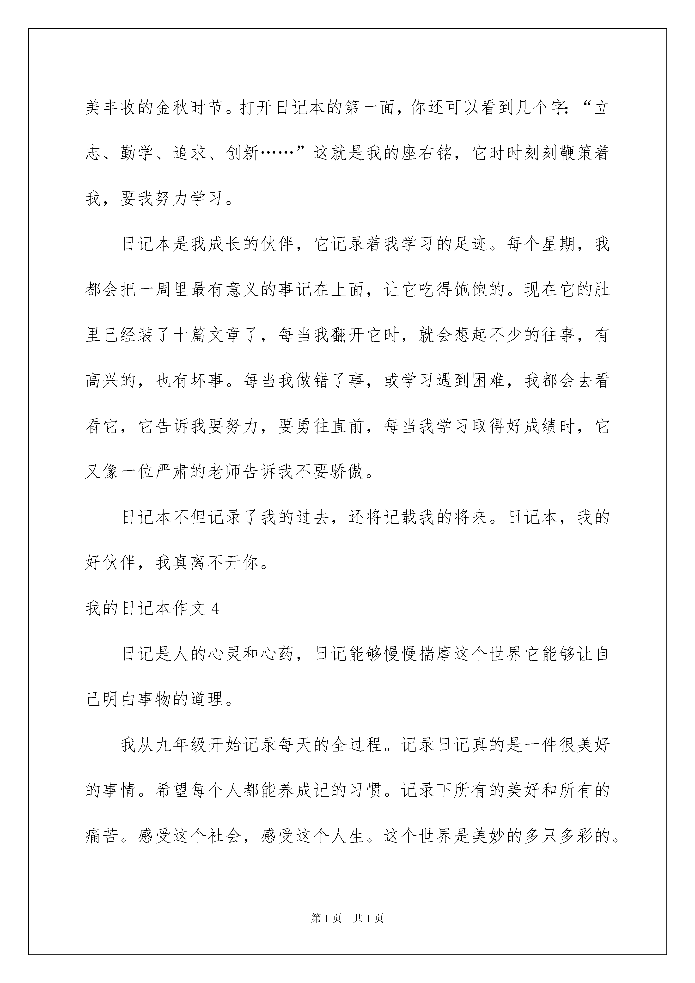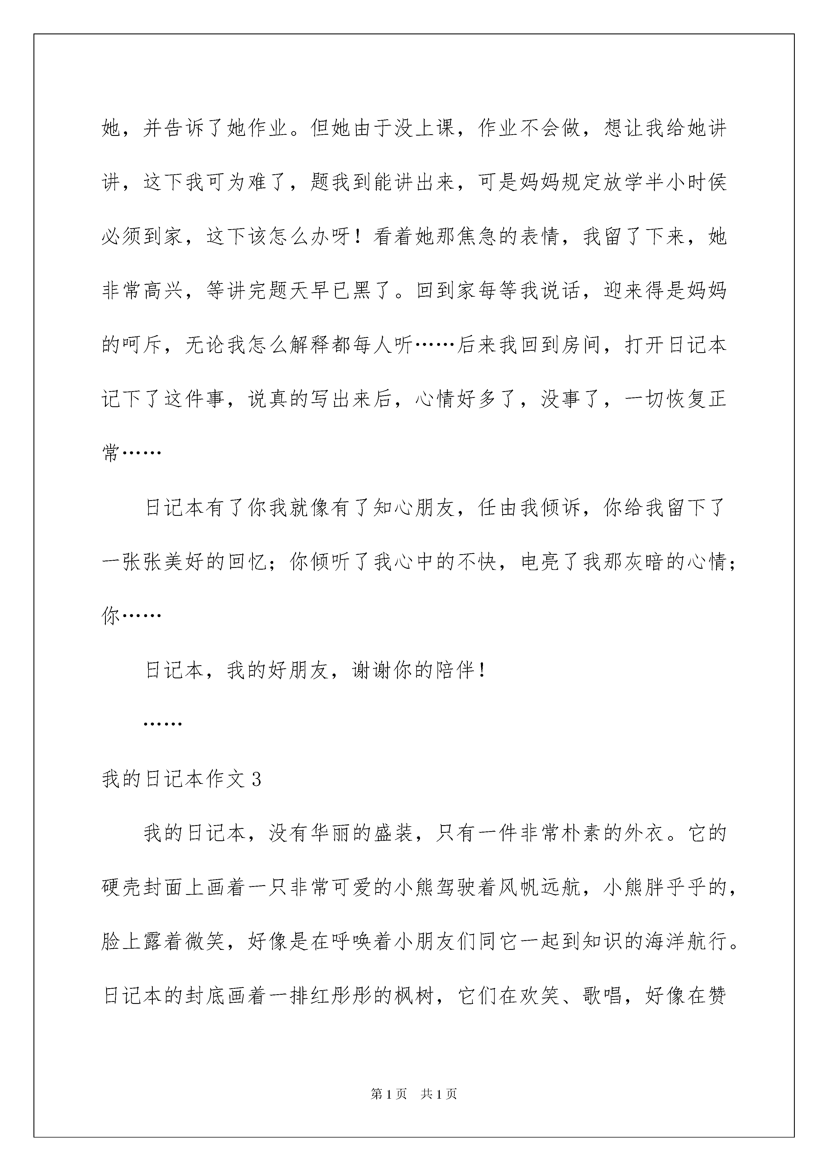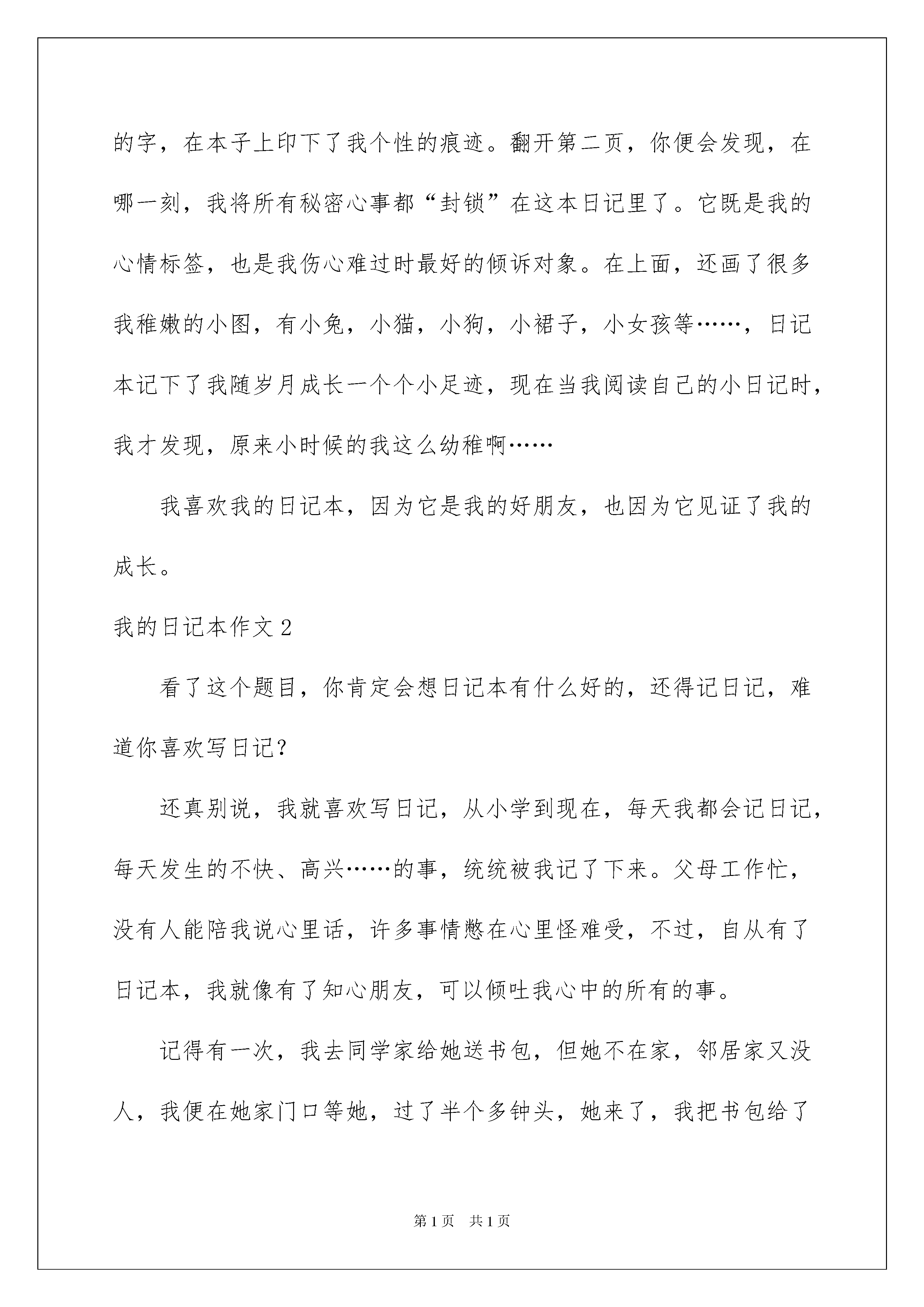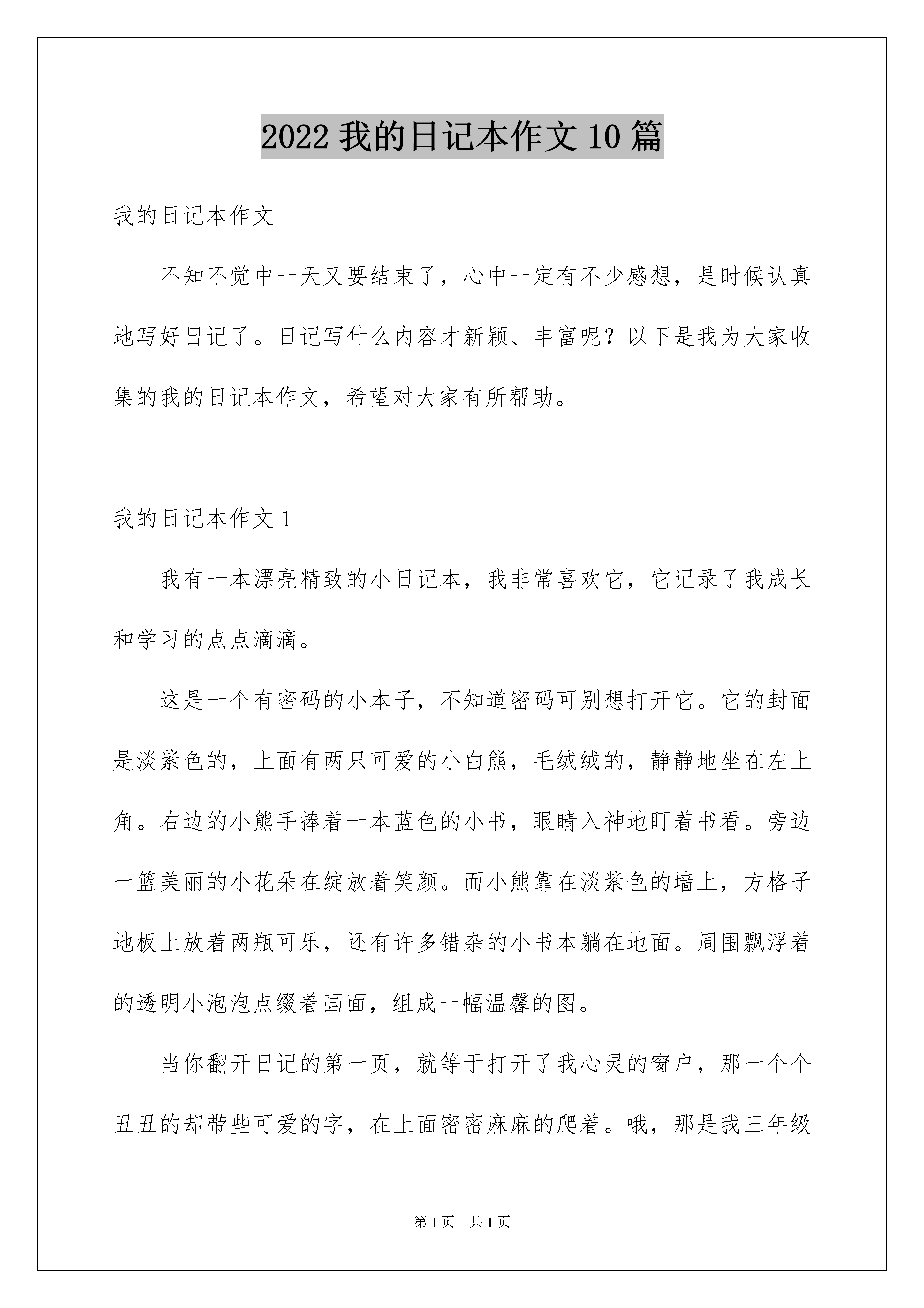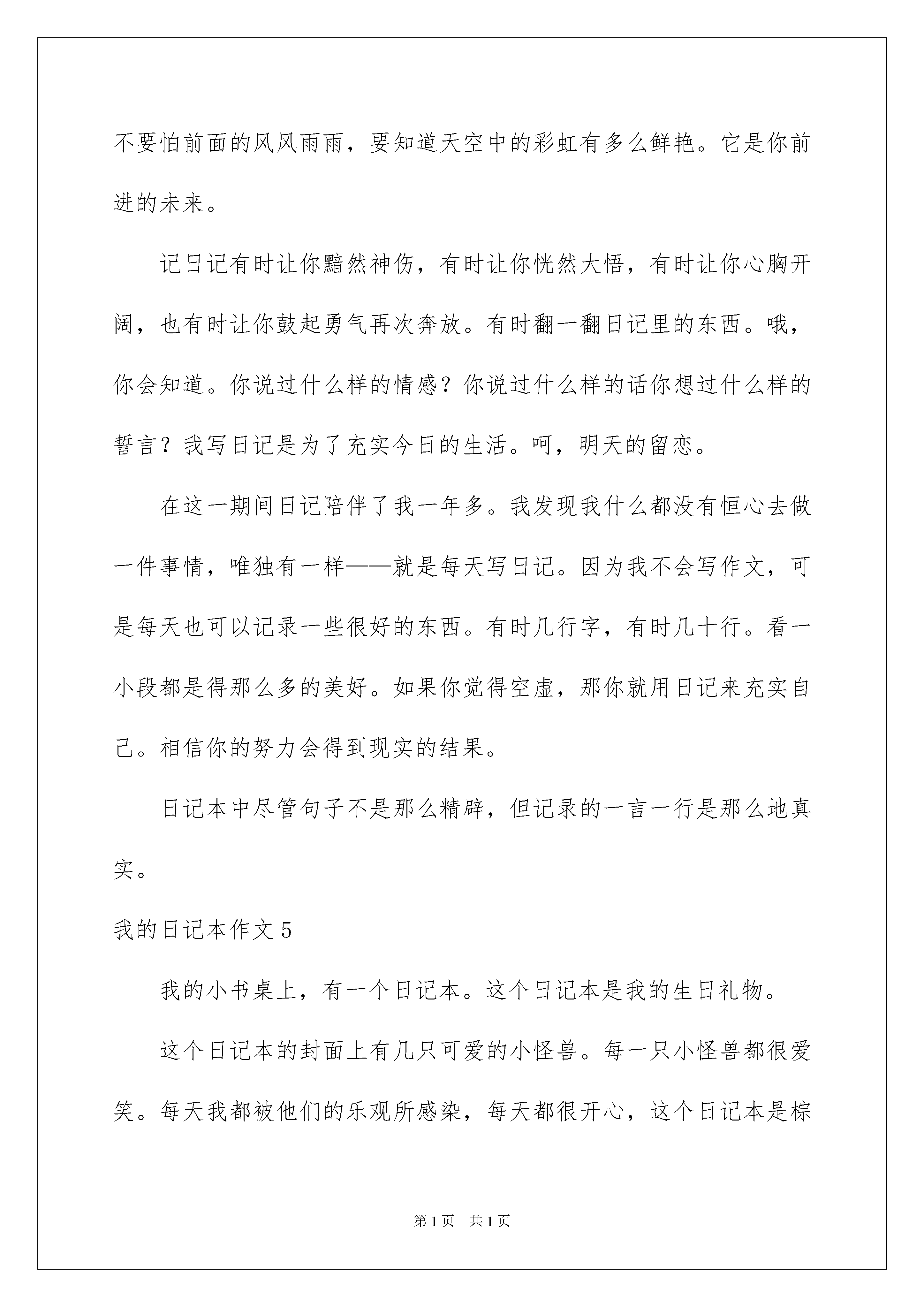 2022我的日记本作文10篇我的日记本作文不知不觉中一天又要结束了,心中一定有不少感想,是时候认真地写好日记了。日记写什么内容才新颖、丰富呢?以下是我为大家收集的我的日记本作文,希望对大家有所帮助。我的日记本作文1我有一本漂亮精致的小日记本,我非常喜欢它,它记录了我成长和学习的点点滴滴。这是一个有密码的小本子,不知道密码可别想打开它。它的封面是淡紫色的,上面有两只可爱的小白熊,毛绒绒的,静静地坐在左上角。右边的小熊手捧着一本蓝色的小书,眼睛入神地盯着书看。旁边一篮美丽的小花朵在绽放着笑颜。而小熊靠在淡紫色的墙上,方格子地板上放着两瓶可乐,还有许多错杂的小书本躺在地面。周围飘浮着的透明小泡泡点缀着画面,组成一幅温馨的图。当你翻开日记的第一页,就等于打开了我心灵的窗户,那一个个丑丑的却带些可爱的字,在上面密密麻麻的爬着。哦,那是我三年级的字,在本子上印下了我个性的痕迹。翻开第二页,你便会发现,在哪一刻,我将所有秘密心事都“封锁”在这本日记里了。它既是我的心情标签,也是我伤心难过时最好的倾诉对象。在上面,还画了很多我稚嫩的小图,有小兔,小猫,小狗,小裙子,小女孩等……,日记本记下了我随岁月成长一个个小足迹,现在当我阅读自己的小日记时,我才发现,原来小时候的我这么幼稚啊……我喜欢我的日记本,因为它是我的好朋友,也因为它见证了我的成长。我的日记本作文2看了这个题目,你肯定会想日记本有什么好的,还得记日记,难道你喜欢写日记?还真别说,我就喜欢写日记,从小学到现在,每天我都会记日记,每天发生的不快、高兴……的事,统统被我记了下来。父母工作忙,没有人能陪我说心里话,许多事情憋在心里怪难受,不过,自从有了日记本,我就像有了知心朋友,可以倾吐我心中的所有的事。记得有一次,我去同学家给她送书包,但她不在家,邻居家又没人,我便在她家门口等她,过了半个多钟头,她来了,我把书包给了她,并告诉了她作业。但她由于没上课,作业不会做,想让我给她讲讲,这下我可为难了,题我到能讲出来,可是妈妈规定放学半小时侯必须到家,这下该怎么办呀!看着她那焦急的表情,我留了下来,她非常高兴,等讲完题天早已黑了。回到家每等我说话,迎来得是妈妈的呵斥,无论我怎么解释都每人听……后来我回到房间,打开日记本记下了这件事,说真的写出来后,心情好多了,没事了,一切恢复正常……日记本有了你我就像有了知心朋友,任由我倾诉,你给我留下了一张张美好的回忆;你倾听了我心中的不快,电亮了我那灰暗的心情;你……日记本,我的好朋友,谢谢你的陪伴!……我的日记本作文3我的日记本,没有华丽的盛装,只有一件非常朴素的外衣。它的硬壳封面上画着一只非常可爱的小熊驾驶着风帆远航,小熊胖乎乎的,脸上露着微笑,好像是在呼唤着小朋友们同它一起到知识的海洋航行。日记本的封底画着一排红彤彤的枫树,它们在欢笑、歌唱,好像在赞美丰收的金秋时节。打开日记本的第一面,你还可以看到几个字:“立志、勤学、追求、创新……”这就是我的座右铭,它时时刻刻鞭策着我,要我努力学习。日记本是我成长的伙伴,它记录着我学习的足迹。每个星期,我都会把一周里最有意义的事记在上面,让它吃得饱饱的。现在它的肚里已经装了十篇文章了,每当我翻开它时,就会想起不少的往事,有高兴的,也有坏事。每当我做错了事,或学习遇到困难,我都会去看看它,它告诉我要努力,要勇往直前,每当我学习取得好成绩时,它又像一位严肃的老师告诉我不要骄傲。日记本不但记录了我的过去,还将记载我的将来。日记本,我的好伙伴,我真离不开你。我的日记本作文4日记是人的心灵和心药,日记能够慢慢揣摩这个世界它能够让自己明白事物的道理。我从九年级开始记录每天的全过程。记录日记真的是一件很美好的事情。希望每个人都能养成记的习惯。记录下所有的美好和所有的痛苦。感受这个社会,感受这个人生。这个世界是美妙的多只多彩的。不要怕前面的风风雨雨,要知道天空中的彩虹有多么鲜艳。它是你前进的未来。记日记有时让你黯然神伤,有时让你恍然大悟,有时让你心胸开阔,也有时让你鼓起勇气再次奔放。有时翻一翻日记里的东西。哦,你会知道。你说过什么样的情感?你说过什么样的话你想过什么样的誓言?我写日记是为了充实今日的生活。呵,明天的留恋。在这一期间日记陪伴了我一年多。我发现我什么都没有恒心去做一件事情,唯独有一样——就是每天写日记。因为我不会写作文,可是每天也可以记录一些很好的东西。有时几行字,有时几十行。看一小段都是得那么多的美好。如果你觉得空虚,那你就用日记来充实自己。相信你的努力会得到现实的结果。日记本中尽管句子不是那么精辟,但记录的一言一行是那么地真实。我的日记本作文5我的小书桌上,有一