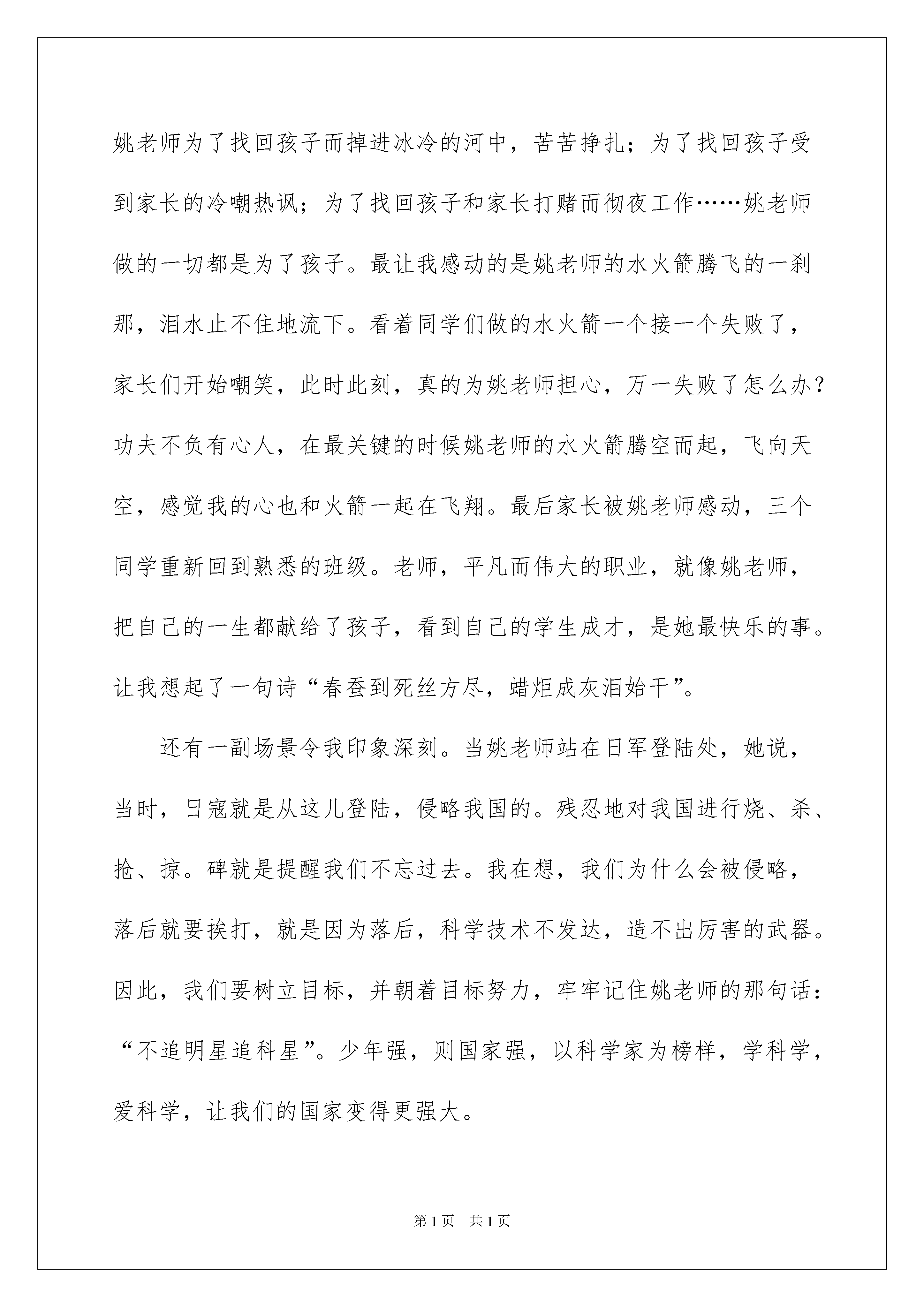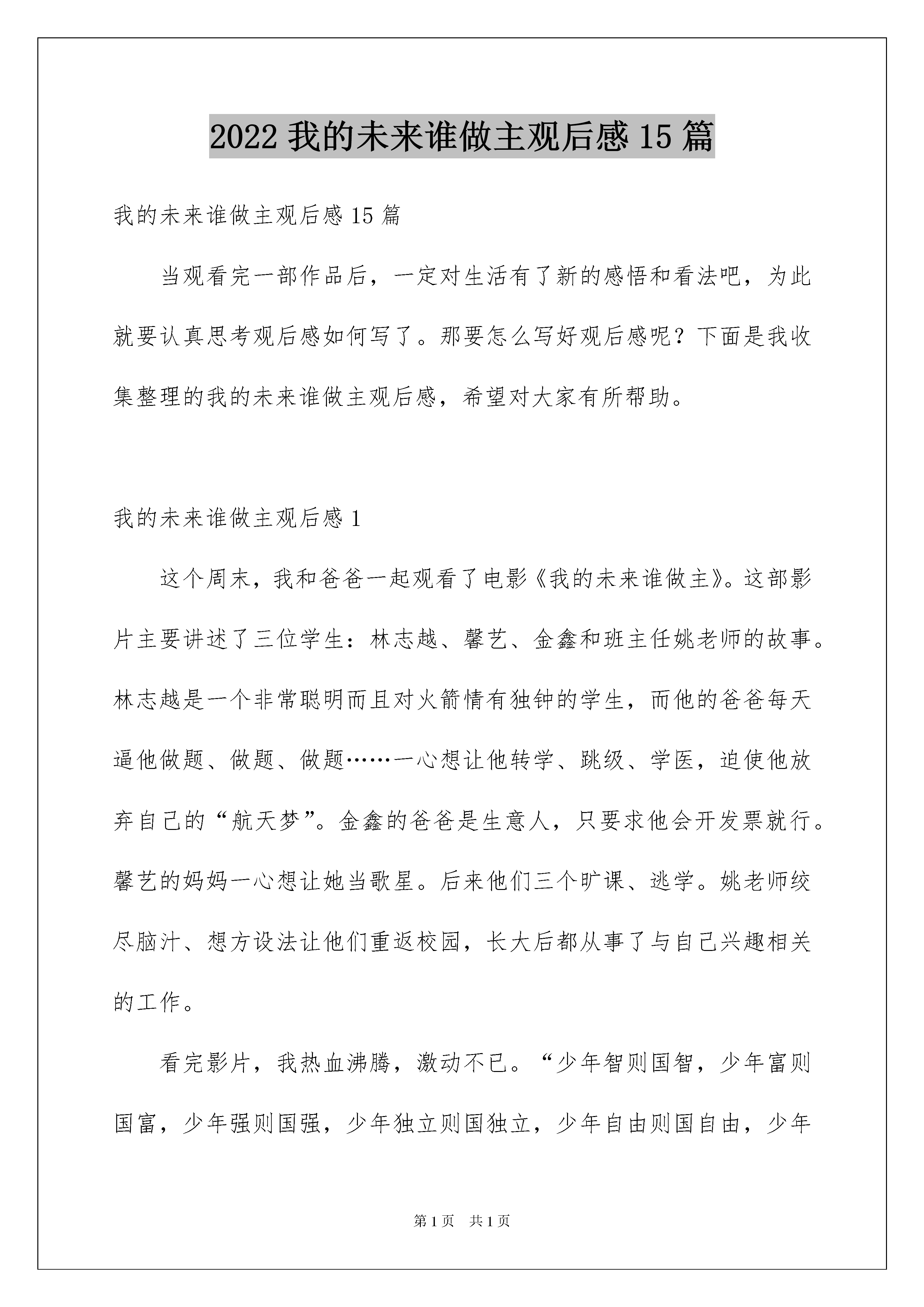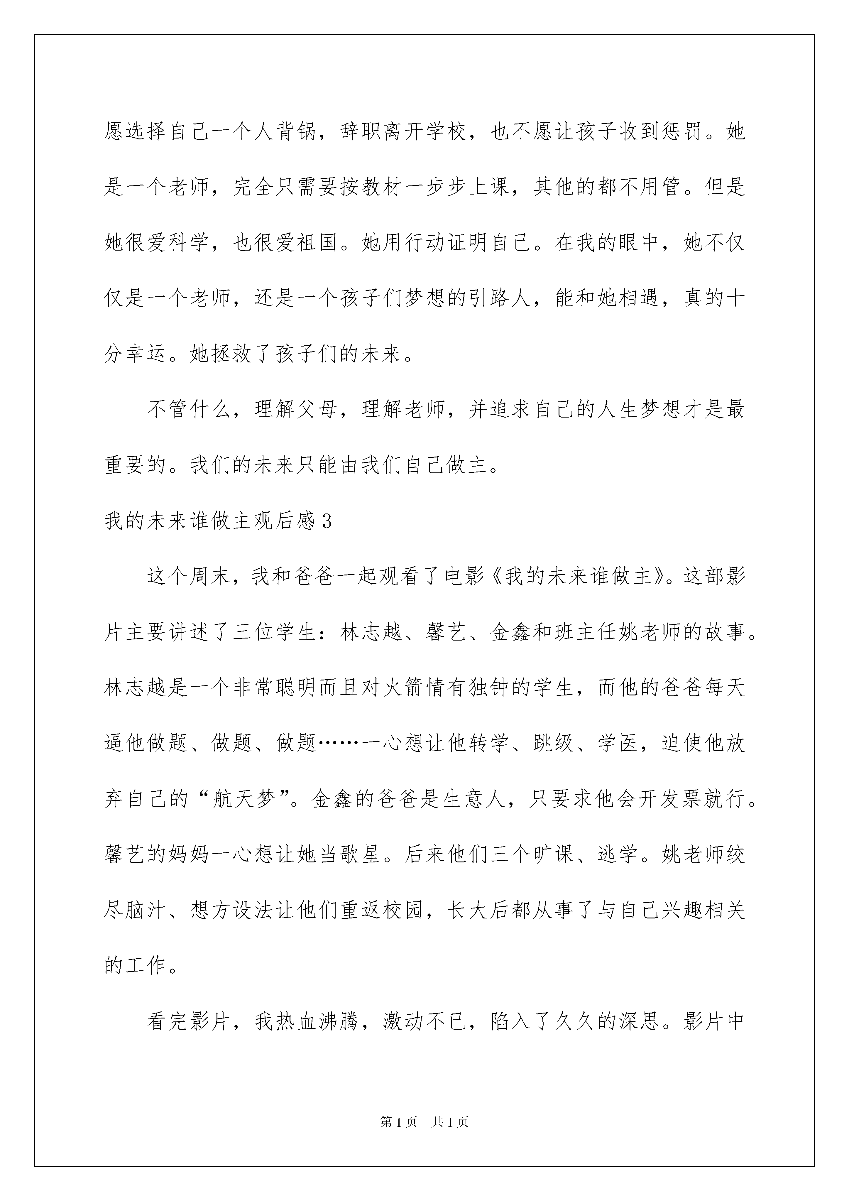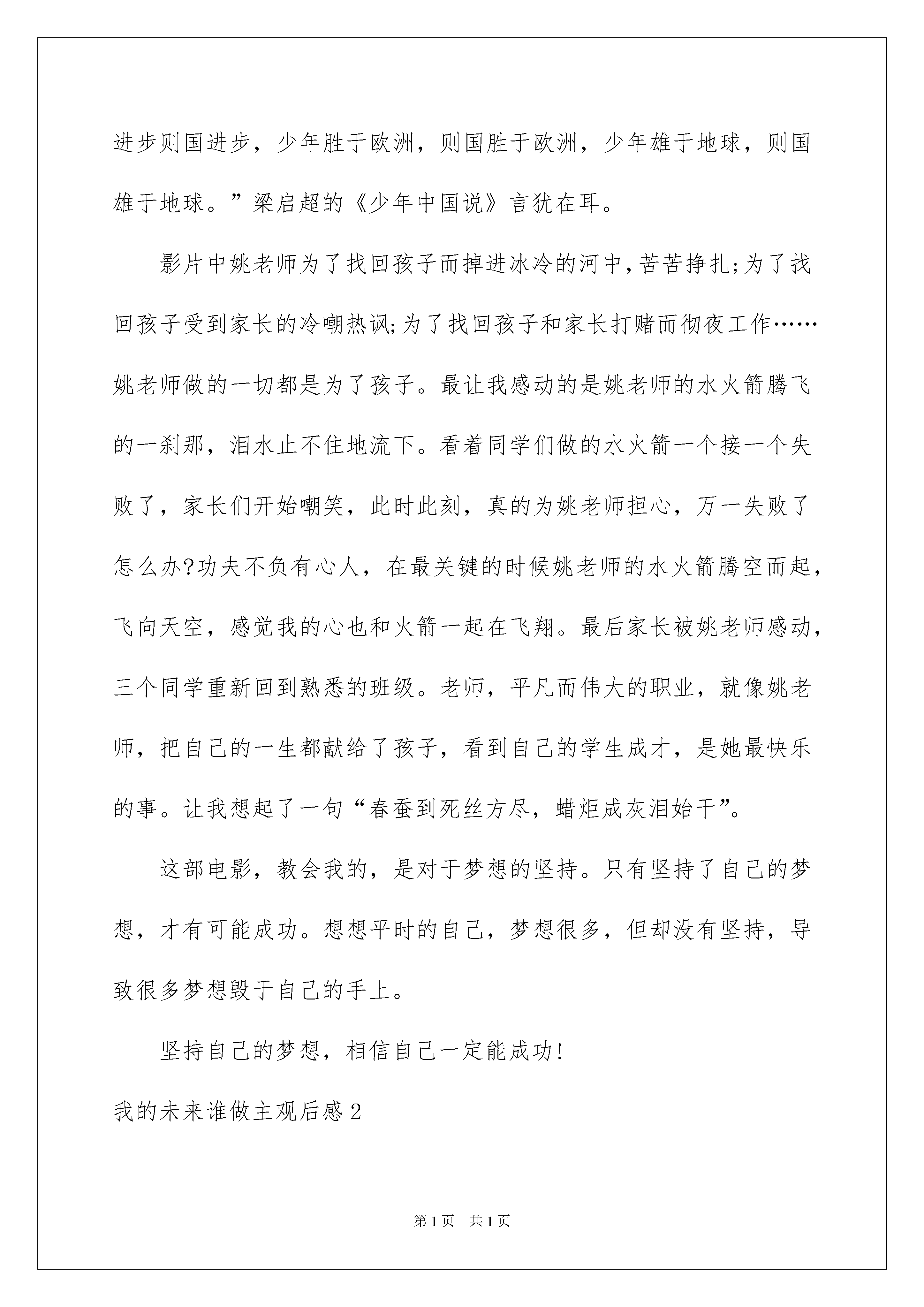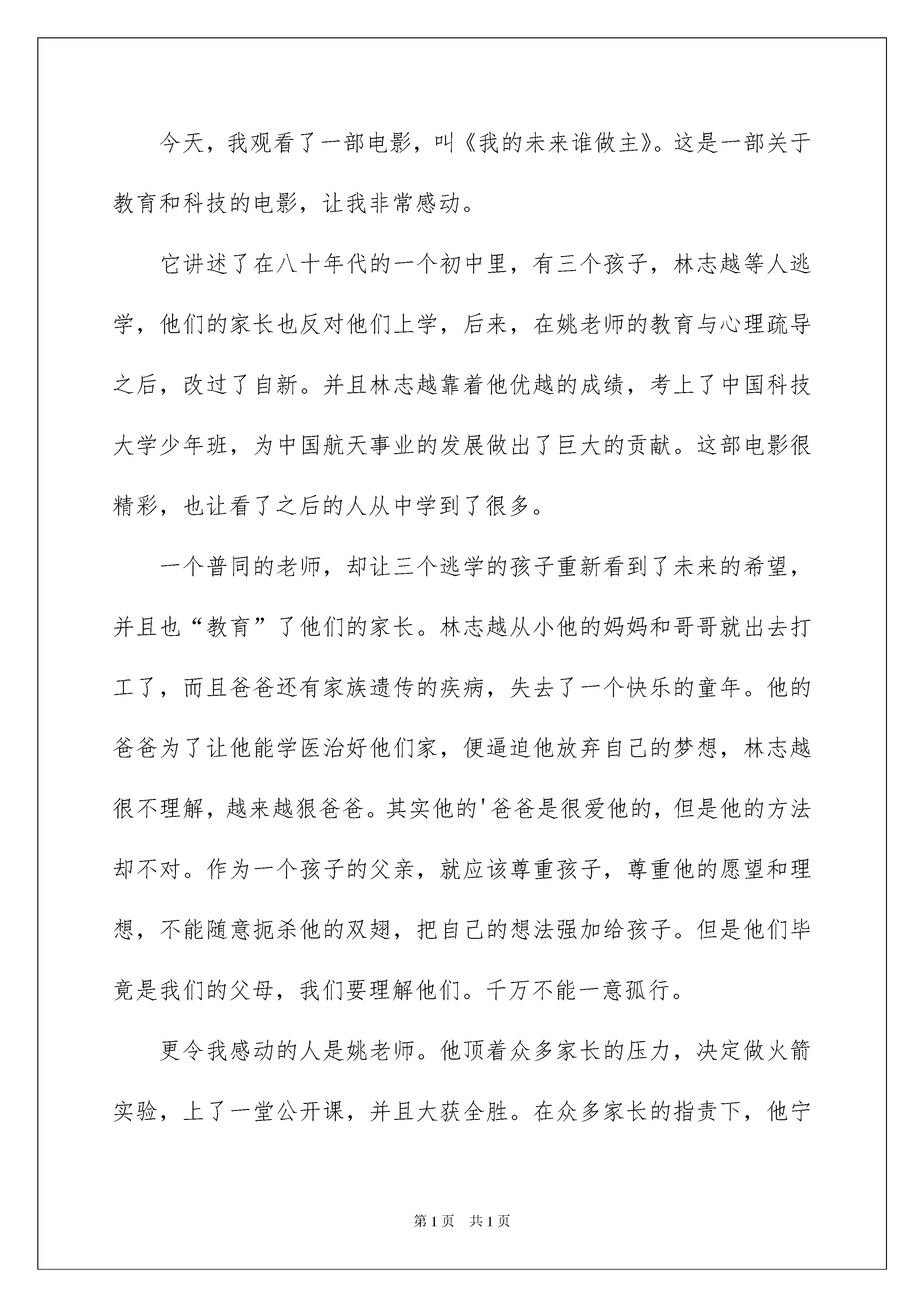 2022我的未来谁做主观后感15篇我的未来谁做主观后感15篇当观看完一部作品后,一定对生活有了新的感悟和看法吧,为此就要认真思考观后感如何写了。那要怎么写好观后感呢?下面是我收集整理的我的未来谁做主观后感,希望对大家有所帮助。我的未来谁做主观后感1这个周末,我和爸爸一起观看了电影《我的未来谁做主》。这部影片主要讲述了三位学生:林志越、馨艺、金鑫和班主任姚老师的故事。林志越是一个非常聪明而且对火箭情有独钟的学生,而他的爸爸每天逼他做题、做题、做题……一心想让他转学、跳级、学医,迫使他放弃自己的“航天梦”。金鑫的爸爸是生意人,只要求他会开发票就行。馨艺的妈妈一心想让她当歌星。后来他们三个旷课、逃学。姚老师绞尽脑汁、想方设法让他们重返校园,长大后都从事了与自己兴趣相关的工作。看完影片,我热血沸腾,激动不已。“少年智则国智,少年富则国富,少年强则国强,少年独立则国独立,少年自由则国自由,少年进步则国进步,少年胜于欧洲,则国胜于欧洲,少年雄于地球,则国雄于地球。”梁启超的《少年中国说》言犹在耳。影片中姚老师为了找回孩子而掉进冰冷的河中,苦苦挣扎;为了找回孩子受到家长的冷嘲热讽;为了找回孩子和家长打赌而彻夜工作……姚老师做的一切都是为了孩子。最让我感动的是姚老师的水火箭腾飞的一刹那,泪水止不住地流下。看着同学们做的水火箭一个接一个失败了,家长们开始嘲笑,此时此刻,真的为姚老师担心,万一失败了怎么办?功夫不负有心人,在最关键的时候姚老师的水火箭腾空而起,飞向天空,感觉我的心也和火箭一起在飞翔。最后家长被姚老师感动,三个同学重新回到熟悉的班级。老师,平凡而伟大的职业,就像姚老师,把自己的一生都献给了孩子,看到自己的学生成才,是她最快乐的事。让我想起了一句“春蚕到死丝方尽,蜡炬成灰泪始干”。这部电影,教会我的,是对于梦想的坚持。只有坚持了自己的梦想,才有可能成功。想想平时的自己,梦想很多,但却没有坚持,导致很多梦想毁于自己的手上。坚持自己的梦想,相信自己一定能成功!我的未来谁做主观后感2今天,我观看了一部电影,叫《我的未来谁做主》。这是一部关于教育和科技的电影,让我非常感动。它讲述了在八十年代的一个初中里,有三个孩子,林志越等人逃学,他们的家长也反对他们上学,后来,在姚老师的教育与心理疏导之后,改过了自新。并且林志越靠着他优越的成绩,考上了中国科技大学少年班,为中国航天事业的发展做出了巨大的贡献。这部电影很精彩,也让看了之后的人从中学到了很多。一个普同的老师,却让三个逃学的孩子重新看到了未来的希望,并且也“教育”了他们的家长。林志越从小他的妈妈和哥哥就出去打工了,而且爸爸还有家族遗传的疾病,失去了一个快乐的童年。他的爸爸为了让他能学医治好他们家,便逼迫他放弃自己的梦想,林志越很不理解,越来越狠爸爸。其实他的'爸爸是很爱他的,但是他的方法却不对。作为一个孩子的父亲,就应该尊重孩子,尊重他的愿望和理想,不能随意扼杀他的双翅,把自己的想法强加给孩子。但是他们毕竟是我们的父母,我们要理解他们。千万不能一意孤行。更令我感动的人是姚老师。他顶着众多家长的压力,决定做火箭实验,上了一堂公开课,并且大获全胜。在众多家长的指责下,他宁愿选择自己一个人背锅,辞职离开学校,也不愿让孩子收到惩罚。她是一个老师,完全只需要按教材一步步上课,其他的都不用管。但是她很爱科学,也很爱祖国。她用行动证明自己。在我的眼中,她不仅仅是一个老师,还是一个孩子们梦想的引路人,能和她相遇,真的十分幸运。她拯救了孩子们的未来。不管什么,理解父母,理解老师,并追求自己的人生梦想才是最重要的。我们的未来只能由我们自己做主。我的未来谁做主观后感3这个周末,我和爸爸一起观看了电影《我的未来谁做主》。这部影片主要讲述了三位学生:林志越、馨艺、金鑫和班主任姚老师的故事。林志越是一个非常聪明而且对火箭情有独钟的学生,而他的爸爸每天逼他做题、做题、做题……一心想让他转学、跳级、学医,迫使他放弃自己的“航天梦”。金鑫的爸爸是生意人,只要求他会开发票就行。馨艺的妈妈一心想让她当歌星。后来他们三个旷课、逃学。姚老师绞尽脑汁、想方设法让他们重返校园,长大后都从事了与自己兴趣相关的工作。看完影片,我热血沸腾,激动不已,陷入了久久的深思。影片中姚老师为了找回孩子而掉进冰冷的河中,苦苦挣扎;为了找回孩子受到家长的冷嘲热讽;为了找回孩子和家长打赌而彻夜工作……姚老师做的一切都是为了孩子。最让我感动的是姚老师的水火箭腾飞的一刹那,泪水止不住地流下。看着同学们做的水火箭一个接一个失败了,家长们开始嘲笑,此时此刻,真的为姚老师担心,万一失败了怎么办?功夫不负有心人,在最关