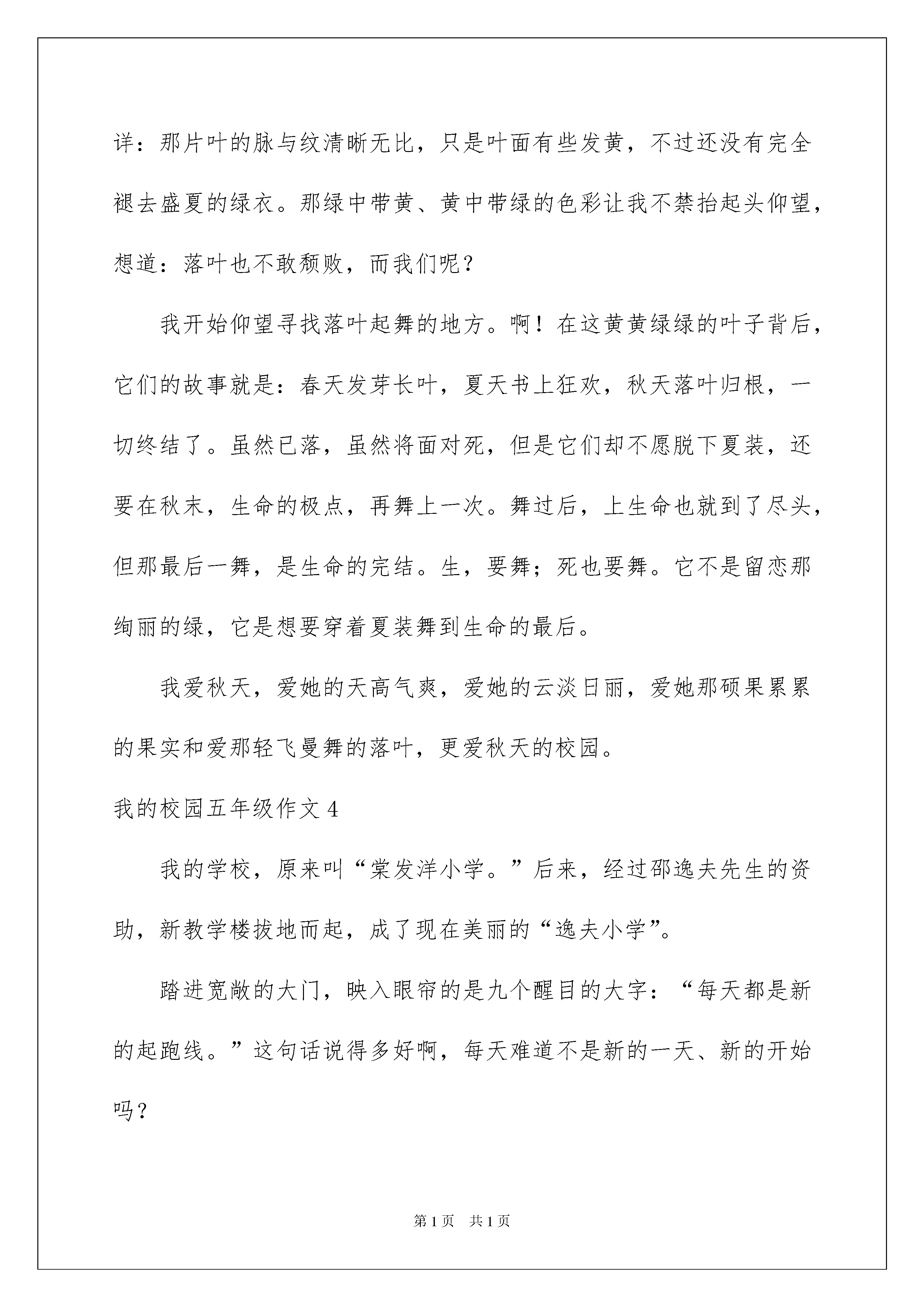 2022我的校园五年级作文我的校园五年级作文在学习、工作、生活中,大家总免不了要接触或使用作文吧,借助作文可以宣泄心中的情感,调节自己的心情。如何写一篇有思想、有文采的作文呢?下面是我帮大家整理的我的校园五年级作文,供大家参考借鉴,希望可以帮助到有需要的朋友。我的校园五年级作文1当明媚的阳光照到条条大路上时,当小鸟站在枝头歌唱时,当同学们的读书声响遍校园时,新的一天开始了。秋季到了,从树上掉下的落叶像一只只美丽的蝴蝶在空中翩翩飞舞,以前黄色的枫叶变成了现在的鲜艳红色枫叶,成群的大雁摆成了“人”字形飞向了南方。快到期中考试了,上课了,同学们认真学习老师所教的东西,一些不会的题则问老师。下课后,有的小组学习好的同学教学习比较差的同学他们不会的知识,有的小组呢,组长则领着组员们读文章中重要的部分。整个班级都构成了一道亮丽的风景?回家了,同学们写完作业后,不是疯跑着玩,而是在家里乖乖的复习重要的学习内容,要确保自己每一个知识点都会。早上来到学校时,同学们朗朗的读书声响遍了校园,那洪亮而又清晰的声音,听了真让人感到愉悦。值周教师和领导们也很辛苦,不管风吹雨淋,值周教师都按时的站在自己的岗位上。领导也很辛苦,每天都要管理学校的事情,根本没有空余的时间。这就是我的缤纷校园,是一个充满爱、充满幸福的地方,也是我们的第二个家。我的校园五年级作文2我有两个温馨的家——一个是我饮食起居的家,一个是我快乐学习的校园。我的校园位于洪濑镇中心,已有一百零五年的历史了,被人们成为“百年老校”。每个上学日,同学们来到可爱的校园,首先映入眼帘的,是校门口两边的一排排松柏。松柏像坚定的士兵,永远守卫着校园,向校园行着注目礼。一进入校园,就能看到同学们在做操和玩耍的操场,庄严的国旗台随之呈现在眼前。旗杆顶端的五星红旗随风飘扬,让人不由自由地为自己的祖国感到自豪。旗台周围就是一栋栋高达的教学楼,教学楼里,有一间间教室。教室里摆放着整齐的桌椅,同学们坐在自己的位置上,拿着书本,专心致志地朗诵课本,同学们的朗朗读书声令人陶醉。教学楼后面,偶一个小运动场,有单杠、有双杠、有乒乓球桌,课间与体育课,同学们都会来到这里玩耍。小运动场旁边有个小花园,里面有月季花,有茶花,还有桂花……红的像火,粉的如霞,白的像雪,黄的赛金……同学们每天给花儿浇水,施肥,精心呵护。这就是我的校园,它让我学习知识,畅游书海。我爱我的美丽校园!我的校园五年级作文3我的校园——合师附中。在这个美丽的校园里,树木自然会种有很多。比如银杏树、木棉花树和许多我并不知名的树。上体育课时,老师让我们班同学绕着足球场跑步。每当我们跑完步时,老师又让我们在足球场边缘的栏杆上压腿。在那一排栏杆的尽头,种着三棵大树。在我们压腿时,总是会有几片树叶伴随着风儿轻飞曼舞的为我们伴奏。忽地,一片叶!是一片落叶。我不由得仔细端详:那片叶的脉与纹清晰无比,只是叶面有些发黄,不过还没有完全褪去盛夏的绿衣。那绿中带黄、黄中带绿的色彩让我不禁抬起头仰望,想道:落叶也不敢颓败,而我们呢?我开始仰望寻找落叶起舞的地方。啊!在这黄黄绿绿的叶子背后,它们的故事就是:春天发芽长叶,夏天书上狂欢,秋天落叶归根,一切终结了。虽然已落,虽然将面对死,但是它们却不愿脱下夏装,还要在秋末,生命的极点,再舞上一次。舞过后,上生命也就到了尽头,但那最后一舞,是生命的完结。生,要舞;死也要舞。它不是留恋那绚丽的绿,它是想要穿着夏装舞到生命的最后。我爱秋天,爱她的天高气爽,爱她的云淡日丽,爱她那硕果累累的果实和爱那轻飞曼舞的落叶,更爱秋天的校园。我的校园五年级作文4我的学校,原来叫“棠发洋小学。”后来,经过邵逸夫先生的资助,新教学楼拔地而起,成了现在美丽的“逸夫小学”。踏进宽敞的大门,映入眼帘的是九个醒目的大字:“每天都是新的起跑线。”这句话说得多好啊,每天难道不是新的一天、新的开始吗?大字的后面就是第一栋教学楼,整栋楼的外墙是用白瓷砖铺成的,上面还有五个金光闪闪的镀金字——“逸夫教学楼”。教学楼下面有一个小花坛,里面有石榴花、迎春花、太阳花等,一阵风吹来,花香随风飘荡。花丛中间还挺立着一座假山,真是美不胜收!最令我自豪的就是学校的塑胶操场了。说到塑胶运动场,就会想到名誉校长刘茂见先生了。去年,他投资了百多万元,经过两个月施工才建成的。绿色的操场,红色的跑道,多么艳丽,多么舒适。上面还两个篮球场和两个羽毛球场。一下课,同学们便一窝蜂冲进操场,有的打篮球;有的打羽毛球;有的比跑步;有的做游戏……好不热闹啊!我最爱我的校园,她为我们提供了优美的学习环境,带来了快乐的童年。我的校园五年级作文5豫章小学是一个美丽的校园
