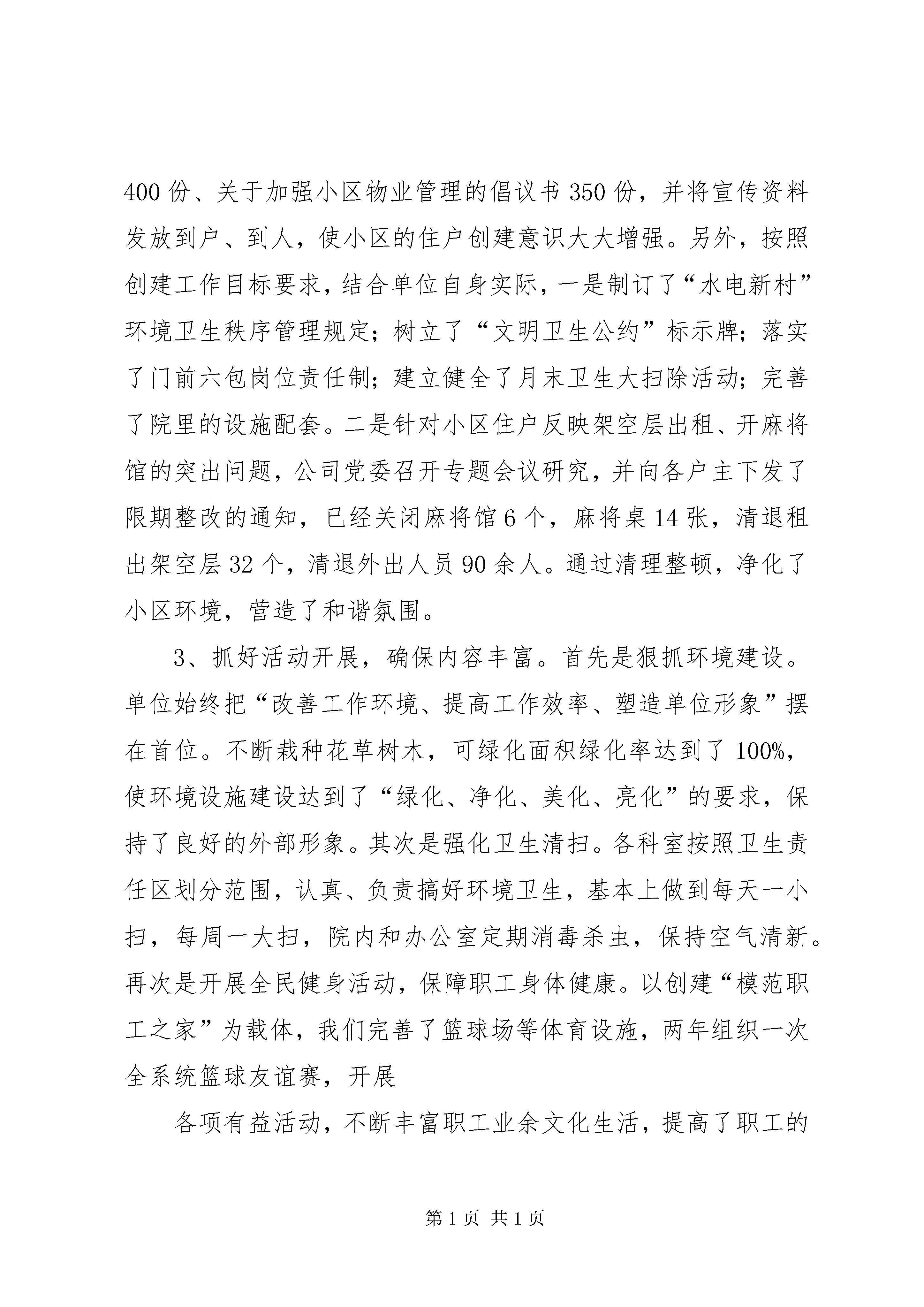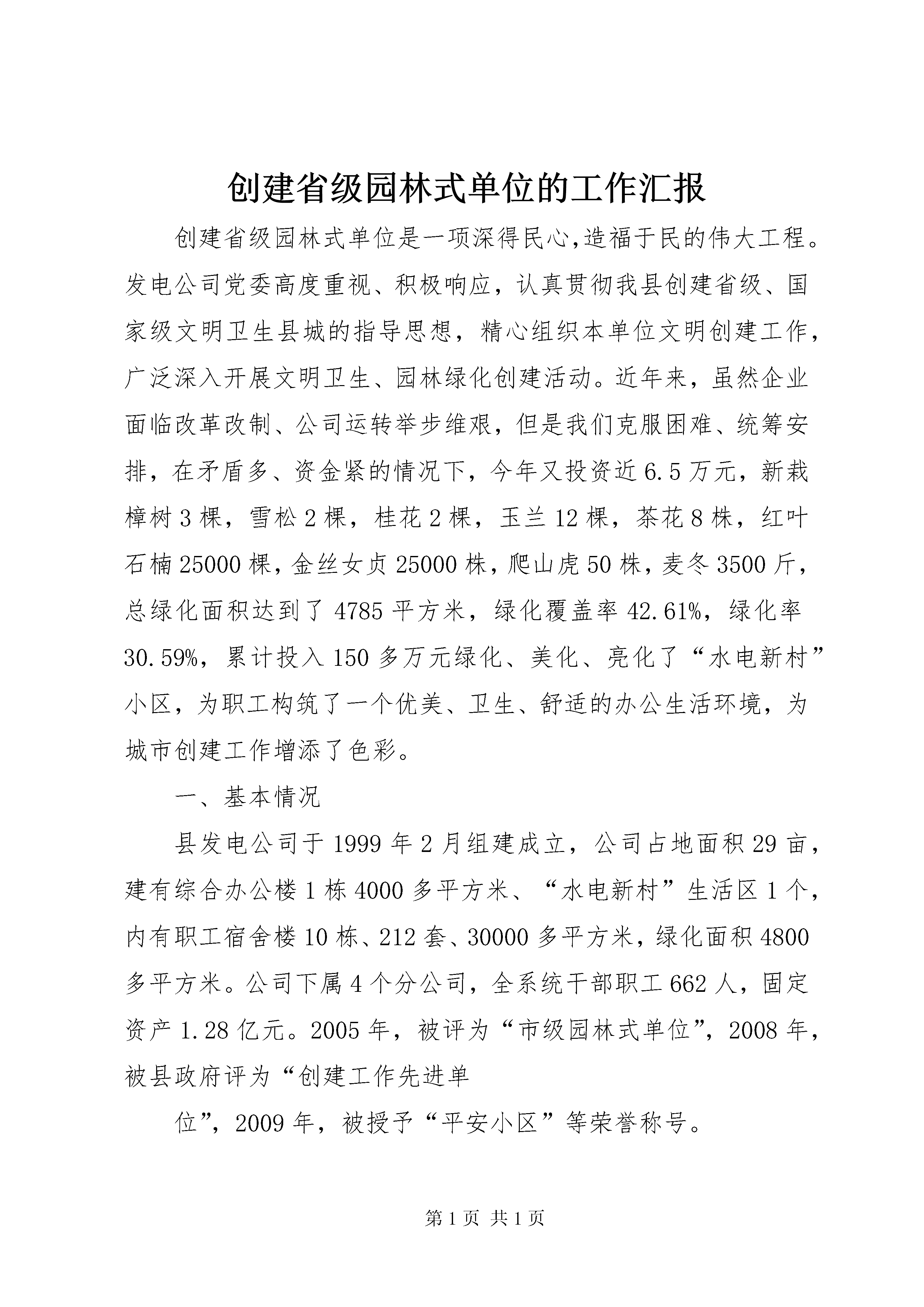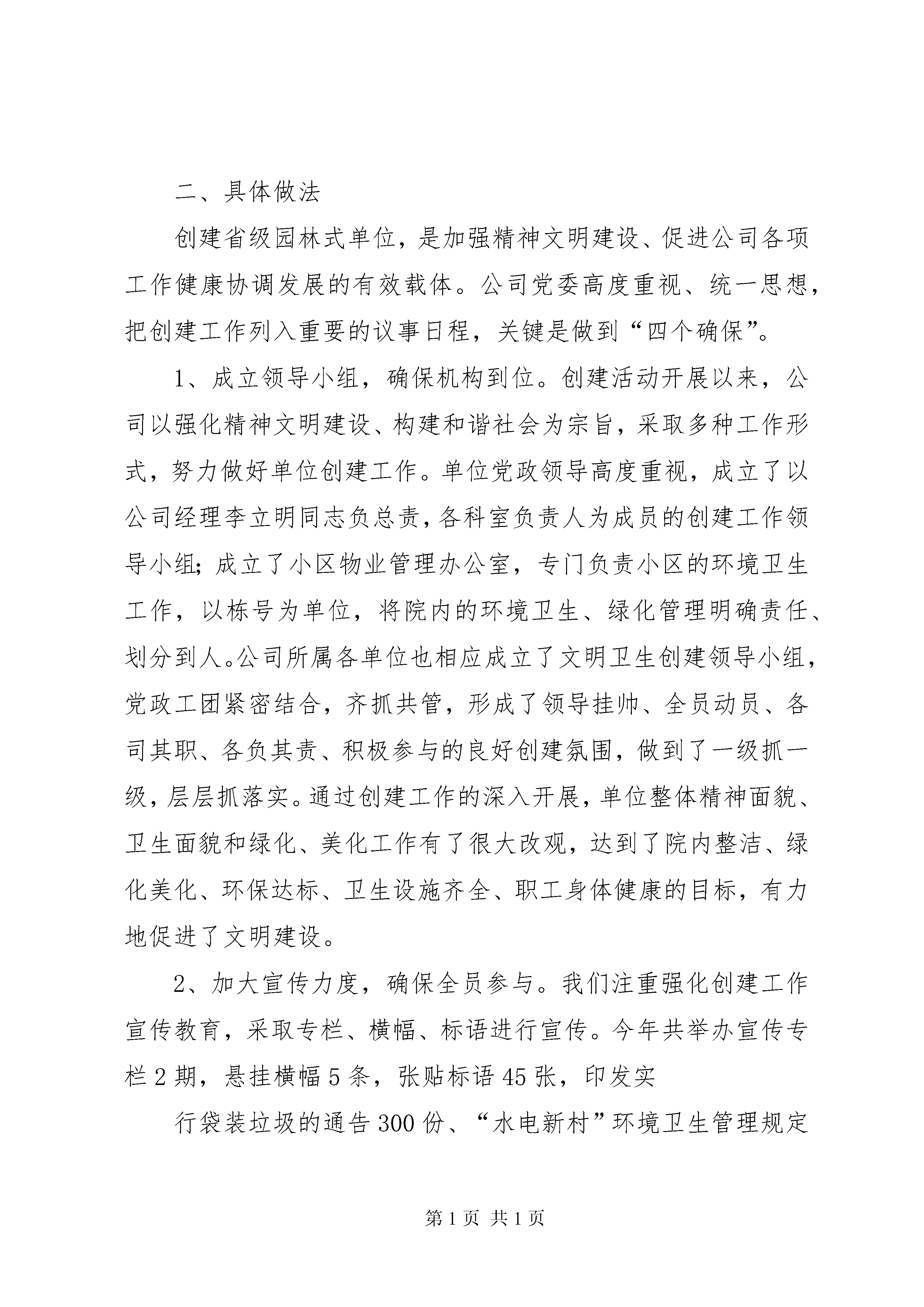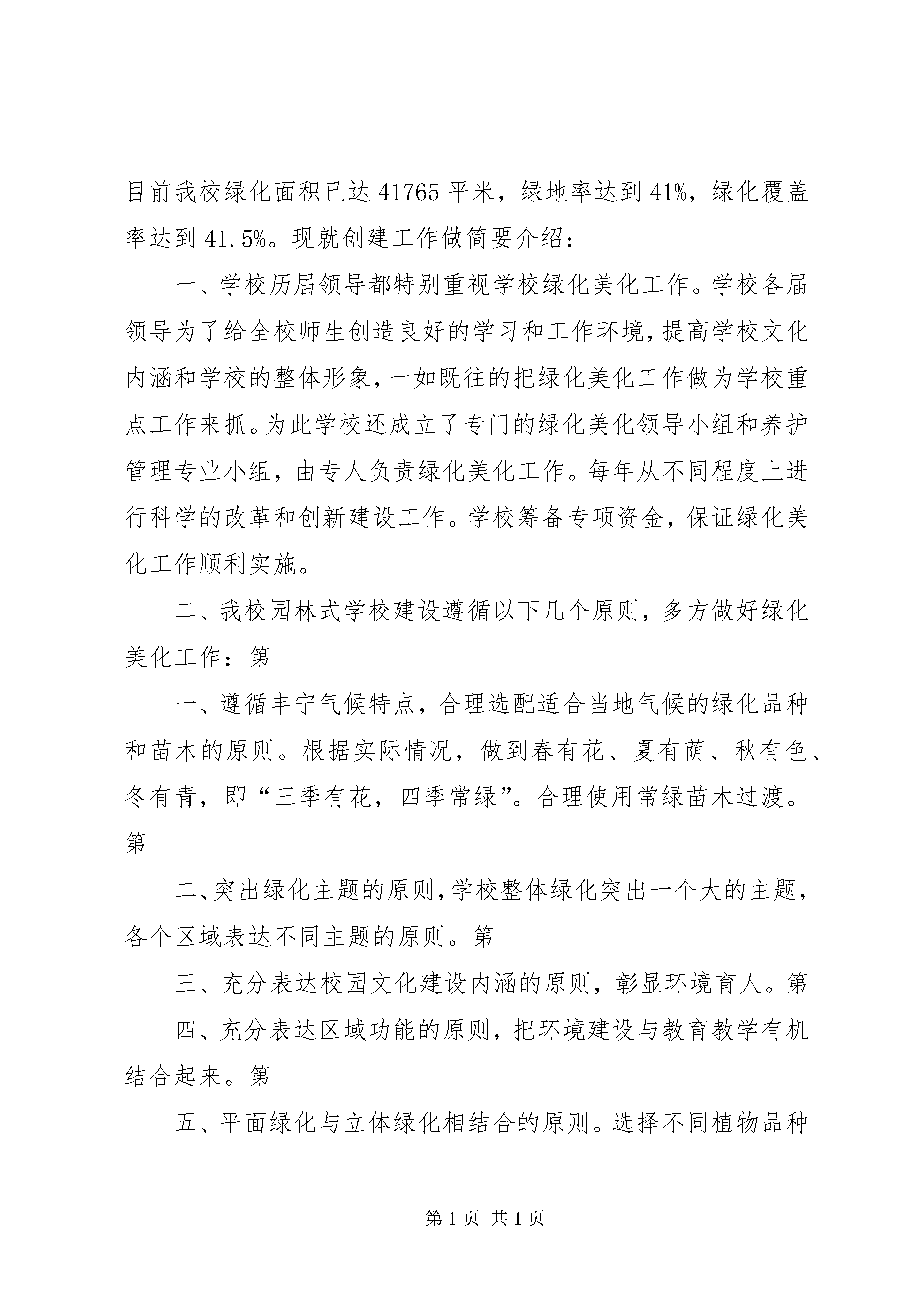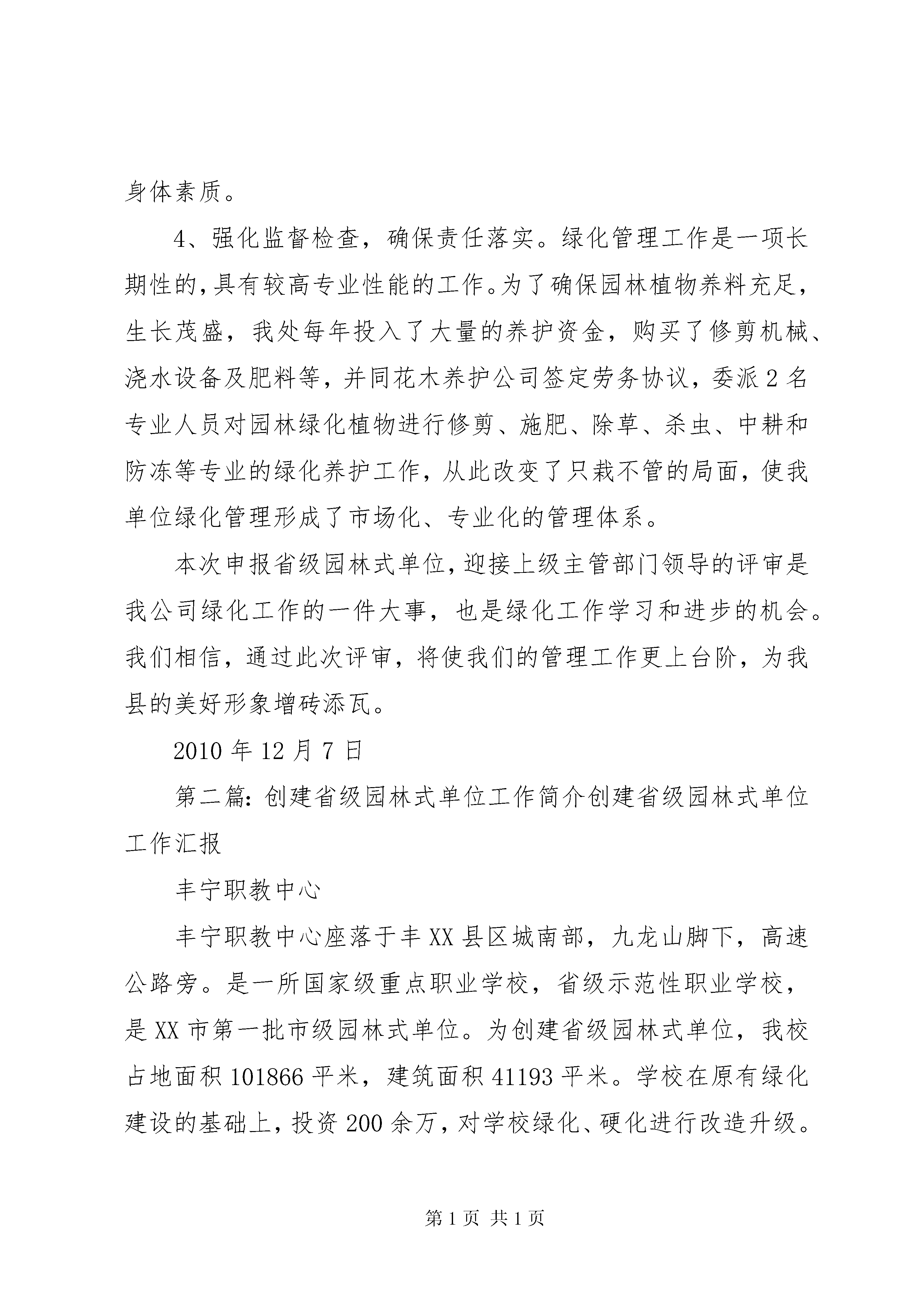 创建省级园林式单位的工作汇报创建省级园林式单位是一项深得民心,造福于民的伟大工程。发电公司党委高度重视、积极响应,认真贯彻我县创建省级、国家级文明卫生县城的指导思想,精心组织本单位文明创建工作,广泛深入开展文明卫生、园林绿化创建活动。近年来,虽然企业面临改革改制、公司运转举步维艰,但是我们克服困难、统筹安排,在矛盾多、资金紧的情况下,今年又投资近6.5万元,新栽樟树3棵,雪松2棵,桂花2棵,玉兰12棵,茶花8株,红叶石楠25000棵,金丝女贞25000株,爬山虎50株,麦冬3500斤,总绿化面积达到了4785平方米,绿化覆盖率42.61%,绿化率30.59%,累计投入150多万元绿化、美化、亮化了“水电新村”小区,为职工构筑了一个优美、卫生、舒适的办公生活环境,为城市创建工作增添了色彩。一、基本情况县发电公司于1999年2月组建成立,公司占地面积29亩,建有综合办公楼1栋4000多平方米、“水电新村”生活区1个,内有职工宿舍楼10栋、212套、30000多平方米,绿化面积4800多平方米。公司下属4个分公司,全系统干部职工662人,固定资产1.28亿元。2005年,被评为“市级园林式单位”,2008年,被县政府评为“创建工作先进单位”,2009年,被授予“平安小区”等荣誉称号。二、具体做法创建省级园林式单位,是加强精神文明建设、促进公司各项工作健康协调发展的有效载体。公司党委高度重视、统一思想,把创建工作列入重要的议事日程,关键是做到“四个确保”。1、成立领导小组,确保机构到位。创建活动开展以来,公司以强化精神文明建设、构建和谐社会为宗旨,采取多种工作形式,努力做好单位创建工作。单位党政领导高度重视,成立了以公司经理李立明同志负总责,各科室负责人为成员的创建工作领导小组;成立了小区物业管理办公室,专门负责小区的环境卫生工作,以栋号为单位,将院内的环境卫生、绿化管理明确责任、划分到人。公司所属各单位也相应成立了文明卫生创建领导小组,党政工团紧密结合,齐抓共管,形成了领导挂帅、全员动员、各司其职、各负其责、积极参与的良好创建氛围,做到了一级抓一级,层层抓落实。通过创建工作的深入开展,单位整体精神面貌、卫生面貌和绿化、美化工作有了很大改观,达到了院内整洁、绿化美化、环保达标、卫生设施齐全、职工身体健康的目标,有力地促进了文明建设。2、加大宣传力度,确保全员参与。我们注重强化创建工作宣传教育,采取专栏、横幅、标语进行宣传。今年共举办宣传专栏2期,悬挂横幅5条,张贴标语45张,印发实行袋装垃圾的通告300份、“水电新村”环境卫生管理规定400份、关于加强小区物业管理的倡议书350份,并将宣传资料发放到户、到人,使小区的住户创建意识大大增强。另外,按照创建工作目标要求,结合单位自身实际,一是制订了“水电新村”环境卫生秩序管理规定;树立了“文明卫生公约”标示牌;落实了门前六包岗位责任制;建立健全了月末卫生大扫除活动;完善了院里的设施配套。二是针对小区住户反映架空层出租、开麻将馆的突出问题,公司党委召开专题会议研究,并向各户主下发了限期整改的通知,已经关闭麻将馆6个,麻将桌14张,清退租出架空层32个,清退外出人员90余人。通过清理整顿,净化了小区环境,营造了和谐氛围。3、抓好活动开展,确保内容丰富。首先是狠抓环境建设。单位始终把“改善工作环境、提高工作效率、塑造单位形象”摆在首位。不断栽种花草树木,可绿化面积绿化率达到了100%,使环境设施建设达到了“绿化、净化、美化、亮化”的要求,保持了良好的外部形象。其次是强化卫生清扫。各科室按照卫生责任区划分范围,认真、负责搞好环境卫生,基本上做到每天一小扫,每周一大扫,院内和办公室定期消毒杀虫,保持空气清新。再次是开展全民健身活动,保障职工身体健康。以创建“模范职工之家”为载体,我们完善了篮球场等体育设施,两年组织一次全系统篮球友谊赛,开展各项有益活动,不断丰富职工业余文化生活,提高了职工的身体素质。4、强化监督检查,确保责任落实。绿化管理工作是一项长期性的,具有较高专业性能的工作。为了确保园林植物养料充足,生长茂盛,我处每年投入了大量的养护资金,购买了修剪机械、浇水设备及肥料等,并同花木养护公司签定劳务协议,委派2名专业人员对园林绿化植物进行修剪、施肥、除草、杀虫、中耕和防冻等专业的绿化养护工作,从此改变了只栽不管的局面,使我单位绿化管理形成了市场化、专业化的管理体系。本次申报省级园林式单位,迎接上级主管部门领导的评审是我公司绿化工作的一件大事,也是绿化工作学习和进步的机会。我们相信,通过此次评审,将使我们的管理工作更上台阶,为我县的美好形象增砖添瓦。2010年12月7日第二篇:创建省级园林式单位工作简介创建省级园林式单位工作汇报丰宁职教中心丰宁职教中心座落于丰XX县区城