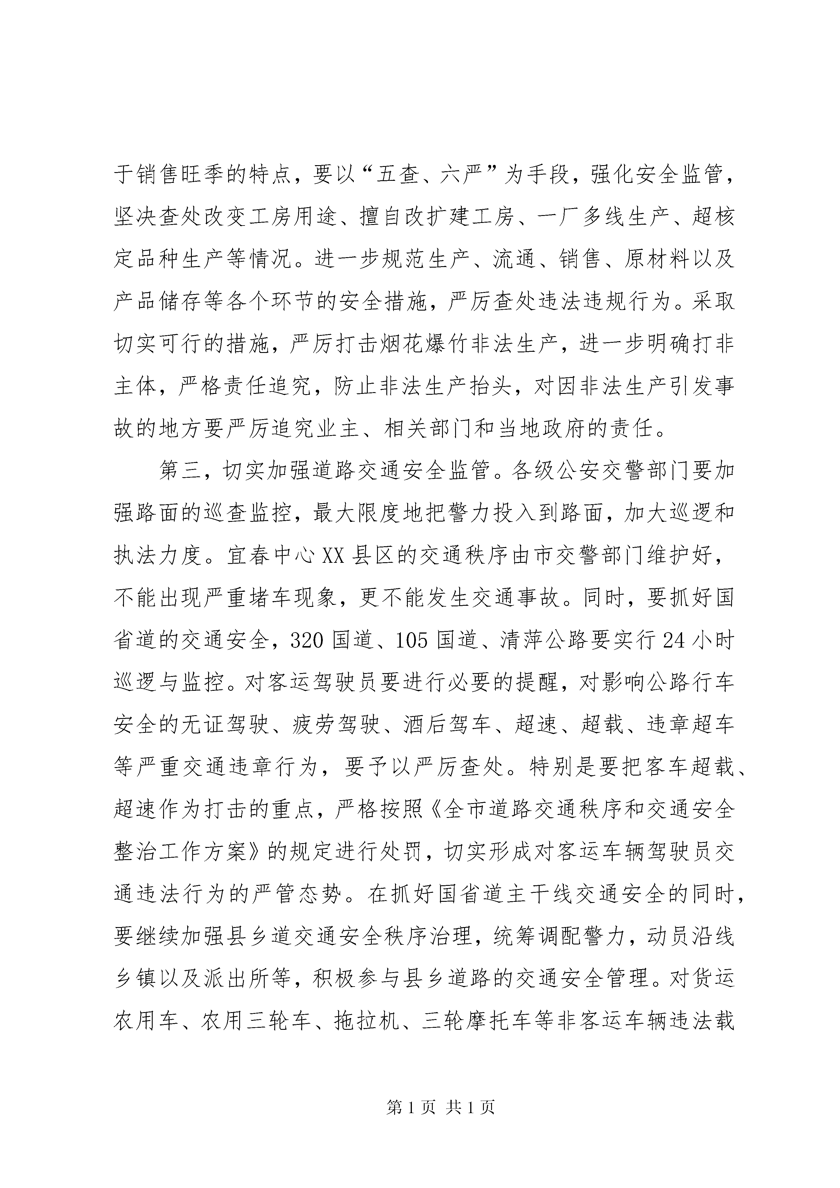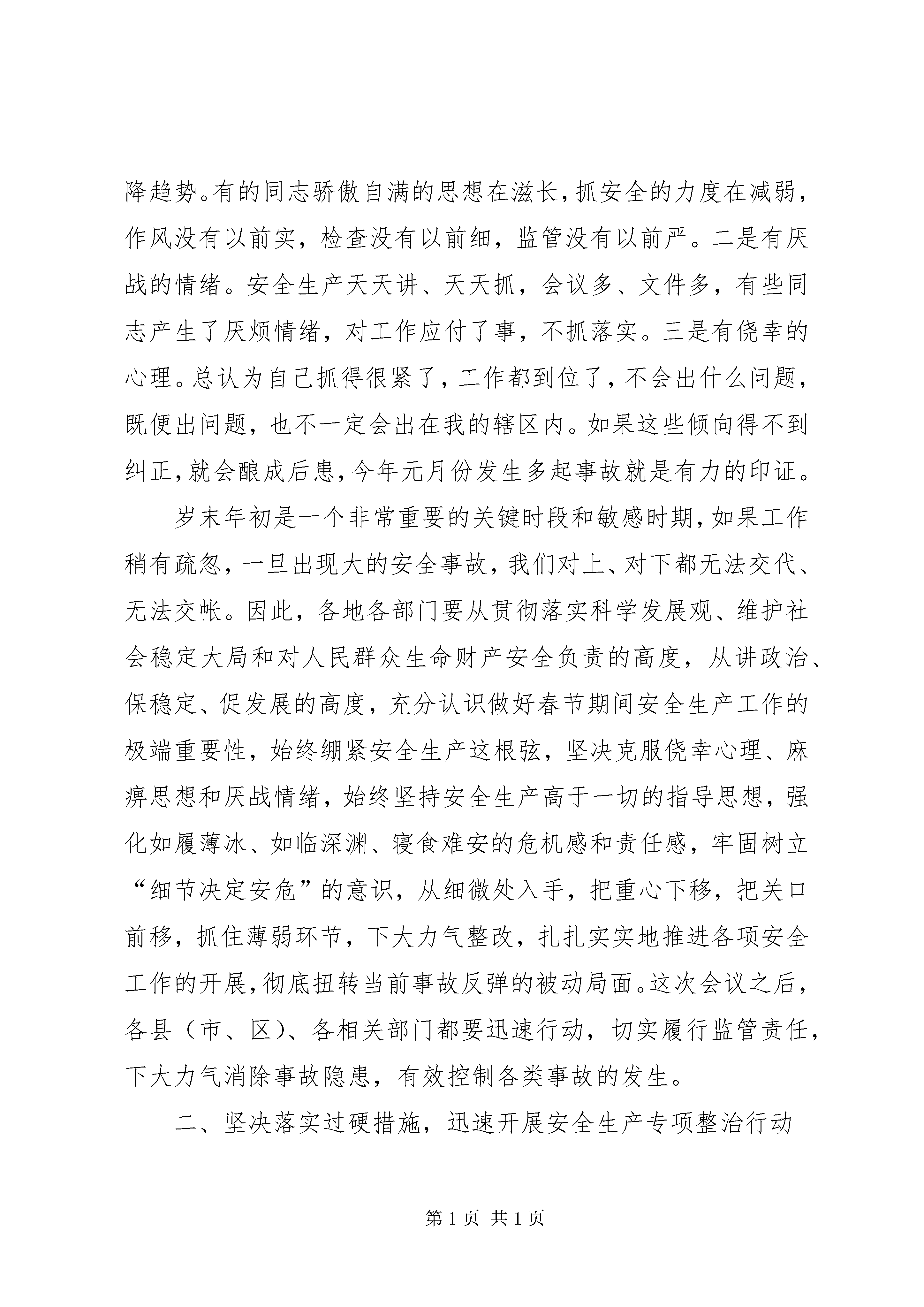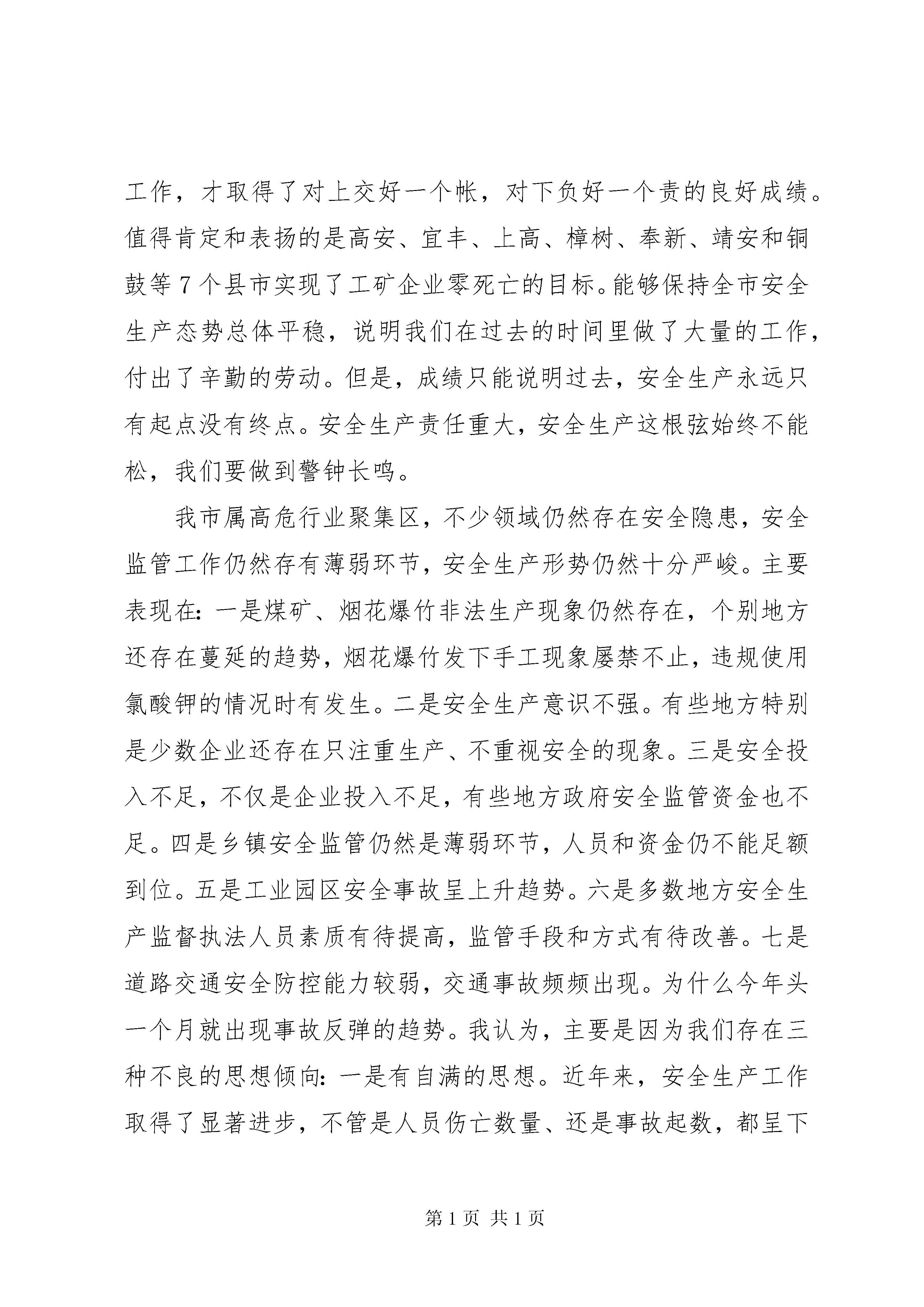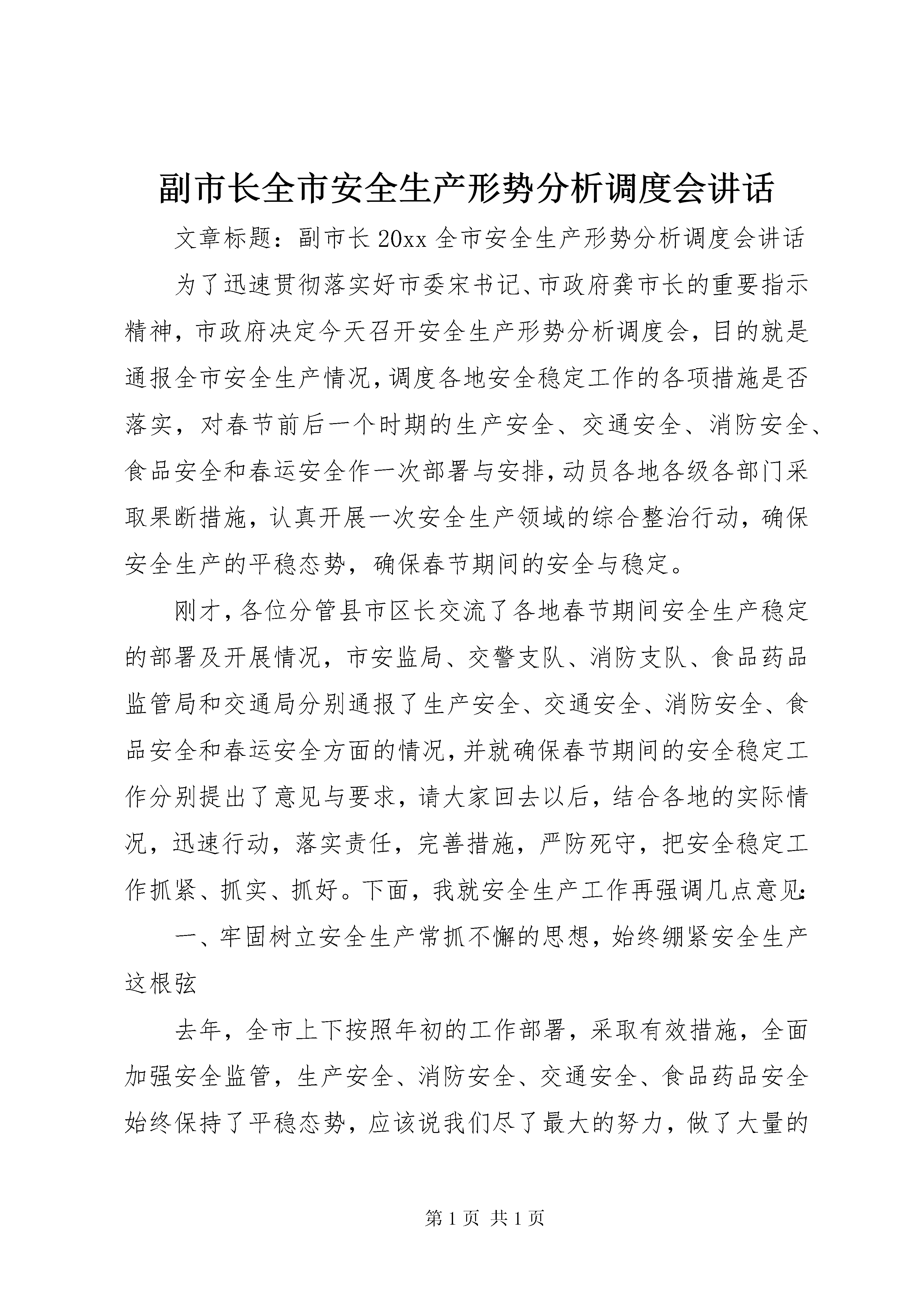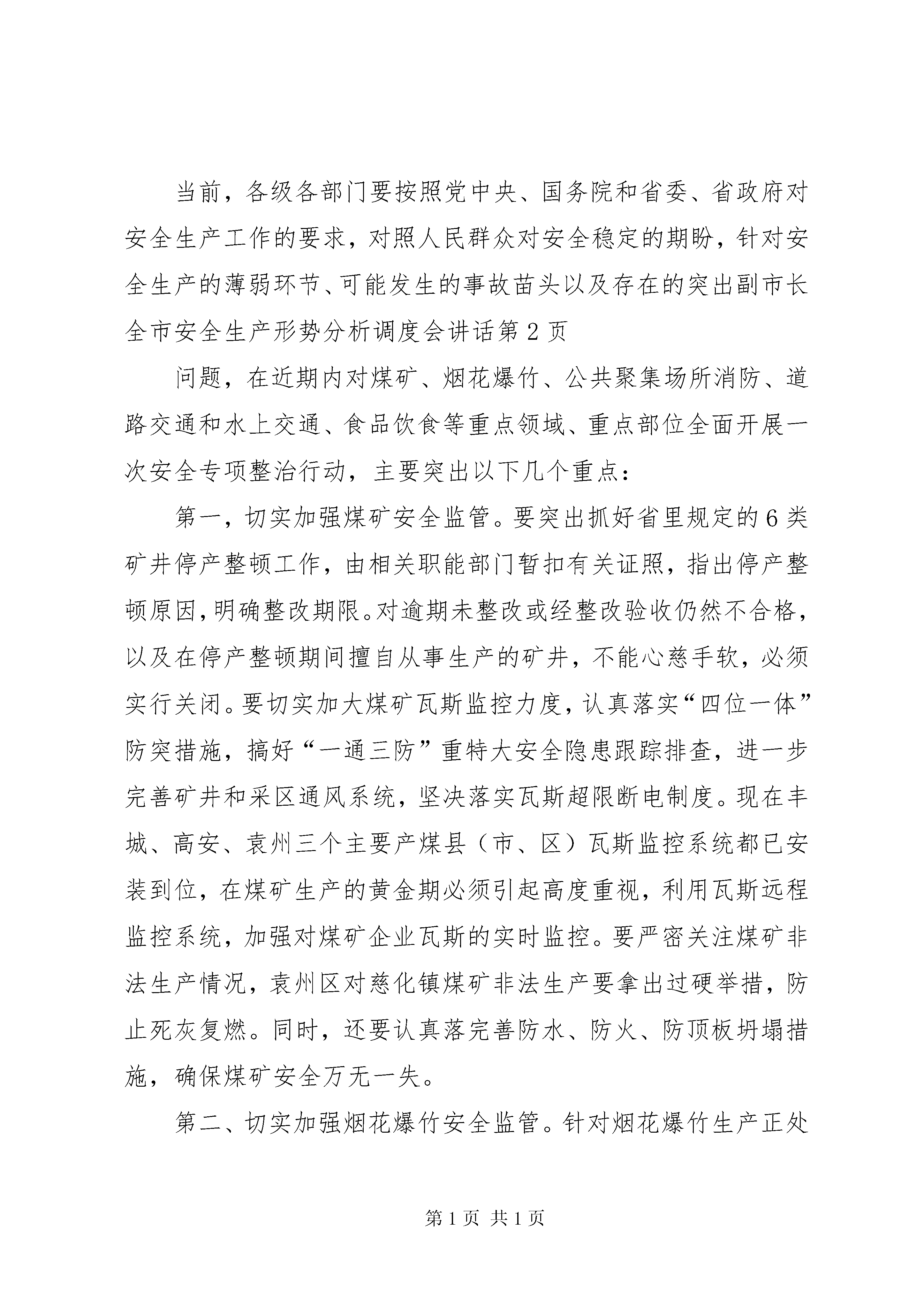 副市长全市安全生产形势分析调度会讲话文章标题:副市长20xx全市安全生产形势分析调度会讲话为了迅速贯彻落实好市委宋书记、市政府龚市长的重要指示精神,市政府决定今天召开安全生产形势分析调度会,目的就是通报全市安全生产情况,调度各地安全稳定工作的各项措施是否落实,对春节前后一个时期的生产安全、交通安全、消防安全、食品安全和春运安全作一次部署与安排,动员各地各级各部门采取果断措施,认真开展一次安全生产领域的综合整治行动,确保安全生产的平稳态势,确保春节期间的安全与稳定。刚才,各位分管县市区长交流了各地春节期间安全生产稳定的部署及开展情况,市安监局、交警支队、消防支队、食品药品监管局和交通局分别通报了生产安全、交通安全、消防安全、食品安全和春运安全方面的情况,并就确保春节期间的安全稳定工作分别提出了意见与要求,请大家回去以后,结合各地的实际情况,迅速行动,落实责任,完善措施,严防死守,把安全稳定工作抓紧、抓实、抓好。下面,我就安全生产工作再强调几点意见:一、牢固树立安全生产常抓不懈的思想,始终绷紧安全生产这根弦去年,全市上下按照年初的工作部署,采取有效措施,全面加强安全监管,生产安全、消防安全、交通安全、食品药品安全始终保持了平稳态势,应该说我们尽了最大的努力,做了大量的工作,才取得了对上交好一个帐,对下负好一个责的良好成绩。值得肯定和表扬的是高安、宜丰、上高、樟树、奉新、靖安和铜鼓等7个县市实现了工矿企业零死亡的目标。能够保持全市安全生产态势总体平稳,说明我们在过去的时间里做了大量的工作,付出了辛勤的劳动。但是,成绩只能说明过去,安全生产永远只有起点没有终点。安全生产责任重大,安全生产这根弦始终不能松,我们要做到警钟长鸣。我市属高危行业聚集区,不少领域仍然存在安全隐患,安全监管工作仍然存有薄弱环节,安全生产形势仍然十分严峻。主要表现在:一是煤矿、烟花爆竹非法生产现象仍然存在,个别地方还存在蔓延的趋势,烟花爆竹发下手工现象屡禁不止,违规使用氯酸钾的情况时有发生。二是安全生产意识不强。有些地方特别是少数企业还存在只注重生产、不重视安全的现象。三是安全投入不足,不仅是企业投入不足,有些地方政府安全监管资金也不足。四是乡镇安全监管仍然是薄弱环节,人员和资金仍不能足额到位。五是工业园区安全事故呈上升趋势。六是多数地方安全生产监督执法人员素质有待提高,监管手段和方式有待改善。七是道路交通安全防控能力较弱,交通事故频频出现。为什么今年头一个月就出现事故反弹的趋势。我认为,主要是因为我们存在三种不良的思想倾向:一是有自满的思想。近年来,安全生产工作取得了显著进步,不管是人员伤亡数量、还是事故起数,都呈下降趋势。有的同志骄傲自满的思想在滋长,抓安全的力度在减弱,作风没有以前实,检查没有以前细,监管没有以前严。二是有厌战的情绪。安全生产天天讲、天天抓,会议多、文件多,有些同志产生了厌烦情绪,对工作应付了事,不抓落实。三是有侥幸的心理。总认为自己抓得很紧了,工作都到位了,不会出什么问题,既便出问题,也不一定会出在我的辖区内。如果这些倾向得不到纠正,就会酿成后患,今年元月份发生多起事故就是有力的印证。岁末年初是一个非常重要的关键时段和敏感时期,如果工作稍有疏忽,一旦出现大的安全事故,我们对上、对下都无法交代、无法交帐。因此,各地各部门要从贯彻落实科学发展观、维护社会稳定大局和对人民群众生命财产安全负责的高度,从讲政治、保稳定、促发展的高度,充分认识做好春节期间安全生产工作的极端重要性,始终绷紧安全生产这根弦,坚决克服侥幸心理、麻痹思想和厌战情绪,始终坚持安全生产高于一切的指导思想,强化如履薄冰、如临深渊、寝食难安的危机感和责任感,牢固树立“细节决定安危”的意识,从细微处入手,把重心下移,把关口前移,抓住薄弱环节,下大力气整改,扎扎实实地推进各项安全工作的开展,彻底扭转当前事故反弹的被动局面。这次会议之后,各县(市、区)、各相关部门都要迅速行动,切实履行监管责任,下大力气消除事故隐患,有效控制各类事故的发生。二、坚决落实过硬措施,迅速开展安全生产专项整治行动当前,各级各部门要按照党中央、国务院和省委、省政府对安全生产工作的要求,对照人民群众对安全稳定的期盼,针对安全生产的薄弱环节、可能发生的事故苗头以及存在的突出副市长全市安全生产形势分析调度会讲话问题,在近期内对煤矿、烟花爆竹、公共聚集场所消防、道路交通和水上交通、食品饮食等重点领域、重点部位全面开展一次安全专项整治行动,主要突出以下几个重点:第一,切实加强煤矿安全监管。要突出抓好省里规定的6类矿井停产整顿工作,由相关职能部门暂扣有关证照,指出停产整顿原因,明确整改期限。对逾期未整改或经整改验收仍然不合格,以及在停产整顿期间擅自从事生产的矿井,不能心慈手软,必须实行关闭。要切