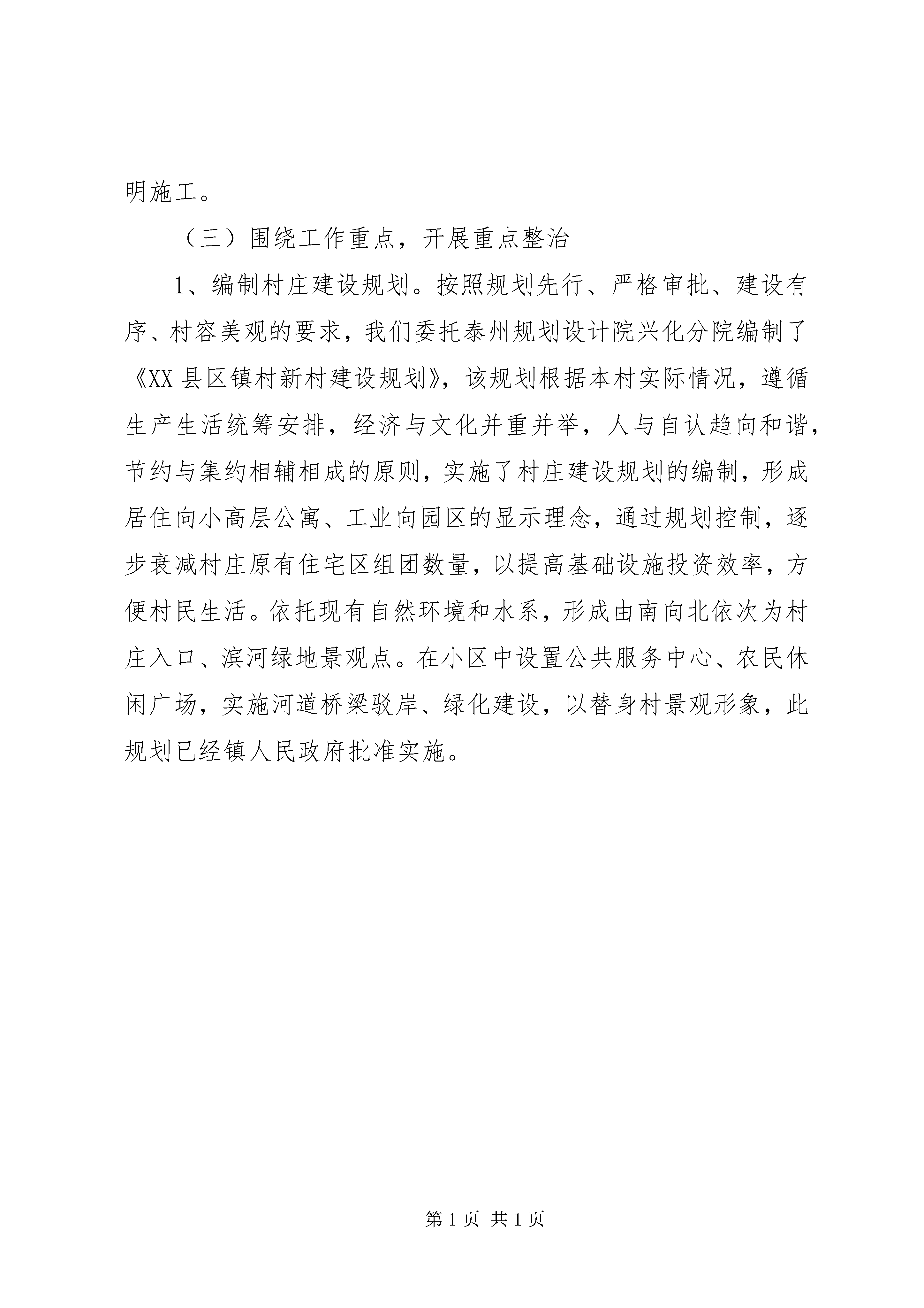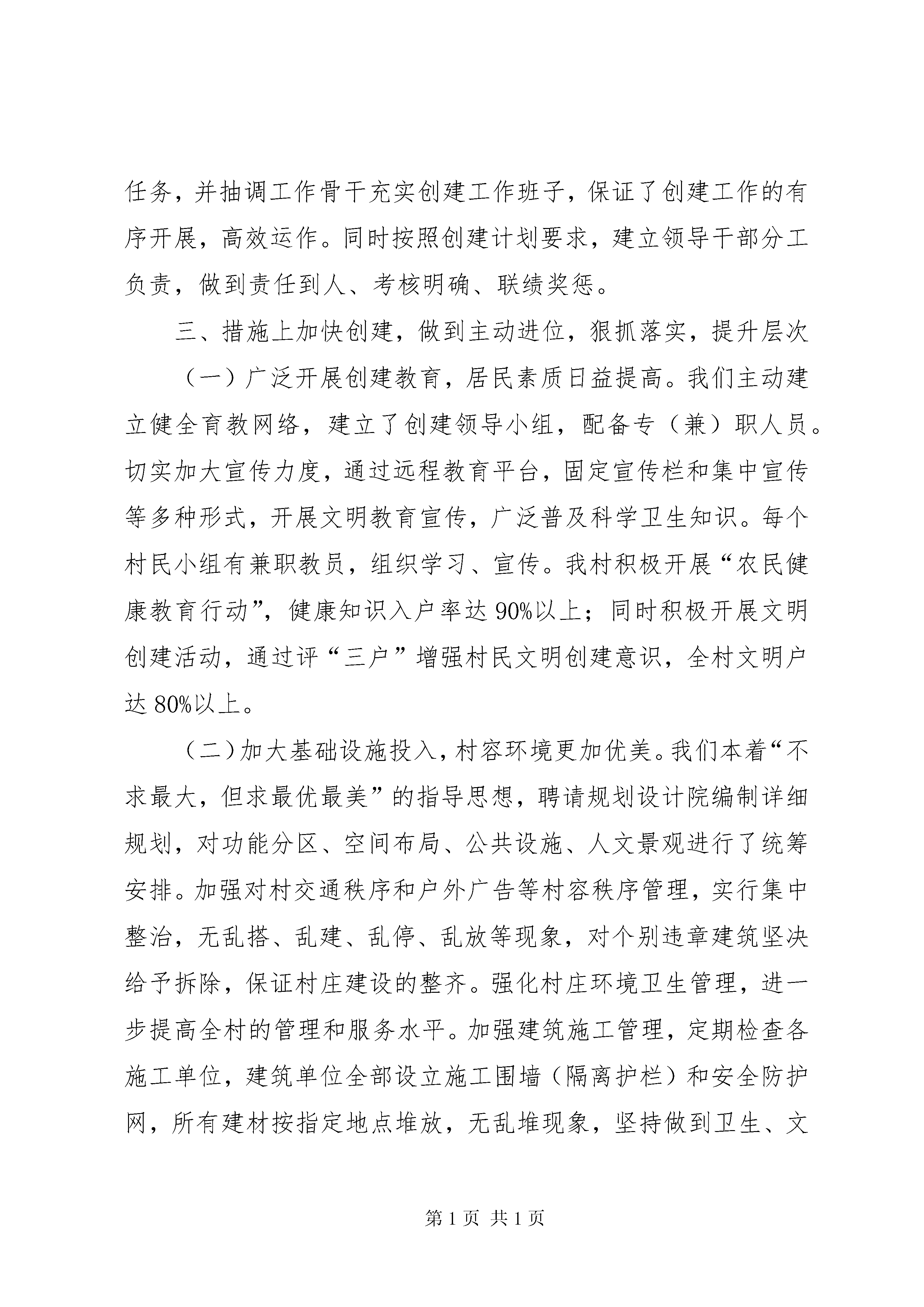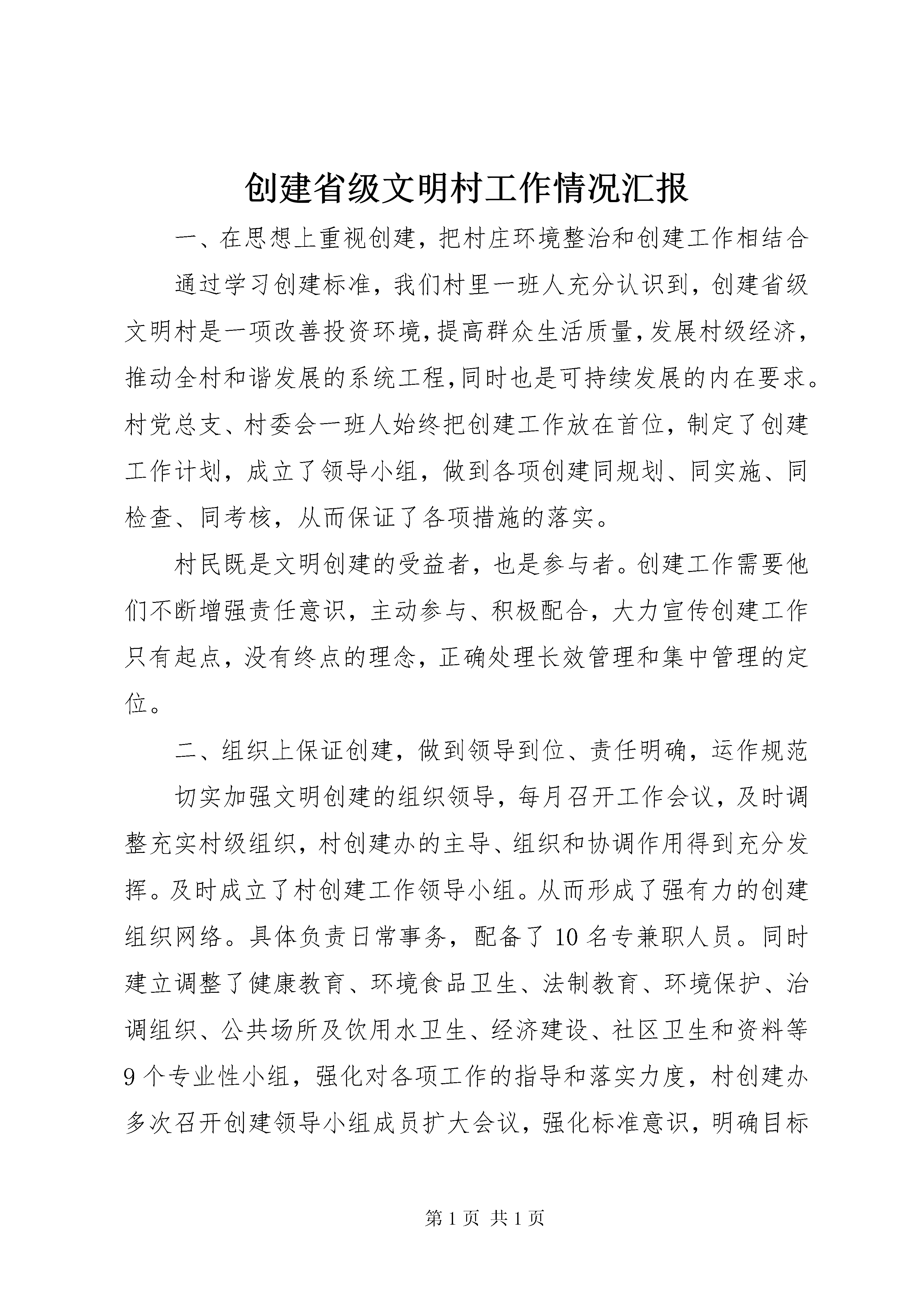 创建省级文明村工作情况汇报一、在思想上重视创建,把村庄环境整治和创建工作相结合通过学习创建标准,我们村里一班人充分认识到,创建省级文明村是一项改善投资环境,提高群众生活质量,发展村级经济,推动全村和谐发展的系统工程,同时也是可持续发展的内在要求。村党总支、村委会一班人始终把创建工作放在首位,制定了创建工作计划,成立了领导小组,做到各项创建同规划、同实施、同检查、同考核,从而保证了各项措施的落实。村民既是文明创建的受益者,也是参与者。创建工作需要他们不断增强责任意识,主动参与、积极配合,大力宣传创建工作只有起点,没有终点的理念,正确处理长效管理和集中管理的定位。二、组织上保证创建,做到领导到位、责任明确,运作规范切实加强文明创建的组织领导,每月召开工作会议,及时调整充实村级组织,村创建办的主导、组织和协调作用得到充分发挥。及时成立了村创建工作领导小组。从而形成了强有力的创建组织网络。具体负责日常事务,配备了10名专兼职人员。同时建立调整了健康教育、环境食品卫生、法制教育、环境保护、治调组织、公共场所及饮用水卫生、经济建设、社区卫生和资料等9个专业性小组,强化对各项工作的指导和落实力度,村创建办多次召开创建领导小组成员扩大会议,强化标准意识,明确目标任务,并抽调工作骨干充实创建工作班子,保证了创建工作的有序开展,高效运作。同时按照创建计划要求,建立领导干部分工负责,做到责任到人、考核明确、联绩奖惩。三、措施上加快创建,做到主动进位,狠抓落实,提升层次(一)广泛开展创建教育,居民素质日益提高。我们主动建立健全育教网络,建立了创建领导小组,配备专(兼)职人员。切实加大宣传力度,通过远程教育平台,固定宣传栏和集中宣传等多种形式,开展文明教育宣传,广泛普及科学卫生知识。每个村民小组有兼职教员,组织学习、宣传。我村积极开展“农民健康教育行动”,健康知识入户率达90%以上;同时积极开展文明创建活动,通过评“三户”增强村民文明创建意识,全村文明户达80%以上。(二)加大基础设施投入,村容环境更加优美。我们本着“不求最大,但求最优最美”的指导思想,聘请规划设计院编制详细规划,对功能分区、空间布局、公共设施、人文景观进行了统筹安排。加强对村交通秩序和户外广告等村容秩序管理,实行集中整治,无乱搭、乱建、乱停、乱放等现象,对个别违章建筑坚决给予拆除,保证村庄建设的整齐。强化村庄环境卫生管理,进一步提高全村的管理和服务水平。加强建筑施工管理,定期检查各施工单位,建筑单位全部设立施工围墙(隔离护栏)和安全防护网,所有建材按指定地点堆放,无乱堆现象,坚持做到卫生、文明施工。(三)围绕工作重点,开展重点整治1、编制村庄建设规划。按照规划先行、严格审批、建设有序、村容美观的要求,我们委托泰州规划设计院兴化分院编制了《XX县区镇村新村建设规划》,该规划根据本村实际情况,遵循生产生活统筹安排,经济与文化并重并举,人与自认趋向和谐,节约与集约相辅相成的原则,实施了村庄建设规划的编制,形成居住向小高层公寓、工业向园区的显示理念,通过规划控制,逐步衰减村庄原有住宅区组团数量,以提高基础设施投资效率,方便村民生活。依托现有自然环境和水系,形成由南向北依次为村庄入口、滨河绿地景观点。在小区中设置公共服务中心、农民休闲广场,实施河道桥梁驳岸、绿化建设,以替身村景观形象,此规划已经镇人民政府批准实施。