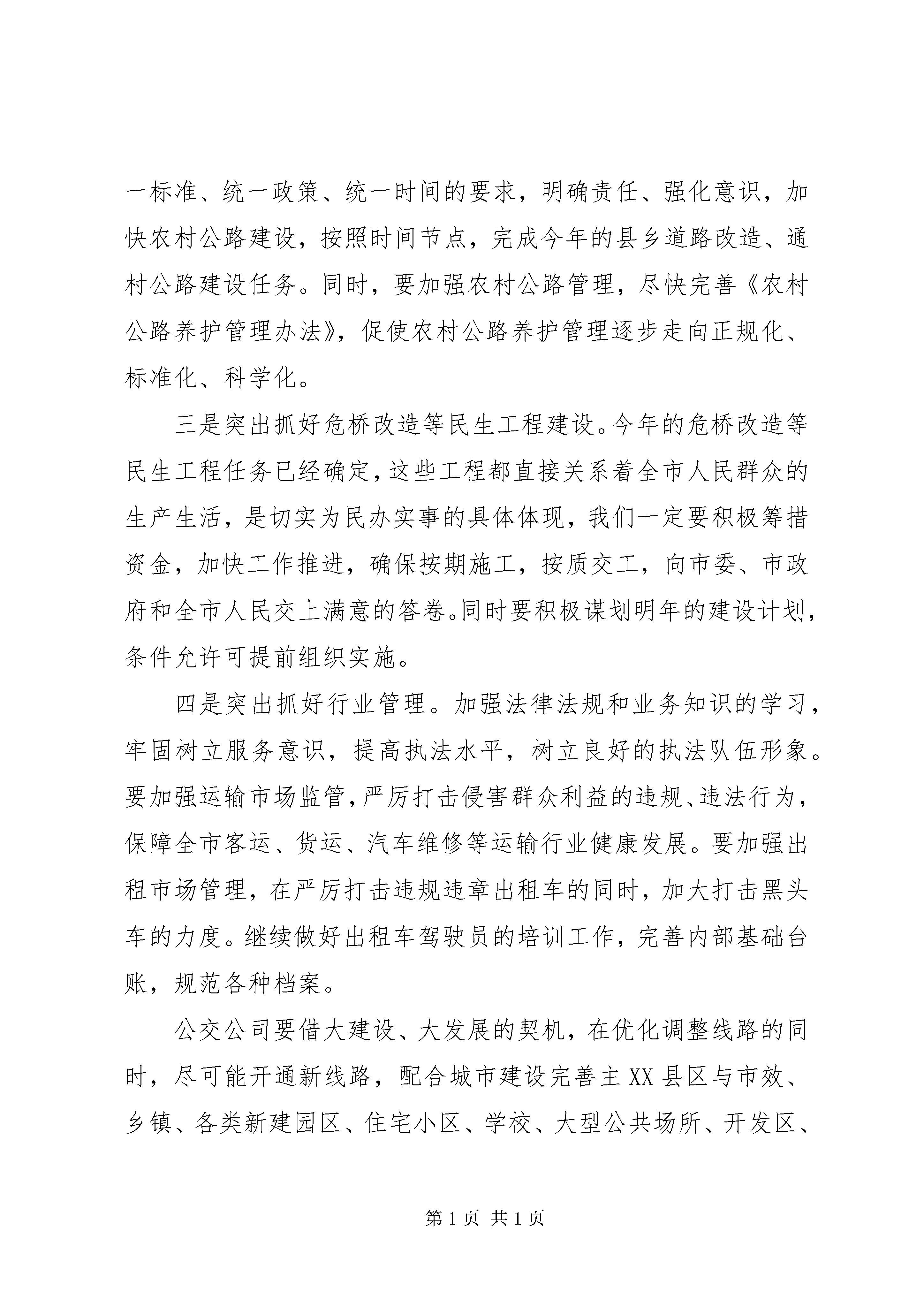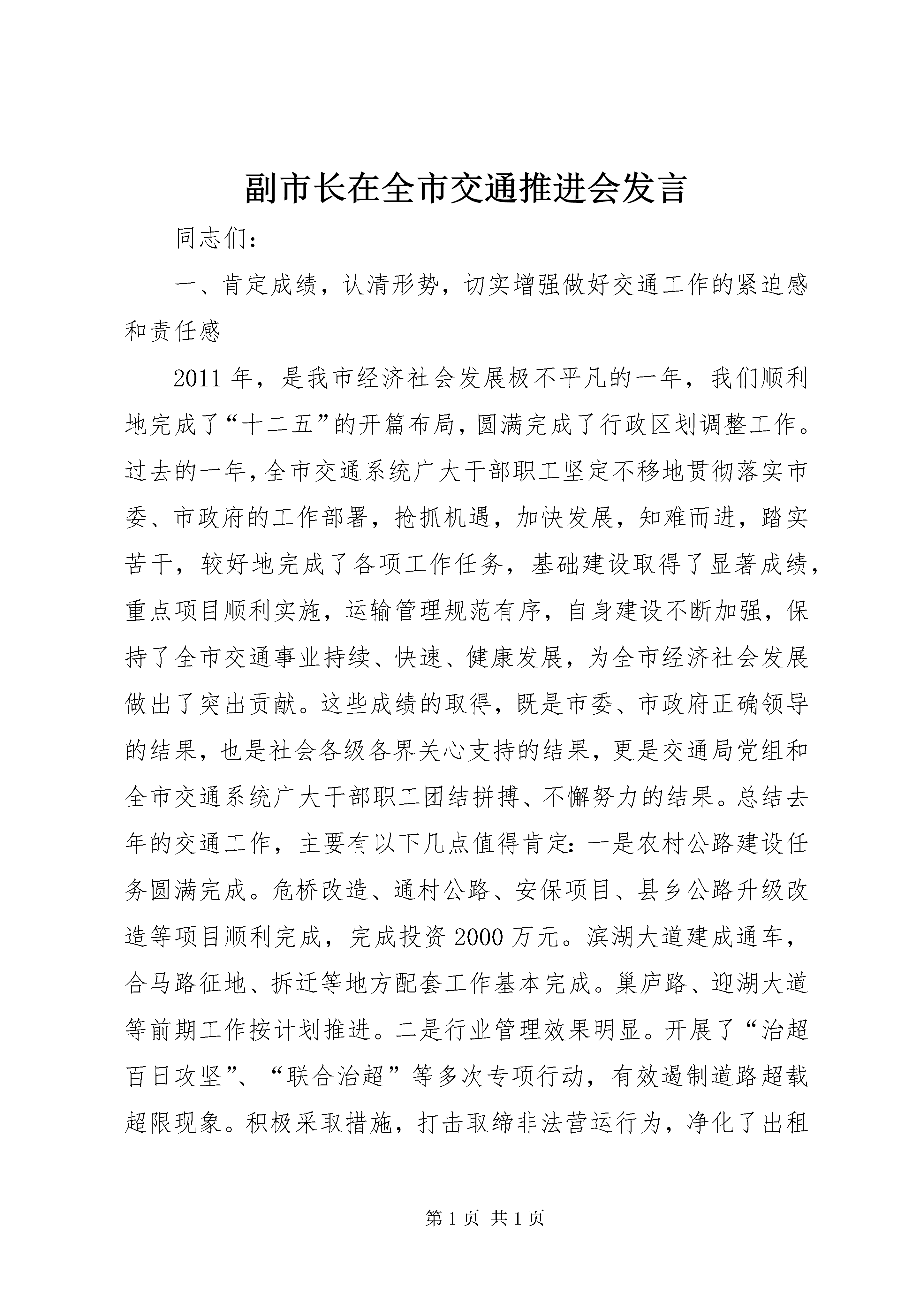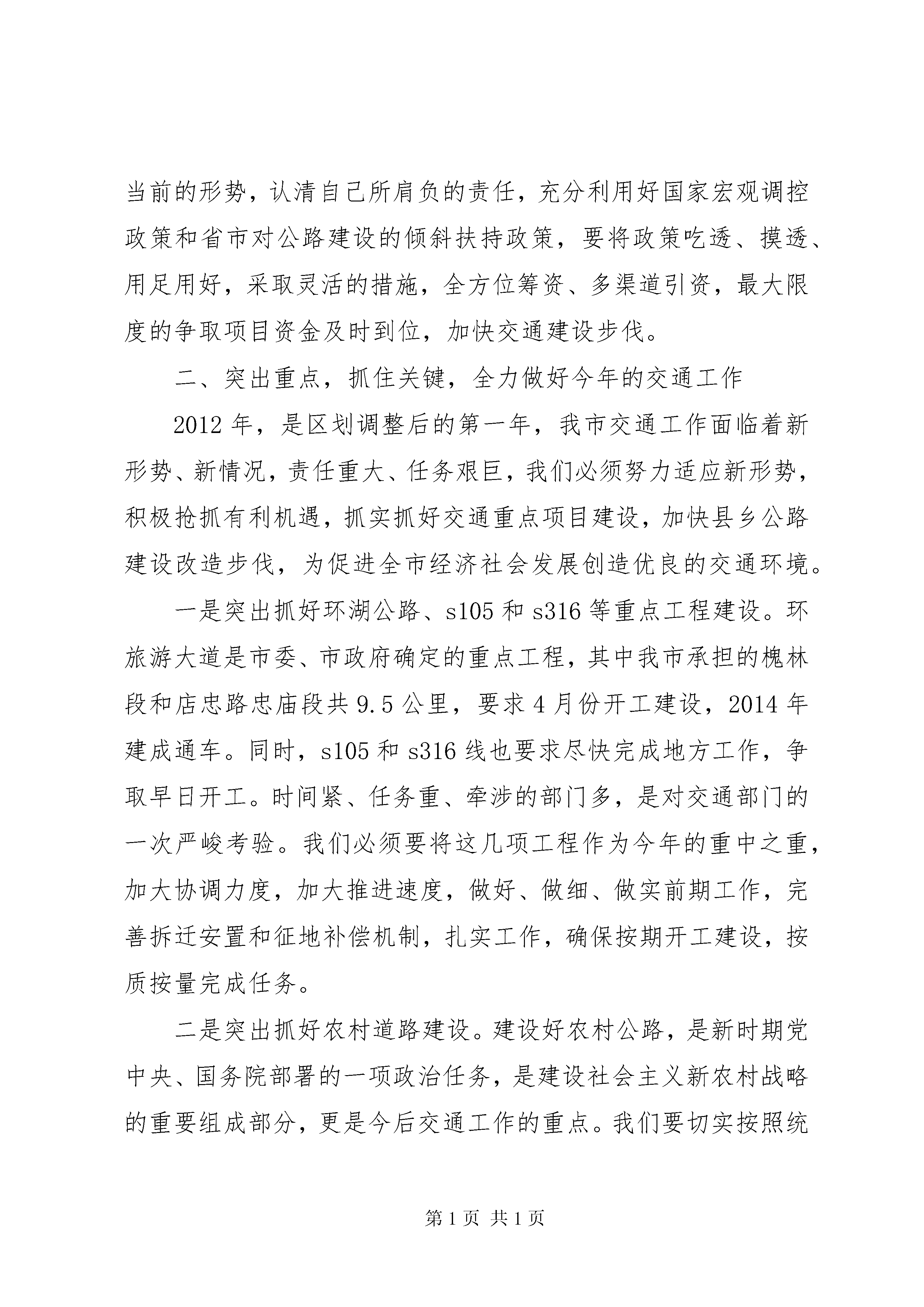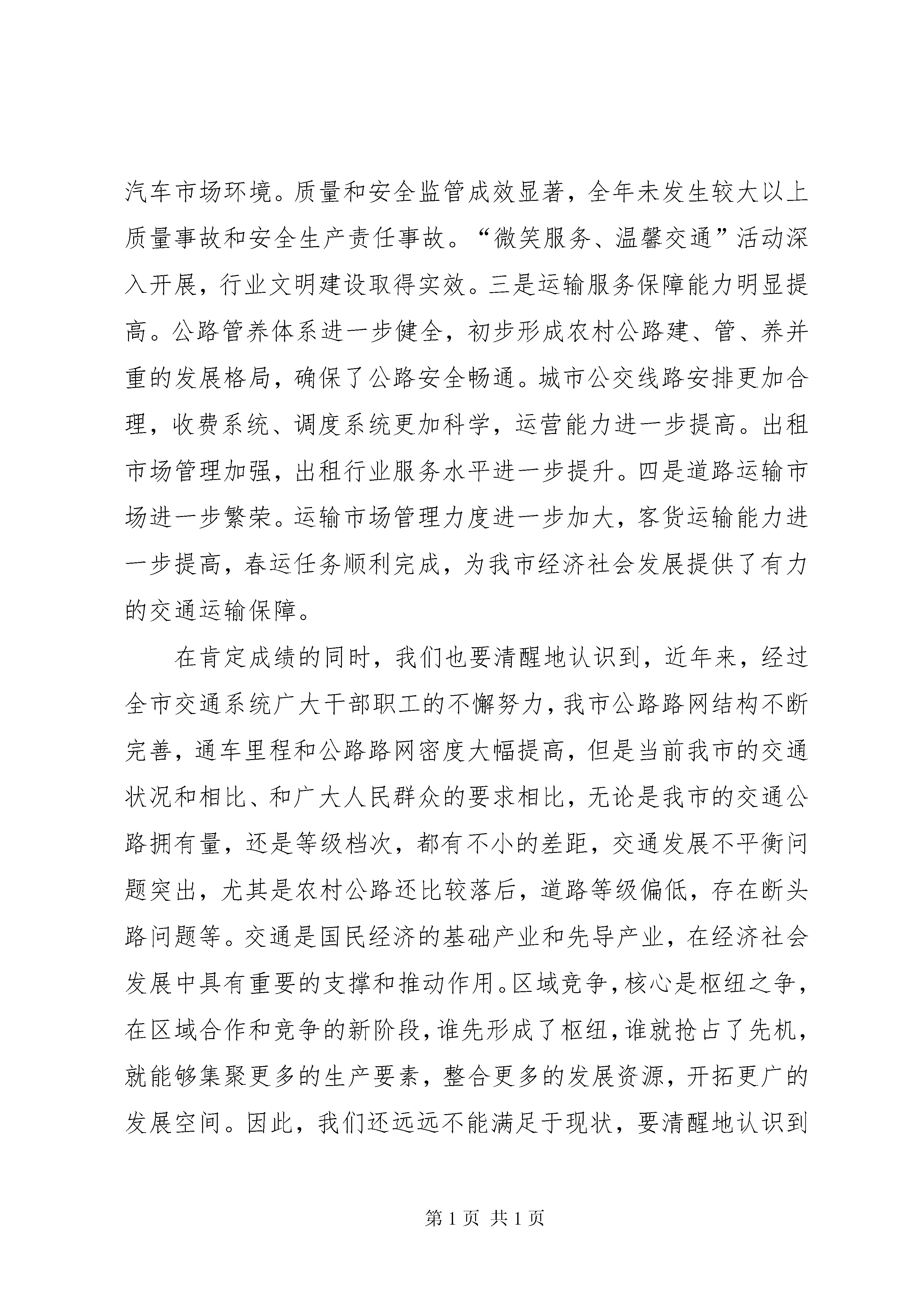 副市长在全市交通推进会发言同志们:一、肯定成绩,认清形势,切实增强做好交通工作的紧迫感和责任感2011年,是我市经济社会发展极不平凡的一年,我们顺利地完成了“十二五”的开篇布局,圆满完成了行政区划调整工作。过去的一年,全市交通系统广大干部职工坚定不移地贯彻落实市委、市政府的工作部署,抢抓机遇,加快发展,知难而进,踏实苦干,较好地完成了各项工作任务,基础建设取得了显著成绩,重点项目顺利实施,运输管理规范有序,自身建设不断加强,保持了全市交通事业持续、快速、健康发展,为全市经济社会发展做出了突出贡献。这些成绩的取得,既是市委、市政府正确领导的结果,也是社会各级各界关心支持的结果,更是交通局党组和全市交通系统广大干部职工团结拼搏、不懈努力的结果。总结去年的交通工作,主要有以下几点值得肯定:一是农村公路建设任务圆满完成。危桥改造、通村公路、安保项目、县乡公路升级改造等项目顺利完成,完成投资2000万元。滨湖大道建成通车,合马路征地、拆迁等地方配套工作基本完成。巢庐路、迎湖大道等前期工作按计划推进。二是行业管理效果明显。开展了“治超百日攻坚”、“联合治超”等多次专项行动,有效遏制道路超载超限现象。积极采取措施,打击取缔非法营运行为,净化了出租汽车市场环境。质量和安全监管成效显著,全年未发生较大以上质量事故和安全生产责任事故。“微笑服务、温馨交通”活动深入开展,行业文明建设取得实效。三是运输服务保障能力明显提高。公路管养体系进一步健全,初步形成农村公路建、管、养并重的发展格局,确保了公路安全畅通。城市公交线路安排更加合理,收费系统、调度系统更加科学,运营能力进一步提高。出租市场管理加强,出租行业服务水平进一步提升。四是道路运输市场进一步繁荣。运输市场管理力度进一步加大,客货运输能力进一步提高,春运任务顺利完成,为我市经济社会发展提供了有力的交通运输保障。在肯定成绩的同时,我们也要清醒地认识到,近年来,经过全市交通系统广大干部职工的不懈努力,我市公路路网结构不断完善,通车里程和公路路网密度大幅提高,但是当前我市的交通状况和相比、和广大人民群众的要求相比,无论是我市的交通公路拥有量,还是等级档次,都有不小的差距,交通发展不平衡问题突出,尤其是农村公路还比较落后,道路等级偏低,存在断头路问题等。交通是国民经济的基础产业和先导产业,在经济社会发展中具有重要的支撑和推动作用。区域竞争,核心是枢纽之争,在区域合作和竞争的新阶段,谁先形成了枢纽,谁就抢占了先机,就能够集聚更多的生产要素,整合更多的发展资源,开拓更广的发展空间。因此,我们还远远不能满足于现状,要清醒地认识到当前的形势,认清自己所肩负的责任,充分利用好国家宏观调控政策和省市对公路建设的倾斜扶持政策,要将政策吃透、摸透、用足用好,采取灵活的措施,全方位筹资、多渠道引资,最大限度的争取项目资金及时到位,加快交通建设步伐。二、突出重点,抓住关键,全力做好今年的交通工作2012年,是区划调整后的第一年,我市交通工作面临着新形势、新情况,责任重大、任务艰巨,我们必须努力适应新形势,积极抢抓有利机遇,抓实抓好交通重点项目建设,加快县乡公路建设改造步伐,为促进全市经济社会发展创造优良的交通环境。一是突出抓好环湖公路、s105和s316等重点工程建设。环旅游大道是市委、市政府确定的重点工程,其中我市承担的槐林段和店忠路忠庙段共9.5公里,要求4月份开工建设,2014年建成通车。同时,s105和s316线也要求尽快完成地方工作,争取早日开工。时间紧、任务重、牵涉的部门多,是对交通部门的一次严峻考验。我们必须要将这几项工程作为今年的重中之重,加大协调力度,加大推进速度,做好、做细、做实前期工作,完善拆迁安置和征地补偿机制,扎实工作,确保按期开工建设,按质按量完成任务。二是突出抓好农村道路建设。建设好农村公路,是新时期党中央、国务院部署的一项政治任务,是建设社会主义新农村战略的重要组成部分,更是今后交通工作的重点。我们要切实按照统一标准、统一政策、统一时间的要求,明确责任、强化意识,加快农村公路建设,按照时间节点,完成今年的县乡道路改造、通村公路建设任务。同时,要加强农村公路管理,尽快完善《农村公路养护管理办法》,促使农村公路养护管理逐步走向正规化、标准化、科学化。三是突出抓好危桥改造等民生工程建设。今年的危桥改造等民生工程任务已经确定,这些工程都直接关系着全市人民群众的生产生活,是切实为民办实事的具体体现,我们一定要积极筹措资金,加快工作推进,确保按期施工,按质交工,向市委、市政府和全市人民交上满意的答卷。同时要积极谋划明年的建设计划,条件允许可提前组织实施。四是突出抓好行业管理。加强法律法规和业务知识的学习,牢固树立服务意识,提高执法水平,树立良好的执法队伍形象。要加强运输市场监管