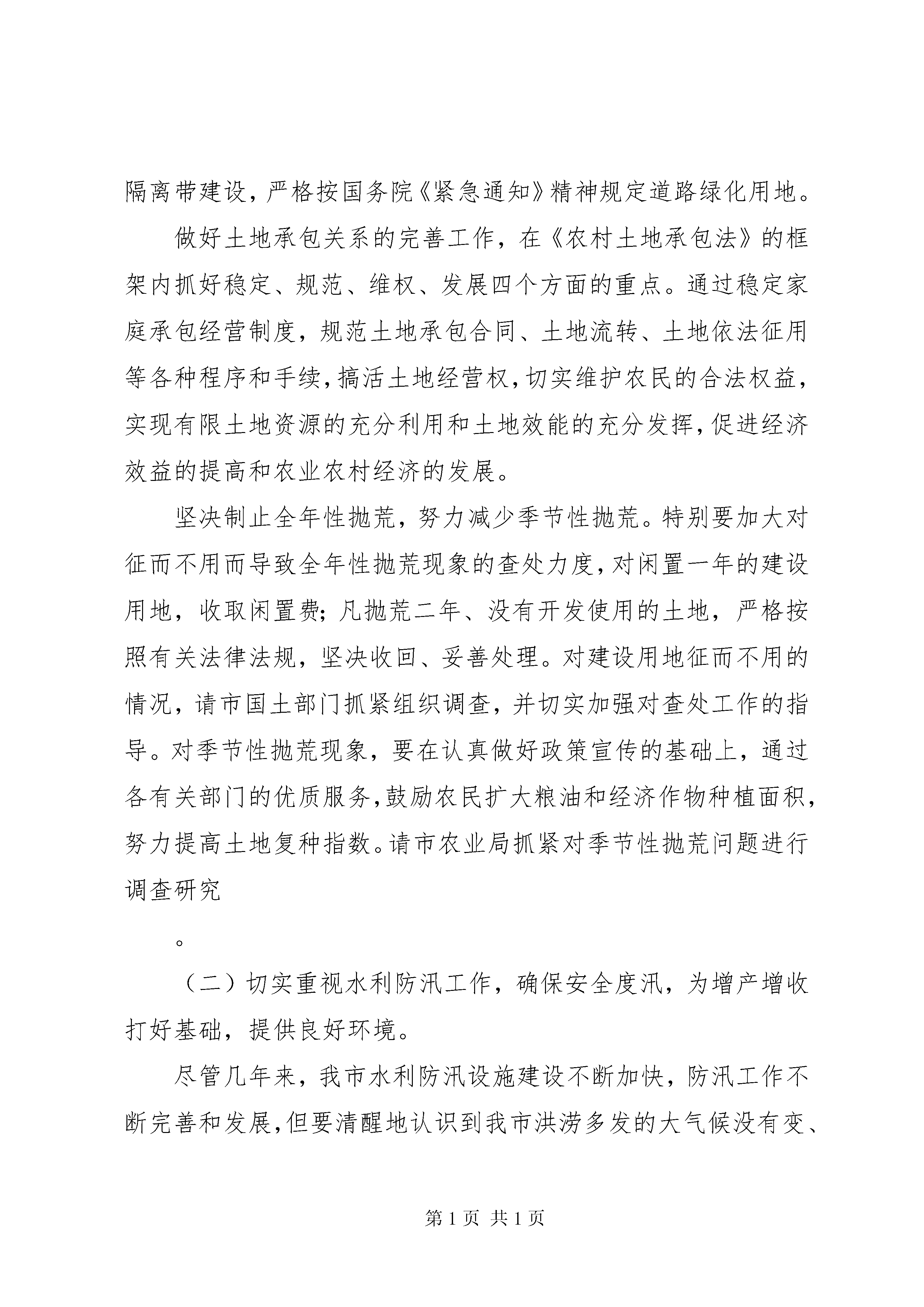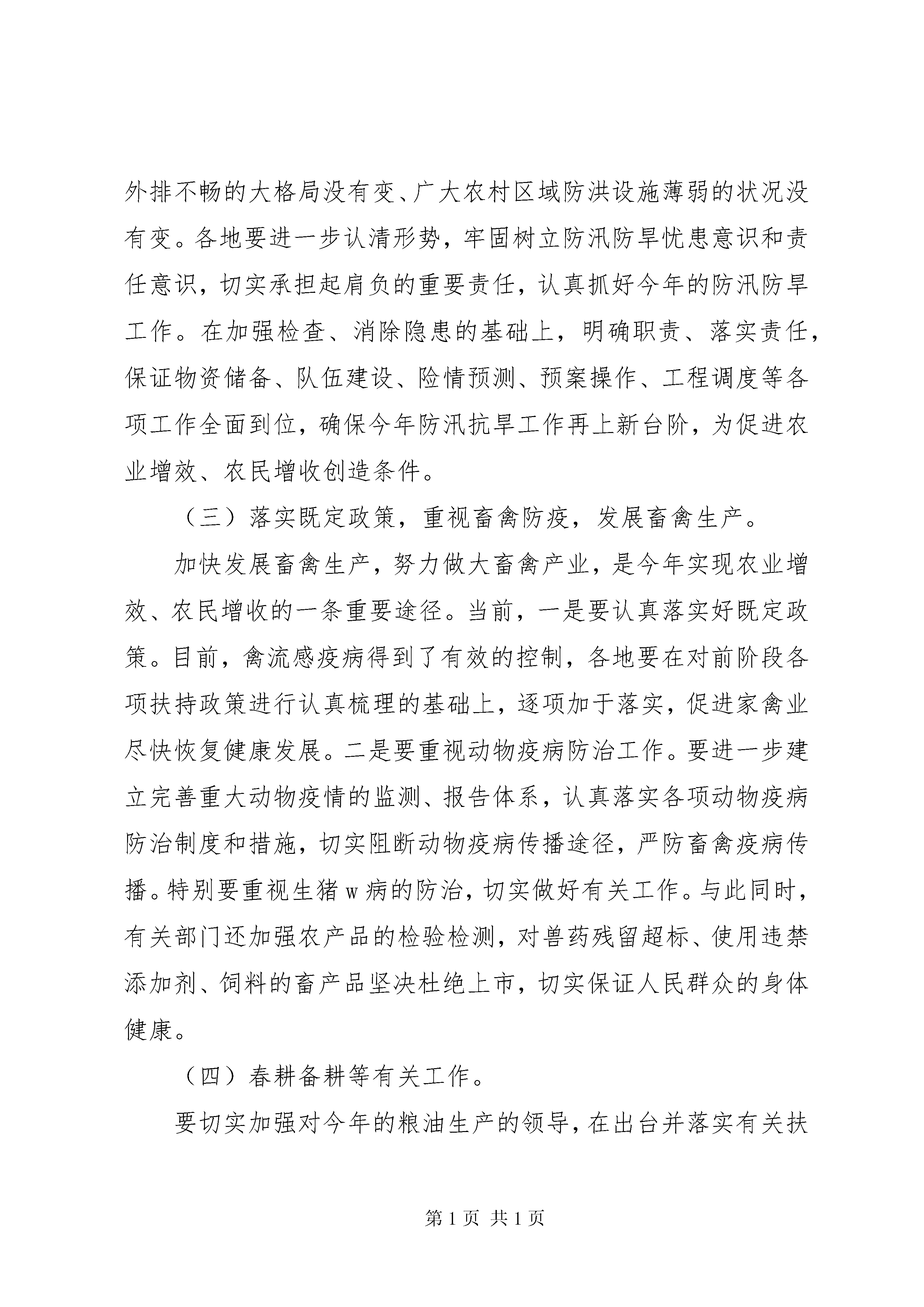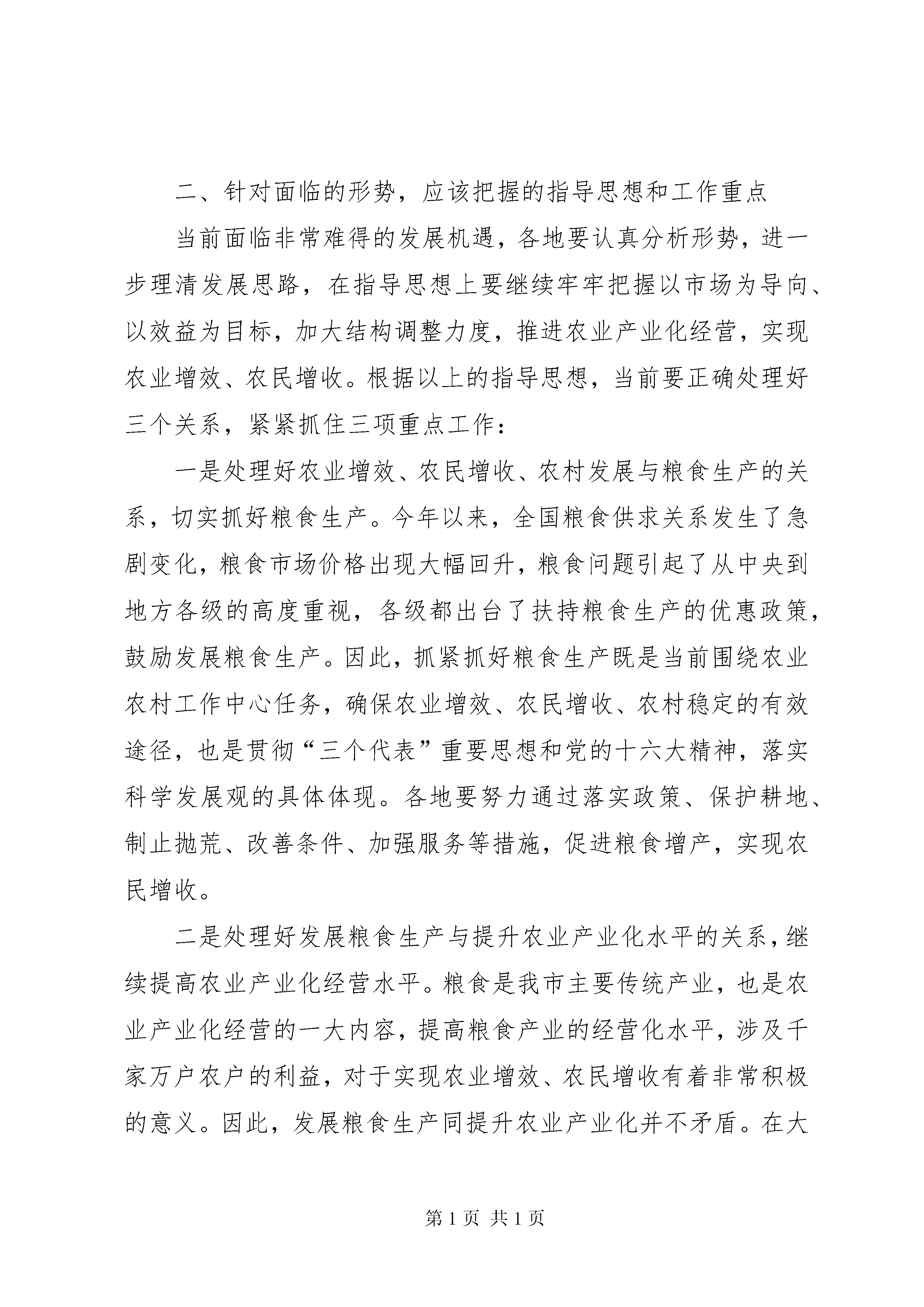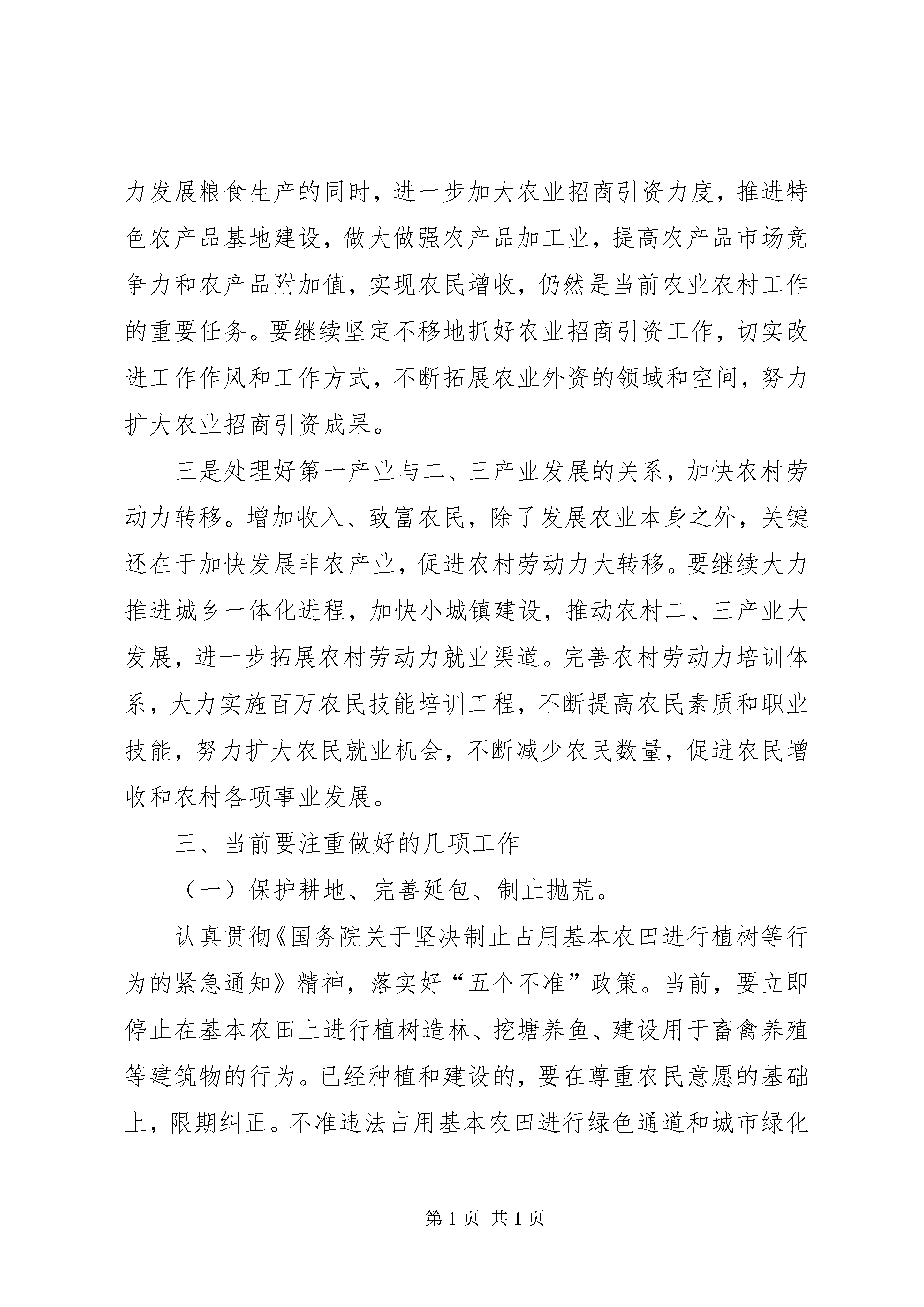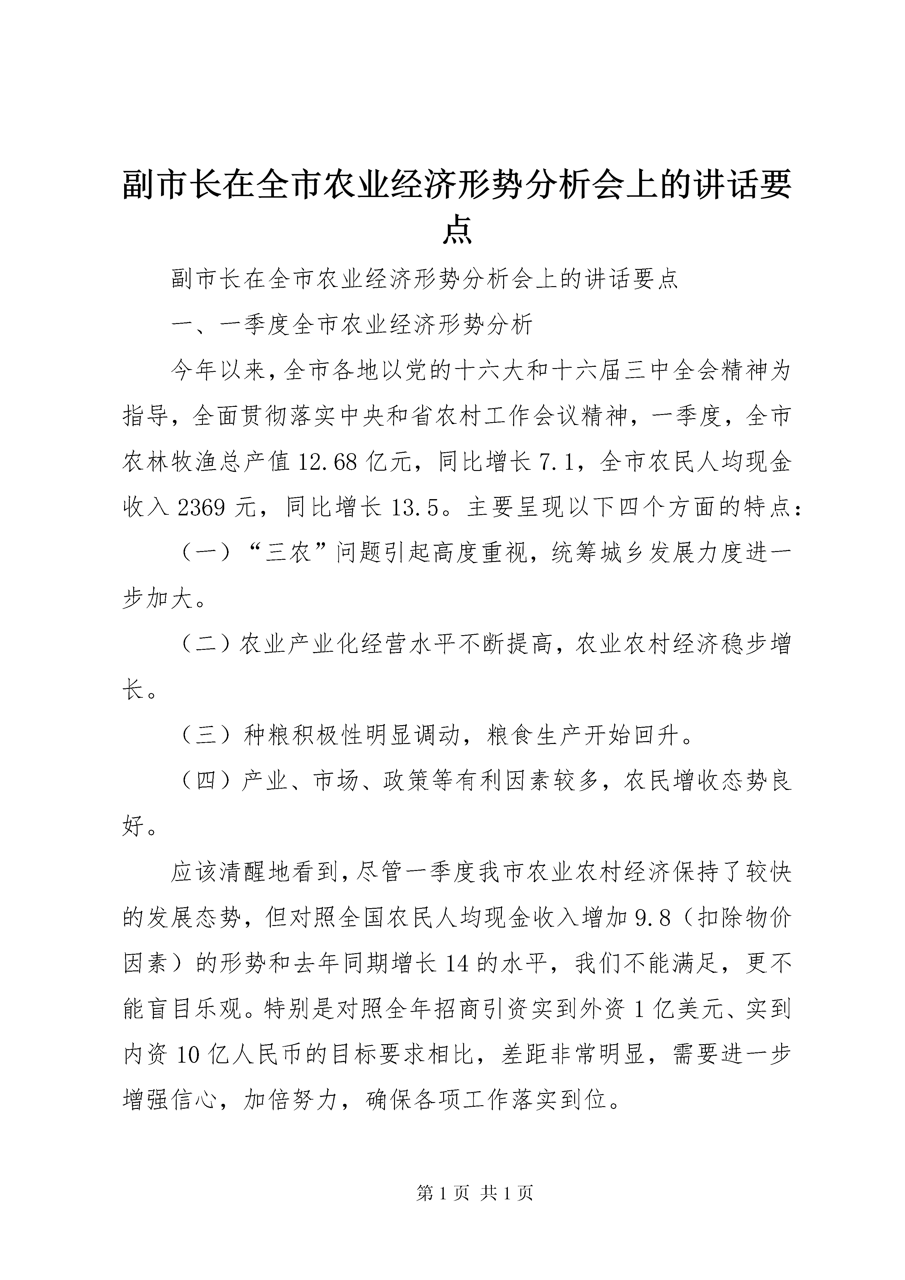 副市长在全市农业经济形势分析会上的讲话要点副市长在全市农业经济形势分析会上的讲话要点一、一季度全市农业经济形势分析今年以来,全市各地以党的十六大和十六届三中全会精神为指导,全面贯彻落实中央和省农村工作会议精神,一季度,全市农林牧渔总产值12.68亿元,同比增长7.1,全市农民人均现金收入2369元,同比增长13.5。主要呈现以下四个方面的特点:(一)“三农”问题引起高度重视,统筹城乡发展力度进一步加大。(二)农业产业化经营水平不断提高,农业农村经济稳步增长。(三)种粮积极性明显调动,粮食生产开始回升。(四)产业、市场、政策等有利因素较多,农民增收态势良好。应该清醒地看到,尽管一季度我市农业农村经济保持了较快的发展态势,但对照全国农民人均现金收入增加9.8(扣除物价因素)的形势和去年同期增长14的水平,我们不能满足,更不能盲目乐观。特别是对照全年招商引资实到外资1亿美元、实到内资10亿人民币的目标要求相比,差距非常明显,需要进一步增强信心,加倍努力,确保各项工作落实到位。二、针对面临的形势,应该把握的指导思想和工作重点当前面临非常难得的发展机遇,各地要认真分析形势,进一步理清发展思路,在指导思想上要继续牢牢把握以市场为导向、以效益为目标,加大结构调整力度,推进农业产业化经营,实现农业增效、农民增收。根据以上的指导思想,当前要正确处理好三个关系,紧紧抓住三项重点工作:一是处理好农业增效、农民增收、农村发展与粮食生产的关系,切实抓好粮食生产。今年以来,全国粮食供求关系发生了急剧变化,粮食市场价格出现大幅回升,粮食问题引起了从中央到地方各级的高度重视,各级都出台了扶持粮食生产的优惠政策,鼓励发展粮食生产。因此,抓紧抓好粮食生产既是当前围绕农业农村工作中心任务,确保农业增效、农民增收、农村稳定的有效途径,也是贯彻“三个代表”重要思想和党的十六大精神,落实科学发展观的具体体现。各地要努力通过落实政策、保护耕地、制止抛荒、改善条件、加强服务等措施,促进粮食增产,实现农民增收。二是处理好发展粮食生产与提升农业产业化水平的关系,继续提高农业产业化经营水平。粮食是我市主要传统产业,也是农业产业化经营的一大内容,提高粮食产业的经营化水平,涉及千家万户农户的利益,对于实现农业增效、农民增收有着非常积极的意义。因此,发展粮食生产同提升农业产业化并不矛盾。在大力发展粮食生产的同时,进一步加大农业招商引资力度,推进特色农产品基地建设,做大做强农产品加工业,提高农产品市场竞争力和农产品附加值,实现农民增收,仍然是当前农业农村工作的重要任务。要继续坚定不移地抓好农业招商引资工作,切实改进工作作风和工作方式,不断拓展农业外资的领域和空间,努力扩大农业招商引资成果。三是处理好第一产业与二、三产业发展的关系,加快农村劳动力转移。增加收入、致富农民,除了发展农业本身之外,关键还在于加快发展非农产业,促进农村劳动力大转移。要继续大力推进城乡一体化进程,加快小城镇建设,推动农村二、三产业大发展,进一步拓展农村劳动力就业渠道。完善农村劳动力培训体系,大力实施百万农民技能培训工程,不断提高农民素质和职业技能,努力扩大农民就业机会,不断减少农民数量,促进农民增收和农村各项事业发展。三、当前要注重做好的几项工作(一)保护耕地、完善延包、制止抛荒。认真贯彻《国务院关于坚决制止占用基本农田进行植树等行为的紧急通知》精神,落实好“五个不准”政策。当前,要立即停止在基本农田上进行植树造林、挖塘养鱼、建设用于畜禽养殖等建筑物的行为。已经种植和建设的,要在尊重农民意愿的基础上,限期纠正。不准违法占用基本农田进行绿色通道和城市绿化隔离带建设,严格按国务院《紧急通知》精神规定道路绿化用地。做好土地承包关系的完善工作,在《农村土地承包法》的框架内抓好稳定、规范、维权、发展四个方面的重点。通过稳定家庭承包经营制度,规范土地承包合同、土地流转、土地依法征用等各种程序和手续,搞活土地经营权,切实维护农民的合法权益,实现有限土地资源的充分利用和土地效能的充分发挥,促进经济效益的提高和农业农村经济的发展。坚决制止全年性抛荒,努力减少季节性抛荒。特别要加大对征而不用而导致全年性抛荒现象的查处力度,对闲置一年的建设用地,收取闲置费;凡抛荒二年、没有开发使用的土地,严格按照有关法律法规,坚决收回、妥善处理。对建设用地征而不用的情况,请市国土部门抓紧组织调查,并切实加强对查处工作的指导。对季节性抛荒现象,要在认真做好政策宣传的基础上,通过各有关部门的优质服务,鼓励农民扩大粮油和经济作物种植面积,努力提高土地复种指数。请市农业局抓紧对季节性抛荒问题进行调查研究。(二)切实重视水利防汛工作,确保安全度汛,为增产增收打好基础,提供良好环境。尽管几年来,我市水利防汛设施建设不断加快,防汛工作不断完