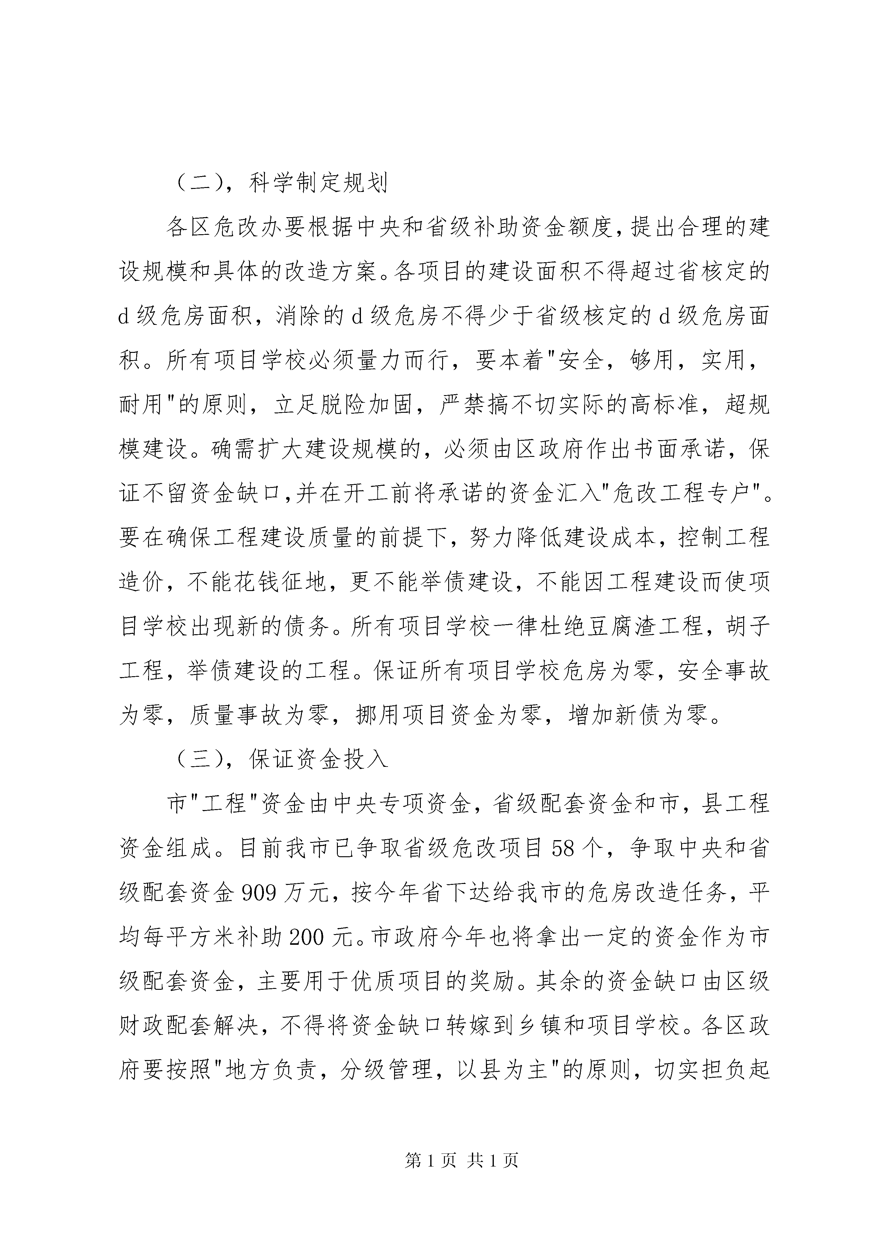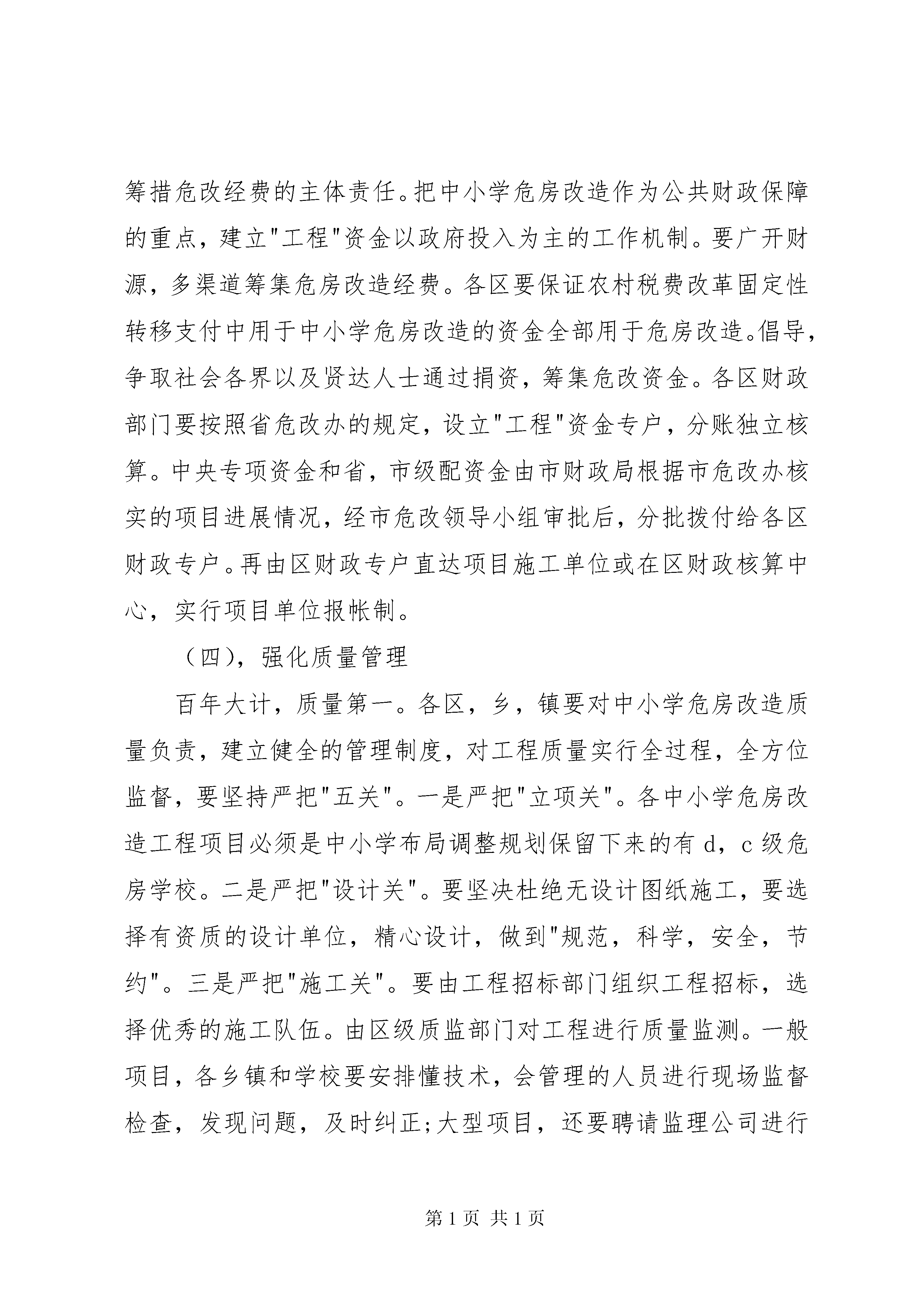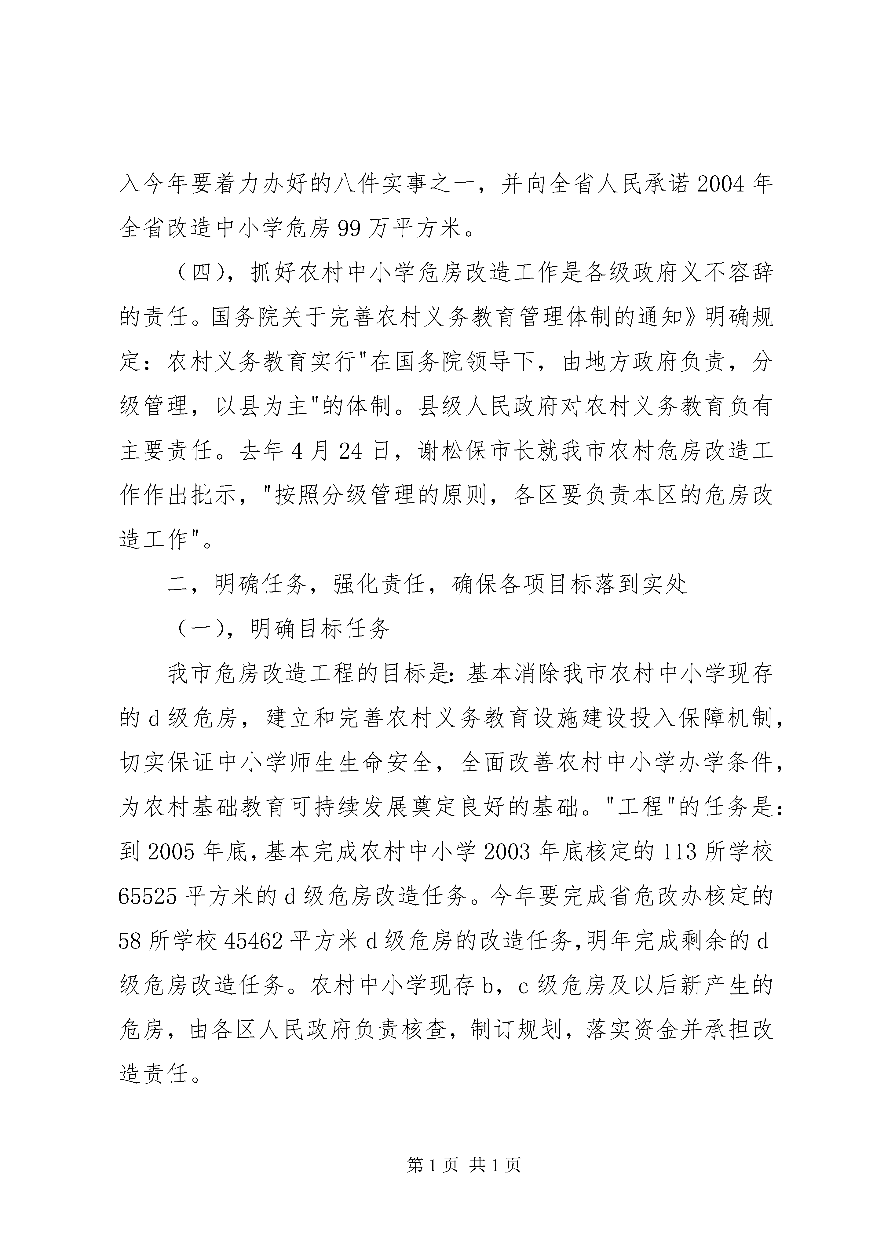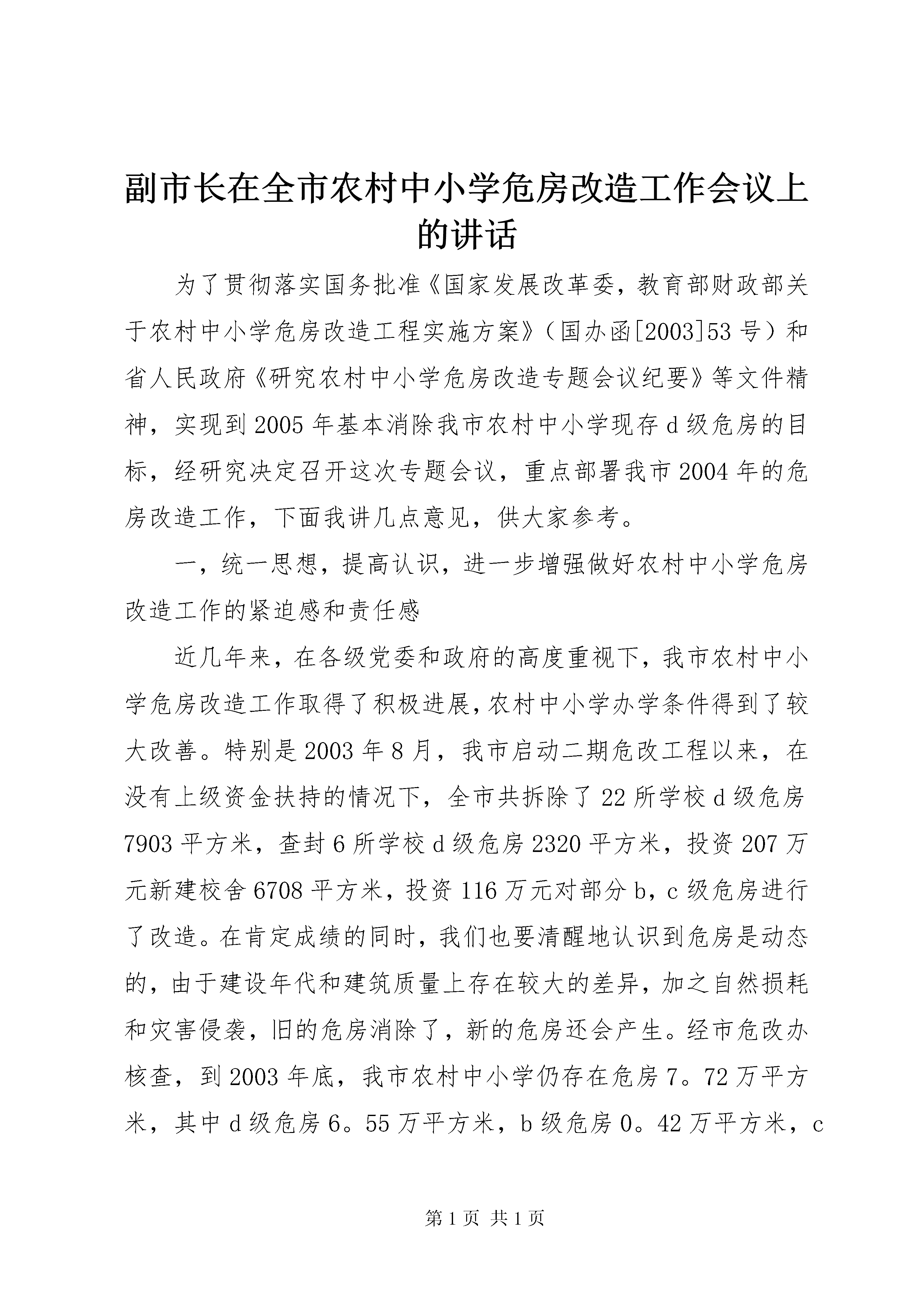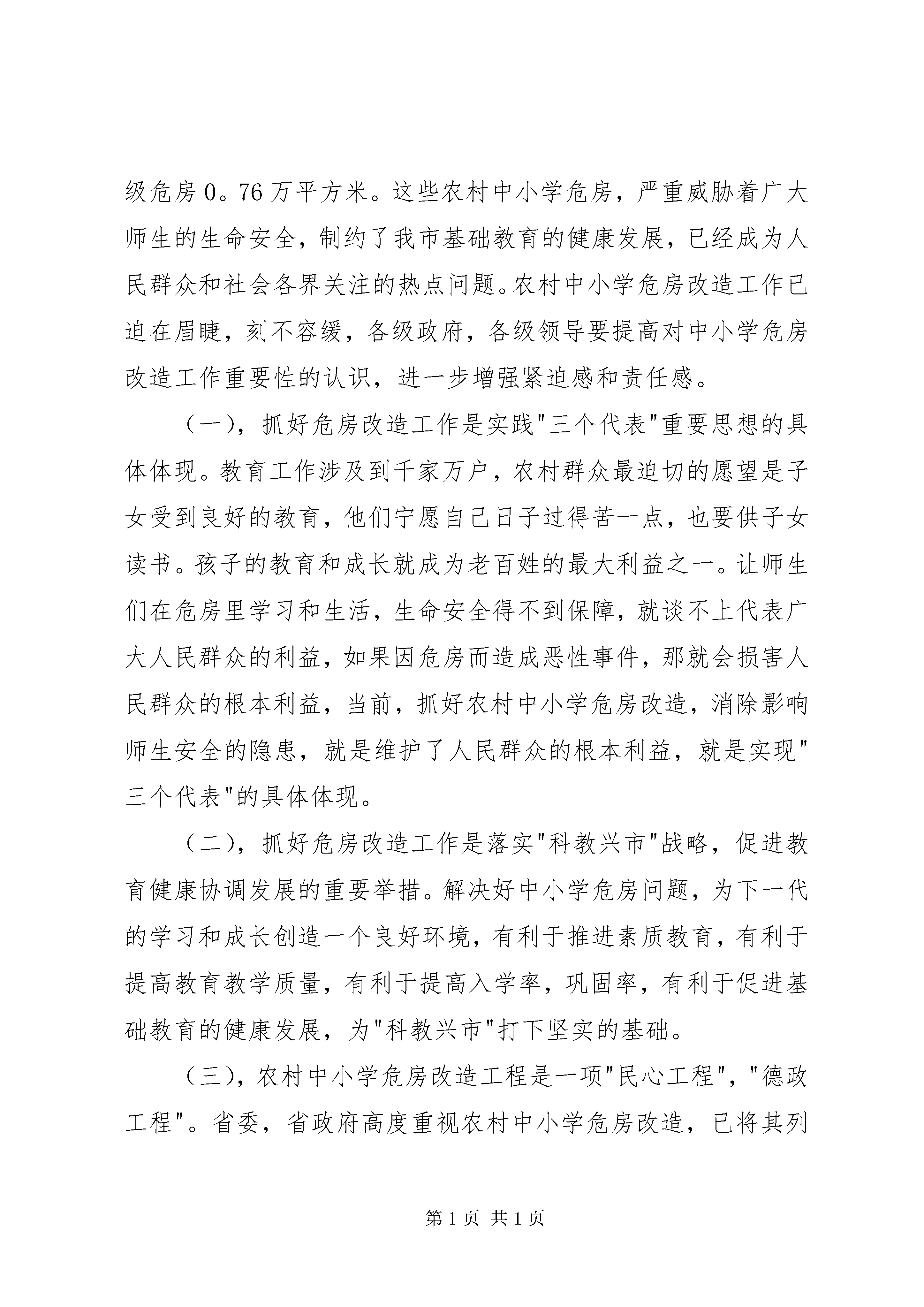 副市长在全市农村中小学危房改造工作会议上的讲话为了贯彻落实国务批准《国家发展改革委,教育部财政部关于农村中小学危房改造工程实施方案》(国办函[2003]53号)和省人民政府《研究农村中小学危房改造专题会议纪要》等文件精神,实现到2005年基本消除我市农村中小学现存d级危房的目标,经研究决定召开这次专题会议,重点部署我市2004年的危房改造工作,下面我讲几点意见,供大家参考。一,统一思想,提高认识,进一步增强做好农村中小学危房改造工作的紧迫感和责任感近几年来,在各级党委和政府的高度重视下,我市农村中小学危房改造工作取得了积极进展,农村中小学办学条件得到了较大改善。特别是2003年8月,我市启动二期危改工程以来,在没有上级资金扶持的情况下,全市共拆除了22所学校d级危房7903平方米,查封6所学校d级危房2320平方米,投资207万元新建校舍6708平方米,投资116万元对部分b,c级危房进行了改造。在肯定成绩的同时,我们也要清醒地认识到危房是动态的,由于建设年代和建筑质量上存在较大的差异,加之自然损耗和灾害侵袭,旧的危房消除了,新的危房还会产生。经市危改办核查,到2003年底,我市农村中小学仍存在危房7。72万平方米,其中d级危房6。55万平方米,b级危房0。42万平方米,c级危房0。76万平方米。这些农村中小学危房,严重威胁着广大师生的生命安全,制约了我市基础教育的健康发展,已经成为人民群众和社会各界关注的热点问题。农村中小学危房改造工作已迫在眉睫,刻不容缓,各级政府,各级领导要提高对中小学危房改造工作重要性的认识,进一步增强紧迫感和责任感。(一),抓好危房改造工作是实践"三个代表"重要思想的具体体现。教育工作涉及到千家万户,农村群众最迫切的愿望是子女受到良好的教育,他们宁愿自己日子过得苦一点,也要供子女读书。孩子的教育和成长就成为老百姓的最大利益之一。让师生们在危房里学习和生活,生命安全得不到保障,就谈不上代表广大人民群众的利益,如果因危房而造成恶性事件,那就会损害人民群众的根本利益,当前,抓好农村中小学危房改造,消除影响师生安全的隐患,就是维护了人民群众的根本利益,就是实现"三个代表"的具体体现。(二),抓好危房改造工作是落实"科教兴市"战略,促进教育健康协调发展的重要举措。解决好中小学危房问题,为下一代的学习和成长创造一个良好环境,有利于推进素质教育,有利于提高教育教学质量,有利于提高入学率,巩固率,有利于促进基础教育的健康发展,为"科教兴市"打下坚实的基础。(三),农村中小学危房改造工程是一项"民心工程","德政工程"。省委,省政府高度重视农村中小学危房改造,已将其列入今年要着力办好的八件实事之一,并向全省人民承诺2004年全省改造中小学危房99万平方米。(四),抓好农村中小学危房改造工作是各级政府义不容辞的责任。国务院关于完善农村义务教育管理体制的通知》明确规定:农村义务教育实行"在国务院领导下,由地方政府负责,分级管理,以县为主"的体制。县级人民政府对农村义务教育负有主要责任。去年4月24日,谢松保市长就我市农村危房改造工作作出批示,"按照分级管理的原则,各区要负责本区的危房改造工作"。二,明确任务,强化责任,确保各项目标落到实处(一),明确目标任务我市危房改造工程的目标是:基本消除我市农村中小学现存的d级危房,建立和完善农村义务教育设施建设投入保障机制,切实保证中小学师生生命安全,全面改善农村中小学办学条件,为农村基础教育可持续发展奠定良好的基础。"工程"的任务是:到2005年底,基本完成农村中小学2003年底核定的113所学校65525平方米的d级危房改造任务。今年要完成省危改办核定的58所学校45462平方米d级危房的改造任务,明年完成剩余的d级危房改造任务。农村中小学现存b,c级危房及以后新产生的危房,由各区人民政府负责核查,制订规划,落实资金并承担改造责任。(二),科学制定规划各区危改办要根据中央和省级补助资金额度,提出合理的建设规模和具体的改造方案。各项目的建设面积不得超过省核定的d级危房面积,消除的d级危房不得少于省级核定的d级危房面积。所有项目学校必须量力而行,要本着"安全,够用,实用,耐用"的原则,立足脱险加固,严禁搞不切实际的高标准,超规模建设。确需扩大建设规模的,必须由区政府作出书面承诺,保证不留资金缺口,并在开工前将承诺的资金汇入"危改工程专户"。要在确保工程建设质量的前提下,努力降低建设成本,控制工程造价,不能花钱征地,更不能举债建设,不能因工程建设而使项目学校出现新的债务。所有项目学校一律杜绝豆腐渣工程,胡子工程,举债建设的工程。保证所有项目学校危房为零,安全事故为零,质量事故为零,挪用项目资金为零,增加新债为零。(三),保证资金投入市"工程"资金由中央专项资金