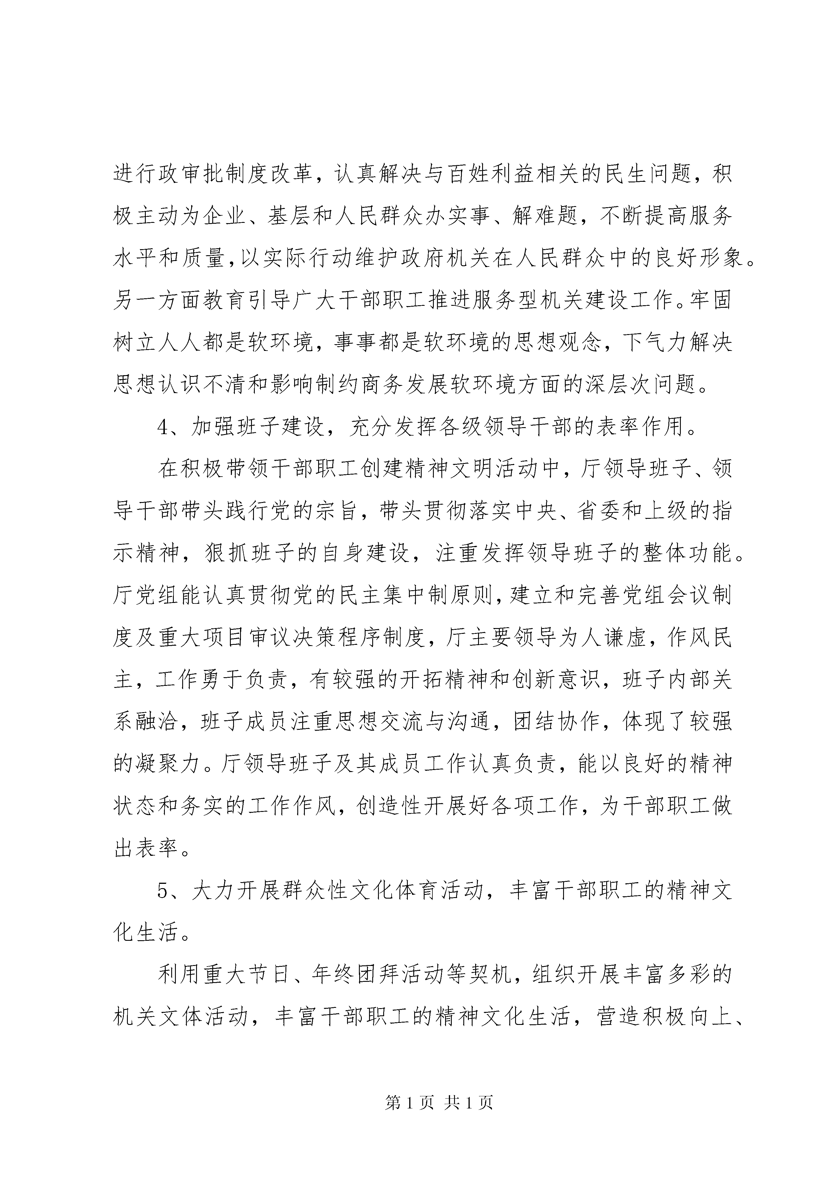 创建精神文明工作汇报根据省精神文明建设指导委员会办公室关于全省文明单位和全省精神文明建设工作先进单位评选推荐工作的部署要求,我们把厅机关近两年来开展精神文明创建工作的有关情况汇报如下:一、基本情况省商务厅是省政府的重要组成部门,主要职能包括国内贸易和流通产业发展,对外贸易,境外投资、对外工程承包和外派劳务合作,服务贸易发展,会展行业管理等,同时负责协调全省口岸建设和管理工作,承担全省双打(打击侵犯知识产权、打击制售假冒伪劣商品)工作领导小组办公室日常工作。厅机关内设机构26个(不含机关党委、驻厅纪检监察室)。厅机关行政人员编制154名;有直属事业单位14家,职工593人。拉动经济增长的三驾马车,省商务厅有两驾,即消费与出口,还承担全省社会消费品零售总额和外贸进出口两项重要经济发展指标的调控职能。在省委省政府的正确领导和悉心指导下,近年来,经商务系统全体干部职工共同努力,20XX年我们获得精神文明创建工作先进单位表彰。创建工作有力的促进了商务工作各项目标任务的完成。通过深入扎实的开展精神文明创建活动,厅机关干部职工的精神面貌和思想道德素质有了大幅度提高,各项工作得到了上级领导、有关部门的一致好评。省商务厅曾先后被评为全国科技兴贸工作先进单位、全国社区商业双进工程工作先进集体,被省政府评为对外开放突出贡献单位,连年被省政府评为绩效评估优秀单位和政行风软环境建设群众满意单位。二、继续抓好创建工作,持续有效的开展精神文明建设1、建立健全精神文明创建工作的组织机制。精神文明建设是我厅一项长期工作,在创建工作中,我们不断加大组织领导和行政推动力度,进一步建立健全工作机制,确保创建工作持续、深入、有效开展。一是建立领导负责制。成立了由厅党组书记、厅长任组长,其他厅领导为成员的创建工作领导小组,建立了党组统一领导、主要领导亲自抓、分管领导抓落实、各部门齐抓共管的创建领导体制和工作机制。二是建立长效管理保障机制。结合省商务厅工作实际,制定了创建精神文明建设规划,按照规划要求逐项分解任务,并纳入全厅年度工作岗位目标考核,做到年初有计划、年中有督查、年末有总结。厅党组定期召开会议,研究、部署创建工作,真正从组织、制度、经费上为创建活动提供坚强保证。三是建立考核监督机制。我们把精神文明创建工作与完成商务工作中心任务、与加强机关党建和作风建设紧密结合,做到同部署、同检查、同考核、同奖惩,厅纪检监察部门认真履行效能监察职能,保证了创建工作的有序进行。2、加强文明创建思想教育,提高干部职工的整体素质。在开展创建精神文明活动中,我们紧密联系商务工作和干部职工实际,采取各种积极措施和有效办法,并结合主题实践活动,大力加强思想教育工作,着力提高干部职工的整体素质。一是深入开展中国梦主题实践学习活动。加强全厅党员干部特别是领导干部学习领会习近平总书记提出的中国梦内涵,理清中国梦阐述的国家未来发展走向的重大问题,把中国梦、商务梦的宣传教育不断引向深入。学习中国梦的内涵、精神实质和根本要求,形成推动商务科学发展的新的强大合力。二是制定坚定、团结、实干、清廉班子建设八字方针,勤勉敬业、求真务实、开拓创新、作风过硬队伍建设16字厅训。本着统一思想、凝聚人心、振奋精神的原则,积极组织广大干部职工开展弘扬中国梦,畅想商务梦的主题演讲比赛。开辟青年论坛、商务论坛等系列活动,召开青年干部谈哲学学哲学系列座谈活动。三是积极开展弘扬社会主义核心价值观,树新风正气,促和谐发展主题实践活动,狠抓思想观念、工作作风的转变,评比树立了一批弘扬新风正气的先进共产党员典型,表彰了一批先进党支部和优秀党务工作者,进一步加强了全系统干部职工的思想政治建设。3、转变作风,抓好五型机关建设标准的硬杠杠。转变职能,改进作风。在创建精神文明活动中,厅机关按照省委省政府的工作部署要求,努力推进管理创新,深化服务型机关制度机制建设。一方面注重加强制度建设,制定出台促进发展的相关政策。坚持依法行政,改进工作作风,加强政务公开,推进行政审批制度改革,认真解决与百姓利益相关的民生问题,积极主动为企业、基层和人民群众办实事、解难题,不断提高服务水平和质量,以实际行动维护政府机关在人民群众中的良好形象。另一方面教育引导广大干部职工推进服务型机关建设工作。牢固树立人人都是软环境,事事都是软环境的思想观念,下气力解决思想认识不清和影响制约商务发展软环境方面的深层次问题。4、加强班子建设,充分发挥各级领导干部的表率作用。在积极带领干部职工创建精神文明活动中,厅领导班子、领导干部带头践行党的宗旨,带头贯彻落实中央、省委和上级的指示精神,狠抓班子的自身建设,注重发挥领导班子的整体功能。厅党组能认真贯彻党的民主集中制原则,建立和完善党组会议制度及重大项目审议决策程序制度,厅主要领导为人谦虚,作风民主,工作勇