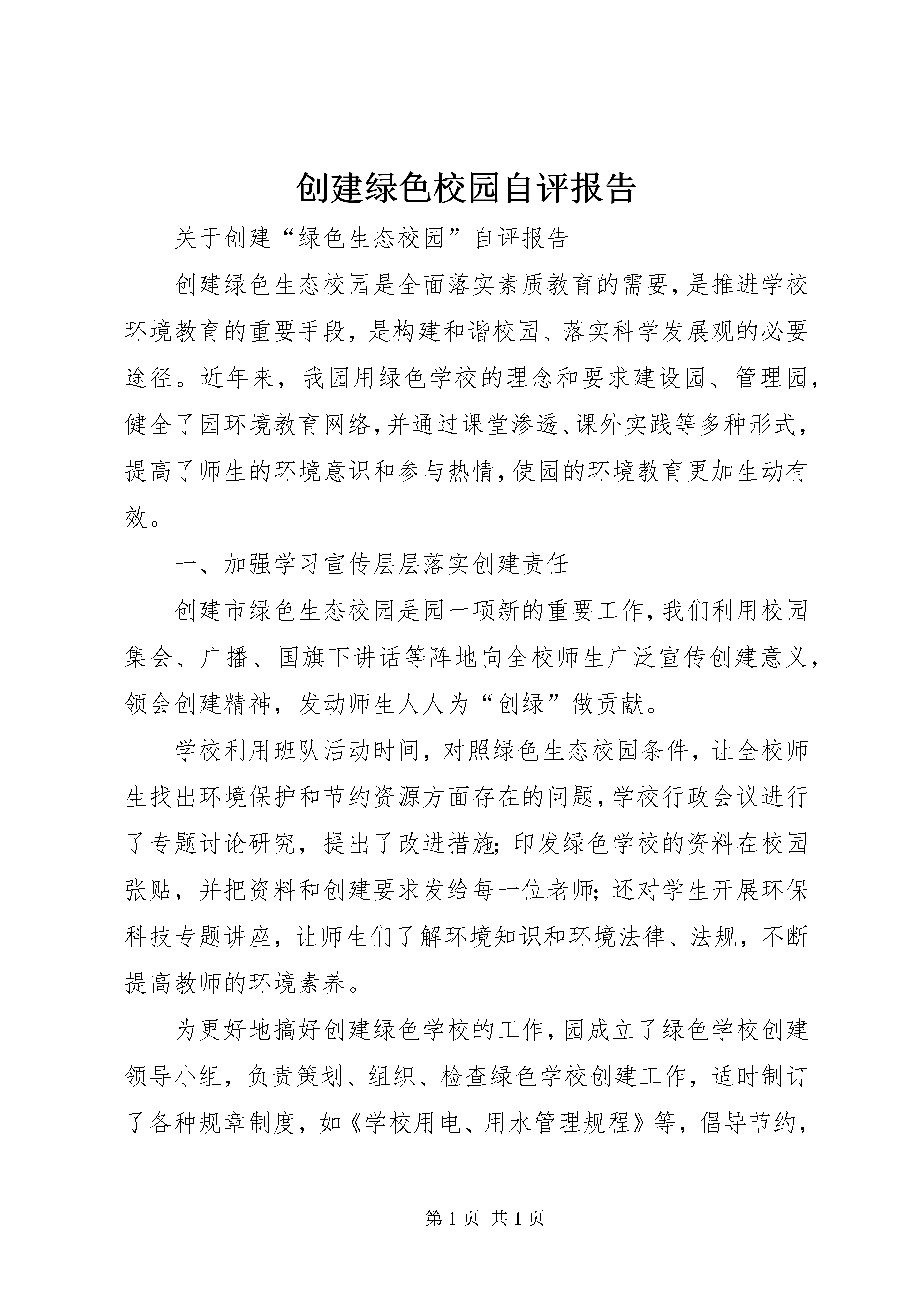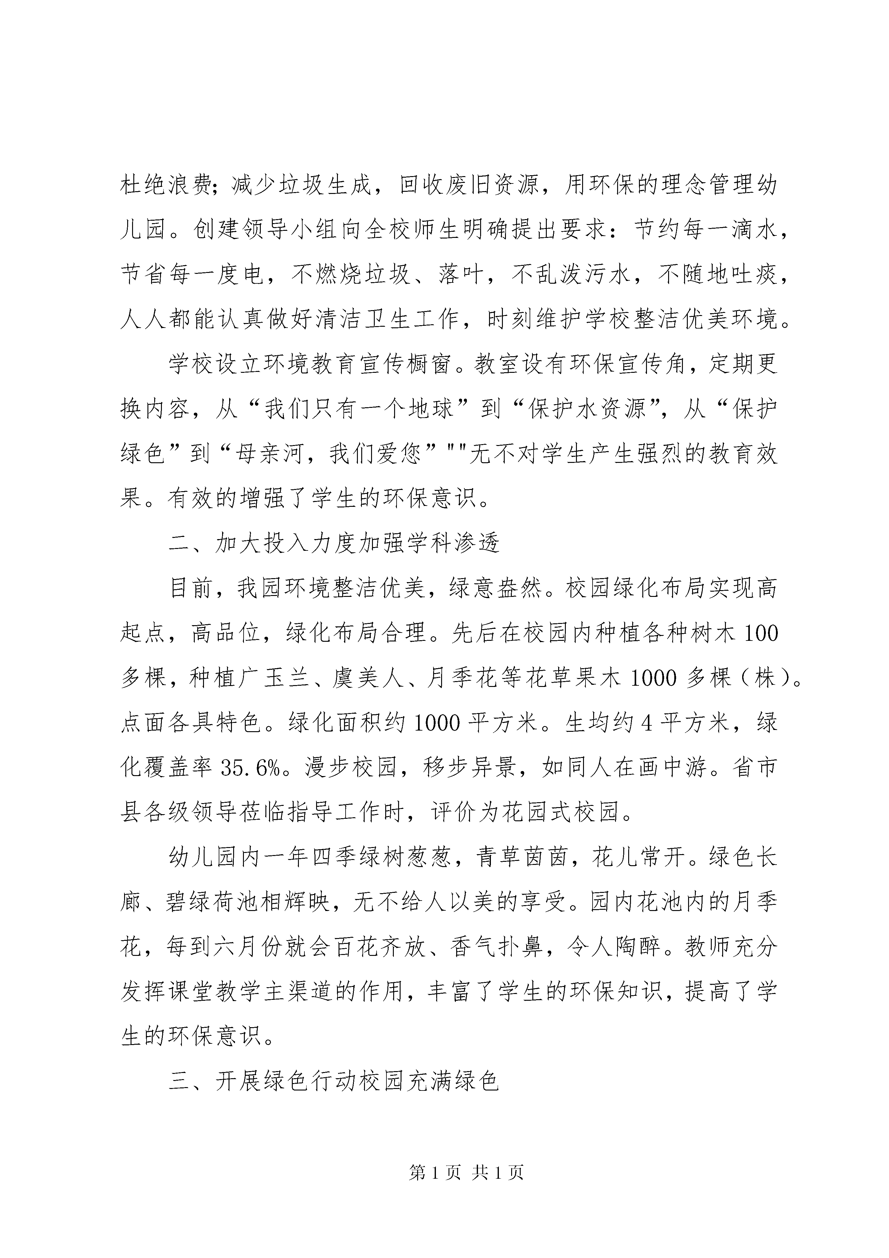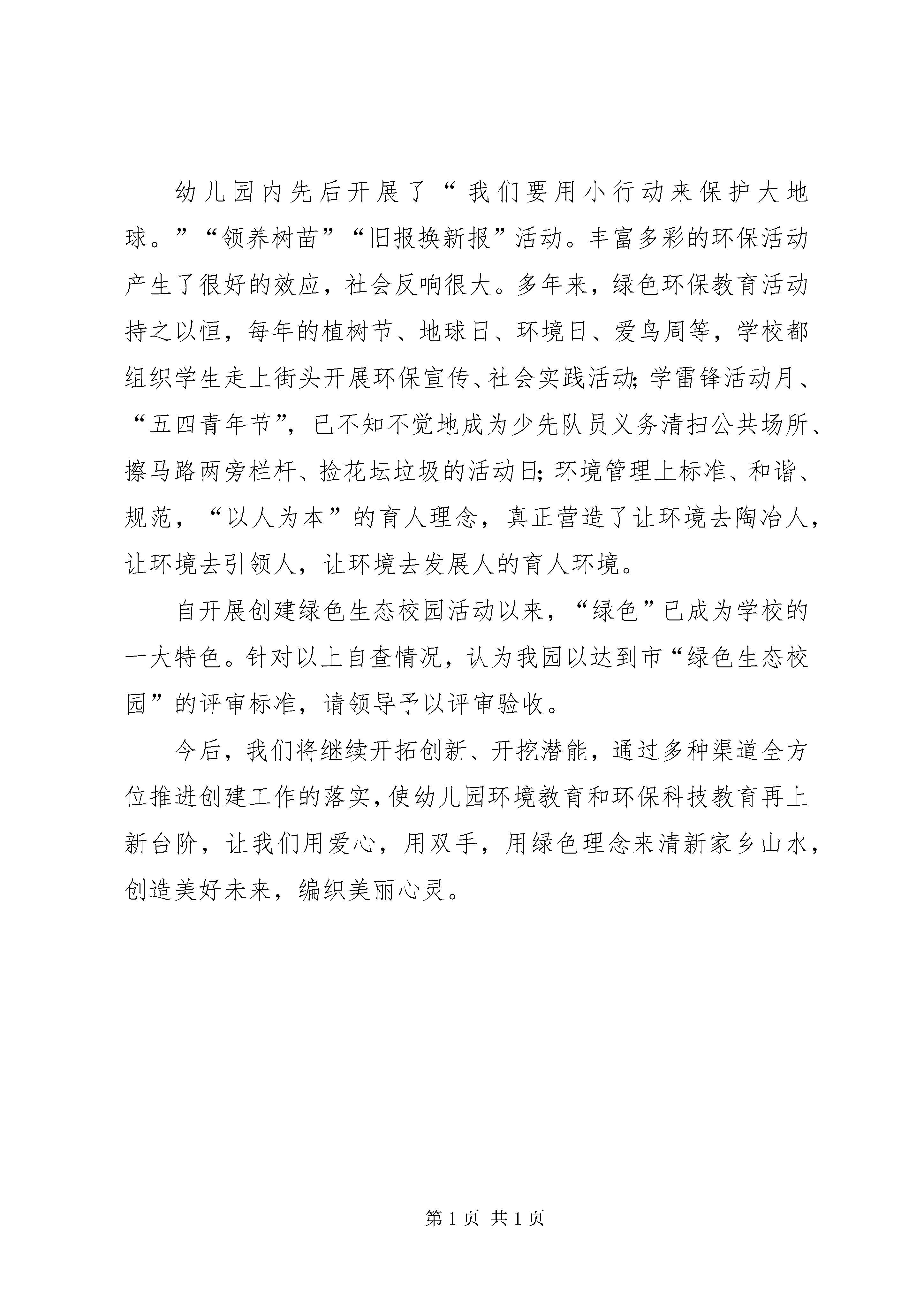 创建绿色校园自评报告关于创建“绿色生态校园”自评报告创建绿色生态校园是全面落实素质教育的需要,是推进学校环境教育的重要手段,是构建和谐校园、落实科学发展观的必要途径。近年来,我园用绿色学校的理念和要求建设园、管理园,健全了园环境教育网络,并通过课堂渗透、课外实践等多种形式,提高了师生的环境意识和参与热情,使园的环境教育更加生动有效。一、加强学习宣传层层落实创建责任创建市绿色生态校园是园一项新的重要工作,我们利用校园集会、广播、国旗下讲话等阵地向全校师生广泛宣传创建意义,领会创建精神,发动师生人人为“创绿”做贡献。学校利用班队活动时间,对照绿色生态校园条件,让全校师生找出环境保护和节约资源方面存在的问题,学校行政会议进行了专题讨论研究,提出了改进措施;印发绿色学校的资料在校园张贴,并把资料和创建要求发给每一位老师;还对学生开展环保科技专题讲座,让师生们了解环境知识和环境法律、法规,不断提高教师的环境素养。为更好地搞好创建绿色学校的工作,园成立了绿色学校创建领导小组,负责策划、组织、检查绿色学校创建工作,适时制订了各种规章制度,如《学校用电、用水管理规程》等,倡导节约,杜绝浪费;减少垃圾生成,回收废旧资源,用环保的理念管理幼儿园。创建领导小组向全校师生明确提出要求:节约每一滴水,节省每一度电,不燃烧垃圾、落叶,不乱泼污水,不随地吐痰,人人都能认真做好清洁卫生工作,时刻维护学校整洁优美环境。学校设立环境教育宣传橱窗。教室设有环保宣传角,定期更换内容,从“我们只有一个地球”到“保护水资源”,从“保护绿色”到“母亲河,我们爱您”""无不对学生产生强烈的教育效果。有效的增强了学生的环保意识。二、加大投入力度加强学科渗透目前,我园环境整洁优美,绿意盎然。校园绿化布局实现高起点,高品位,绿化布局合理。先后在校园内种植各种树木100多棵,种植广玉兰、虞美人、月季花等花草果木1000多棵(株)。点面各具特色。绿化面积约1000平方米。生均约4平方米,绿化覆盖率35.6%。漫步校园,移步异景,如同人在画中游。省市县各级领导莅临指导工作时,评价为花园式校园。幼儿园内一年四季绿树葱葱,青草茵茵,花儿常开。绿色长廊、碧绿荷池相辉映,无不给人以美的享受。园内花池内的月季花,每到六月份就会百花齐放、香气扑鼻,令人陶醉。教师充分发挥课堂教学主渠道的作用,丰富了学生的环保知识,提高了学生的环保意识。三、开展绿色行动校园充满绿色幼儿园内先后开展了“我们要用小行动来保护大地球。”“领养树苗”“旧报换新报”活动。丰富多彩的环保活动产生了很好的效应,社会反响很大。多年来,绿色环保教育活动持之以恒,每年的植树节、地球日、环境日、爱鸟周等,学校都组织学生走上街头开展环保宣传、社会实践活动;学雷锋活动月、“五四青年节”,已不知不觉地成为少先队员义务清扫公共场所、擦马路两旁栏杆、捡花坛垃圾的活动日;环境管理上标准、和谐、规范,“以人为本”的育人理念,真正营造了让环境去陶冶人,让环境去引领人,让环境去发展人的育人环境。自开展创建绿色生态校园活动以来,“绿色”已成为学校的一大特色。针对以上自查情况,认为我园以达到市“绿色生态校园”的评审标准,请领导予以评审验收。今后,我们将继续开拓创新、开挖潜能,通过多种渠道全方位推进创建工作的落实,使幼儿园环境教育和环保科技教育再上新台阶,让我们用爱心,用双手,用绿色理念来清新家乡山水,创造美好未来,编织美丽心灵。