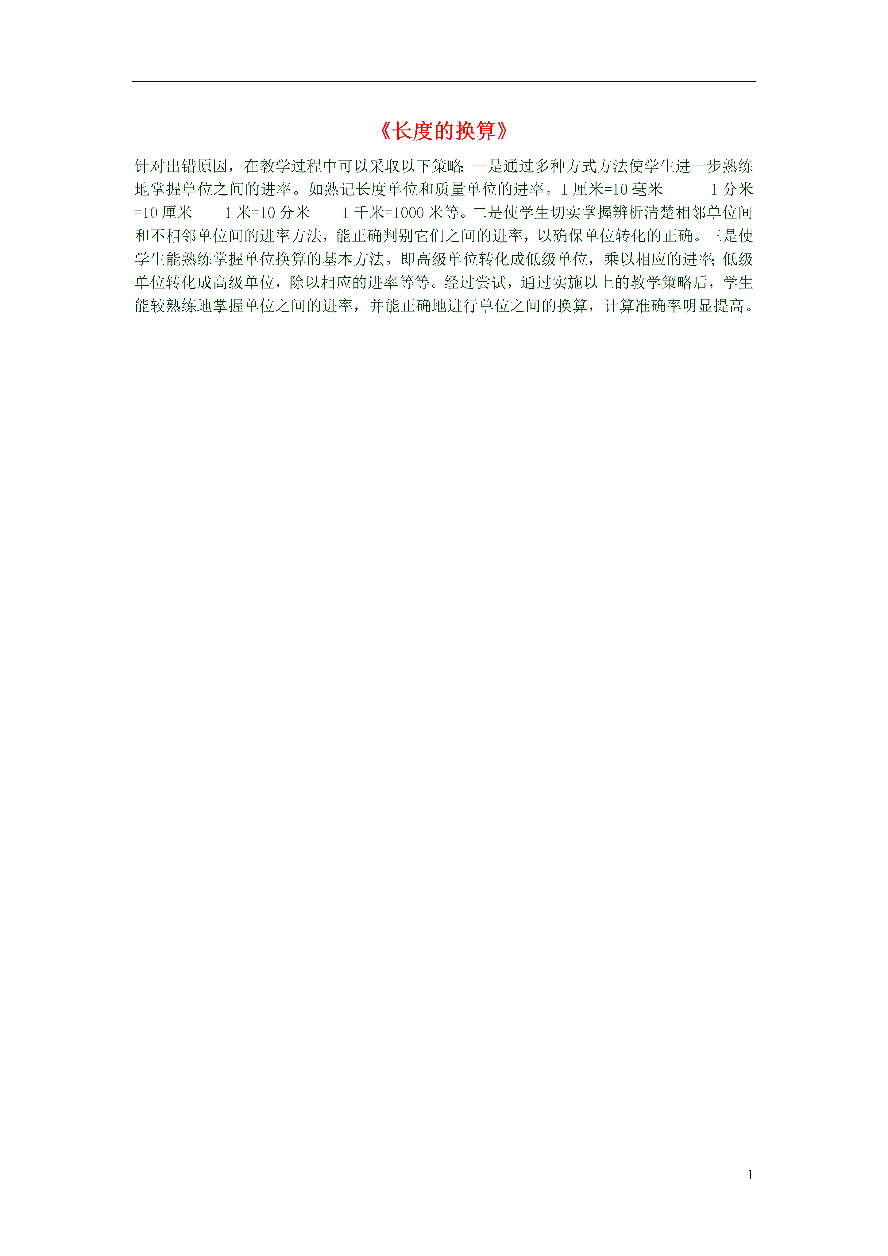 1《长度的换算》针对出错原因,在教学过程中可以采取以下策略:一是通过多种方式方法使学生进一步熟练地掌握单位之间的进率。如熟记长度单位和质量单位的进率。1厘米=10毫米1分米=10厘米1米=10分米1千米=1000米等。二是使学生切实掌握辨析清楚相邻单位间和不相邻单位间的进率方法,能正确判别它们之间的进率,以确保单位转化的正确。三是使学生能熟练掌握单位换算的基本方法。即高级单位转化成低级单位,乘以相应的进率;低级单位转化成高级单位,除以相应的进率等等。经过尝试,通过实施以上的教学策略后,学生能较熟练地掌握单位之间的进率,并能正确地进行单位之间的换算,计算准确率明显提高。