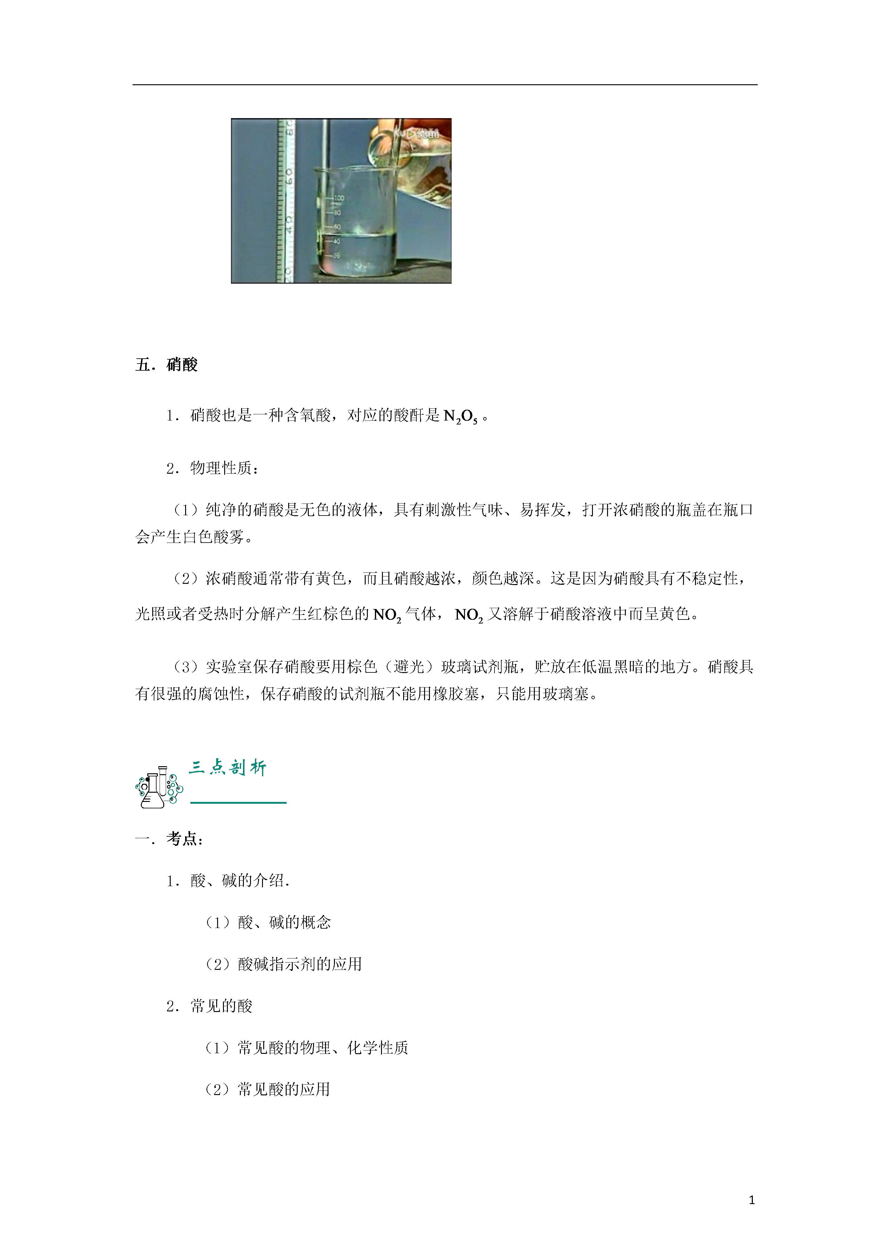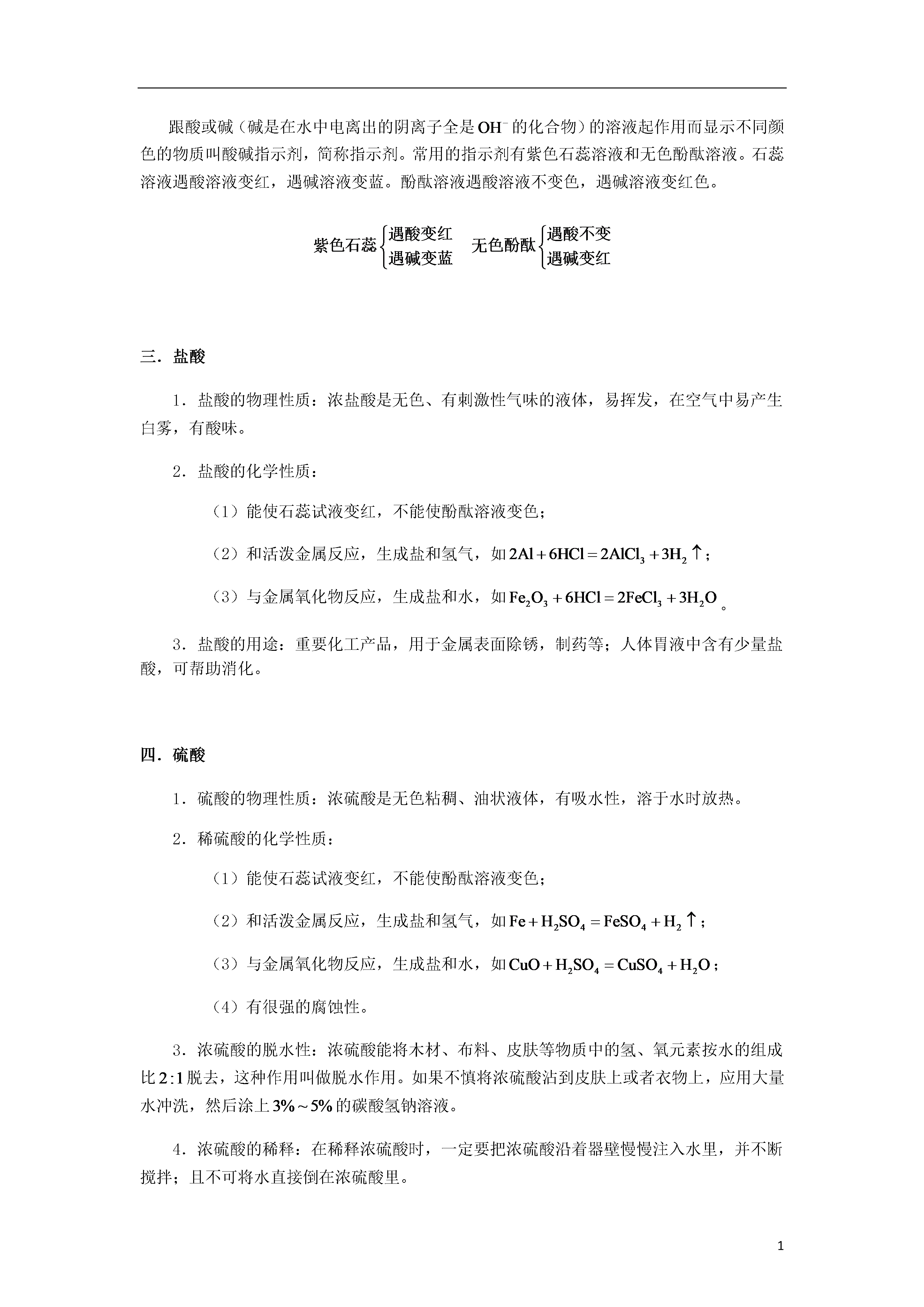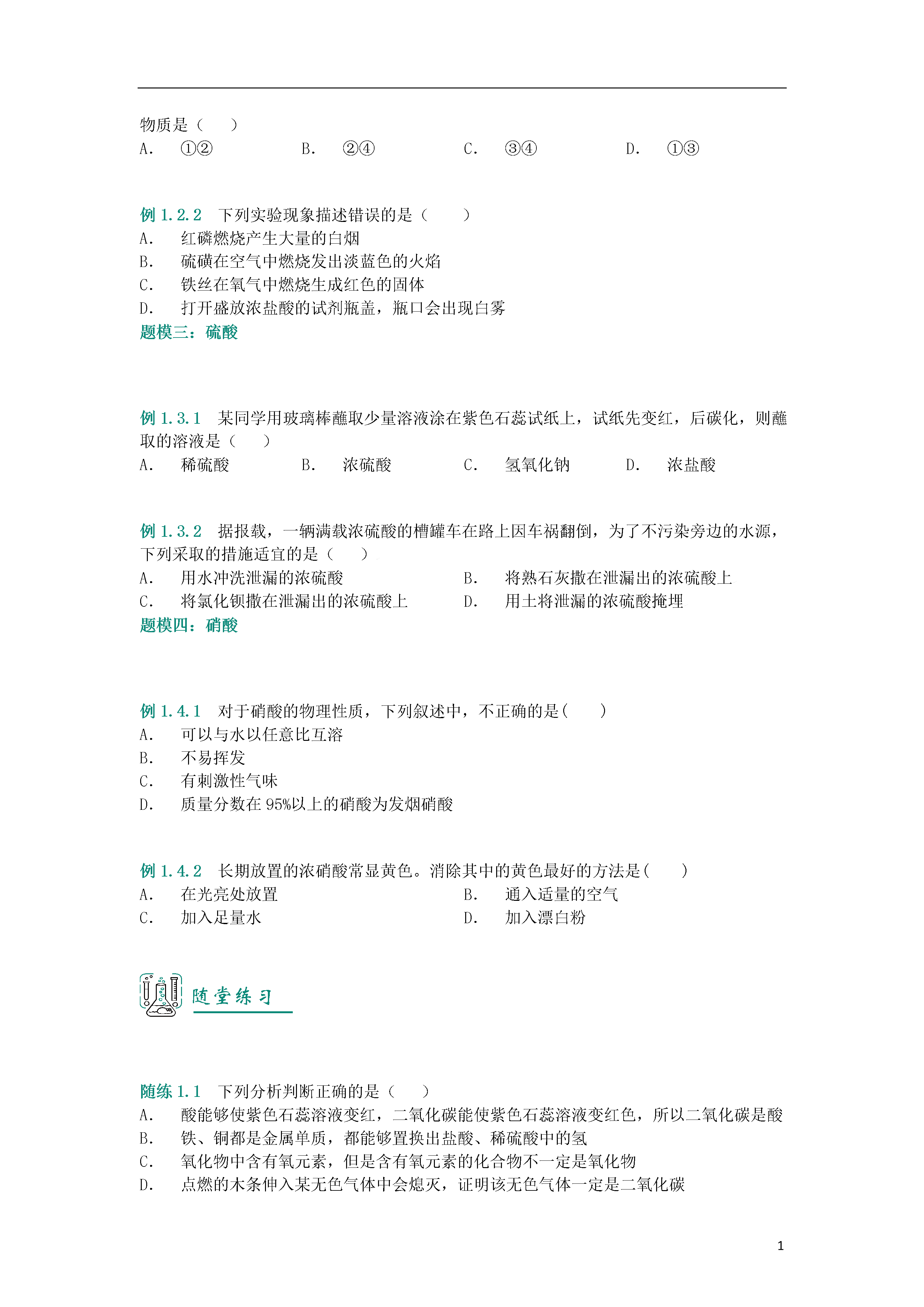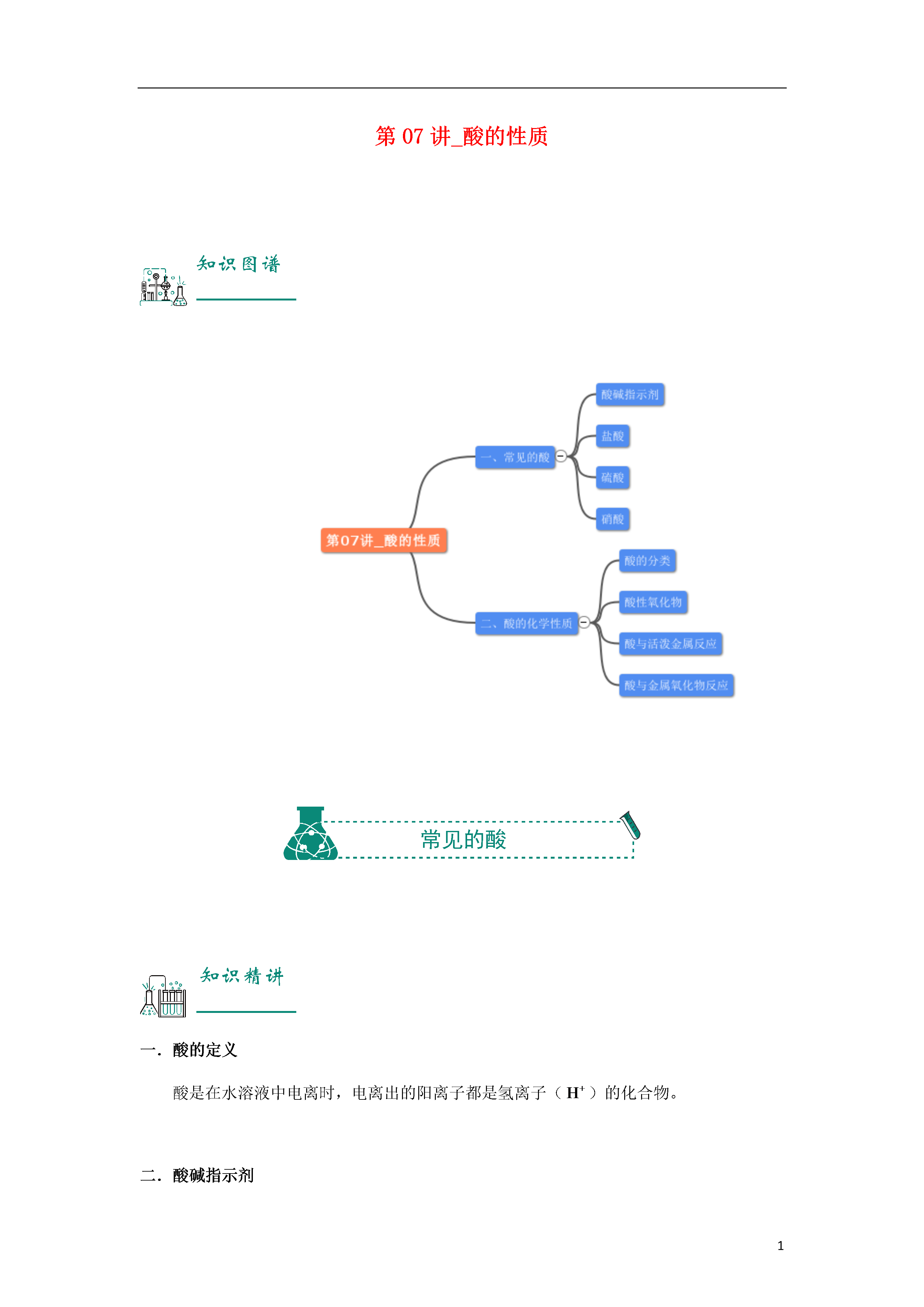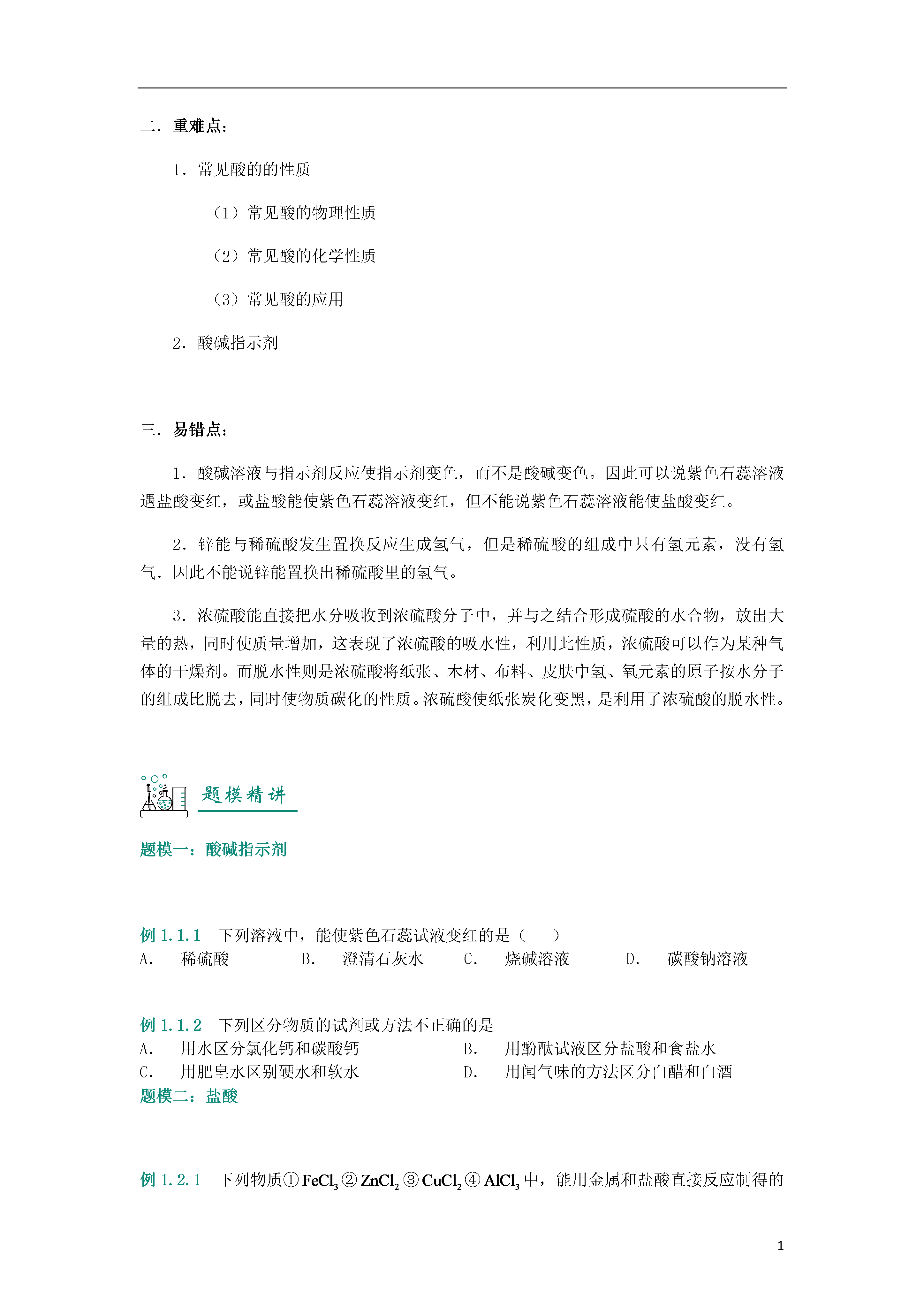 1第07讲_酸的性质知识图谱常见的酸知识精讲一.酸的定义酸是在水溶液中电离时,电离出的阳离子都是氢离子()的化合物。二.酸碱指示剂跟酸或碱(碱是在水中电离出的阴离子全是的化合物)的溶液起作用而显示不同颜色的物质叫酸碱指示剂,简称指示剂。常用的指示剂有紫色石蕊溶液和无色酚酞溶液。石蕊溶液遇酸溶液变红,遇碱溶液变蓝。酚酞溶液遇酸溶液不变色,遇碱溶液变红色。三.盐酸1.盐酸的物理性质:浓盐酸是无色、有刺激性气味的液体,易挥发,在空气中易产生白雾,有酸味。2.盐酸的化学性质:(1)能使石蕊试液变红,不能使酚酞溶液变色;(2)和活泼金属反应,生成盐和氢气,如;(3)与金属氧化物反应,生成盐和水,如。3.盐酸的用途:重要化工产品,用于金属表面除锈,制药等;人体胃液中含有少量盐酸,可帮助消化。四.硫酸1.硫酸的物理性质:浓硫酸是无色粘稠、油状液体,有吸水性,溶于水时放热。2.稀硫酸的化学性质:(1)能使石蕊试液变红,不能使酚酞溶液变色;(2)和活泼金属反应,生成盐和氢气,如;(3)与金属氧化物反应,生成盐和水,如;(4)有很强的腐蚀性。3.浓硫酸的脱水性:浓硫酸能将木材、布料、皮肤等物质中的氢、氧元素按水的组成比脱去,这种作用叫做脱水作用。如果不慎将浓硫酸沾到皮肤上或者衣物上,应用大量水冲洗,然后涂上的碳酸氢钠溶液。4.浓硫酸的稀释:在稀释浓硫酸时,一定要把浓硫酸沿着器壁慢慢注入水里,并不断搅拌;且不可将水直接倒在浓硫酸里。五.硝酸1.硝酸也是一种含氧酸,对应的酸酐是。2.物理性质:(1)纯净的硝酸是无色的液体,具有刺激性气味、易挥发,打开浓硝酸的瓶盖在瓶口会产生白色酸雾。(2)浓硝酸通常带有黄色,而且硝酸越浓,颜色越深。这是因为硝酸具有不稳定性,光照或者受热时分解产生红棕色的气体,又溶解于硝酸溶液中而呈黄色。(3)实验室保存硝酸要用棕色(避光)玻璃试剂瓶,贮放在低温黑暗的地方。硝酸具有很强的腐蚀性,保存硝酸的试剂瓶不能用橡胶塞,只能用玻璃塞。三点剖析一.考点:1.酸、碱的介绍.(1)酸、碱的概念(2)酸碱指示剂的应用2.常见的酸(1)常见酸的物理、化学性质(2)常见酸的应用二.重难点:1.常见酸的的性质(1)常见酸的物理性质(2)常见酸的化学性质(3)常见酸的应用2.酸碱指示剂三.易错点:1.酸碱溶液与指示剂反应使指示剂变色,而不是酸碱变色。因此可以说紫色石蕊溶液遇盐酸变红,或盐酸能使紫色石蕊溶液变红,但不能说紫色石蕊溶液能使盐酸变红。2.锌能与稀硫酸发生置换反应生成氢气,但是稀硫酸的组成中只有氢元素,没有氢气.因此不能说锌能置换出稀硫酸里的氢气。3.浓硫酸能直接把水分吸收到浓硫酸分子中,并与之结合形成硫酸的水合物,放出大量的热,同时使质量增加,这表现了浓硫酸的吸水性,利用此性质,浓硫酸可以作为某种气体的干燥剂。而脱水性则是浓硫酸将纸张、木材、布料、皮肤中氢、氧元素的原子按水分子的组成比脱去,同时使物质碳化的性质。浓硫酸使纸张炭化变黑,是利用了浓硫酸的脱水性。题模精讲题模一:酸碱指示剂例1.1.1下列溶液中,能使紫色石蕊试液变红的是()A.稀硫酸B.澄清石灰水C.烧碱溶液D.碳酸钠溶液例1.1.2下列区分物质的试剂或方法不正确的是____A.用水区分氯化钙和碳酸钙B.用酚酞试液区分盐酸和食盐水C.用肥皂水区别硬水和软水D.用闻气味的方法区分白醋和白酒题模二:盐酸例1.2.1下列物质①②③④中,能用金属和盐酸直接反应制得的物质是()A.①②B.②④C.③④D.①③例1.2.2下列实验现象描述错误的是()A.红磷燃烧产生大量的白烟B.硫磺在空气中燃烧发出淡蓝色的火焰C.铁丝在氧气中燃烧生成红色的固体D.打开盛放浓盐酸的试剂瓶盖,瓶口会出现白雾题模三:硫酸例1.3.1某同学用玻璃棒蘸取少量溶液涂在紫色石蕊试纸上,试纸先变红,后碳化,则蘸取的溶液是()A.稀硫酸B.浓硫酸C.氢氧化钠D.浓盐酸例1.3.2据报载,一辆满载浓硫酸的槽罐车在路上因车祸翻倒,为了不污染旁边的水源,下列采取的措施适宜的是()A.用水冲洗泄漏的浓硫酸B.将熟石灰撒在泄漏出的浓硫酸上C.将氯化钡撒在泄漏出的浓硫酸上D.用土将泄漏的浓硫酸掩埋题模四:硝酸例1.4.1对于硝酸的物理性质,下列叙述中,不正确的是()A.可以与水以任意比互溶B.不易挥发C.有刺激性气味D.质量分数在95%以上的硝酸为发烟硝酸例1.4.2长期放置的浓硝酸常显黄色。消除其中的黄色最好的方法是()A.在光亮处放置B.通入适量的空气C.加入足量水D.加入漂白粉随堂练习随练1.1下列分析判断正
