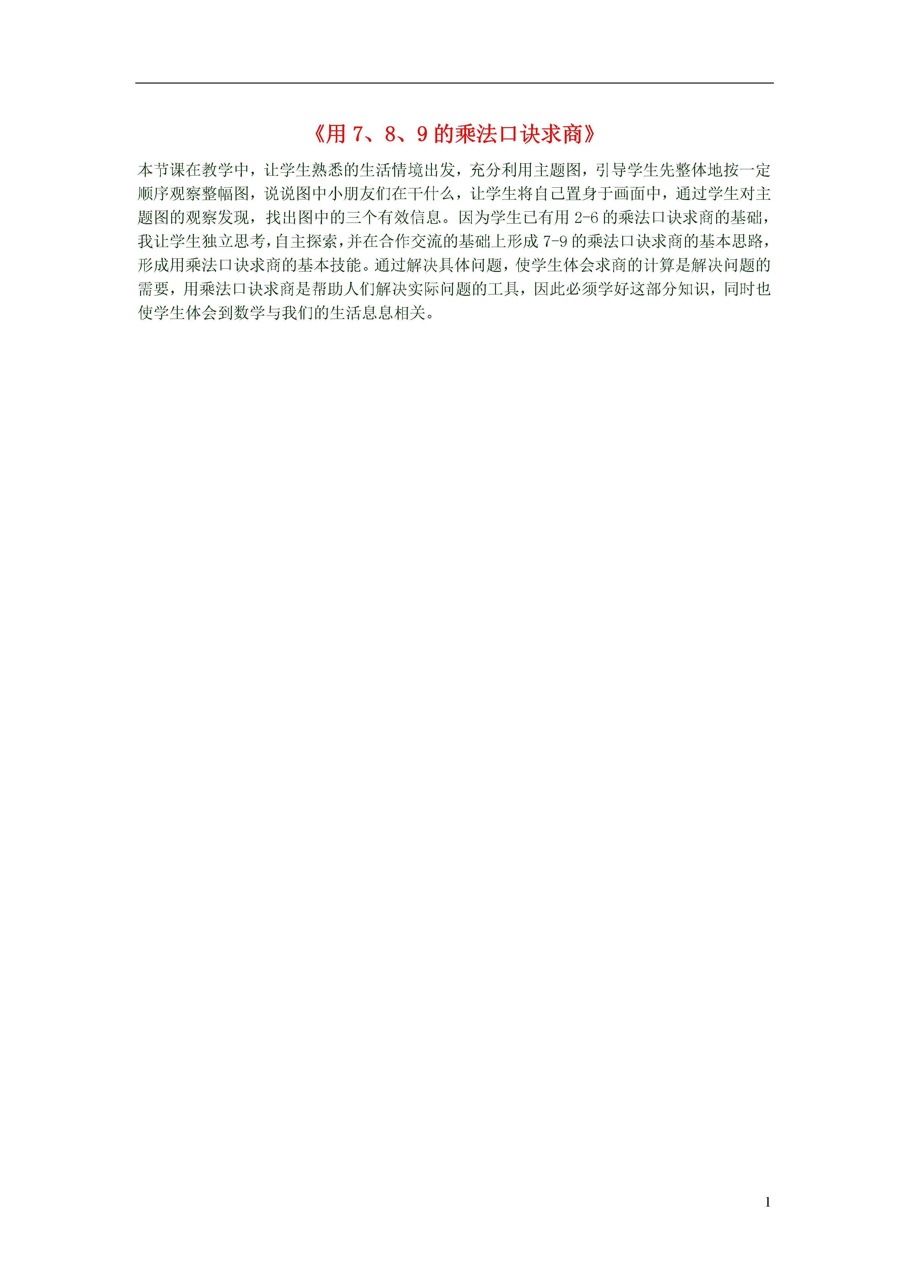 1《用7、8、9的乘法口诀求商》本节课在教学中,让学生熟悉的生活情境出发,充分利用主题图,引导学生先整体地按一定顺序观察整幅图,说说图中小朋友们在干什么,让学生将自己置身于画面中,通过学生对主题图的观察发现,找出图中的三个有效信息。因为学生已有用2-6的乘法口诀求商的基础,我让学生独立思考,自主探索,并在合作交流的基础上形成7-9的乘法口诀求商的基本思路,形成用乘法口诀求商的基本技能。通过解决具体问题,使学生体会求商的计算是解决问题的需要,用乘法口诀求商是帮助人们解决实际问题的工具,因此必须学好这部分知识,同时也使学生体会到数学与我们的生活息息相关。