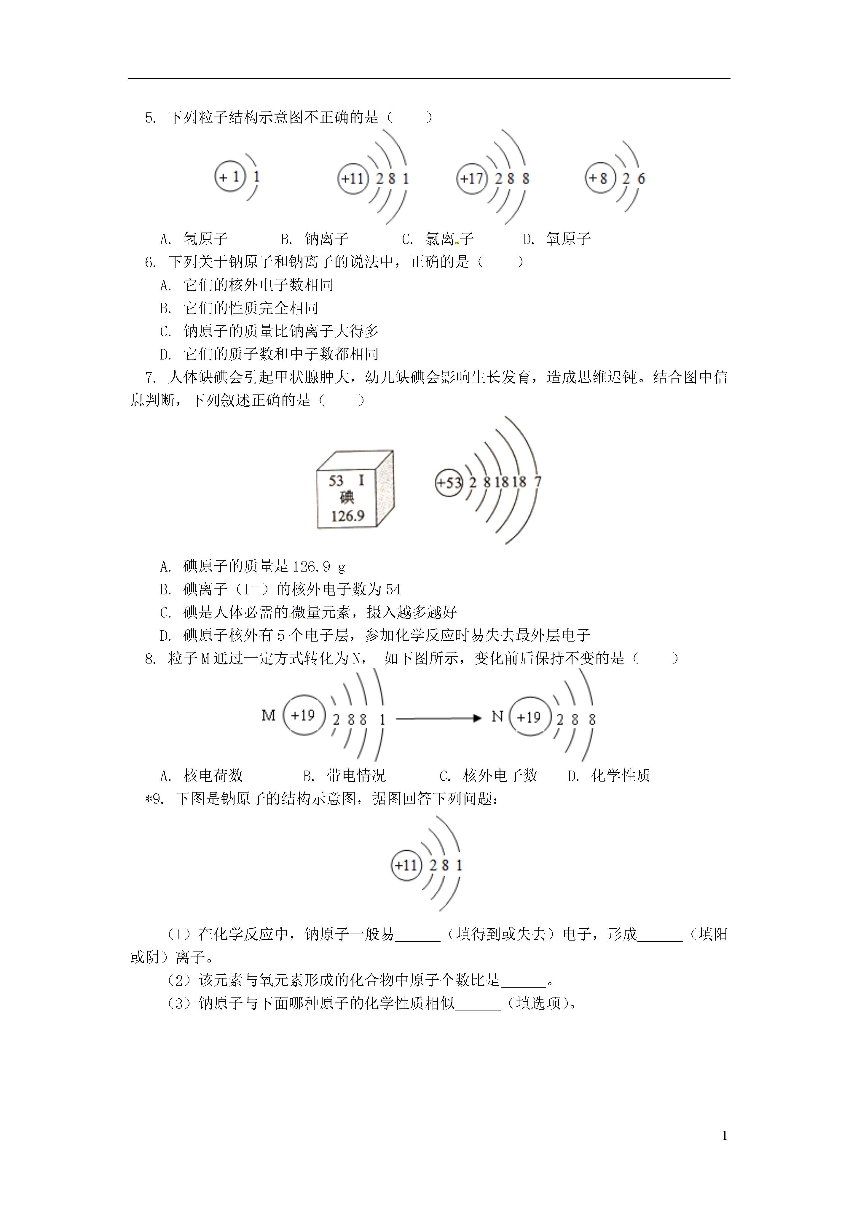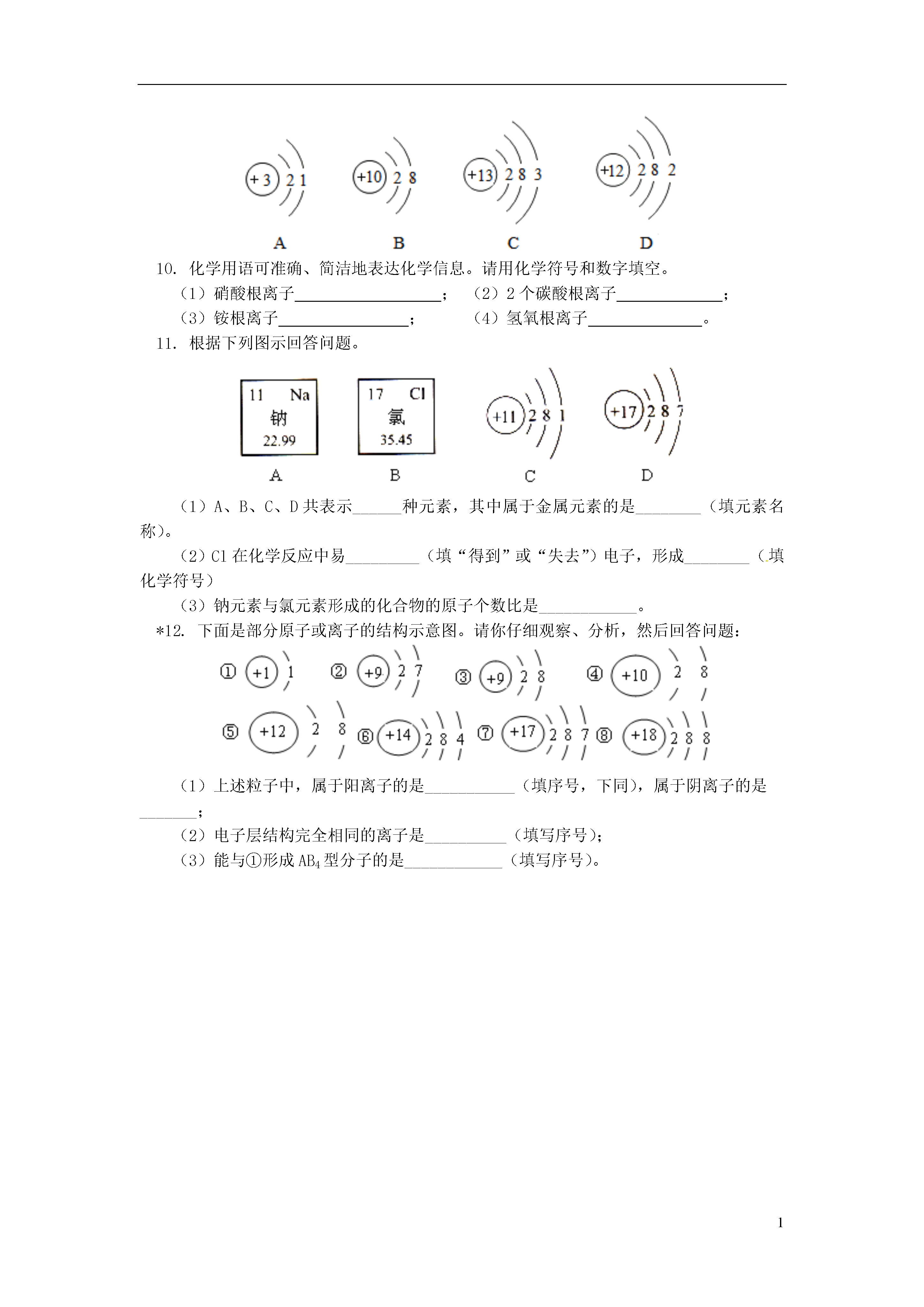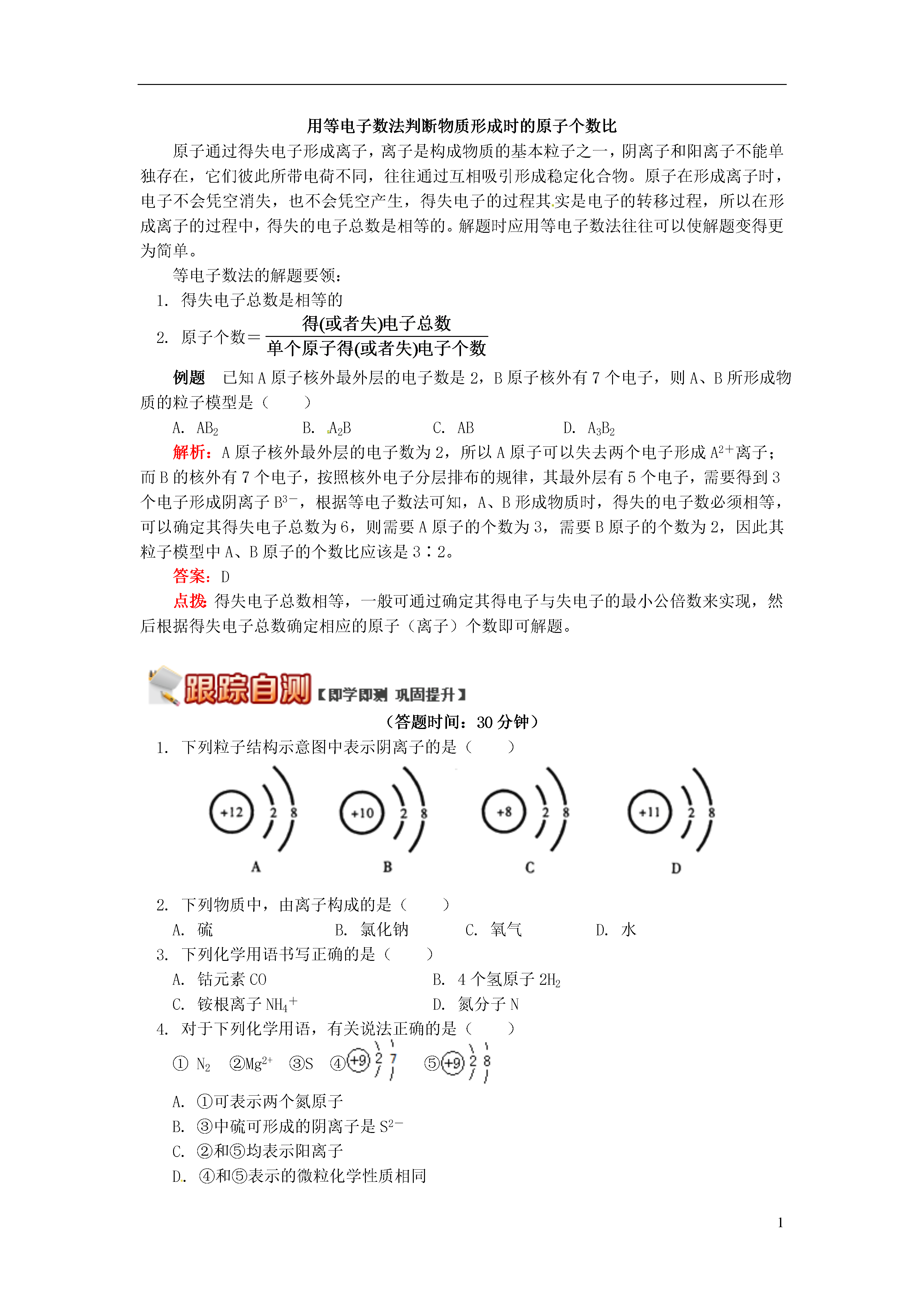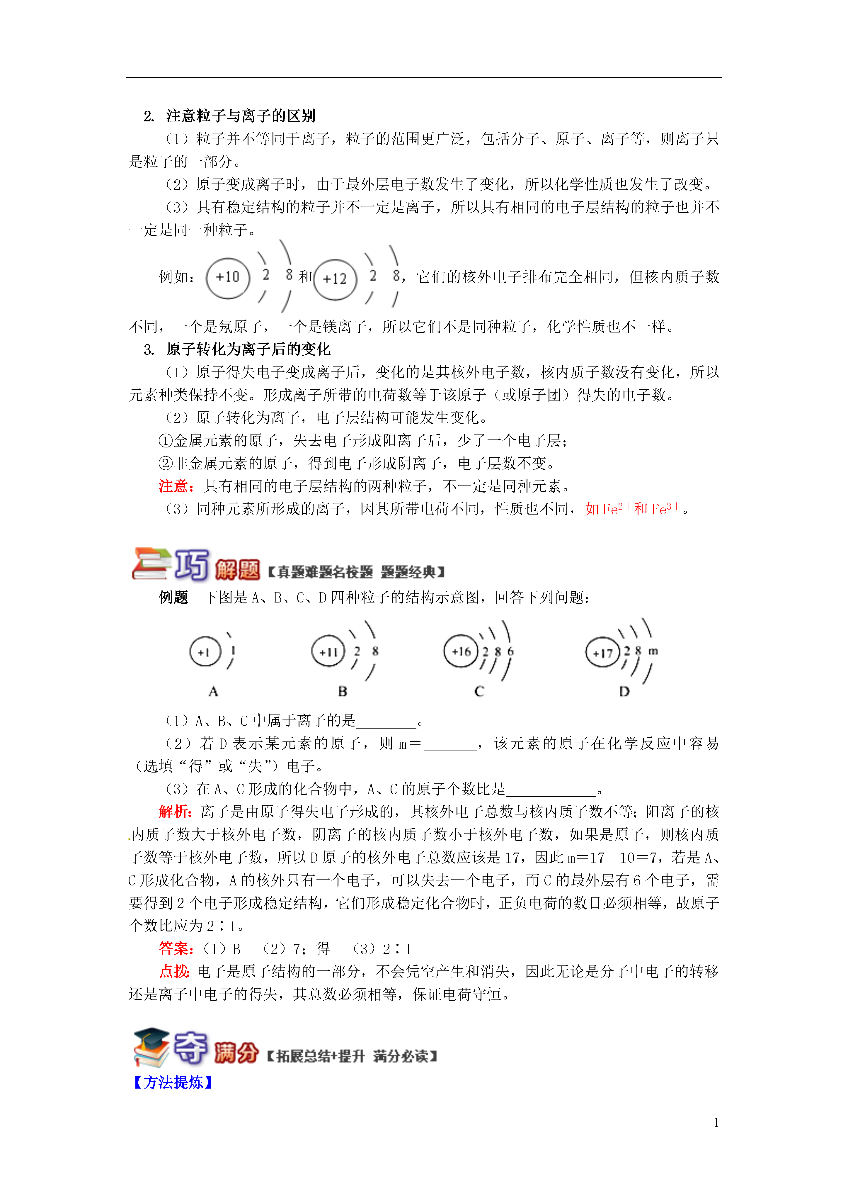 1巧学离子的形成与符号书写一、离子1.定义带电的原子或原子团叫做离子。2.形成元素的原子在发生化学反应时都有一个趋势:通过得失电子使自己的最外层达到相对稳定的结构。具体过程如下图所示:3.分类带正电荷的离子叫做阳离子,一般由原子失电子形成;带负电荷的离子叫做阴离子,一般由原子得电子形成。4.符号书写离子符号的主体是元素符号,在元素符号的右上角标上数字和正负号,用来表明离子所带电荷的数量和正负。书写的基本规则是数字在前,符号在后。例如:Mg2+。注意:当离子所带电荷为1时,1可以省略不写,直接用正负号表示离子带一个单位的正电荷或负电荷,如Na+、OH-等。二、离子与其它粒子的区别与联系1.离子与原子的区别与联系原子离子阳离子阴离子区别结构质子数=电子数质子数>电子数质子数<电子数电性不显电性带正电带负电性质一般情况下性质比较活泼,在反应中容易得失电子因电子层结构为相对稳定结构,故一般情况下性质比较稳定相互联系2.注意粒子与离子的区别(1)粒子并不等同于离子,粒子的范围更广泛,包括分子、原子、离子等,则离子只是粒子的一部分。(2)原子变成离子时,由于最外层电子数发生了变化,所以化学性质也发生了改变。(3)具有稳定结构的粒子并不一定是离子,所以具有相同的电子层结构的粒子也并不一定是同一种粒子。例如:和,它们的核外电子排布完全相同,但核内质子数不同,一个是氖原子,一个是镁离子,所以它们不是同种粒子,化学性质也不一样。3.原子转化为离子后的变化(1)原子得失电子变成离子后,变化的是其核外电子数,核内质子数没有变化,所以元素种类保持不变。形成离子所带的电荷数等于该原子(或原子团)得失的电子数。(2)原子转化为离子,电子层结构可能发生变化。①金属元素的原子,失去电子形成阳离子后,少了一个电子层;②非金属元素的原子,得到电子形成阴离子,电子层数不变。注意:具有相同的电子层结构的两种粒子,不一定是同种元素。(3)同种元素所形成的离子,因其所带电荷不同,性质也不同,如Fe2+和Fe3+。例题下图是A、B、C、D四种粒子的结构示意图,回答下列问题:(1)A、B、C中属于离子的是。(2)若D表示某元素的原子,则m=,该元素的原子在化学反应中容易(选填“得”或“失”)电子。(3)在A、C形成的化合物中,A、C的原子个数比是。解析:离子是由原子得失电子形成的,其核外电子总数与核内质子数不等;阳离子的核内质子数大于核外电子数,阴离子的核内质子数小于核外电子数,如果是原子,则核内质子数等于核外电子数,所以D原子的核外电子总数应该是17,因此m=17-10=7,若是A、C形成化合物,A的核外只有一个电子,可以失去一个电子,而C的最外层有6个电子,需要得到2个电子形成稳定结构,它们形成稳定化合物时,正负电荷的数目必须相等,故原子个数比应为2∶1。答案:(1)B(2)7;得(3)2∶1点拨:电子是原子结构的一部分,不会凭空产生和消失,因此无论是分子中电子的转移还是离子中电子的得失,其总数必须相等,保证电荷守恒。【方法提炼】用等电子数法判断物质形成时的原子个数比原子通过得失电子形成离子,离子是构成物质的基本粒子之一,阴离子和阳离子不能单独存在,它们彼此所带电荷不同,往往通过互相吸引形成稳定化合物。原子在形成离子时,电子不会凭空消失,也不会凭空产生,得失电子的过程其实是电子的转移过程,所以在形成离子的过程中,得失的电子总数是相等的。解题时应用等电子数法往往可以使解题变得更为简单。等电子数法的解题要领:1.得失电子总数是相等的2.原子个数=例题已知A原子核外最外层的电子数是2,B原子核外有7个电子,则A、B所形成物质的粒子模型是()A.AB2B.A2BC.ABD.A3B2解析:A原子核外最外层的电子数为2,所以A原子可以失去两个电子形成A2+离子;而B的核外有7个电子,按照核外电子分层排布的规律,其最外层有5个电子,需要得到3个电子形成阴离子B3-,根据等电子数法可知,A、B形成物质时,得失的电子数必须相等,可以确定其得失电子总数为6,则需要A原子的个数为3,需要B原子的个数为2,因此其粒子模型中A、B原子的个数比应该是3∶2。答案:D点拨:得失电子总数相等,一般可通过确定其得电子与失电子的最小公倍数来实现,然后根据得失电子总数确定相应的原子(离子)个数即可解题。(答题时间:30分钟)1.下列粒子结构示意图中表示阴离子的是()2.下列物质中,由离子构成的是()A.硫B.氯化钠C.氧气D.水3.下列化学用语书写正确的是()A.钴元素COB.4个氢原子2H2C.铵根离子NH4+D.氮分子N4.对于下列化学用语,有关说法正确的是()①