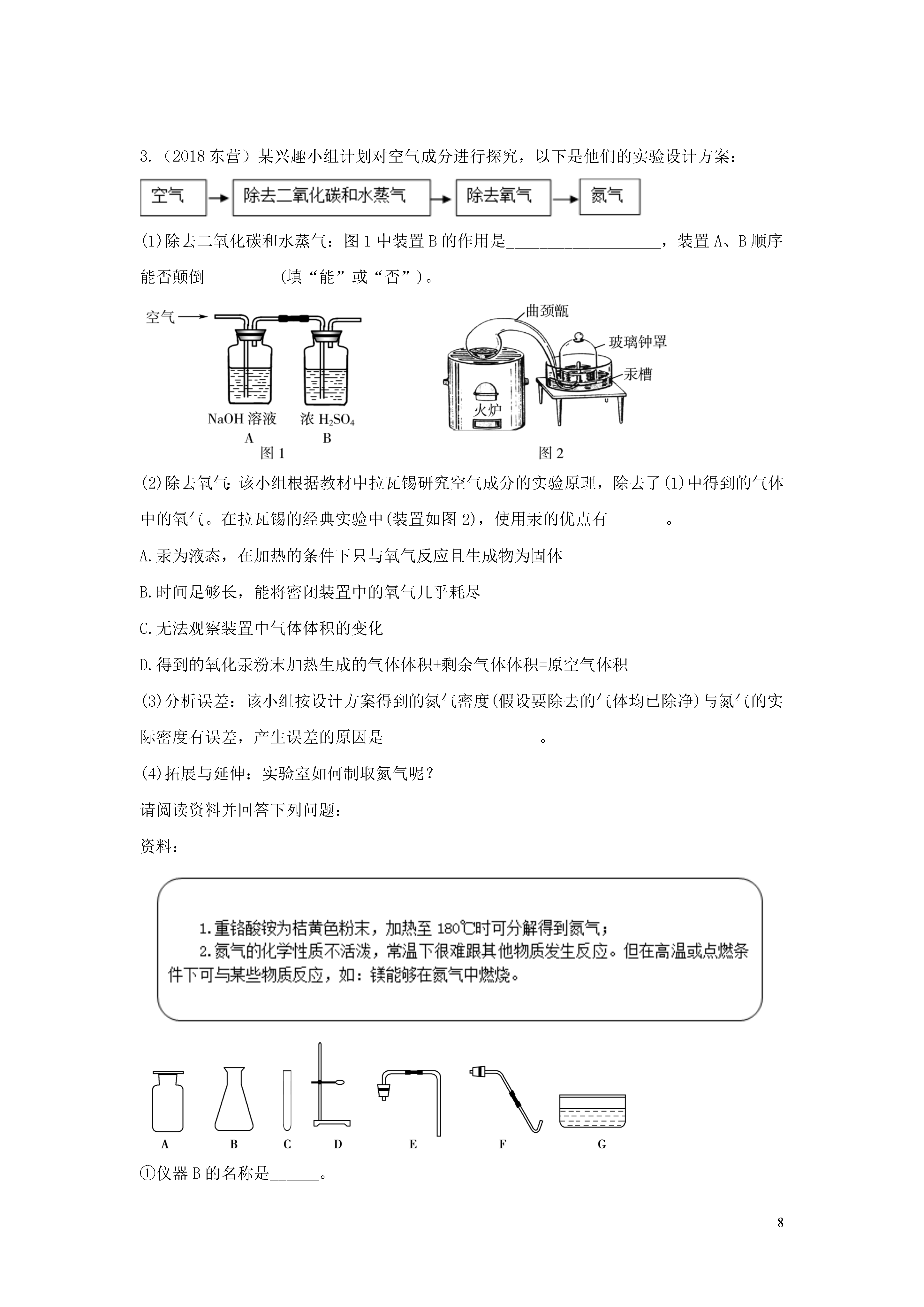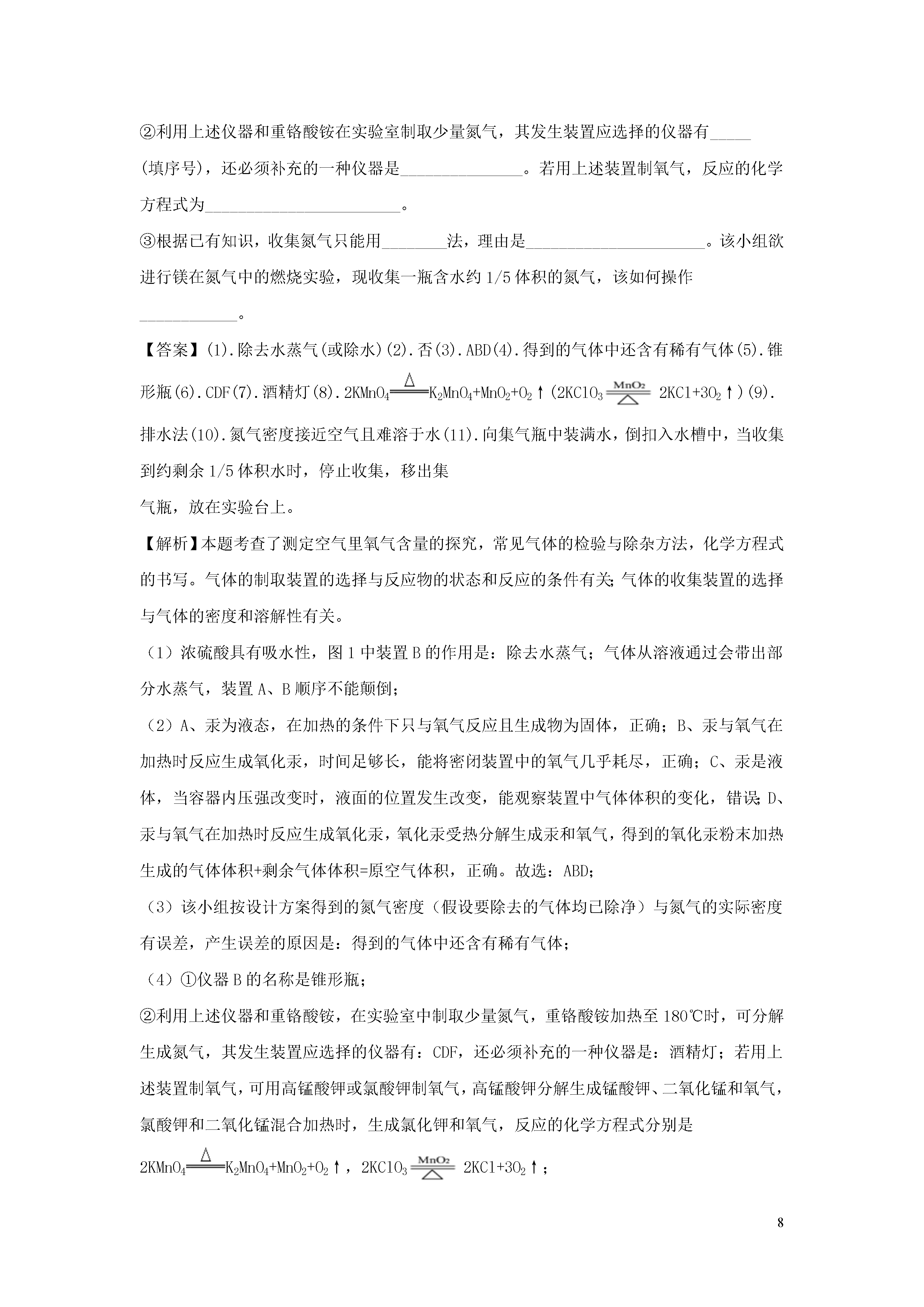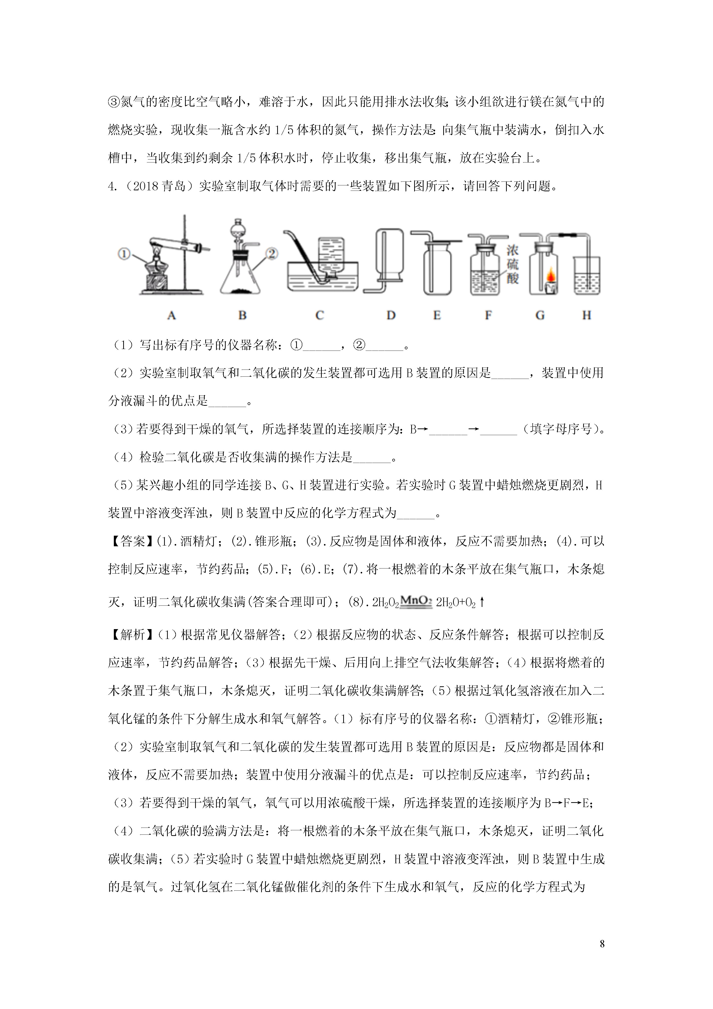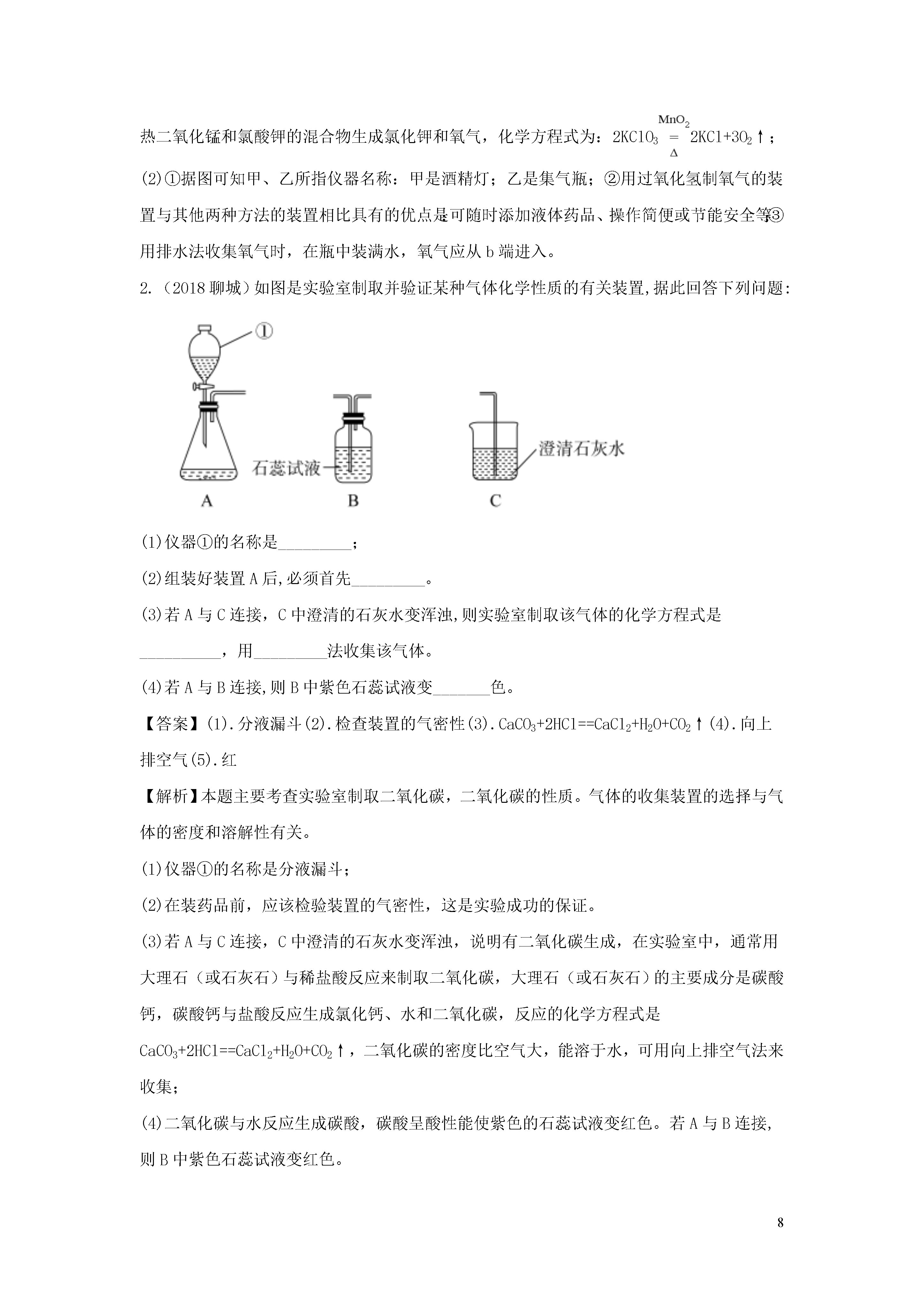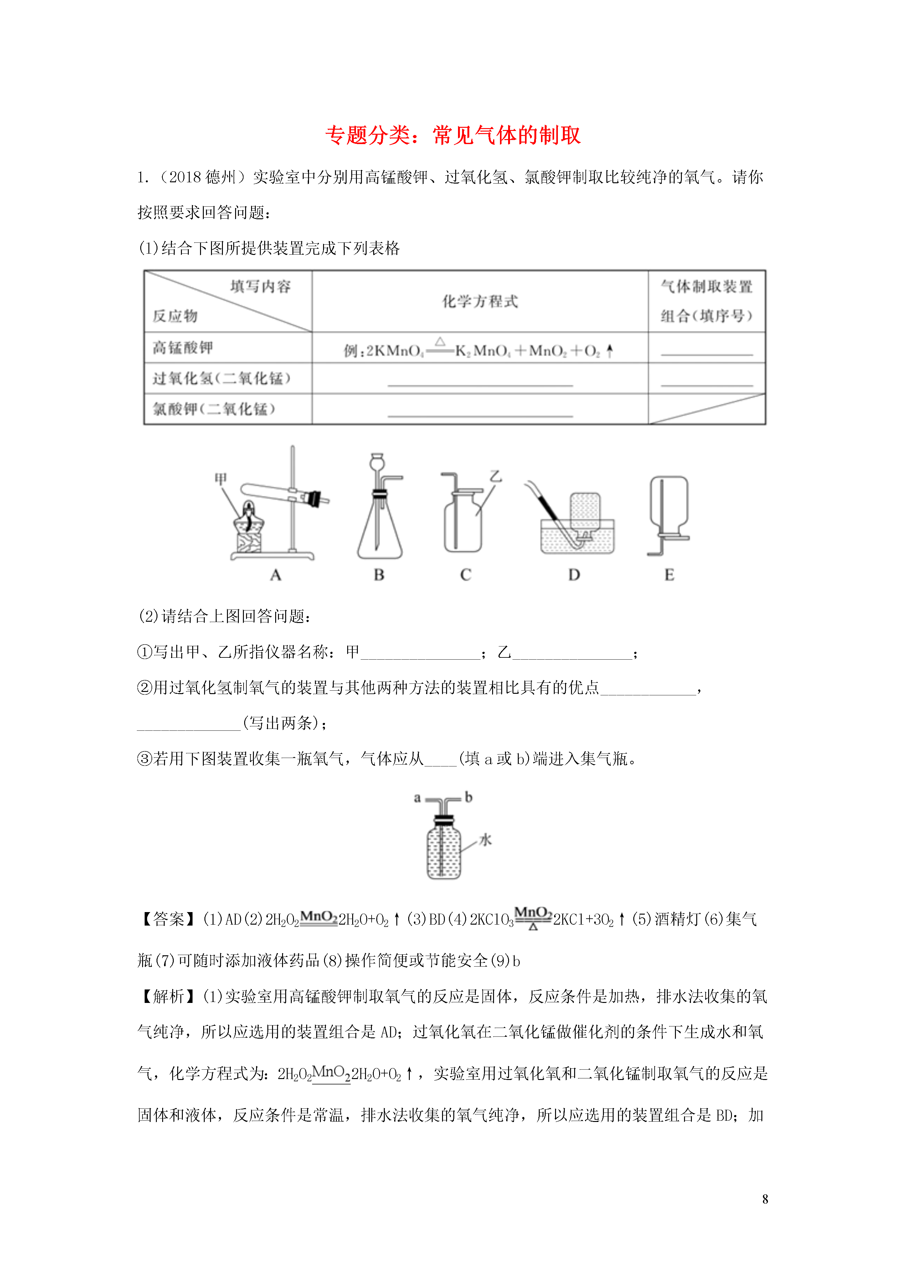 8专题分类:常见气体的制取1.(2018德州)实验室中分别用高锰酸钾、过氧化氢、氯酸钾制取比较纯净的氧气。请你按照要求回答问题:(l)结合下图所提供装置完成下列表格(2)请结合上图回答问题:①写出甲、乙所指仪器名称:甲_______________;乙_______________;②用过氧化氢制氧气的装置与其他两种方法的装置相比具有的优点____________,_____________(写出两条);③若用下图装置收集一瓶氧气,气体应从____(填a或b)端进入集气瓶。【答案】(1)AD(2)2H2O22H2O+O2↑(3)BD(4)2KClO32KCl+3O2↑(5)酒精灯(6)集气瓶(7)可随时添加液体药品(8)操作简便或节能安全(9)b【解析】(1)实验室用高锰酸钾制取氧气的反应是固体,反应条件是加热,排水法收集的氧气纯净,所以应选用的装置组合是AD;过氧化氧在二氧化锰做催化剂的条件下生成水和氧气,化学方程式为:2H2O22H2O+O2↑,实验室用过氧化氧和二氧化锰制取氧气的反应是固体和液体,反应条件是常温,排水法收集的氧气纯净,所以应选用的装置组合是BD;加热二氧化锰和氯酸钾的混合物生成氯化钾和氧气,化学方程式为:2KClO32KCl+3O2↑;(2)①据图可知甲、乙所指仪器名称:甲是酒精灯;乙是集气瓶;②用过氧化氢制氧气的装置与其他两种方法的装置相比具有的优点是:可随时添加液体药品、操作简便或节能安全等;③用排水法收集氧气时,在瓶中装满水,氧气应从b端进入。2.(2018聊城)如图是实验室制取并验证某种气体化学性质的有关装置,据此回答下列问题:(1)仪器①的名称是_________;(2)组装好装置A后,必须首先_________。(3)若A与C连接,C中澄清的石灰水变浑浊,则实验室制取该气体的化学方程式是__________,用_________法收集该气体。(4)若A与B连接,则B中紫色石蕊试液变_______色。【答案】(1).分液漏斗(2).检查装置的气密性(3).CaCO3+2HCl==CaCl2+H2O+CO2↑(4).向上排空气(5).红【解析】本题主要考查实验室制取二氧化碳,二氧化碳的性质。气体的收集装置的选择与气体的密度和溶解性有关。(1)仪器①的名称是分液漏斗;(2)在装药品前,应该检验装置的气密性,这是实验成功的保证。(3)若A与C连接,C中澄清的石灰水变浑浊,说明有二氧化碳生成,在实验室中,通常用大理石(或石灰石)与稀盐酸反应来制取二氧化碳,大理石(或石灰石)的主要成分是碳酸钙,碳酸钙与盐酸反应生成氯化钙、水和二氧化碳,反应的化学方程式是CaCO3+2HCl==CaCl2+H2O+CO2↑,二氧化碳的密度比空气大,能溶于水,可用向上排空气法来收集;(4)二氧化碳与水反应生成碳酸,碳酸呈酸性能使紫色的石蕊试液变红色。若A与B连接,则B中紫色石蕊试液变红色。3.(2018东营)某兴趣小组计划对空气成分进行探究,以下是他们的实验设计方案:(1)除去二氧化碳和水蒸气:图1中装置B的作用是___________________,装置A、B顺序能否颠倒_________(填“能”或“否”)。(2)除去氧气:该小组根据教材中拉瓦锡研究空气成分的实验原理,除去了(1)中得到的气体中的氧气。在拉瓦锡的经典实验中(装置如图2),使用汞的优点有_______。A.汞为液态,在加热的条件下只与氧气反应且生成物为固体B.时间足够长,能将密闭装置中的氧气几乎耗尽C.无法观察装置中气体体积的变化D.得到的氧化汞粉末加热生成的气体体积+剩余气体体积=原空气体积(3)分析误差:该小组按设计方案得到的氮气密度(假设要除去的气体均已除净)与氮气的实际密度有误差,产生误差的原因是___________________。(4)拓展与延伸:实验室如何制取氮气呢?请阅读资料并回答下列问题:资料:①仪器B的名称是______。②利用上述仪器和重铬酸铵在实验室制取少量氮气,其发生装置应选择的仪器有_____(填序号),还必须补充的一种仪器是_______________。若用上述装置制氧气,反应的化学方程式为________________________。③根据已有知识,收集氮气只能用________法,理由是______________________。该小组欲进行镁在氮气中的燃烧实验,现收集一瓶含水约1/5体积的氮气,该如何操作____________。【答案】(1).除去水蒸气(或除水)(2).否(3).ABD(4).得到的气体中还含有稀有气体(5).锥形瓶(6).CDF(7).酒精灯(8).2KMnO4K2MnO4+MnO2+O