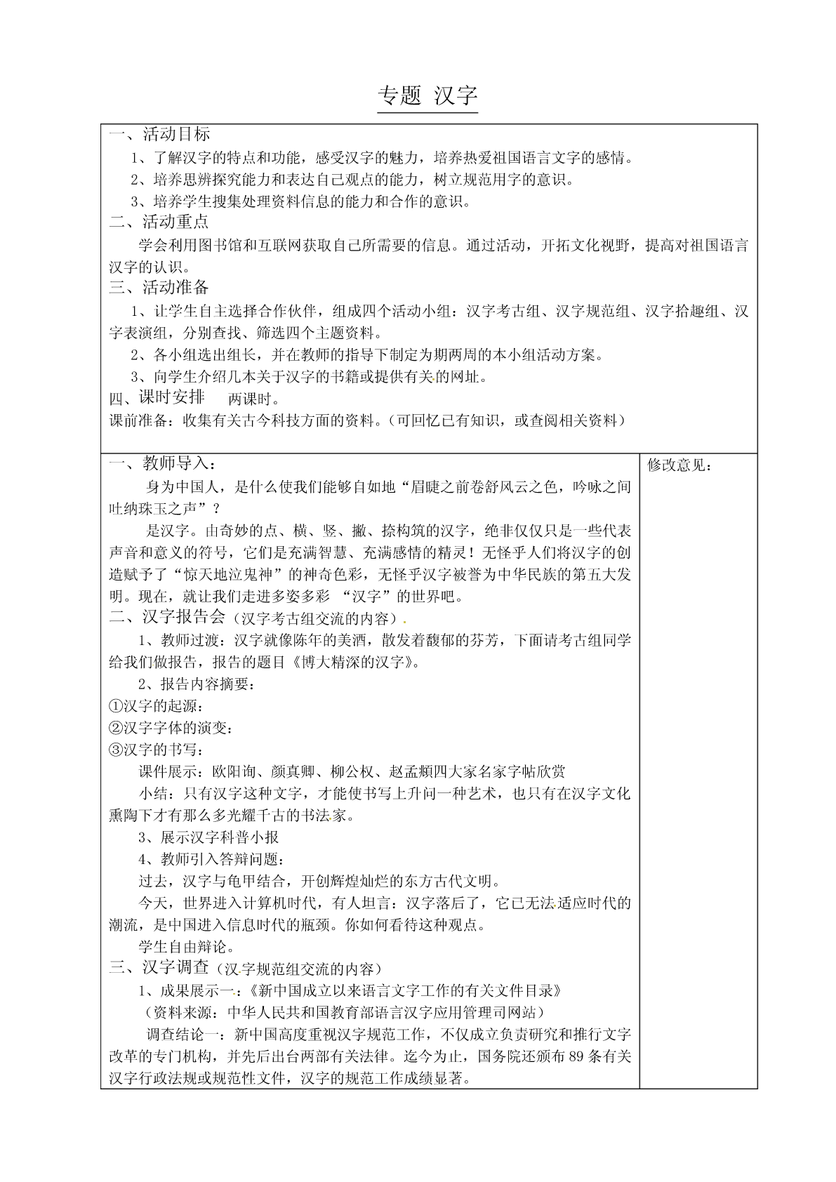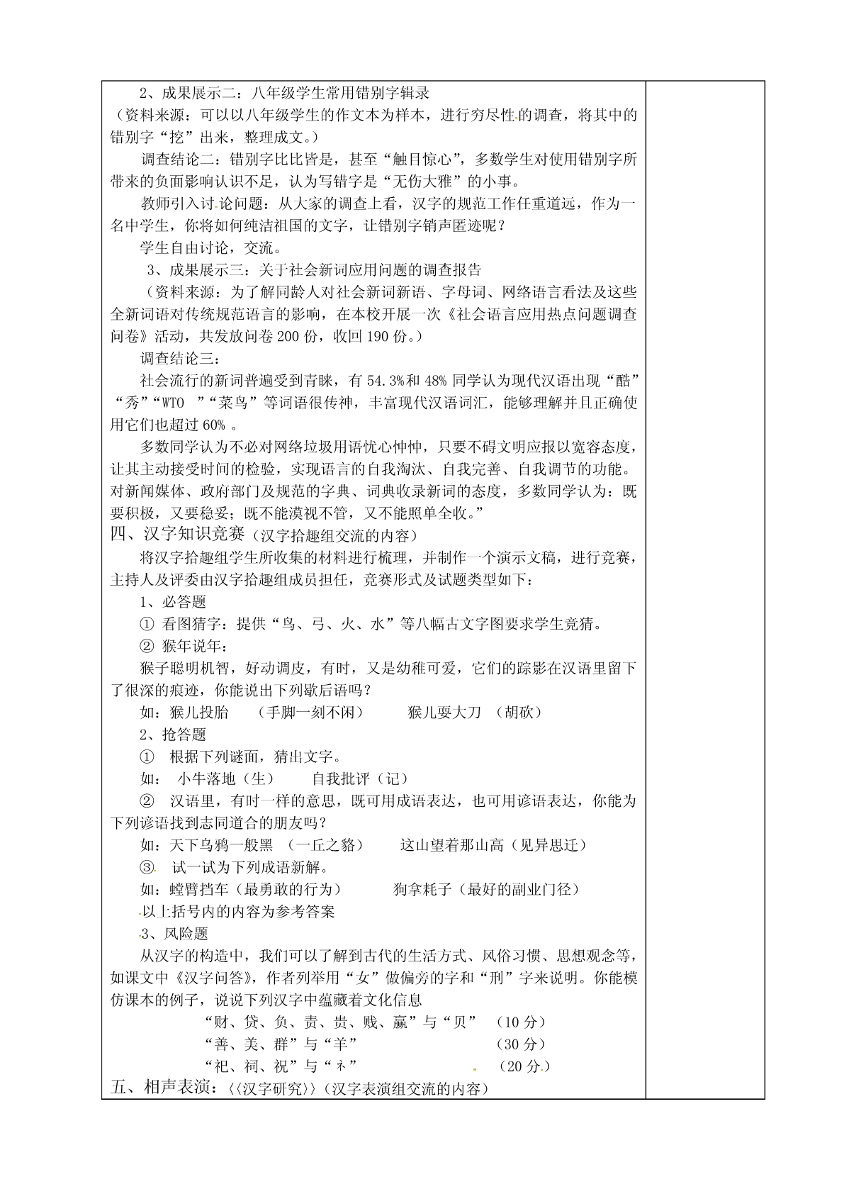 专题汉字一、活动目标1、了解汉字的特点和功能,感受汉字的魅力,培养热爱祖国语言文字的感情。2、培养思辨探究能力和表达自己观点的能力,树立规范用字的意识。3、培养学生搜集处理资料信息的能力和合作的意识。二、活动重点学会利用图书馆和互联网获取自己所需要的信息。通过活动,开拓文化视野,提高对祖国语言汉字的认识。三、活动准备1、让学生自主选择合作伙伴,组成四个活动小组:汉字考古组、汉字规范组、汉字拾趣组、汉字表演组,分别查找、筛选四个主题资料。2、各小组选出组长,并在教师的指导下制定为期两周的本小组活动方案。3、向学生介绍几本关于汉字的书籍或提供有关的网址。四、课时安排两课时。课前准备:收集有关古今科技方面的资料。(可回忆已有知识,或查阅相关资料)一、教师导入:修改意见:身为中国人,是什么使我们能够自如地“眉睫之前卷舒风云之色,吟咏之间吐纳珠玉之声”?是汉字。由奇妙的点、横、竖、撇、捺构筑的汉字,绝非仅仅只是一些代表声音和意义的符号,它们是充满智慧、充满感情的精灵!无怪乎人们将汉字的创造赋予了“惊天地泣鬼神”的神奇色彩,无怪乎汉字被誉为中华民族的第五大发明。现在,就让我们走进多姿多彩“汉字”的世界吧。二、汉字报告会(汉字考古组交流的内容)1、教师过渡:汉字就像陈年的美酒,散发着馥郁的芬芳,下面请考古组同学给我们做报告,报告的题目《博大精深的汉字》。2、报告内容摘要:①汉字的起源:②汉字字体的演变:③汉字的书写:课件展示:欧阳询、颜真卿、柳公权、赵孟頫四大家名家字帖欣赏小结:只有汉字这种文字,才能使书写上升问一种艺术,也只有在汉字文化熏陶下才有那么多光耀千古的书法家。3、展示汉字科普小报4、教师引入答辩问题:过去,汉字与龟甲结合,开创辉煌灿烂的东方古代文明。今天,世界进入计算机时代,有人坦言:汉字落后了,它已无法适应时代的潮流,是中国进入信息时代的瓶颈。你如何看待这种观点。学生自由辩论。三、汉字调查(汉字规范组交流的内容)1、成果展示一:《新中国成立以来语言文字工作的有关文件目录》(资料来源:中华人民共和国教育部语言汉字应用管理司网站)调查结论一:新中国高度重视汉字规范工作,不仅成立负责研究和推行文字改革的专门机构,并先后出台两部有关法律。迄今为止,国务院还颁布89条有关汉字行政法规或规范性文件,汉字的规范工作成绩显著。2、成果展示二:八年级学生常用错别字辑录(资料来源:可以以八年级学生的作文本为样本,进行穷尽性的调查,将其中的错别字“挖”出来,整理成文。)调查结论二:错别字比比皆是,甚至“触目惊心”,多数学生对使用错别字所带来的负面影响认识不足,认为写错字是“无伤大雅”的小事。教师引入讨论问题:从大家的调查上看,汉字的规范工作任重道远,作为一名中学生,你将如何纯洁祖国的文字,让错别字销声匿迹呢?学生自由讨论,交流。3、成果展示三:关于社会新词应用问题的调查报告(资料来源:为了解同龄人对社会新词新语、字母词、网络语言看法及这些全新词语对传统规范语言的影响,在本校开展一次《社会语言应用热点问题调查问卷》活动,共发放问卷200份,收回190份。)调查结论三:社会流行的新词普遍受到青睐,有54.3%和48%同学认为现代汉语出现“酷”“秀”“WTO”“菜鸟”等词语很传神,丰富现代汉语词汇,能够理解并且正确使用它们也超过60%。多数同学认为不必对网络垃圾用语忧心忡忡,只要不碍文明应报以宽容态度,让其主动接受时间的检验,实现语言的自我淘汰、自我完善、自我调节的功能。对新闻媒体、政府部门及规范的字典、词典收录新词的态度,多数同学认为:既要积极,又要稳妥;既不能漠视不管,又不能照单全收。”四、汉字知识竞赛(汉字拾趣组交流的内容)将汉字拾趣组学生所收集的材料进行梳理,并制作一个演示文稿,进行竞赛,主持人及评委由汉字拾趣组成员担任,竞赛形式及试题类型如下:1、必答题①看图猜字:提供“鸟、弓、火、水”等八幅古文字图要求学生竞猜。②猴年说年:猴子聪明机智,好动调皮,有时,又是幼稚可爱,它们的踪影在汉语里留下了很深的痕迹,你能说出下列歇后语吗?如:猴儿投胎(手脚一刻不闲)猴儿耍大刀(胡砍)2、抢答题①根据下列谜面,猜出文字。如:小牛落地(生)自我批评(记)②汉语里,有时一样的意思,既可用成语表达,也可用谚语表达,你能为下列谚语找到志同道合的朋友吗?如:天下乌鸦一般黑(一丘之貉)这山望着那山高(见异思迁)③试一试为下列成语新解。如:螳臂挡车(最勇敢的行为)狗拿耗子(最好的副业门径)以上括号内的内容为参考答案3、风险题从汉字的构造中,我们可以了解到古代的生活方式、风俗习惯、思想观念等,如课文中《汉字问答》,作者列举用“女”做偏旁的字和“刑”字来说明。你能模仿课本的例子,说说下列汉字中蕴藏着文化信息“财、贷、负、责、贵、贱、赢”与“贝”(10分)“善、美、群”与“羊”