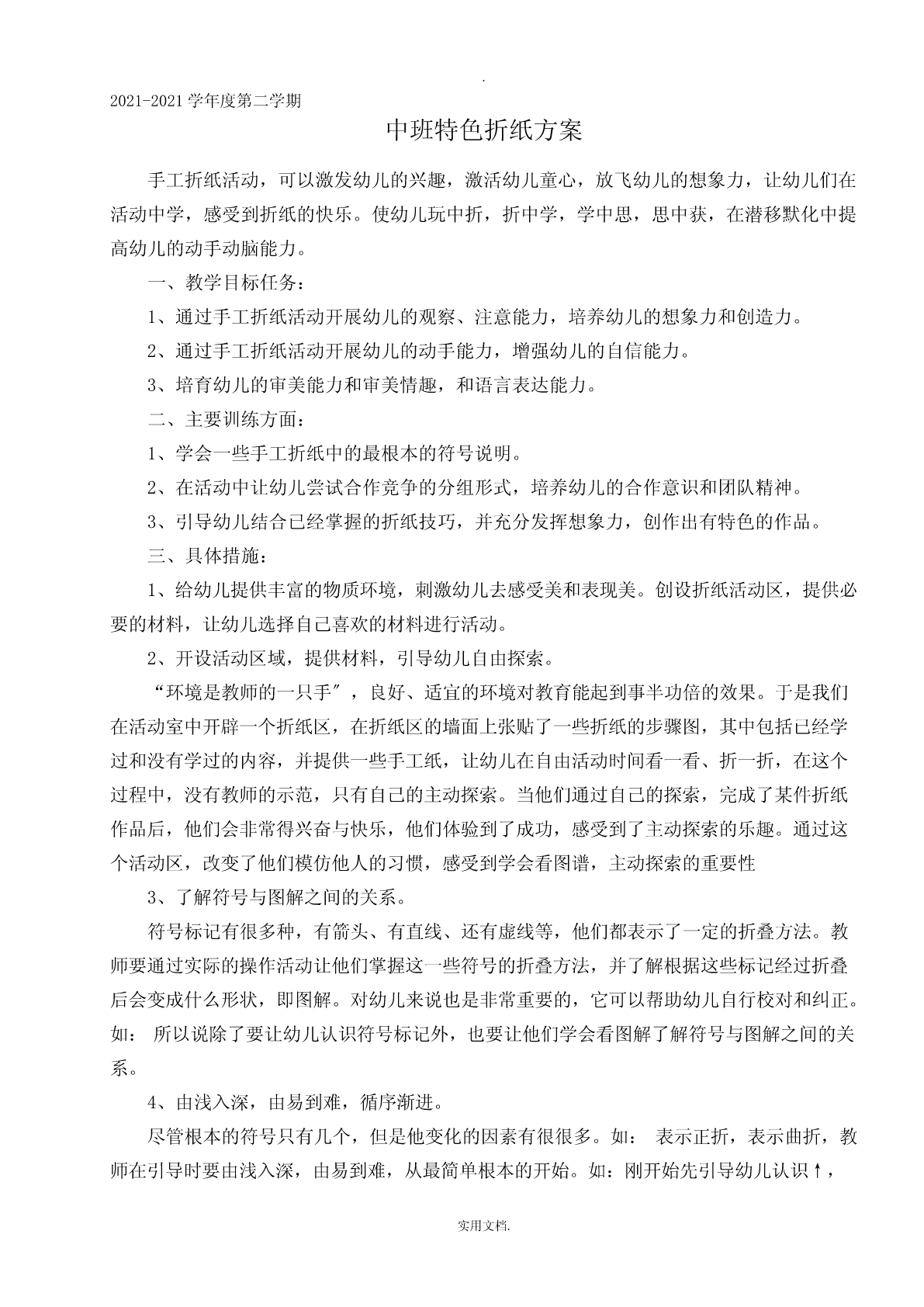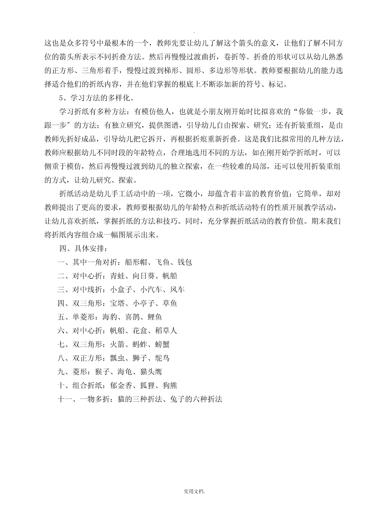 .2021-2021学年度第二学期中班特色折纸方案手工折纸活动,可以激发幼儿的兴趣,激活幼儿童心,放飞幼儿的想象力,让幼儿们在活动中学,感受到折纸的快乐。使幼儿玩中折,折中学,学中思,思中获,在潜移默化中提高幼儿的动手动脑能力。一、教学目标任务:1、通过手工折纸活动开展幼儿的观察、注意能力,培养幼儿的想象力和创造力。2、通过手工折纸活动开展幼儿的动手能力,增强幼儿的自信能力。3、培育幼儿的审美能力和审美情趣,和语言表达能力。二、主要训练方面:1、学会一些手工折纸中的最根本的符号说明。2、在活动中让幼儿尝试合作竞争的分组形式,培养幼儿的合作意识和团队精神。3、引导幼儿结合已经掌握的折纸技巧,并充分发挥想象力,创作出有特色的作品。三、具体措施:1、给幼儿提供丰富的物质环境,刺激幼儿去感受美和表现美。创设折纸活动区,提供必要的材料,让幼儿选择自己喜欢的材料进行活动。2、开设活动区域,提供材料,引导幼儿自由探索。“环境是教师的一只手〞,良好、适宜的环境对教育能起到事半功倍的效果。于是我们在活动室中开辟一个折纸区,在折纸区的墙面上张贴了一些折纸的步骤图,其中包括已经学过和没有学过的内容,并提供一些手工纸,让幼儿在自由活动时间看一看、折一折,在这个过程中,没有教师的示范,只有自己的主动探索。当他们通过自己的探索,完成了某件折纸作品后,他们会非常得兴奋与快乐,他们体验到了成功,感受到了主动探索的乐趣。通过这个活动区,改变了他们模仿他人的习惯,感受到学会看图谱,主动探索的重要性3、了解符号与图解之间的关系。符号标记有很多种,有箭头、有直线、还有虚线等,他们都表示了一定的折叠方法。教师要通过实际的操作活动让他们掌握这一些符号的折叠方法,并了解根据这些标记经过折叠后会变成什么形状,即图解。对幼儿来说也是非常重要的,它可以帮助幼儿自行校对和纠正。如:所以说除了要让幼儿认识符号标记外,也要让他们学会看图解了解符号与图解之间的关系。4、由浅入深,由易到难,循序渐进。尽管根本的符号只有几个,但是他变化的因素有很很多。如:表示正折,表示曲折,教师在引导时要由浅入深,由易到难,从最简单根本的开始。如:刚开始先引导幼儿认识↑,实用文档..这也是众多符号中最根本的一个,教师先要让幼儿了解这个箭头的意义,让他们了解不同方位的箭头所表示不同折叠方法。然后再慢慢过渡曲折,卷折等。折叠的形状可以从幼儿熟悉的正方形、三角形着手,慢慢过渡到梯形、圆形、多边形等形状。教师要根据幼儿的能力选择适合他们的折纸内容,并在他们掌握的根底上不断添加新的符号、标记。5、学习方法的多样化。学习折纸有多种方法:有模仿他人,也就是小朋友刚开始时比拟喜欢的“你做一步,我跟一步〞的方法;有独立研究,提供图谱,引导幼儿自由探索、研究;还有折装重组,是由教师先折好成品,引导幼儿把它拆开,再根据折痕重新折叠。这是我们比拟常用的几种方法,教师应根据幼儿不同时段的年龄特点,合理地选用不同的方法,如在刚开始学折纸时,可以侧重于模仿,然后再慢慢过渡到幼儿的独立探索,在一些较难的局部,还可以使用折装重组的方式,让幼儿研究、探索。折纸活动是幼儿手工活动中的一项,它微小,却蕴含着丰富的教育价值;它简单,却对教师提出了更高的要求,教师要根据幼儿的年龄特点和折纸活动特有的性质开展教学活动,让幼儿喜欢折纸,掌握折纸的方法和技巧。同时,充分掌握折纸活动的教育价值。期末我们将折纸内容组合成一幅图展示出来。四、具体安排:一、其中一角对折:船形帽、飞鱼、钱包二、对中心折:青蛙、向日葵、帆船三、对中线折:小盒子、小汽车、风车四、双三角形:宝塔、小亭子、草鱼五、单菱形:海豹、喜鹊、鲤鱼六、对中心折:帆船、花盒、稻草人七、双三角形:火箭、蚂蚱、螃蟹八、双正方形:瓢虫、狮子、鸵鸟九、菱形:猴子、海龟、猫头鹰十、组合折纸:郁金香、狐狸、狗熊十一、一物多折:猫的三种折法、兔子的六种折法实用文档.