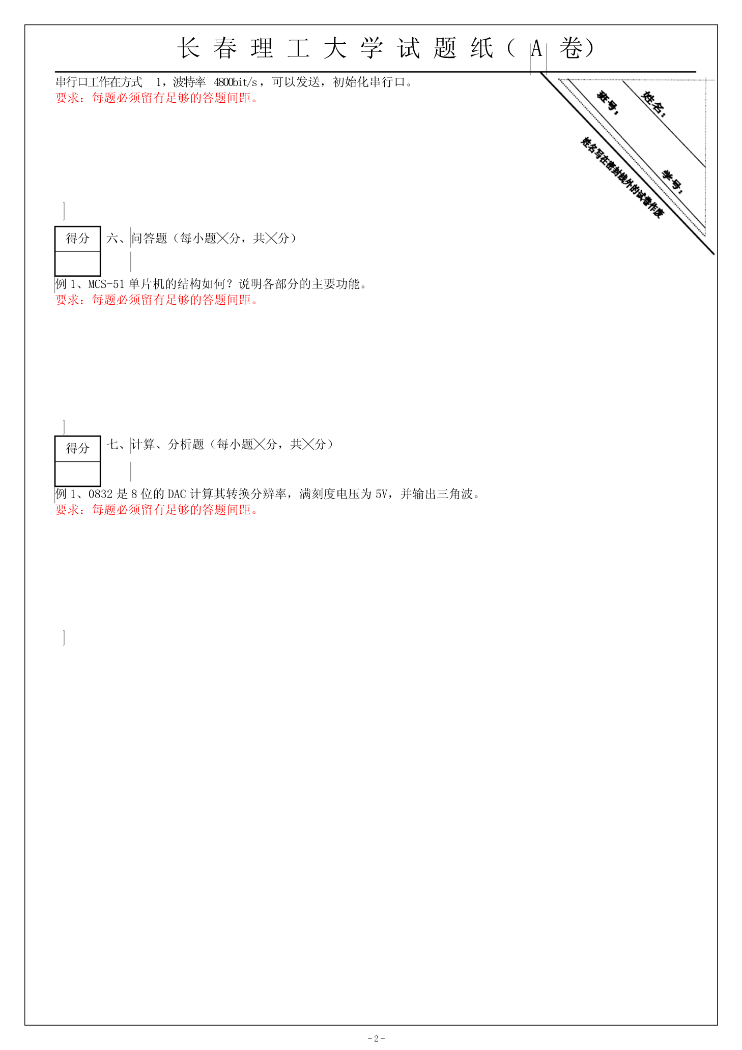 长春理工大学试题纸(A卷)编号20---20学年第学期命题教师印数科目参考班级审核人题号一二三四五六七八九十总分合分人得分评阅人复核人得分一、填空题(每小题╳分,共╳分)例:1、MCS-51单片机系列有个中断源。上电复位时,同级中断优先级从高到低为,,,,。中断触发方式有,。、8031单片机,使用P、P口传送信号,且使用P口传送信号,这里采用的是技术。200要求:1、被填空项一律用“”表示,不能用“()”或其他方式表示。2、被填空项“”线长度必须足够长。试题文字小四宋体得分二、名词解释(每小题╳分,共╳分)例1、半导体:要求:每题必须留有足够的答题间距。得分三、单项选择题(选择正确答案的字母填入括号,每小题╳分,共╳分)例1、植物细胞中,为膜性结构且与合成类脂、激素有关的细胞器是()A、光滑型内质网B、液泡C、高尔基体D、线粒体2、禾谷类作物胚乳最外层细胞称糊粉层,其糊粉粒贮藏的养分是()、淀B、蛋白质C、油脂D、糖类要求:1、备选答案的序号必须用正体大写英文字母A、B、C、D表示。括号一般应放在题干的后面。得分四、多项选择题(下面各题所给的备选答案至少有两项是正确,将正确答案字母序号填入括号,多选或漏选均不得分,每小题╳分,共╳分)例1、高尔基体的重要功能有()A、参与分泌作用B、合成细胞壁物质C、调节渗透压D、细胞内消化作用E、形成纺锤丝2、典型的次生分生组织有()A、原表皮B、基本分生组织C、原形成层D、束间形成层E、形成层要求:1、备选答案的序号必须用正体大写英文字母A、B、C、D表示。2、括号一般应放在题干的后面。得分五、比较题(每小题╳分,共╳分)例1、简单编程-1-长春理工大学试题纸(A卷)串行口工作在方式1,波特率4800bit/s,可以发送,初始化串行口。要求:每题必须留有足够的答题间距。得分六、问答题(每小题╳分,共╳分)例1、MCS-51单片机的结构如何?说明各部分的主要功能。要求:每题必须留有足够的答题间距。得分七、计算、分析题(每小题╳分,共╳分)例1、0832是8位的DAC计算其转换分辨率,满刻度电压为5V,并输出三角波。要求:每题必须留有足够的答题间距。-2-