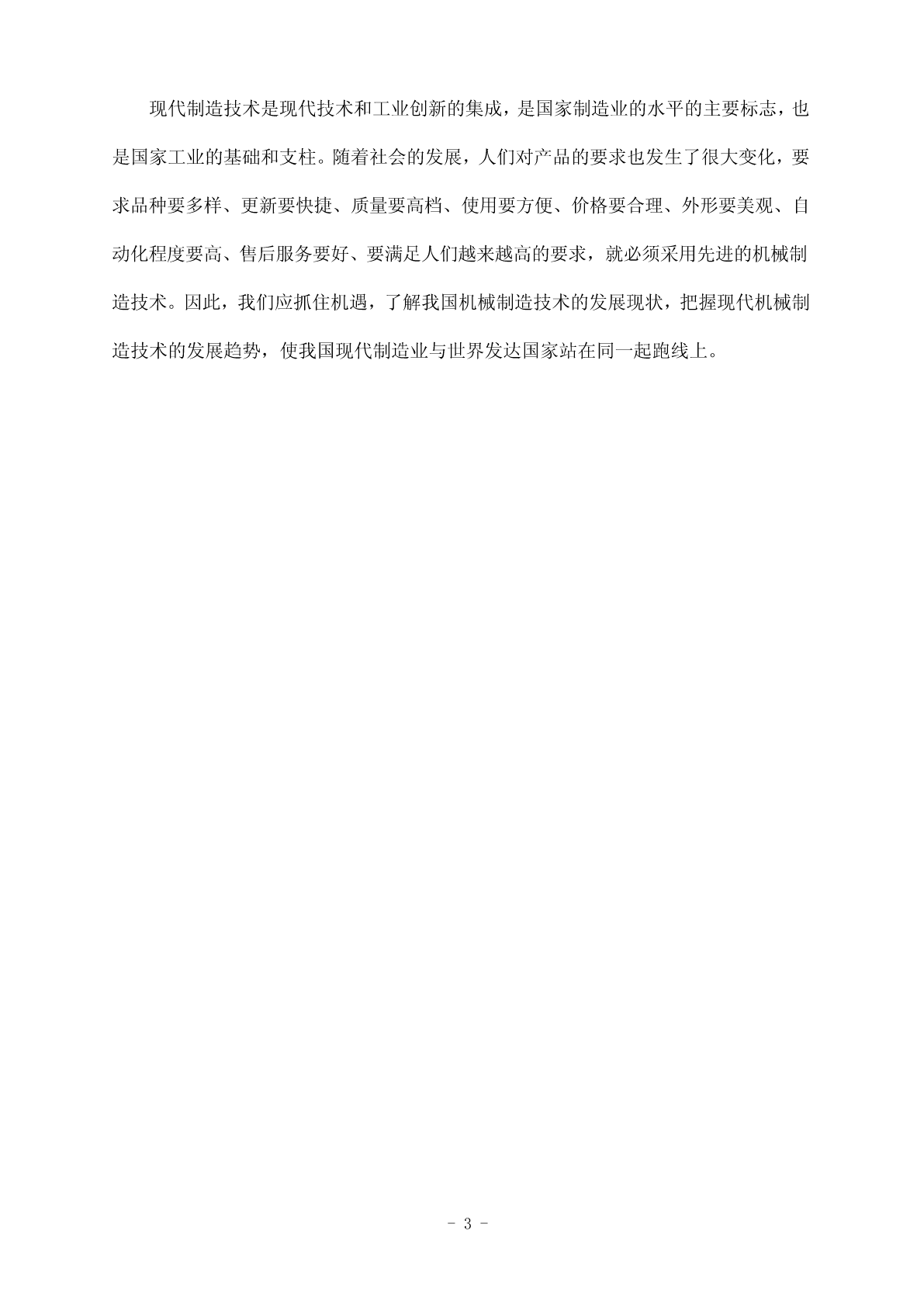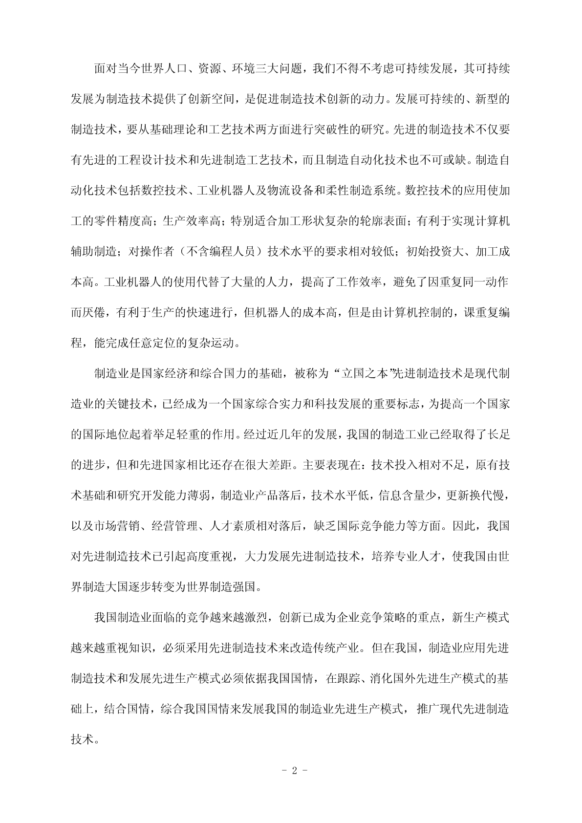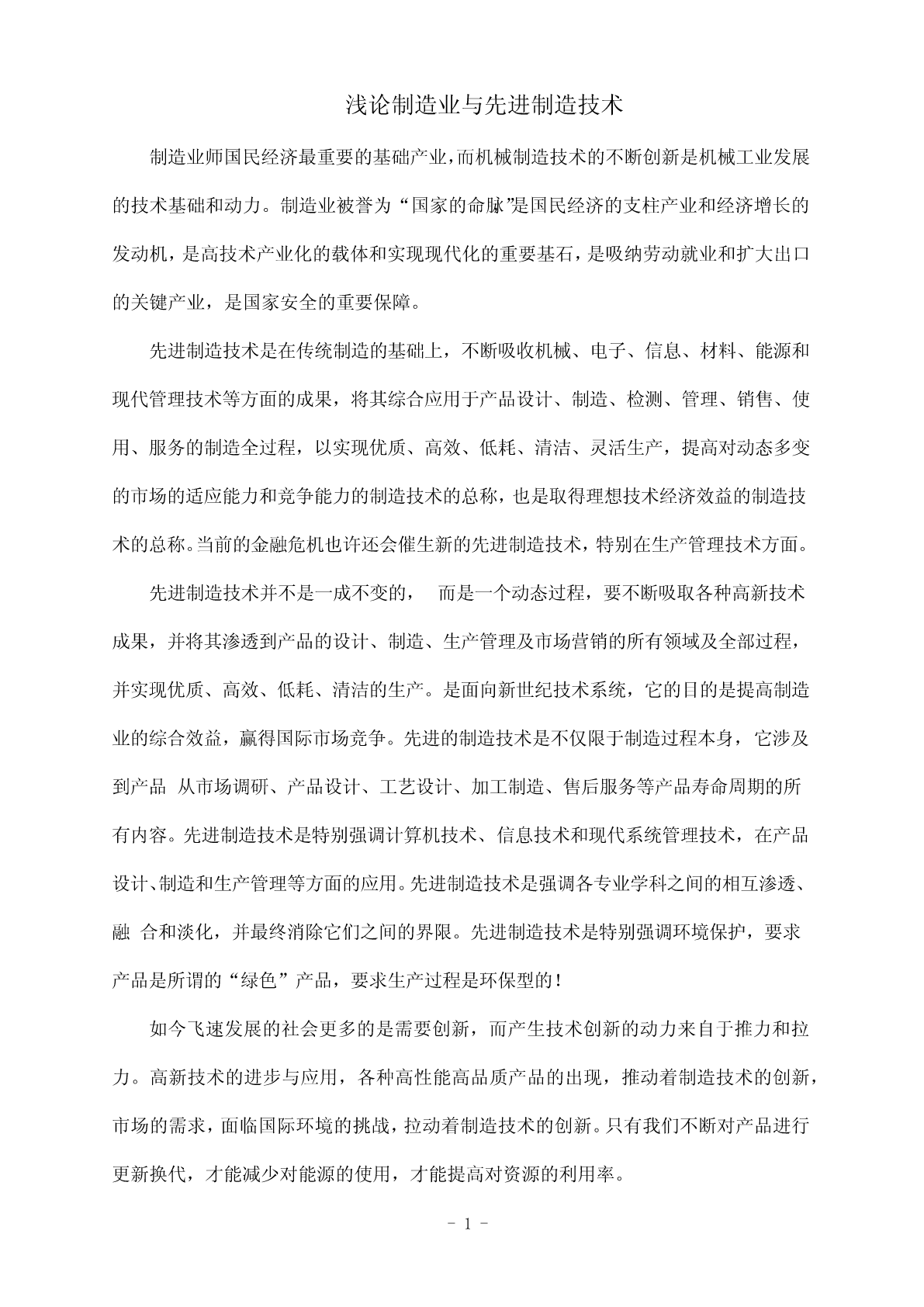 浅论制造业与先进制造技术制造业师国民经济最重要的基础产业,而机械制造技术的不断创新是机械工业发展的技术基础和动力。制造业被誉为“国家的命脉”,是国民经济的支柱产业和经济增长的发动机,是高技术产业化的载体和实现现代化的重要基石,是吸纳劳动就业和扩大出口的关键产业,是国家安全的重要保障。先进制造技术是在传统制造的基础上,不断吸收机械、电子、信息、材料、能源和现代管理技术等方面的成果,将其综合应用于产品设计、制造、检测、管理、销售、使用、服务的制造全过程,以实现优质、高效、低耗、清洁、灵活生产,提高对动态多变的市场的适应能力和竞争能力的制造技术的总称,也是取得理想技术经济效益的制造技术的总称。当前的金融危机也许还会催生新的先进制造技术,特别在生产管理技术方面。先进制造技术并不是一成不变的,而是一个动态过程,要不断吸取各种高新技术成果,并将其渗透到产品的设计、制造、生产管理及市场营销的所有领域及全部过程,并实现优质、高效、低耗、清洁的生产。是面向新世纪技术系统,它的目的是提高制造业的综合效益,赢得国际市场竞争。先进的制造技术是不仅限于制造过程本身,它涉及到产品从市场调研、产品设计、工艺设计、加工制造、售后服务等产品寿命周期的所有内容。先进制造技术是特别强调计算机技术、信息技术和现代系统管理技术,在产品设计、制造和生产管理等方面的应用。先进制造技术是强调各专业学科之间的相互渗透、融合和淡化,并最终消除它们之间的界限。先进制造技术是特别强调环境保护,要求产品是所谓的“绿色”产品,要求生产过程是环保型的!如今飞速发展的社会更多的是需要创新,而产生技术创新的动力来自于推力和拉力。高新技术的进步与应用,各种高性能高品质产品的出现,推动着制造技术的创新,市场的需求,面临国际环境的挑战,拉动着制造技术的创新。只有我们不断对产品进行更新换代,才能减少对能源的使用,才能提高对资源的利用率。-1-面对当今世界人口、资源、环境三大问题,我们不得不考虑可持续发展,其可持续发展为制造技术提供了创新空间,是促进制造技术创新的动力。发展可持续的、新型的制造技术,要从基础理论和工艺技术两方面进行突破性的研究。先进的制造技术不仅要有先进的工程设计技术和先进制造工艺技术,而且制造自动化技术也不可或缺。制造自动化技术包括数控技术、工业机器人及物流设备和柔性制造系统。数控技术的应用使加工的零件精度高;生产效率高;特别适合加工形状复杂的轮廓表面;有利于实现计算机辅助制造;对操作者(不含编程人员)技术水平的要求相对较低;初始投资大、加工成本高。工业机器人的使用代替了大量的人力,提高了工作效率,避免了因重复同一动作而厌倦,有利于生产的快速进行,但机器人的成本高,但是由计算机控制的,课重复编程,能完成任意定位的复杂运动。制造业是国家经济和综合国力的基础,被称为“立国之本”。先进制造技术是现代制造业的关键技术,已经成为一个国家综合实力和科技发展的重要标志,为提高一个国家的国际地位起着举足轻重的作用。经过近几年的发展,我国的制造工业己经取得了长足的进步,但和先进国家相比还存在很大差距。主要表现在:技术投入相对不足,原有技术基础和研究开发能力薄弱,制造业产品落后,技术水平低,信息含量少,更新换代慢,以及市场营销、经营管理、人才素质相对落后,缺乏国际竞争能力等方面。因此,我国对先进制造技术已引起高度重视,大力发展先进制造技术,培养专业人才,使我国由世界制造大国逐步转变为世界制造强国。我国制造业面临的竞争越来越激烈,创新已成为企业竞争策略的重点,新生产模式越来越重视知识,必须采用先进制造技术来改造传统产业。但在我国,制造业应用先进制造技术和发展先进生产模式必须依据我国国情,在跟踪、消化国外先进生产模式的基础上,结合国情,综合我国国情来发展我国的制造业先进生产模式,推广现代先进制造技术。-2-现代制造技术是现代技术和工业创新的集成,是国家制造业的水平的主要标志,也是国家工业的基础和支柱。随着社会的发展,人们对产品的要求也发生了很大变化,要求品种要多样、更新要快捷、质量要高档、使用要方便、价格要合理、外形要美观、自动化程度要高、售后服务要好、要满足人们越来越高的要求,就必须采用先进的机械制造技术。因此,我们应抓住机遇,了解我国机械制造技术的发展现状,把握现代机械制造技术的发展趋势,使我国现代制造业与世界发达国家站在同一起跑线上。-3-