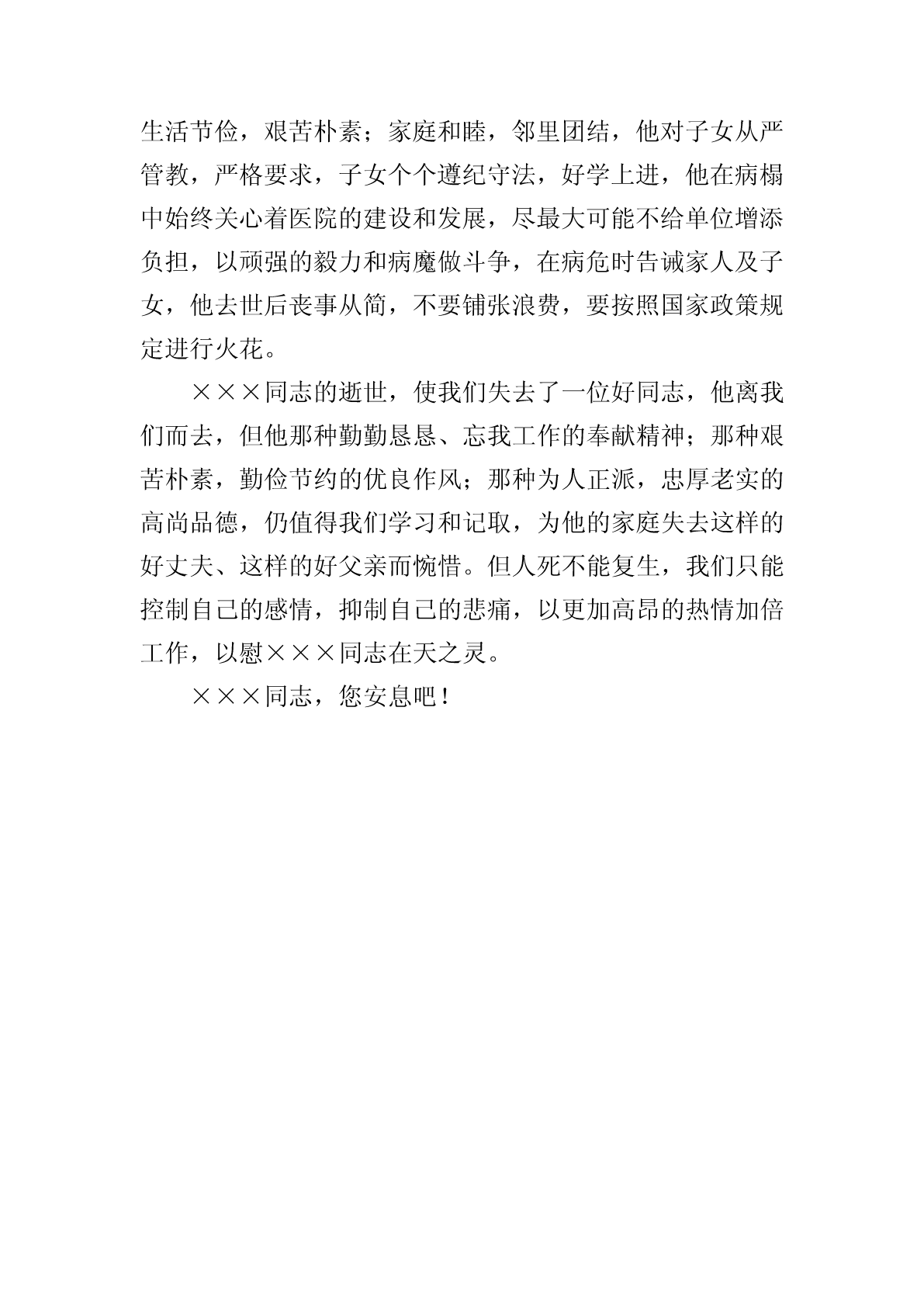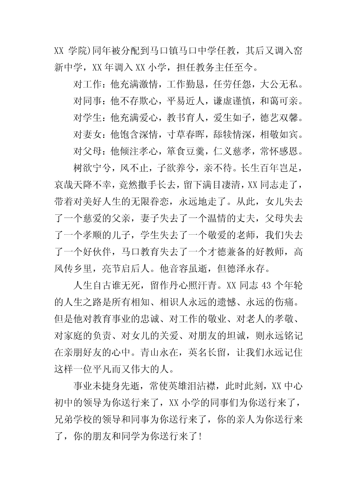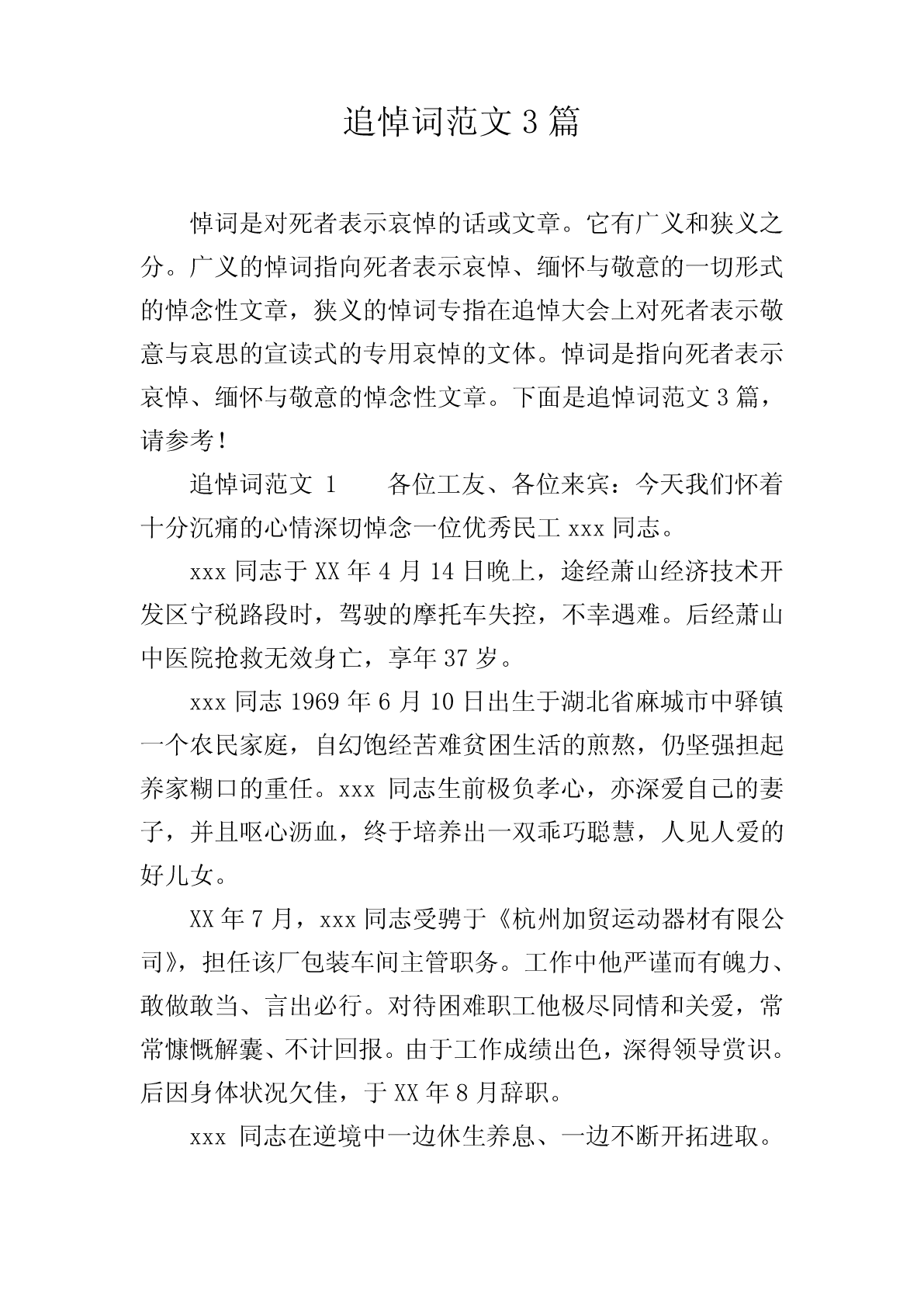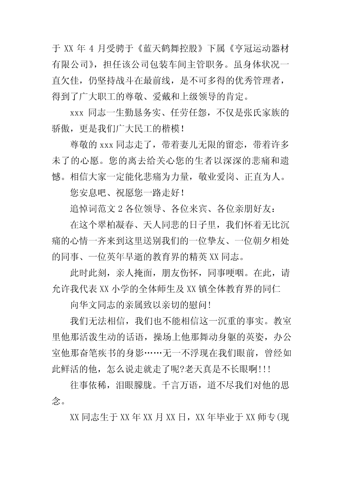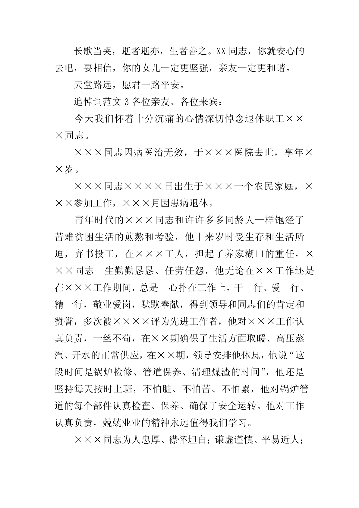 追悼词范文3篇悼词是对死者表示哀悼的话或文章。它有广义和狭义之分。广义的悼词指向死者表示哀悼、缅怀与敬意的一切形式的悼念性文章,狭义的悼词专指在追悼大会上对死者表示敬意与哀思的宣读式的专用哀悼的文体。悼词是指向死者表示哀悼、缅怀与敬意的悼念性文章。下面是追悼词范文3篇,请参考!追悼词范文1各位工友、各位来宾:今天我们怀着十分沉痛的心情深切悼念一位优秀民工xxx同志。xxx同志于XX年4月14日晚上,途经萧山经济技术开发区宁税路段时,驾驶的摩托车失控,不幸遇难。后经萧山中医院抢救无效身亡,享年37岁。xxx同志1969年6月10日出生于湖北省麻城市中驿镇一个农民家庭,自幻饱经苦难贫困生活的煎熬,仍坚强担起养家糊口的重任。xxx同志生前极负孝心,亦深爱自己的妻子,并且呕心沥血,终于培养出一双乖巧聪慧,人见人爱的好儿女。XX年7月,xxx同志受骋于《杭州加贸运动器材有限公司》,担任该厂包装车间主管职务。工作中他严谨而有魄力、敢做敢当、言出必行。对待困难职工他极尽同情和关爱,常常慷慨解囊、不计回报。由于工作成绩出色,深得领导赏识。后因身体状况欠佳,于XX年8月辞职。xxx同志在逆境中一边休生养息、一边不断开拓进取。于XX年4月受骋于《蓝天鹤舞控股》下属《亨冠运动器材有限公司》,担任该公司包装车间主管职务。虽身体状况一直欠佳,仍坚持战斗在最前线,是不可多得的优秀管理者,得到了广大职工的尊敬、爱戴和上级领导的肯定。xxx同志一生勤恳务实、任劳任怨,不仅是张氏家族的骄傲,更是我们广大民工的楷模!尊敬的xxx同志走了,带着妻儿无限的留恋,带着许多未了的心愿。您的离去给关心您的生者以深深的悲痛和遗憾。相信大家一定能化悲痛为力量,敬业爱岗、正直为人。您安息吧、祝愿您一路走好!追悼词范文2各位领导、各位来宾、各位亲朋好友:在这个翠柏凝春、天人同悲的日子里,我们怀着无比沉痛的心情一齐来到这里送别我们的一位挚友、一位朝夕相处的同事、一位英年早逝的教育界的精英XX同志。此时此刻,亲人掩面,朋友伤怀,同事哽咽。在此,请允许我代表XX小学的全体师生及XX镇全体教育界的同仁向华文同志的亲属致以亲切的慰问!我们无法相信,我们也不能相信这一沉重的事实。教室里他那活泼生动的话语,操场上他那舞动身躯的英姿,办公室他那奋笔疾书的身影……无一不浮现在我们眼前,曾经如此鲜活的他,怎么说走就走了呢?老天真是不长眼啊!!!往事依稀,泪眼朦胧。千言万语,道不尽我们对他的思念。XX同志生于XX年XX月XX日,XX年毕业于XX师专(现XX学院)同年被分配到马口镇马口中学任教,其后又调入窑新中学,XX年调入XX小学,担任教务主任至今。对工作:他充满激情,工作勤恳,任劳任怨,大公无私。对同事:他不存欺心,平易近人,谦虚谨慎,和蔼可亲。对学生:他充满爱心,教书育人,爱生如子,德艺双馨。对妻女:他饱含深情,寸草春晖,舔犊情深,相敬如宾。对父母:他倾注孝心,箪食豆羹,仁义慈孝,常怀感恩。树欲宁兮,风不止,子欲养兮,亲不待。长生百年岂足,哀哉天降不幸,竟然撒手长去,留下满目凄清,XX同志走了,带着对美好人生的无限眷恋,永远地走了。从此,女儿失去了一个慈爱的父亲,妻子失去了一个温情的丈夫,父母失去了一个孝顺的儿子,学生失去了一个敬爱的老师,我们失去了一个好伙伴,马口教育失去了一个才德兼备的好教师,高风传乡里,亮节启后人。他音容虽逝,但德泽永存。人生自古谁无死,留作丹心照汗青。XX同志43个年轮的人生之路是所有相知、相识人永远的遗憾、永远的伤痛。但是他对教育事业的忠诚、对工作的敬业、对老人的孝敬、对家庭的负责、对女儿的关爱、对朋友的坦诚,则永远铭记在亲朋好友的心中。青山永在,英名长留,让我们永远记住这样一位平凡而又伟大的人。事业未捷身先逝,常使英雄泪沾襟,此时此刻,XX中心初中的领导为你送行来了,XX小学的同事们为你送行来了,兄弟学校的领导和同事为你送行来了,你的亲人为你送行来了,你的朋友和同学为你送行来了!长歌当哭,逝者逝亦,生者善之。XX同志,你就安心的去吧,要相信,你的女儿一定更坚强,亲友一定更和谐。天堂路远,愿君一路平安。追悼词范文3各位亲友、各位来宾:今天我们怀着十分沉痛的心情深切悼念退休职工×××同志。×××同志因病医治无效,于×××医院去世,享年××岁。×××同志××××日出生于×××一个农民家庭,×××参加工作,×××月因患病退休。青年时代的×××同志和许许多多同龄人一样饱经了苦难贫困生活的煎熬和考验,他十来岁时受生存和生活所迫,弃书投工,在×××工人,担起了养家糊口的重任,×××同志一生勤勤恳恳、任劳任怨,他无论在××工作还是在×××工作期间,总是一心扑在工作上,干一行、爱一行、精一行,敬业爱岗,默默奉献,得到领导和同志们的肯定和赞誉,多次被××××评为先进工作者,他对×××工作认