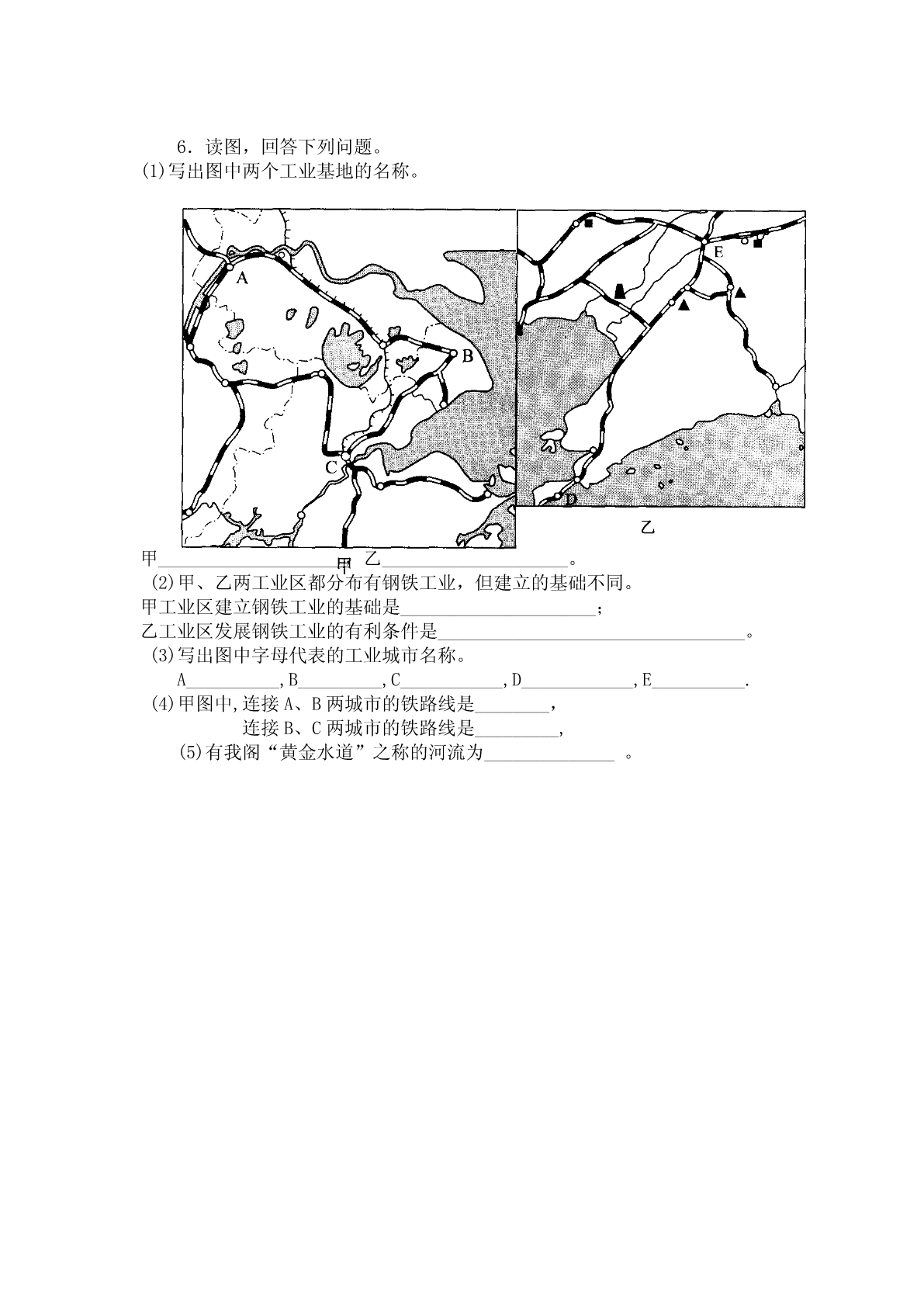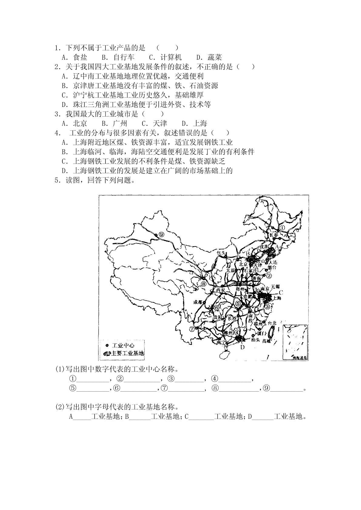 1.下列不属于工业产品的是()A.食盐B.自行车C.计算机D.蔬菜2.关于我国四大工业基地发展条件的叙述,不正确的是()A.辽中南工业基地地理位置优越,交通便利B.京津唐工业基地没有丰富的煤、铁、石油资源C.沪宁杭工业基地工业历史悠久,基础雄厚D.珠江三角洲工业基地便于引进外资、技术等3.我国最大的工业城市是()A.北京B.广州C.天津D.上海4.工业的分布与很多因素有关,叙述错误的是()A.上海附近地区煤、铁资源丰富,适宜发展钢铁工业B.上海临河、临海,海陆空交通便利是发展丁业的有利条件C.上海钢铁工业发展的不利条件是煤、铁资源缺乏D.上海钢铁工业的发展是建立在广阔的市场基础上的5.读图,回答下列问题。(1)写出图中数字代表的工业中心名称。①_________,②__________,③________,④_________,⑤_________,⑥__________,⑦__________,⑧___________,⑨_________。(2)写出图中字母代表的工业基地名称。A_____工业基地;B______工业基地;C_______工业基地;D______工业基地。6.读图,回答下列问题。(1)写出图中两个工业基地的名称。甲____________________,乙____________________。(2)甲、乙两工业区都分布有钢铁工业,但建立的基础不同。甲工业区建立钢铁工业的基础是_____________________;乙工业区发展钢铁工业的有利条件是_________________________________。(3)写出图中字母代表的工业城市名称。A__________,B_________,C___________,D____________,E__________.(4)甲图中,连接A、B两城市的铁路线是________,连接B、C两城市的铁路线是_________,(5)有我阁“黄金水道”之称的河流为______________。