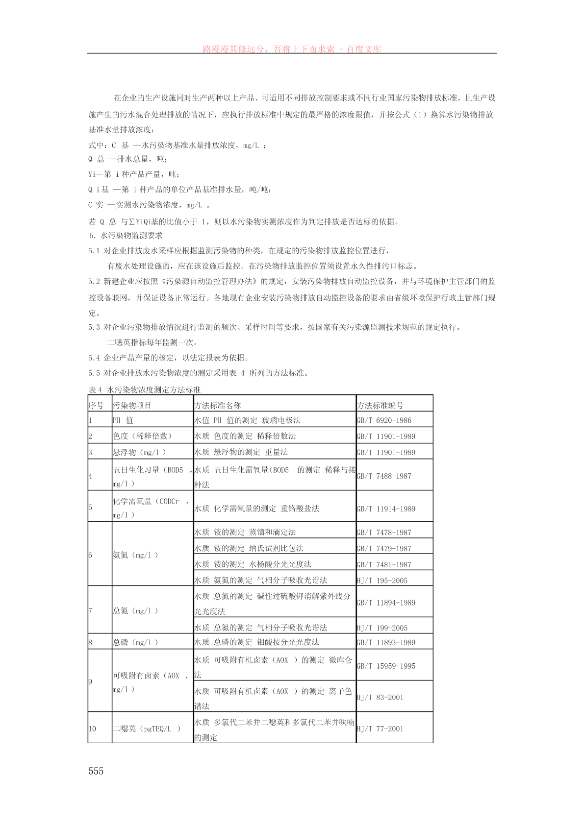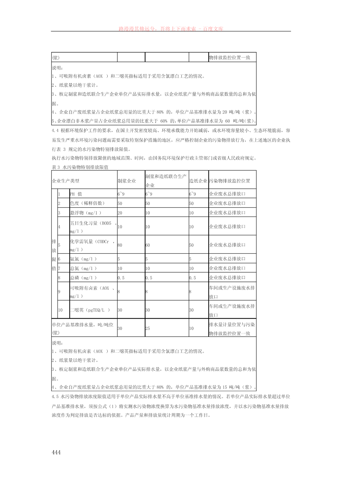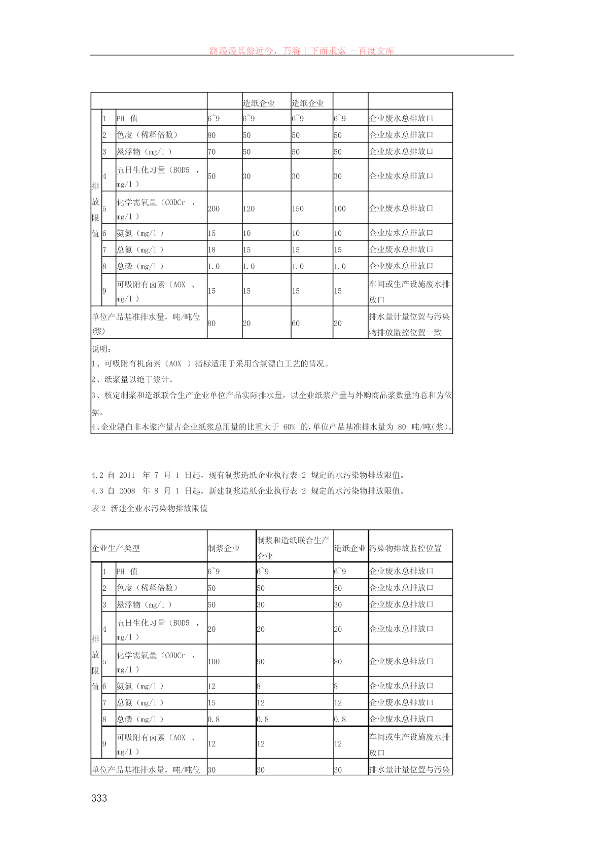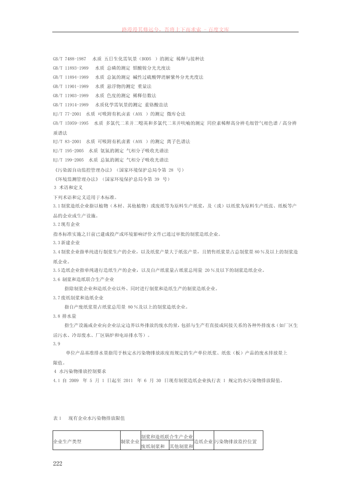 路漫漫其修远兮,吾将上下而求索-百度文库为贯彻《中华人民共和国环境保护法》《中华人民共和国水污染防治法》《中华人民共和国海洋环境保护法》《国务院关于落实科学发展观、加强环境保护的决定》等法律、法规和《国务院关于编制全国主体功能区规划的意见》,保护环境,防治污染,促进制浆造纸工业生产工艺和污染治理技术的进步,制定本标准。本标准规定了制浆造纸工业企业水污染物排放限值、监测和监控要求。为促进区域经济与环境协调发展,推动经济结构的调整和经济增长方式的转变,引导工业生产工艺和污染治理技术的发展方向,本标准规定了水污染物特别排放限值。制浆造纸工业企业排放大气污染物(含恶臭污染物)、环境噪声适用相应的国家污染物排放标准,产生固体废物的鉴别、处理和处置适用国家固体废物污染控制标准。本标准首次发布于1983年,1992年第一次修订,2001年第二次修订。此次修订主要内容:1、根据落实国家环境保护规划、履行国际公约和环境保护管理和执法工作的需要,调整了排放标准体系,增加了控制排放的污染物项目,提高了污染物排放控制要求;2、规定了污染物排放监控要求和水污染物排放基准排水量;3、将可吸附有机卤素指标调整为强制执行项目。自本标准实施之日起,《造纸工业水污染物排放标准》(GB3544-2001)《关于修订〈造纸工业水污染物排放标准〉的公告》(环发[2003]152号)废止。本标准由环境保护部科技标准司组织制订。本标准由山东省环境保护局、山东省环境规划研究院、环境保护部环境标准研究所、山东省环境保护科学研究设计院等单位起草。本标准环境保护部2008年4月29日批准。本标准自2008年8月1日起实施。本标准由环境保护部解释。1适用范围本标准规定了制浆造纸企业或生产设施水污染物排放限值。本标准适用于现有制浆造纸企业或生产设施的水污染物排放管理。本标准适用于对制浆造纸工业建设项目的环境影响评价、环境保护设施设计、竣工环境保护验收及其投产后的水污染物排放管理。本标准适用于法律允许的污染物排放行为。新设立污染源的选址和特殊保护区域内现有污染源的管理,按照《中华人民共和国大气污染防治法》《中华人民共和国水污染防治法》、《中华人民共和国海洋环境保护法》、《中华人民共和国固体废物污染环境防治法》、《中华人民共和国放射性污染防治法》《中华人民共和国环境影响评价法》等法律、法规、规章的相关规定执行。本标准规定的水污染物排放控制要求适用于企业向环境水体的排放行为。企业向设置污水处理厂的城镇排水系统排放废水时,有毒污染物可吸附有机卤素(AOX)、二噁英在本标准规定的监控位置执行相应的排放限值;其他污染物的排放控制要求由企业与城镇污水处理厂根据其污水处理能力商定或执行相关标准,并报当地环境保护主管部门备案;城镇污水处理厂应保证排放污染物达到相关排放标准要求。建设项目拟向设置污水处理厂的城镇排水系统排放废水时,由建设单位和城镇污水处理厂按前款的规定执行。2规范性引用文件本标准内容引用了下列文件或其中的条款。GB/T6920-1986水质pH值的测定玻璃电极法GB/T7478-1987水质铵的测定蒸馏和滴定法GB/T7479-1987水质铵的测定纳氏试剂比色法GB/T7481-1987水质铵的测定水杨酸分光光度法111路漫漫其修远兮,吾将上下而求索-百度文库GB/T7488-1987水质五日生化需氧量(BOD5)的测定稀释与接种法GB/T11893-1989水质总磷的测定钼酸铵分光光度法GB/T11894-1989水质总氮的测定碱性过硫酸钾消解紫外分光光度法GB/T11901-1989水质悬浮物的测定重量法GB/T11903-1989水质色度的测定稀释倍数法GB/T11914-1989水质化学需氧量的测定重铬酸盐法HJ/T77-2001水质可吸附有机卤素(AOX)的测定微库仑法GB/T15959-1995水质多氯代二苯并二噁英和多氯代二苯并呋喃的测定同位素稀释高分辨毛细管气相色谱/高分辨质谱法HJ/T83-2001水质可吸附有机卤素(AOX)的测定离子色谱法HJ/T195-2005水质氨氮的测定气相分子吸收光谱法HJ/T199-2005水质总氮的测定气相分子吸收光谱法《污染源自动监控管理办法》(国家环境保护总局令第28号)《环境监测管理办法》(国家环境保护总局令第39号)3术语和定义下列术语和定义适用于本标准。3.1制浆造纸企业指以植物(木材、其他植物)或废纸等为原料生产纸浆,及(或)以纸浆为原料生产纸张、纸板等产品的企业或生产设施。3.2现有企业指本标准实施之日前已建成投产或环境影响评价文件已通过审批的制浆造纸企业。3.3新建企业3.4制浆企业指单纯进行制浆生产的企业,以及纸浆产量大于纸张产量,且销售纸浆量占总制浆量80%及以上的制浆造纸企业。3.5造纸企业指单纯进行造纸生产的企业,