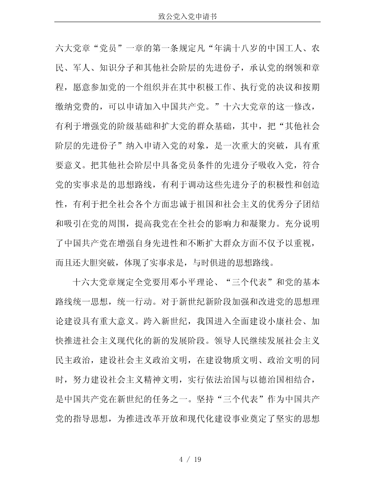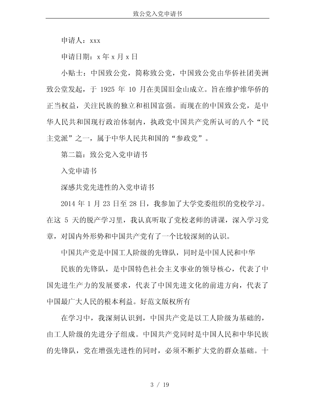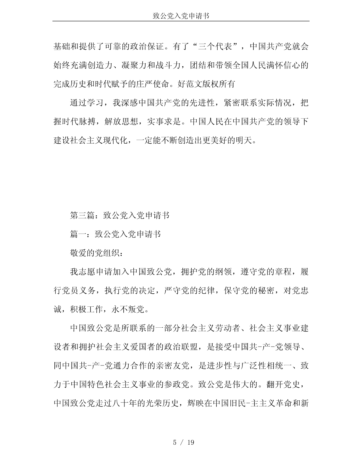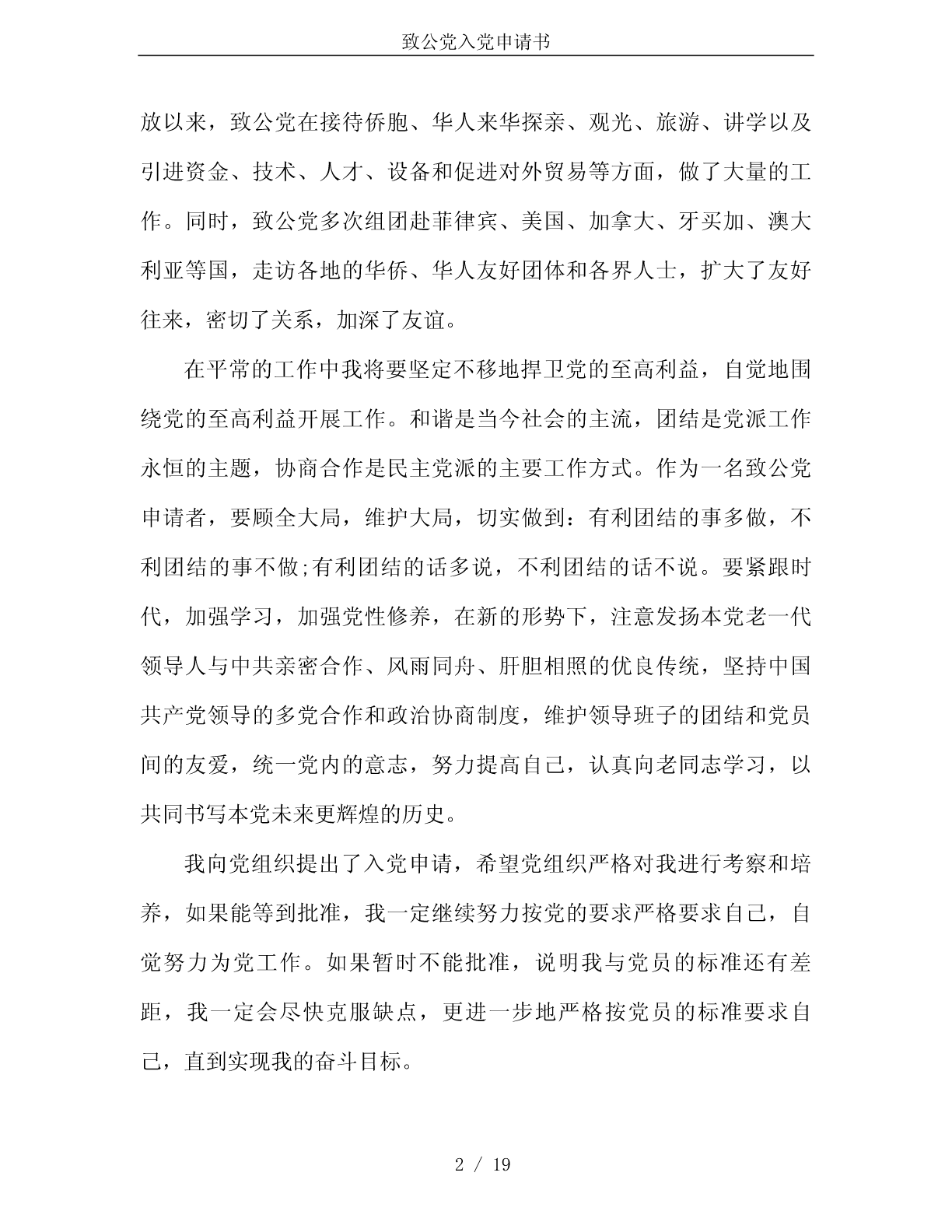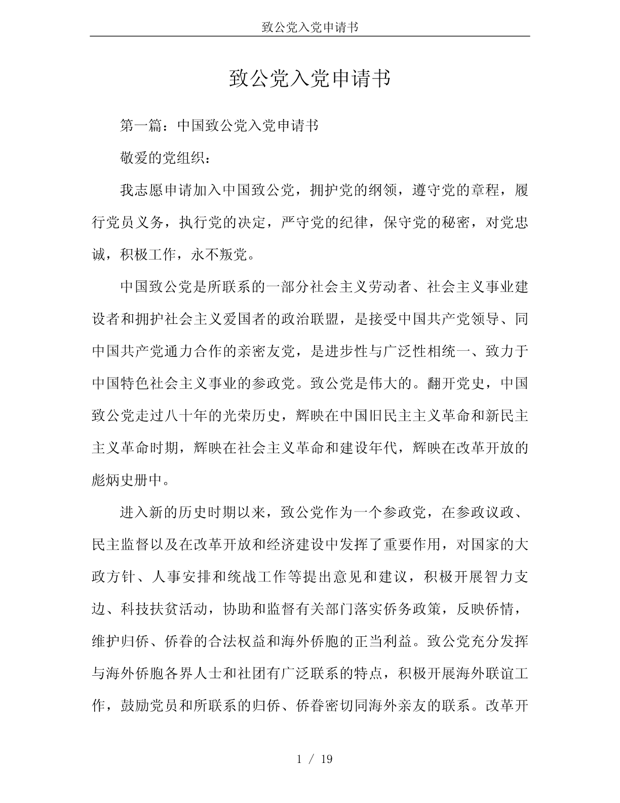 致公党入党申请书致公党入党申请书第一篇:中国致公党入党申请书敬爱的党组织:我志愿申请加入中国致公党,拥护党的纲领,遵守党的章程,履行党员义务,执行党的决定,严守党的纪律,保守党的秘密,对党忠诚,积极工作,永不叛党。中国致公党是所联系的一部分社会主义劳动者、社会主义事业建设者和拥护社会主义爱国者的政治联盟,是接受中国共产党领导、同中国共产党通力合作的亲密友党,是进步性与广泛性相统一、致力于中国特色社会主义事业的参政党。致公党是伟大的。翻开党史,中国致公党走过八十年的光荣历史,辉映在中国旧民主主义革命和新民主主义革命时期,辉映在社会主义革命和建设年代,辉映在改革开放的彪炳史册中。进入新的历史时期以来,致公党作为一个参政党,在参政议政、民主监督以及在改革开放和经济建设中发挥了重要作用,对国家的大政方针、人事安排和统战工作等提出意见和建议,积极开展智力支边、科技扶贫活动,协助和监督有关部门落实侨务政策,反映侨情,维护归侨、侨眷的合法权益和海外侨胞的正当利益。致公党充分发挥与海外侨胞各界人士和社团有广泛联系的特点,积极开展海外联谊工作,鼓励党员和所联系的归侨、侨眷密切同海外亲友的联系。改革开1/19致公党入党申请书放以来,致公党在接待侨胞、华人来华探亲、观光、旅游、讲学以及引进资金、技术、人才、设备和促进对外贸易等方面,做了大量的工作。同时,致公党多次组团赴菲律宾、美国、加拿大、牙买加、澳大利亚等国,走访各地的华侨、华人友好团体和各界人士,扩大了友好往来,密切了关系,加深了友谊。在平常的工作中我将要坚定不移地捍卫党的至高利益,自觉地围绕党的至高利益开展工作。和谐是当今社会的主流,团结是党派工作永恒的主题,协商合作是民主党派的主要工作方式。作为一名致公党申请者,要顾全大局,维护大局,切实做到:有利团结的事多做,不利团结的事不做;有利团结的话多说,不利团结的话不说。要紧跟时代,加强学习,加强党性修养,在新的形势下,注意发扬本党老一代领导人与中共亲密合作、风雨同舟、肝胆相照的优良传统,坚持中国共产党领导的多党合作和政治协商制度,维护领导班子的团结和党员间的友爱,统一党内的意志,努力提高自己,认真向老同志学习,以共同书写本党未来更辉煌的历史。我向党组织提出了入党申请,希望党组织严格对我进行考察和培养,如果能等到批准,我一定继续努力按党的要求严格要求自己,自觉努力为党工作。如果暂时不能批准,说明我与党员的标准还有差距,我一定会尽快克服缺点,更进一步地严格按党员的标准要求自己,直到实现我的奋斗目标。2/19致公党入党申请书申请人:xxx申请日期:x年x月x日小贴士:中国致公党,简称致公党,中国致公党由华侨社团美洲致公堂发起,于1925年10月在美国旧金山成立。旨在维护维华侨的正当权益,关注民族的独立和祖国富强。而现在的中国致公党,是中华人民共和国现行政治体制内,执政党中国共产党所认可的八个“民主党派”之一,属于中华人民共和国的“参政党”。第二篇:致公党入党申请书入党申请书深感共党先进性的入党申请书2014年1月23日至28日,我参加了大学党委组织的党校学习。在这5天的脱产学习里,我认真听取了党校老师的讲课,深入学习党章,对国内外形势和中国共产党有了一个比较深刻的认识。中国共产党是中国工人阶级的先锋队,同时是中国人民和中华民族的先锋队,是中国特色社会主义事业的领导核心,代表了中国先进生产力的发展要求,代表了中国先进文化的前进方向,代表了中国最广大人民的根本利益。好范文版权所有在学习中,我深刻认识到,中国共产党是以工人阶级为基础的,由工人阶级的先进分子组成。中国共产党同时是中国人民和中华民族的先锋队,党在增强先进性的同时,必须不断扩大党的群众基础。十3/19致公党入党申请书六大党章“党员”一章的第一条规定凡“年满十八岁的中国工人、农民、军人、知识分子和其他社会阶层的先进份子,承认党的纲领和章程,愿意参加党的一个组织并在其中积极工作、执行党的决议和按期缴纳党费的,可以申请加入中国共产党。”十六大党章的这一修改,有利于增强党的阶级基础和扩大党的群众基础,其中,把“其他社会阶层的先进份子”纳入申请入党的对象,是一次重大的突破,具有重要意义。把其他社会阶层中具备党员条件的先进分子吸收入党,符合党的实事求是的思想路线,有利于调动这些先进分子的积极性和创造性,有利于把全社会各个方面忠诚于祖国和社会主义的优秀分子团结和吸引在党的周围,提高我党在全社会的影响力和凝聚力。充分说明了中国共产党在增强自身先进性和不断扩大群众方面不仅予以重视,而且还大胆突破,体现了实事求是,与时俱进的思想路线。十六大党章规定全党要用邓小平理论、“三个代表”和党的基本路线统一思想,统一行动。对于新世纪新阶段加强和改进党的思想理论建设具有重大意义。跨入新世纪,我国进入全面建设小康社会、加快推进社