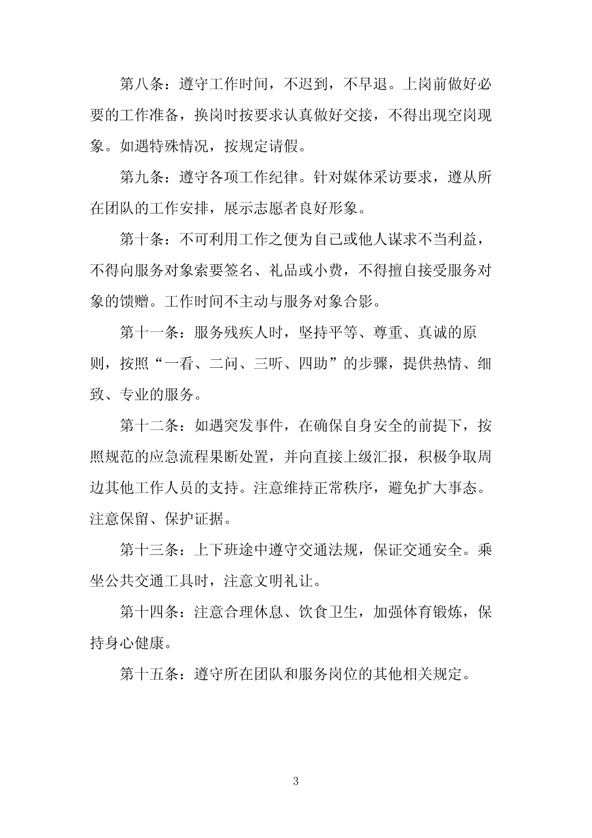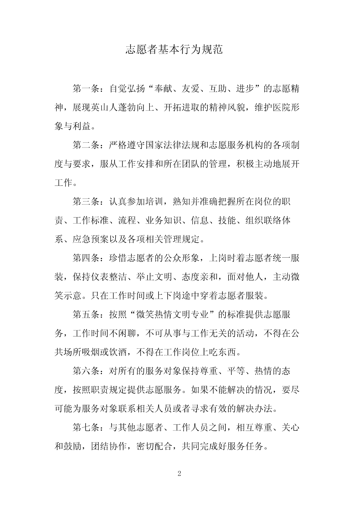 志愿者基本行为规范-CAL-FENGHAI.-(YICAI)-CompanyOne1志愿者基本行为规范第一条:自觉弘扬“奉献、友爱、互助、进步”的志愿精神,展现英山人蓬勃向上、开拓进取的精神风貌,维护医院形象与利益。第二条:严格遵守国家法律法规和志愿服务机构的各项制度与要求,服从工作安排和所在团队的管理,积极主动地展开工作。第三条:认真参加培训,熟知并准确把握所在岗位的职责、工作标准、流程、业务知识、信息、技能、组织联络体系、应急预案以及各项相关管理规定。第四条:珍惜志愿者的公众形象,上岗时着志愿者统一服装,保持仪表整洁、举止文明、态度亲和,面对他人,主动微笑示意。只在工作时间或上下岗途中穿着志愿者服装。第五条:按照“微笑热情文明专业”的标准提供志愿服务,工作时间不闲聊,不可从事与工作无关的活动,不得在公共场所吸烟或饮酒,不得在工作岗位上吃东西。第六条:对所有的服务对象保持尊重、平等、热情的态度,按照职责规定提供志愿服务。如果不能解决的情况,要尽可能为服务对象联系相关人员或者寻求有效的解决办法。第七条:与其他志愿者、工作人员之间,相互尊重、关心和鼓励,团结协作,密切配合,共同完成好服务任务。2第八条:遵守工作时间,不迟到,不早退。上岗前做好必要的工作准备,换岗时按要求认真做好交接,不得出现空岗现象。如遇特殊情况,按规定请假。第九条:遵守各项工作纪律。针对媒体采访要求,遵从所在团队的工作安排,展示志愿者良好形象。第十条:不可利用工作之便为自己或他人谋求不当利益,不得向服务对象索要签名、礼品或小费,不得擅自接受服务对象的馈赠。工作时间不主动与服务对象合影。第十一条:服务残疾人时,坚持平等、尊重、真诚的原则,按照“一看、二问、三听、四助”的步骤,提供热情、细致、专业的服务。第十二条:如遇突发事件,在确保自身安全的前提下,按照规范的应急流程果断处置,并向直接上级汇报,积极争取周边其他工作人员的支持。注意维持正常秩序,避免扩大事态。注意保留、保护证据。第十三条:上下班途中遵守交通法规,保证交通安全。乘坐公共交通工具时,注意文明礼让。第十四条:注意合理休息、饮食卫生,加强体育锻炼,保持身心健康。第十五条:遵守所在团队和服务岗位的其他相关规定。3