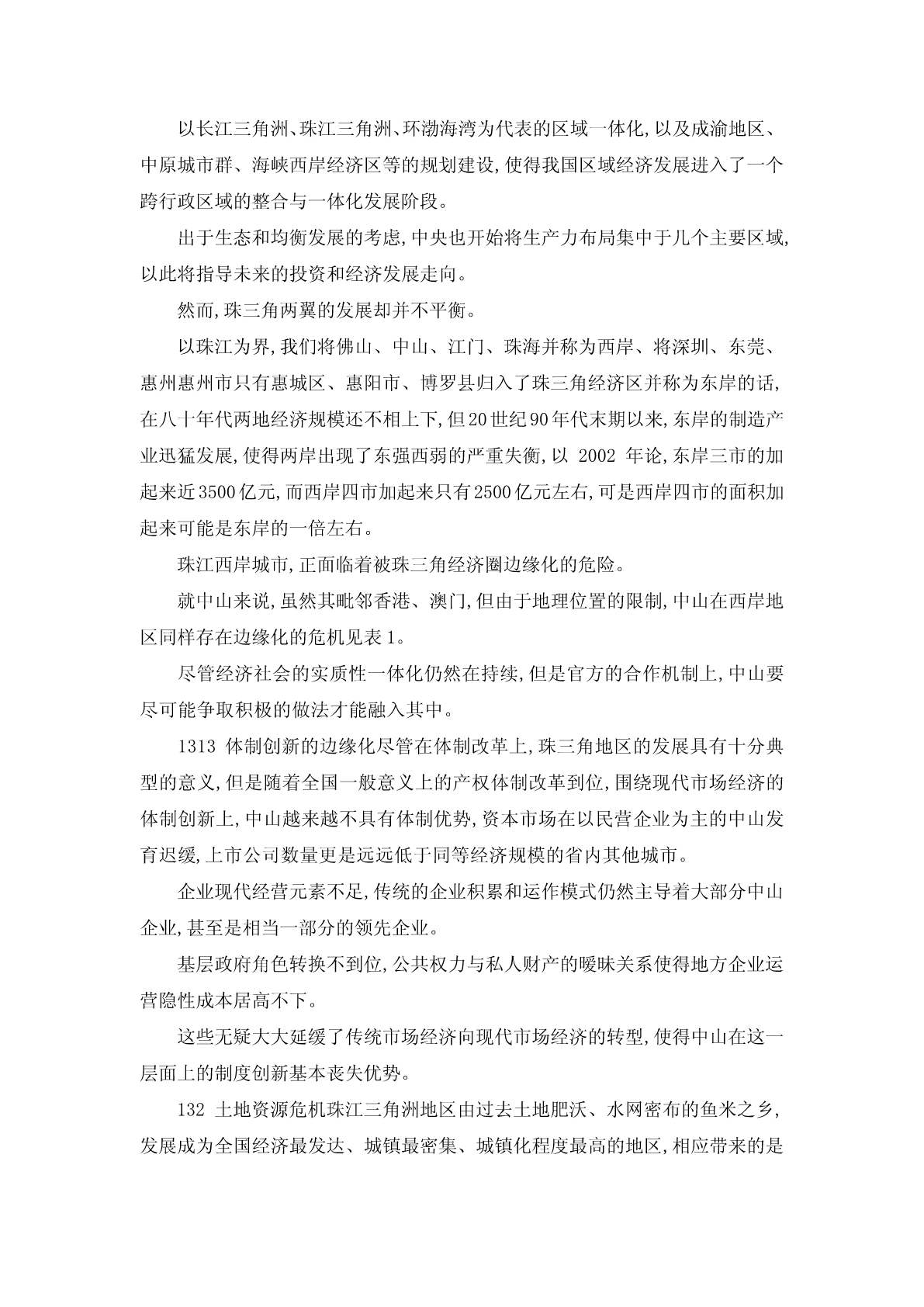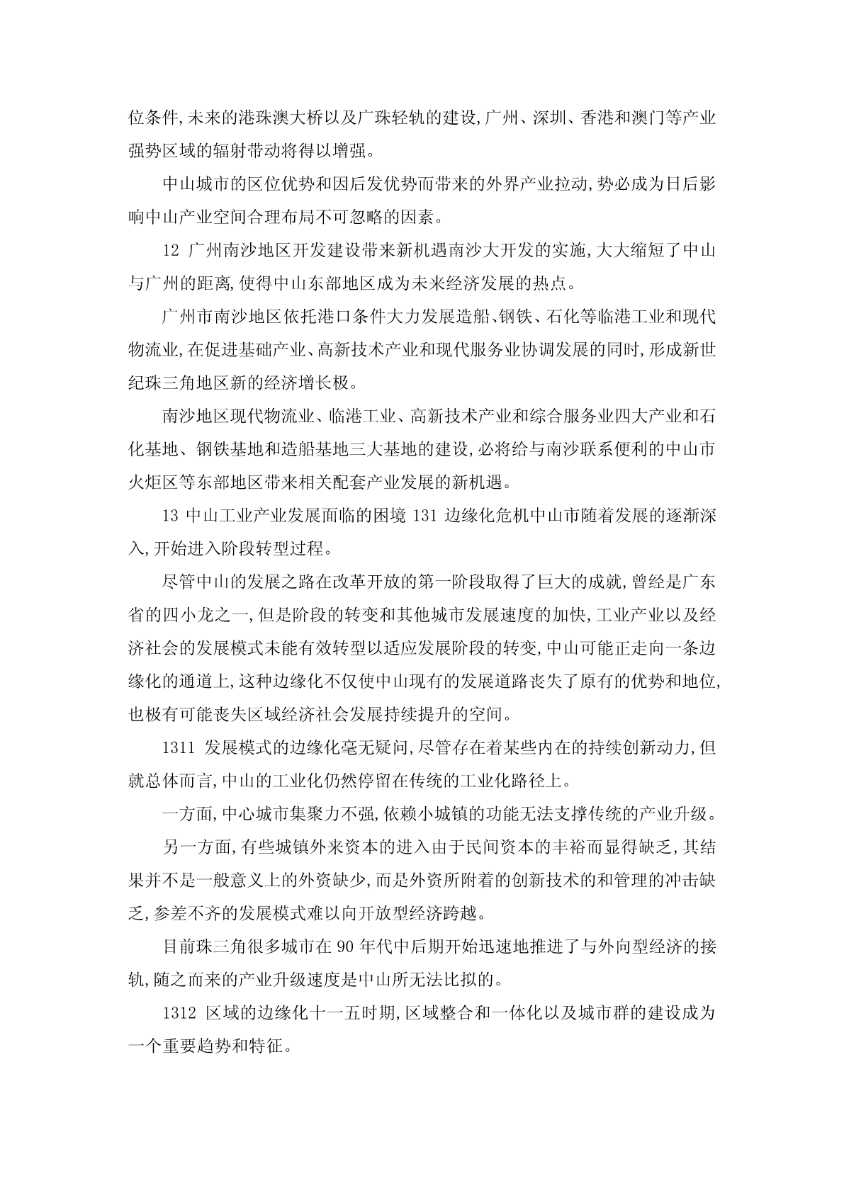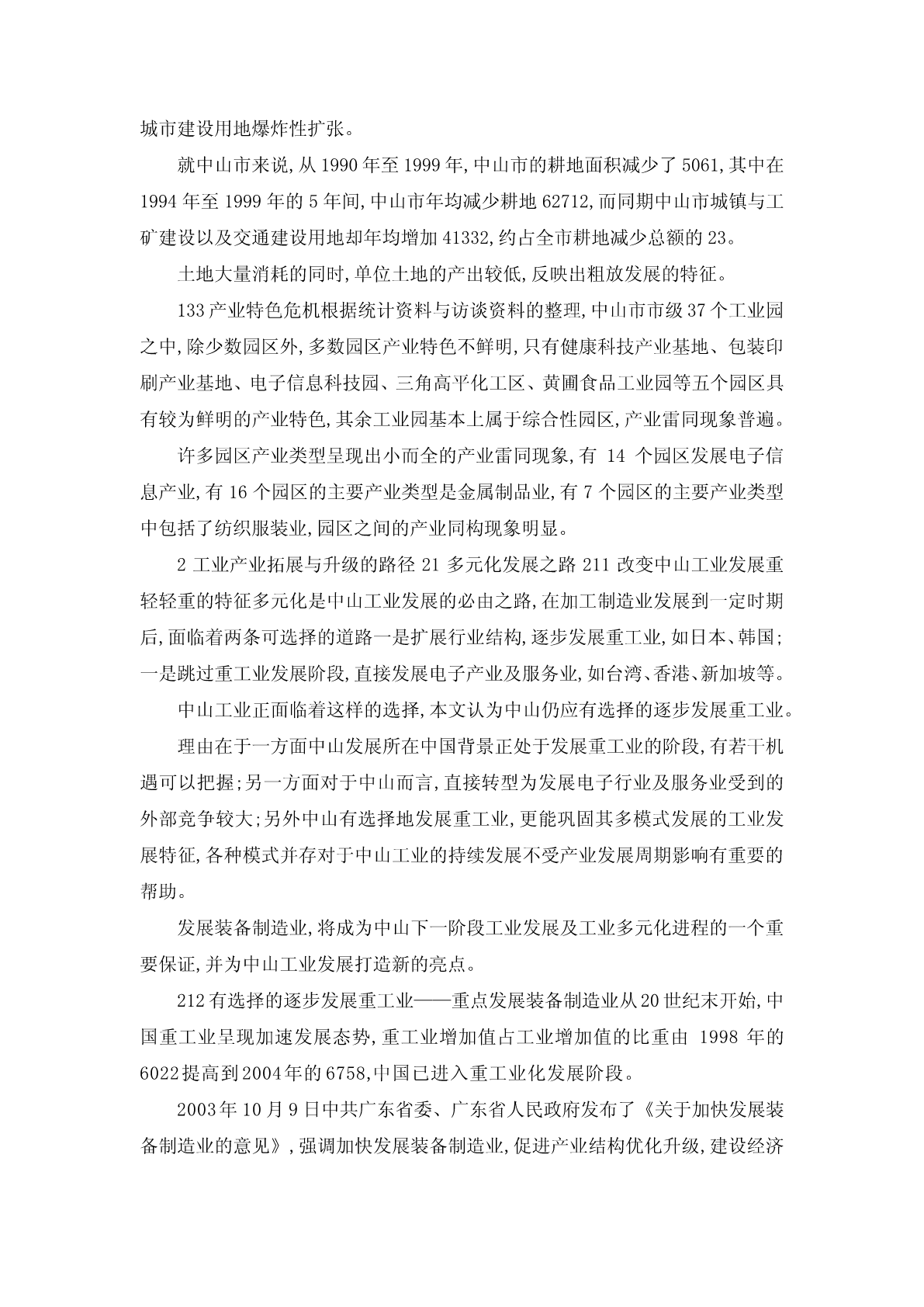 中山市工业产业发展的策略诠释中山市作为沿海开放城市之一,工业发展日新月异,尤其工业园区在各个城镇的发展过程中,对吸纳外资、调整优化产业结构、促进产业升级、接纳就业人口等方面起到极其重要作用。20多年的发展,从改革开放之初发展支援农业型工业,到以农业为基础,工业为主体,大力发展以外向型经济为主的商品经济,再到实施工业立市、工业强市战略和促进内、外源型经济协调发展;从市、镇区、村、户多个轮子一齐转,到工业进园进区、集约化发展,中山市的工业发展走过了风风雨雨的艰苦历程,基本形成东部高新技术、北部传统特色工业、中部电子信息技术和南部出口加工工业的格局。一镇一品的区域特色经济成为中山市经济的重要特征,如古镇的灯饰、小榄的五金音响、沙溪的休闲服装等,围绕这些特色产业进行分工协作,产业链不断延伸,初显产业集聚的发展方式。回顾过去,展望未来,中山处于城市化发展的高速上升期,经济增长开始逐渐由粗放型向集约化发展方向转变。结合党中央提出的构建和谐社会发展构想,以及省政府对中山建设社会经济协调发展示范市的期望,中山市政府确定了构建和谐中山、建设两个适宜城市的发展目标,提出对城市空间资源进行整合。基于发展背景的变化,规划管理和规划研究同样出现重要转变,即从单纯的经验总结型研究向问题探索型研究的转变。特别是对于中山自身经济社会发展过程所出现的种种问题的关注和研究不断出现,在很大程度上将人们的目光和研究视角引向了中山工业产业发展进程中被各种光环所隐蔽住的种种潜在和现实的问题。本文正是在这一背景下对中山工业的空间布局和发展路径所作的探讨。1工业产业发展面临的可能与困境11珠三角产业空间发展格局对中山产业的影响20世纪90年代珠三角经济区形成了三足鼎立的局面,即广佛产业经济圈广州、佛山、港深产业经济圈香港、深圳、澳珠产业经济圈澳门、珠海。经过改革开放20多年时间,在三大产业经济圈的共同作用下,珠江三角洲东、西两岸产业带日益发展并成熟起来。而中山产业经济区恰恰处于珠江西岸产业带的中间位置,具有得天独厚的区位条件,未来的港珠澳大桥以及广珠轻轨的建设,广州、深圳、香港和澳门等产业强势区域的辐射带动将得以增强。中山城市的区位优势和因后发优势而带来的外界产业拉动,势必成为日后影响中山产业空间合理布局不可忽略的因素。12广州南沙地区开发建设带来新机遇南沙大开发的实施,大大缩短了中山与广州的距离,使得中山东部地区成为未来经济发展的热点。广州市南沙地区依托港口条件大力发展造船、钢铁、石化等临港工业和现代物流业,在促进基础产业、高新技术产业和现代服务业协调发展的同时,形成新世纪珠三角地区新的经济增长极。南沙地区现代物流业、临港工业、高新技术产业和综合服务业四大产业和石化基地、钢铁基地和造船基地三大基地的建设,必将给与南沙联系便利的中山市火炬区等东部地区带来相关配套产业发展的新机遇。13中山工业产业发展面临的困境131边缘化危机中山市随着发展的逐渐深入,开始进入阶段转型过程。尽管中山的发展之路在改革开放的第一阶段取得了巨大的成就,曾经是广东省的四小龙之一,但是阶段的转变和其他城市发展速度的加快,工业产业以及经济社会的发展模式未能有效转型以适应发展阶段的转变,中山可能正走向一条边缘化的通道上,这种边缘化不仅使中山现有的发展道路丧失了原有的优势和地位,也极有可能丧失区域经济社会发展持续提升的空间。1311发展模式的边缘化毫无疑问,尽管存在着某些内在的持续创新动力,但就总体而言,中山的工业化仍然停留在传统的工业化路径上。一方面,中心城市集聚力不强,依赖小城镇的功能无法支撑传统的产业升级。另一方面,有些城镇外来资本的进入由于民间资本的丰裕而显得缺乏,其结果并不是一般意义上的外资缺少,而是外资所附着的创新技术的和管理的冲击缺乏,参差不齐的发展模式难以向开放型经济跨越。目前珠三角很多城市在90年代中后期开始迅速地推进了与外向型经济的接轨,随之而来的产业升级速度是中山所无法比拟的。1312区域的边缘化十一五时期,区域整合和一体化以及城市群的建设成为一个重要趋势和特征。以长江三角洲、珠江三角洲、环渤海湾为代表的区域一体化,以及成渝地区、中原城市群、海峡西岸经济区等的规划建设,使得我国区域经济发展进入了一个跨行政区域的整合与一体化发展阶段。出于生态和均衡发展的考虑,中央也开始将生产力布局集中于几个主要区域,以此将指导未来的投资和经济发展走向。然而,珠三角两翼的发展却并不平衡。以珠江为界,我们将佛山、中山、江门、珠海并称为西岸、将深圳、东莞、惠州惠州市只有惠城区、惠阳市、博罗县归入了珠三角经济区并称为东岸的话,在八十年代两地经济规模还不相上下,但20世纪90年代末期以来,东岸的制造产业迅猛发展,使得两岸出现了东强西弱的严重失衡,以2002年论,东岸三市的加起来近3500亿元,而西岸四市加起来只有2