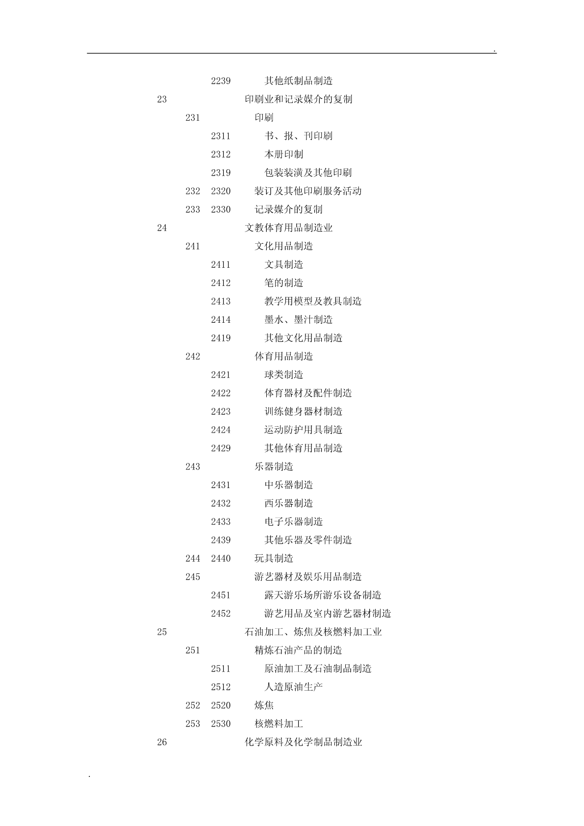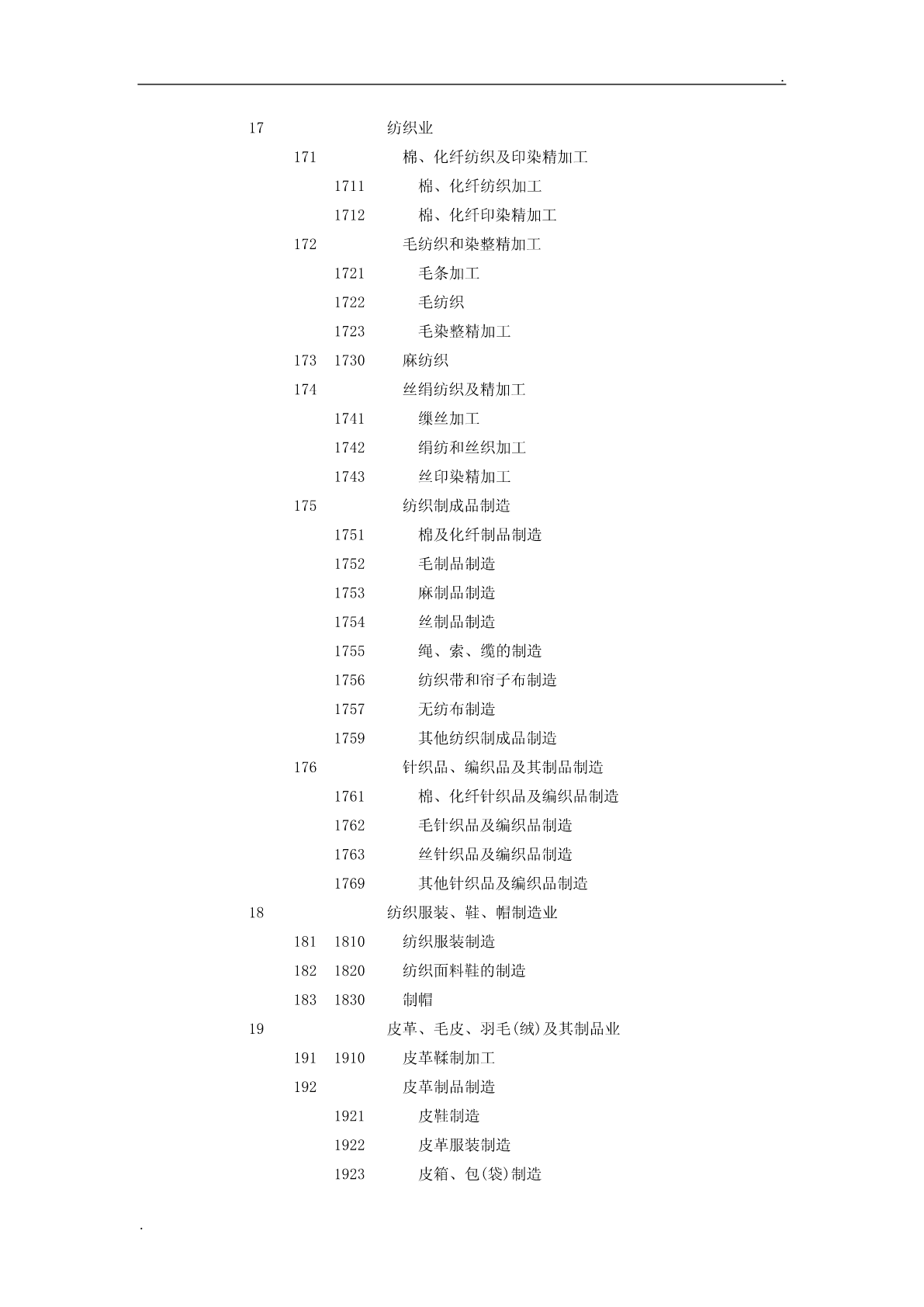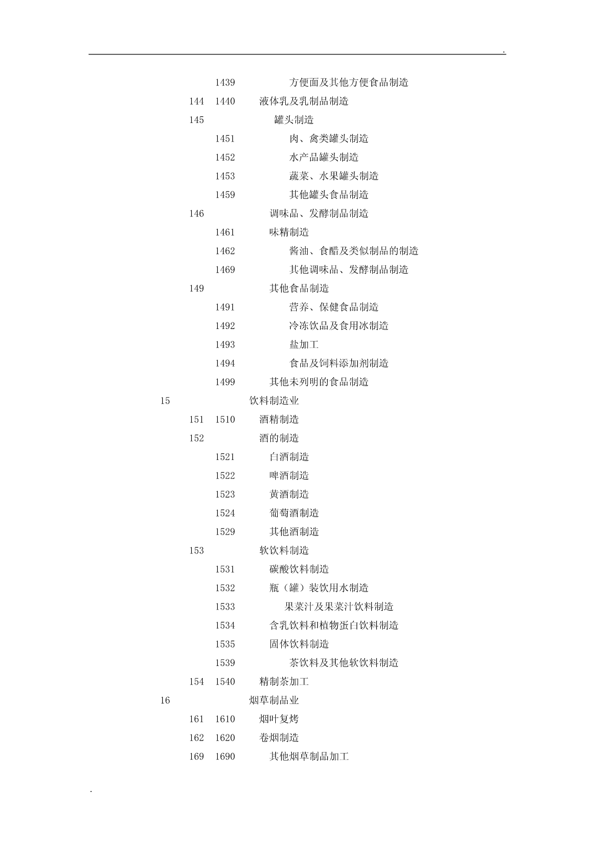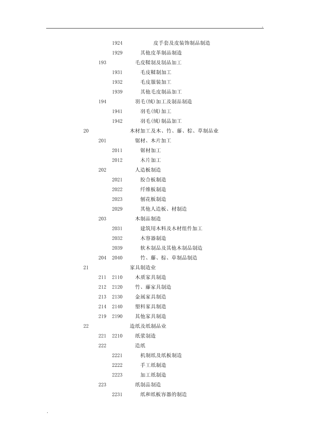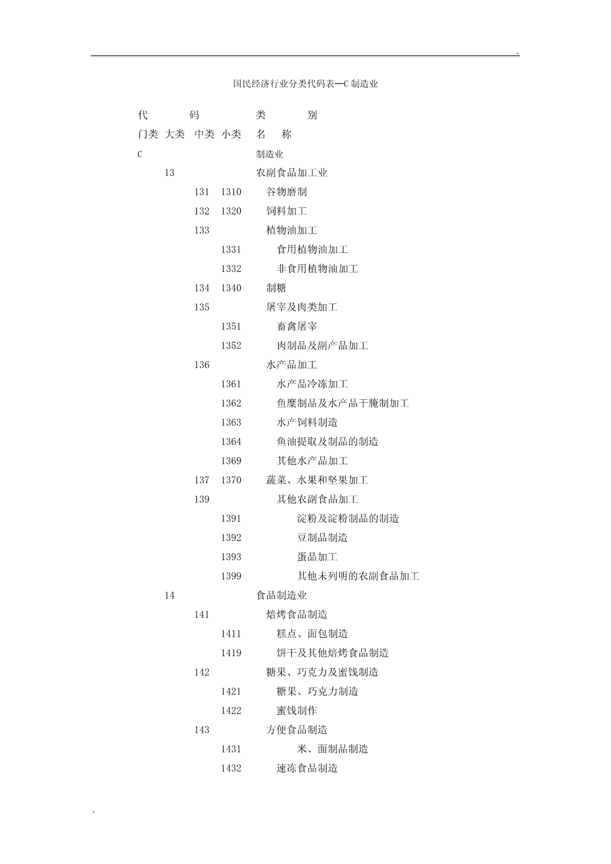 .国民经济行业分类代码表─C制造业代码类别门类大类中类小类名称C制造业13农副食品加工业1311310谷物磨制1321320饲料加工133植物油加工1331食用植物油加工1332非食用植物油加工1341340制糖135屠宰及肉类加工1351畜禽屠宰1352肉制品及副产品加工136水产品加工1361水产品冷冻加工1362鱼糜制品及水产品干腌制加工1363水产饲料制造1364鱼油提取及制品的制造1369其他水产品加工1371370蔬菜、水果和坚果加工139其他农副食品加工1391淀粉及淀粉制品的制造1392豆制品制造1393蛋品加工1399其他未列明的农副食品加工14食品制造业141焙烤食品制造1411糕点、面包制造1419饼干及其他焙烤食品制造142糖果、巧克力及蜜饯制造1421糖果、巧克力制造1422蜜饯制作143方便食品制造1431米、面制品制造1432速冻食品制造..1439方便面及其他方便食品制造1441440液体乳及乳制品制造145罐头制造1451肉、禽类罐头制造1452水产品罐头制造1453蔬菜、水果罐头制造1459其他罐头食品制造146调味品、发酵制品制造1461味精制造1462酱油、食醋及类似制品的制造1469其他调味品、发酵制品制造149其他食品制造1491营养、保健食品制造1492冷冻饮品及食用冰制造1493盐加工1494食品及饲料添加剂制造1499其他未列明的食品制造15饮料制造业1511510酒精制造152酒的制造1521白酒制造1522啤酒制造1523黄酒制造1524葡萄酒制造1529其他酒制造153软饮料制造1531碳酸饮料制造1532瓶(罐)装饮用水制造1533果菜汁及果菜汁饮料制造1534含乳饮料和植物蛋白饮料制造1535固体饮料制造1539茶饮料及其他软饮料制造1541540精制茶加工16烟草制品业1611610烟叶复烤1621620卷烟制造1691690其他烟草制品加工..17纺织业171棉、化纤纺织及印染精加工1711棉、化纤纺织加工1712棉、化纤印染精加工172毛纺织和染整精加工1721毛条加工1722毛纺织1723毛染整精加工1731730麻纺织174丝绢纺织及精加工1741缫丝加工1742绢纺和丝织加工1743丝印染精加工175纺织制成品制造1751棉及化纤制品制造1752毛制品制造1753麻制品制造1754丝制品制造1755绳、索、缆的制造1756纺织带和帘子布制造1757无纺布制造1759其他纺织制成品制造176针织品、编织品及其制品制造1761棉、化纤针织品及编织品制造1762毛针织品及编织品制造1763丝针织品及编织品制造1769其他针织品及编织品制造18纺织服装、鞋、帽制造业1811810纺织服装制造1821820纺织面料鞋的制造1831830制帽19皮革、毛皮、羽毛(绒)及其制品业1911910皮革鞣制加工192皮革制品制造1921皮鞋制造1922皮革服装制造1923皮箱、包(袋)制造..1924皮手套及皮装饰制品制造1929其他皮革制品制造193毛皮鞣制及制品加工1931毛皮鞣制加工1932毛皮服装加工1939其他毛皮制品加工194羽毛(绒)加工及制品制造1941羽毛(绒)加工1942羽毛(绒)制品加工20木材加工及木、竹、藤、棕、草制品业201锯材、木片加工2011锯材加工2012木片加工202人造板制造2021胶合板制造2022纤维板制造2023刨花板制造2029其他人造板、材制造203木制品制造2031建筑用木料及木材组件加工2032木容器制造2039软木制品及其他木制品制造2042040竹、藤、棕、草制品制造21家具制造业2112110木质家具制造2122120竹、藤家具制造2132130金属家具制造2142140塑料家具制造2192190其他家具制造22造纸及纸制品业2212210纸浆制造222造纸2221机制纸及纸板制造2222手工纸制造2223加工纸制造223纸制品制造2231纸和纸板容器的制造..2239其他纸制品制造23印刷业和记录媒介的复制231印刷2311书、报、刊印刷2312本册印制2319包装装潢及其他印刷2322320装订及其他印刷服务活动2332330记录媒介的复制24文教体育用品制造业241文化用品制造2411文具制造2412笔的制造2413教学用模型及教具制造2414墨水、墨汁制造2419其他文化用品制造242体育用品制造2421球类制造2422体育器材及配件制造2423训练健身器材制造2424运动防护用具制造2429其他体育用品制造243乐器制造2431中乐器制造2432西乐器制造2433电子乐器制造2439其他乐器及零件制造2442440玩具制造245游艺器材及娱乐用品制造2451露天游乐场所游乐设备制造2452游艺用品及室内游艺器