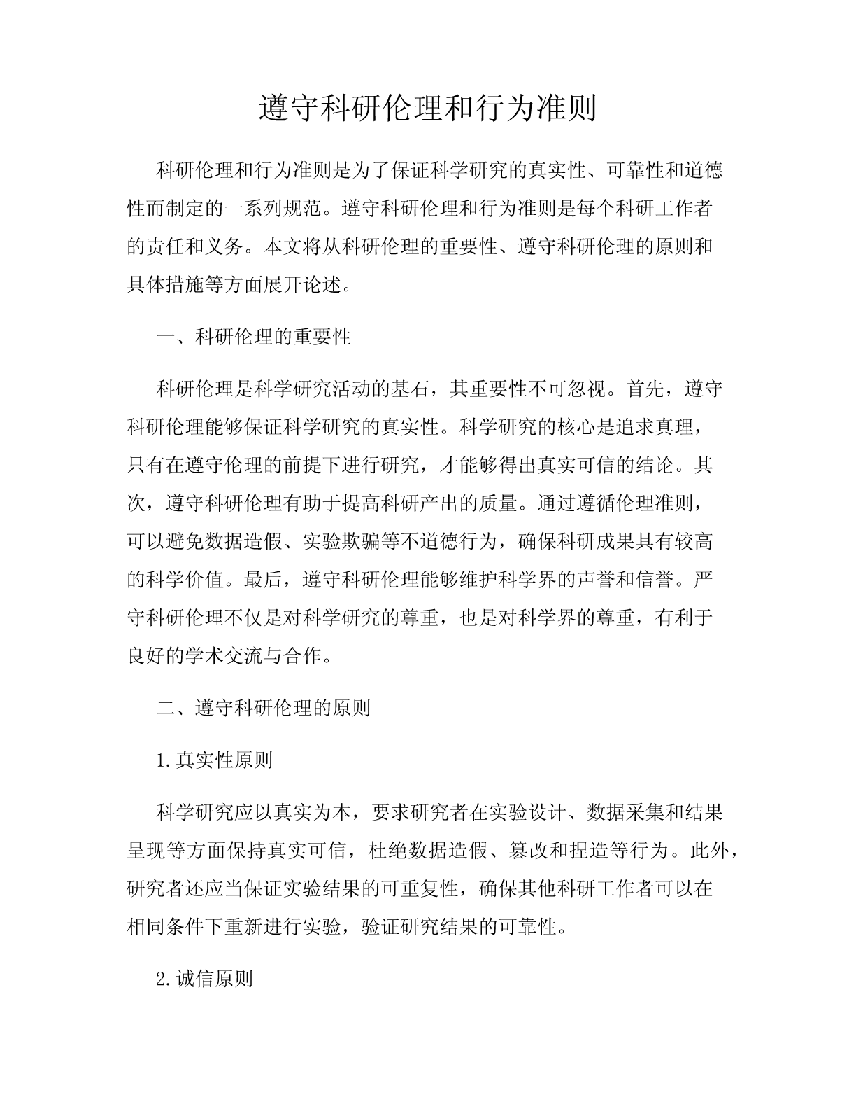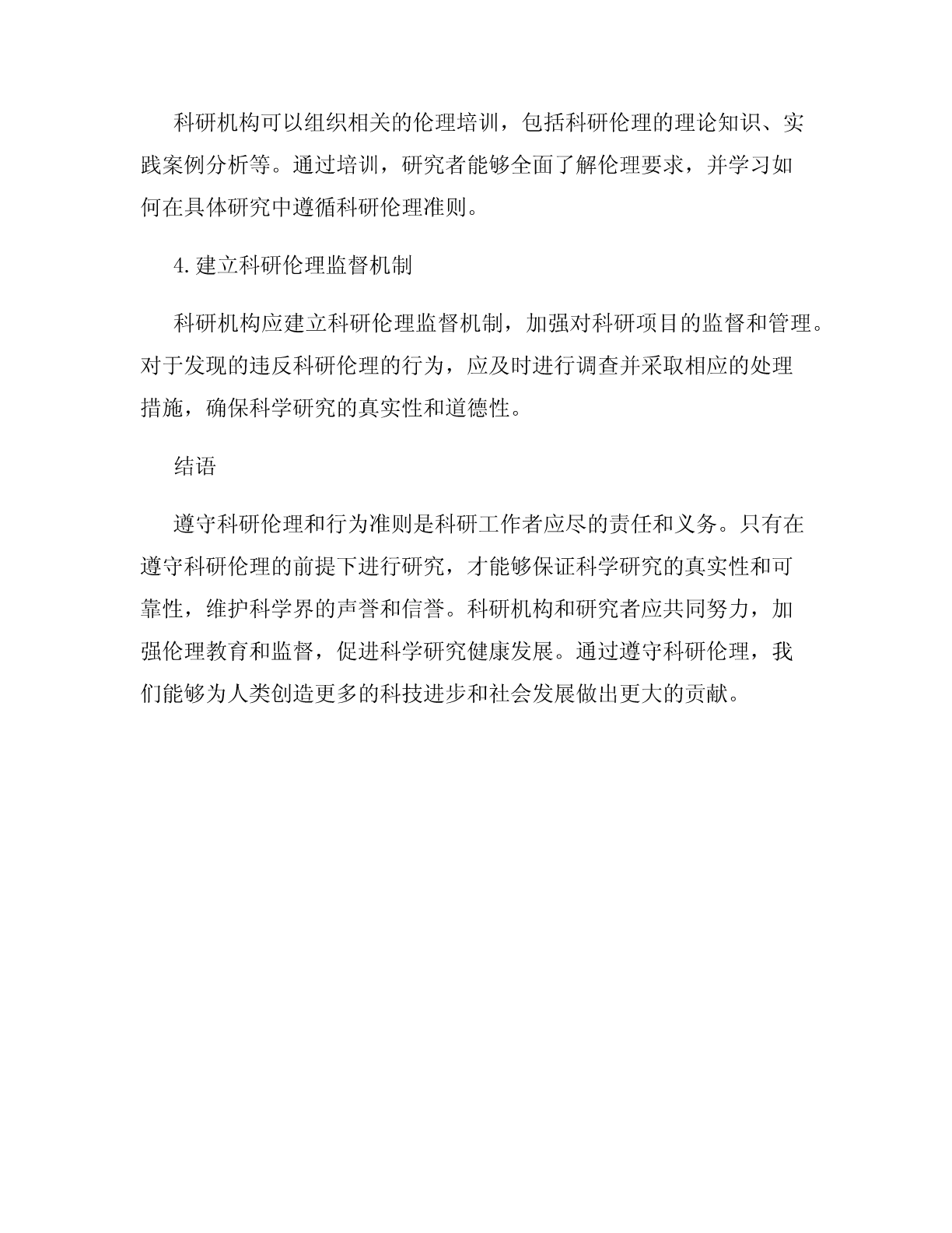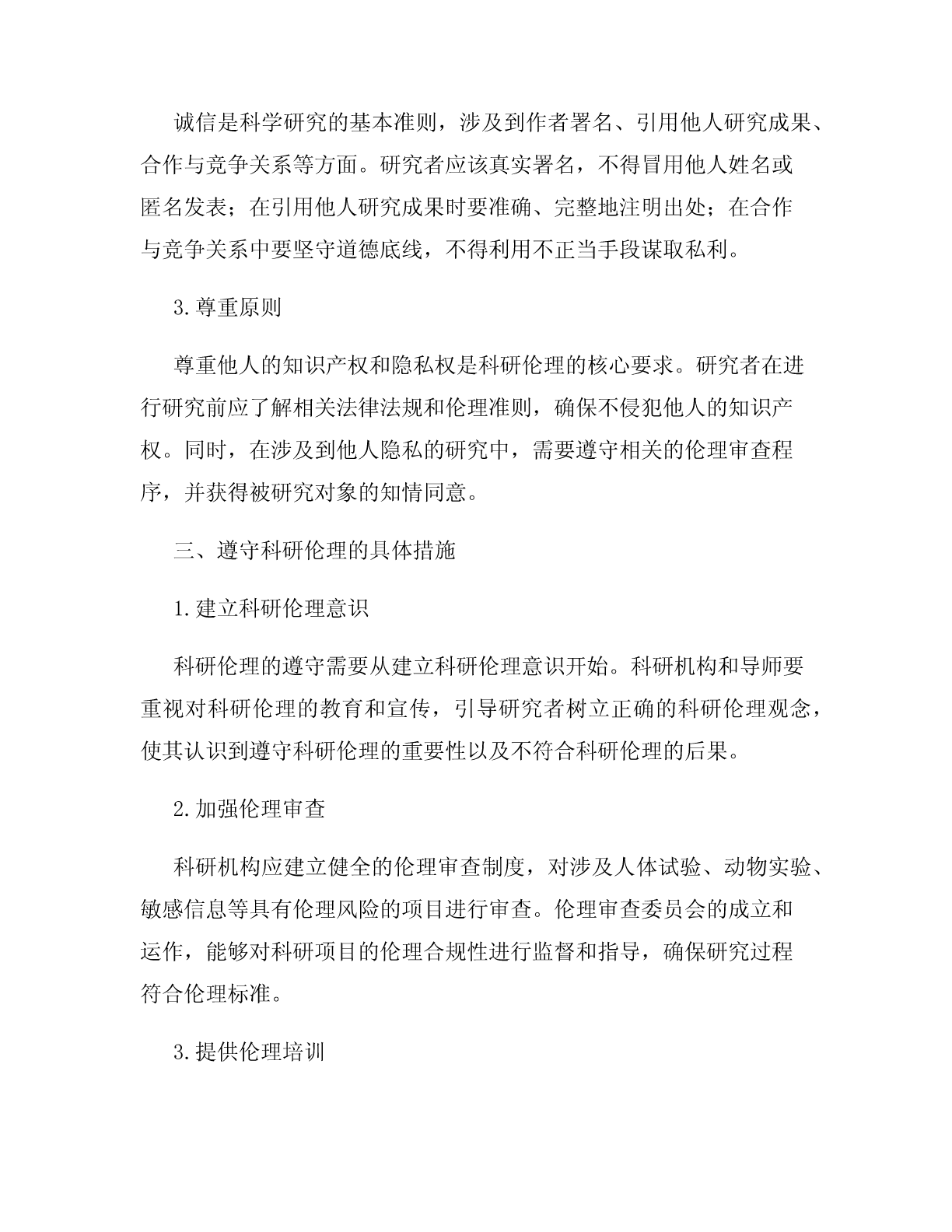 遵守科研伦理和行为准则科研伦理和行为准则是为了保证科学研究的真实性、可靠性和道德性而制定的一系列规范。遵守科研伦理和行为准则是每个科研工作者的责任和义务。本文将从科研伦理的重要性、遵守科研伦理的原则和具体措施等方面展开论述。一、科研伦理的重要性科研伦理是科学研究活动的基石,其重要性不可忽视。首先,遵守科研伦理能够保证科学研究的真实性。科学研究的核心是追求真理,只有在遵守伦理的前提下进行研究,才能够得出真实可信的结论。其次,遵守科研伦理有助于提高科研产出的质量。通过遵循伦理准则,可以避免数据造假、实验欺骗等不道德行为,确保科研成果具有较高的科学价值。最后,遵守科研伦理能够维护科学界的声誉和信誉。严守科研伦理不仅是对科学研究的尊重,也是对科学界的尊重,有利于良好的学术交流与合作。二、遵守科研伦理的原则1.真实性原则科学研究应以真实为本,要求研究者在实验设计、数据采集和结果呈现等方面保持真实可信,杜绝数据造假、篡改和捏造等行为。此外,研究者还应当保证实验结果的可重复性,确保其他科研工作者可以在相同条件下重新进行实验,验证研究结果的可靠性。2.诚信原则诚信是科学研究的基本准则,涉及到作者署名、引用他人研究成果、合作与竞争关系等方面。研究者应该真实署名,不得冒用他人姓名或匿名发表;在引用他人研究成果时要准确、完整地注明出处;在合作与竞争关系中要坚守道德底线,不得利用不正当手段谋取私利。3.尊重原则尊重他人的知识产权和隐私权是科研伦理的核心要求。研究者在进行研究前应了解相关法律法规和伦理准则,确保不侵犯他人的知识产权。同时,在涉及到他人隐私的研究中,需要遵守相关的伦理审查程序,并获得被研究对象的知情同意。三、遵守科研伦理的具体措施1.建立科研伦理意识科研伦理的遵守需要从建立科研伦理意识开始。科研机构和导师要重视对科研伦理的教育和宣传,引导研究者树立正确的科研伦理观念,使其认识到遵守科研伦理的重要性以及不符合科研伦理的后果。2.加强伦理审查科研机构应建立健全的伦理审查制度,对涉及人体试验、动物实验、敏感信息等具有伦理风险的项目进行审查。伦理审查委员会的成立和运作,能够对科研项目的伦理合规性进行监督和指导,确保研究过程符合伦理标准。3.提供伦理培训科研机构可以组织相关的伦理培训,包括科研伦理的理论知识、实践案例分析等。通过培训,研究者能够全面了解伦理要求,并学习如何在具体研究中遵循科研伦理准则。4.建立科研伦理监督机制科研机构应建立科研伦理监督机制,加强对科研项目的监督和管理。对于发现的违反科研伦理的行为,应及时进行调查并采取相应的处理措施,确保科学研究的真实性和道德性。结语遵守科研伦理和行为准则是科研工作者应尽的责任和义务。只有在遵守科研伦理的前提下进行研究,才能够保证科学研究的真实性和可靠性,维护科学界的声誉和信誉。科研机构和研究者应共同努力,加强伦理教育和监督,促进科学研究健康发展。通过遵守科研伦理,我们能够为人类创造更多的科技进步和社会发展做出更大的贡献。