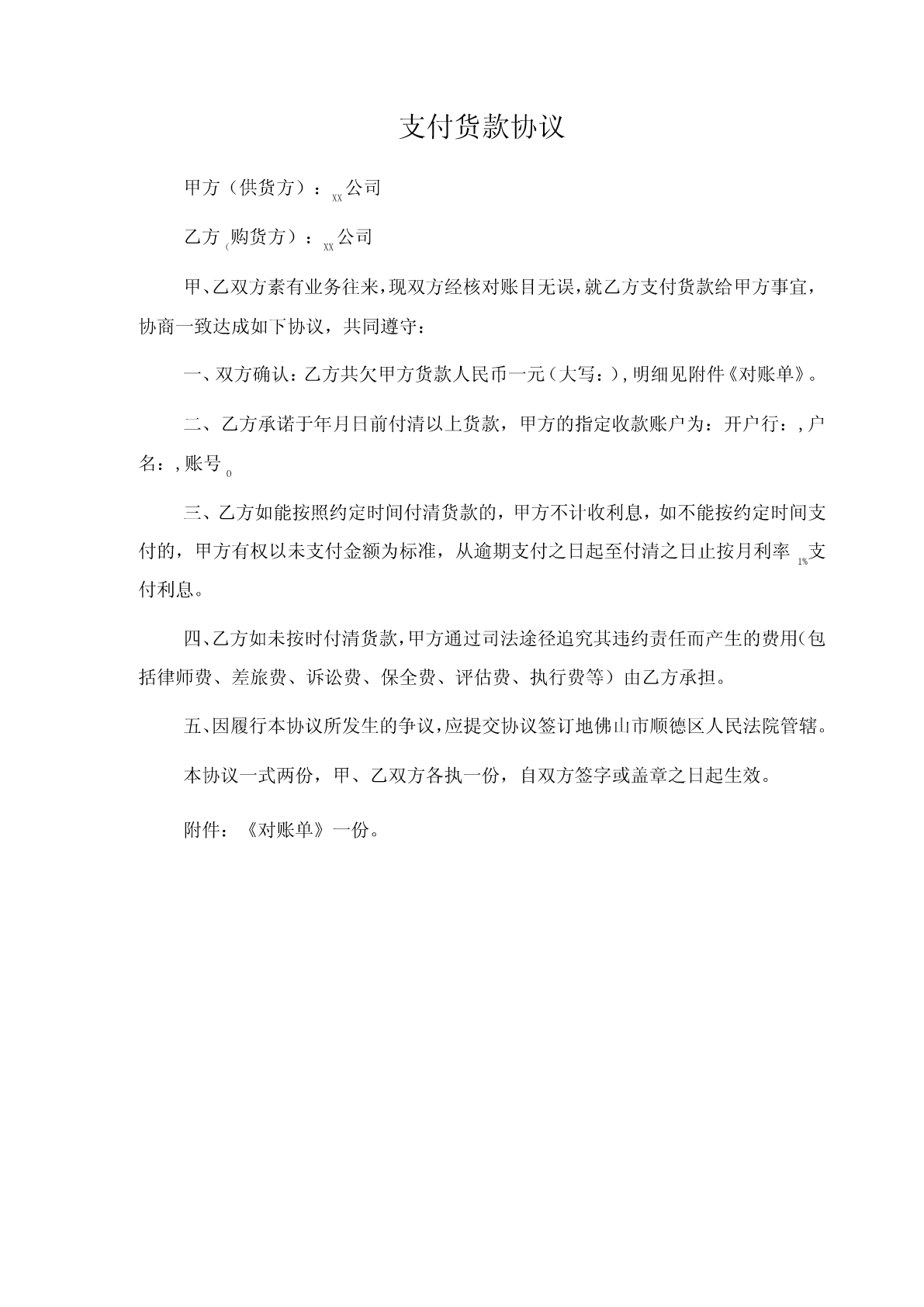 支付货款协议甲方(供货方):公司XX乙方购货方):公司(XX甲、乙双方素有业务往来,现双方经核对账目无误,就乙方支付货款给甲方事宜,协商一致达成如下协议,共同遵守:一、双方确认:乙方共欠甲方货款人民币一元(大写:),明细见附件《对账单》。二、乙方承诺于年月日前付清以上货款,甲方的指定收款账户为:开户行:,户名:,账号O三、乙方如能按照约定时间付清货款的,甲方不计收利息,如不能按约定时间支付的,甲方有权以未支付金额为标准,从逾期支付之日起至付清之日止按月利率支1%付利息。四、乙方如未按时付清货款,甲方通过司法途径追究其违约责任而产生的费用(包括律师费、差旅费、诉讼费、保全费、评估费、执行费等)由乙方承担。五、因履行本协议所发生的争议,应提交协议签订地佛山市顺德区人民法院管辖。本协议一式两份,甲、乙双方各执一份,自双方签字或盖章之日起生效。附件:《对账单》一份。