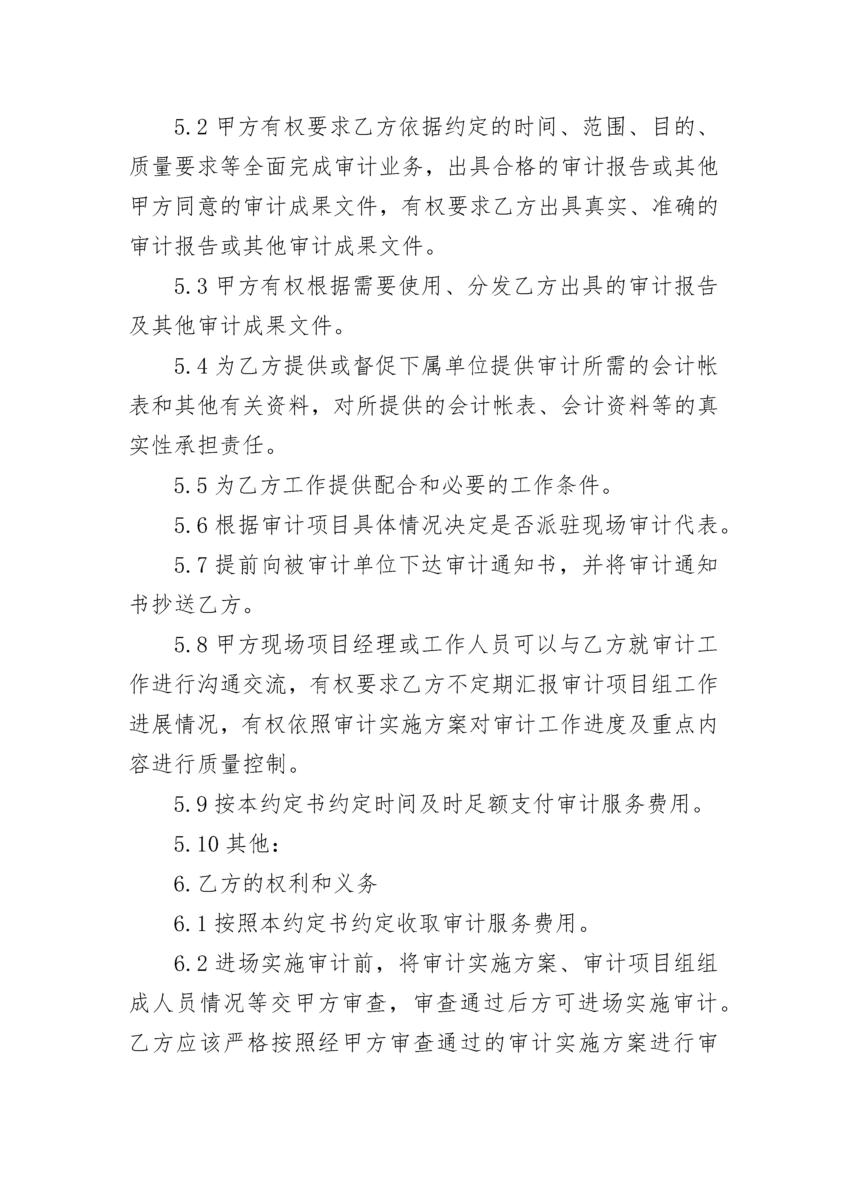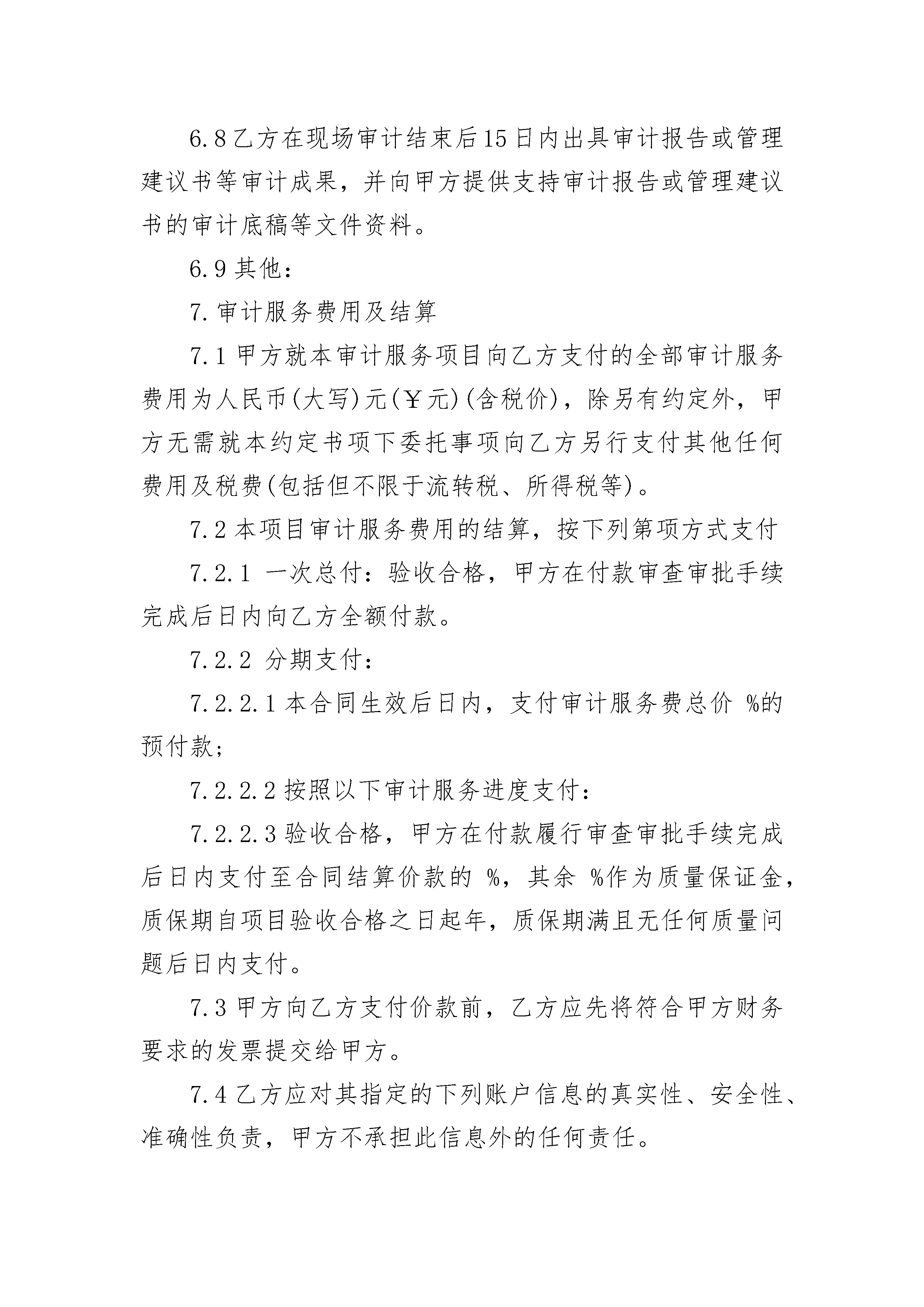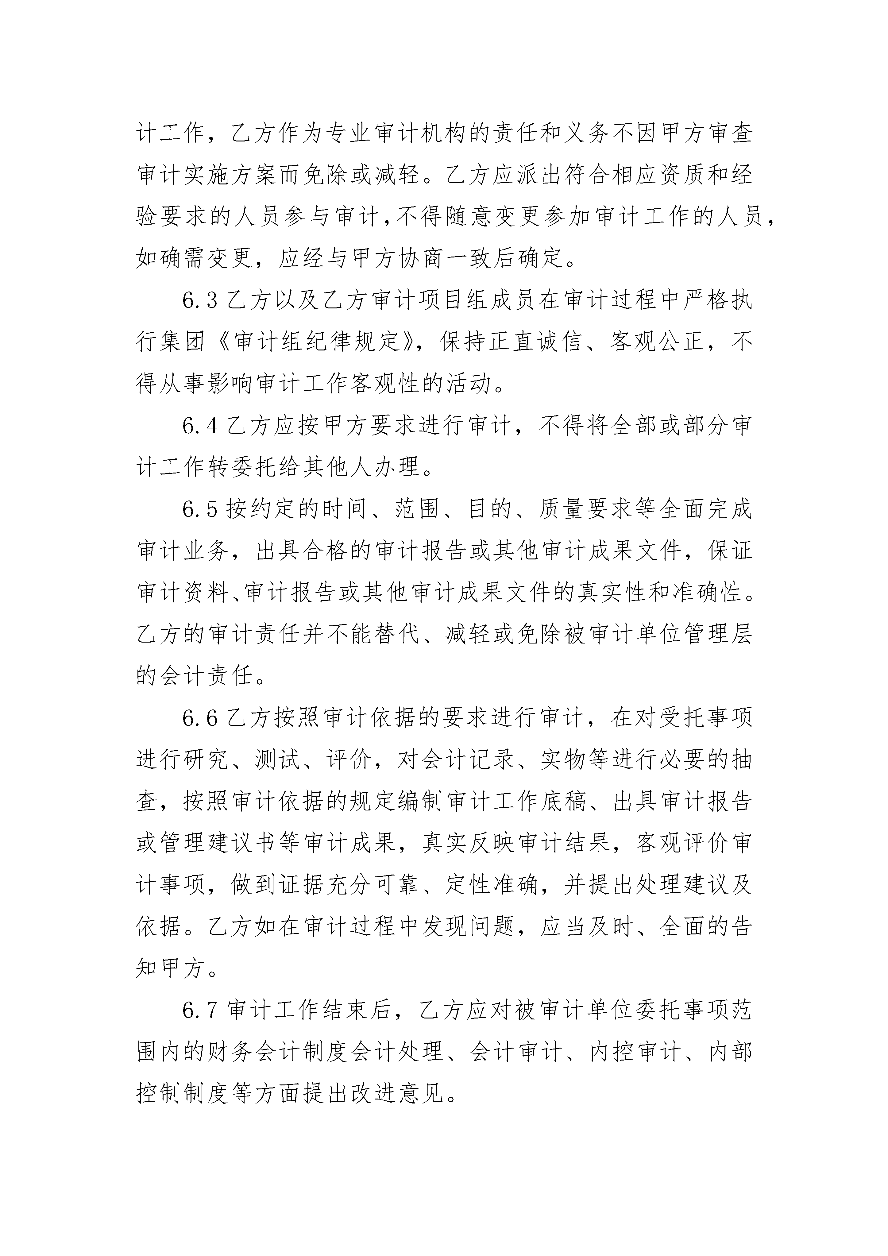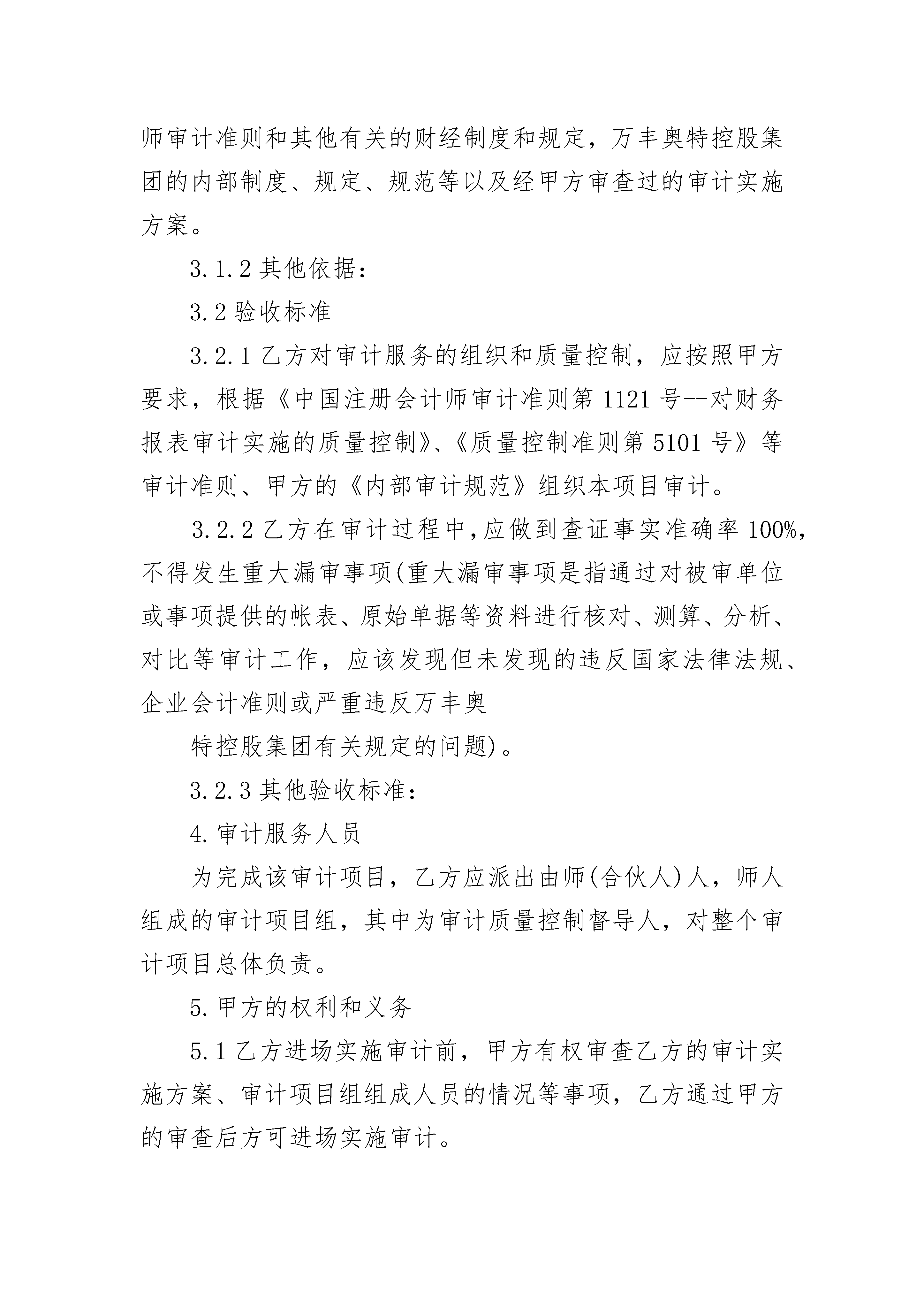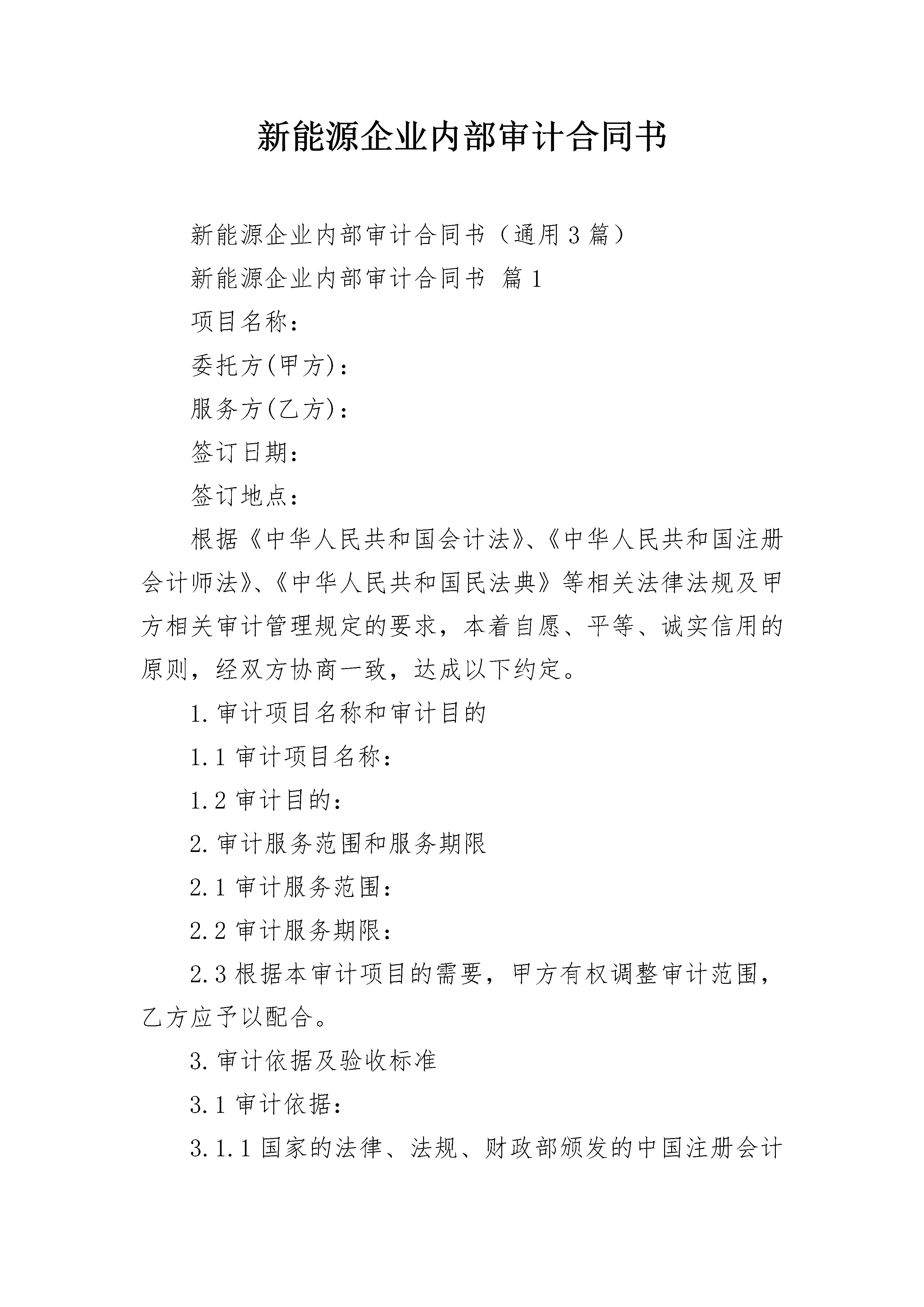 新能源企业内部审计合同书新能源企业内部审计合同书(通用3篇)新能源企业内部审计合同书篇1项目名称:委托方(甲方):服务方(乙方):签订日期:签订地点:根据《中华人民共和国会计法》、《中华人民共和国注册会计师法》、《中华人民共和国民法典》等相关法律法规及甲方相关审计管理规定的要求,本着自愿、平等、诚实信用的原则,经双方协商一致,达成以下约定。1.审计项目名称和审计目的1.1审计项目名称:1.2审计目的:2.审计服务范围和服务期限2.1审计服务范围:2.2审计服务期限:2.3根据本审计项目的需要,甲方有权调整审计范围,乙方应予以配合。3.审计依据及验收标准3.1审计依据:3.1.1国家的法律、法规、财政部颁发的中国注册会计师审计准则和其他有关的财经制度和规定,万丰奥特控股集团的内部制度、规定、规范等以及经甲方审查过的审计实施方案。3.1.2其他依据:3.2验收标准3.2.1乙方对审计服务的组织和质量控制,应按照甲方要求,根据《中国注册会计师审计准则第1121号--对财务报表审计实施的质量控制》、《质量控制准则第5101号》等审计准则、甲方的《内部审计规范》组织本项目审计。3.2.2乙方在审计过程中,应做到查证事实准确率100%,不得发生重大漏审事项(重大漏审事项是指通过对被审单位或事项提供的帐表、原始单据等资料进行核对、测算、分析、对比等审计工作,应该发现但未发现的违反国家法律法规、企业会计准则或严重违反万丰奥特控股集团有关规定的问题)。3.2.3其他验收标准:4.审计服务人员为完成该审计项目,乙方应派出由师(合伙人)人,师人组成的审计项目组,其中为审计质量控制督导人,对整个审计项目总体负责。5.甲方的权利和义务5.1乙方进场实施审计前,甲方有权审查乙方的审计实施方案、审计项目组组成人员的情况等事项,乙方通过甲方的审查后方可进场实施审计。5.2甲方有权要求乙方依据约定的时间、范围、目的、质量要求等全面完成审计业务,出具合格的审计报告或其他甲方同意的审计成果文件,有权要求乙方出具真实、准确的审计报告或其他审计成果文件。5.3甲方有权根据需要使用、分发乙方出具的审计报告及其他审计成果文件。5.4为乙方提供或督促下属单位提供审计所需的会计帐表和其他有关资料,对所提供的会计帐表、会计资料等的真实性承担责任。5.5为乙方工作提供配合和必要的工作条件。5.6根据审计项目具体情况决定是否派驻现场审计代表。5.7提前向被审计单位下达审计通知书,并将审计通知书抄送乙方。5.8甲方现场项目经理或工作人员可以与乙方就审计工作进行沟通交流,有权要求乙方不定期汇报审计项目组工作进展情况,有权依照审计实施方案对审计工作进度及重点内容进行质量控制。5.9按本约定书约定时间及时足额支付审计服务费用。5.10其他:6.乙方的权利和义务6.1按照本约定书约定收取审计服务费用。6.2进场实施审计前,将审计实施方案、审计项目组组成人员情况等交甲方审查,审查通过后方可进场实施审计。乙方应该严格按照经甲方审查通过的审计实施方案进行审计工作,乙方作为专业审计机构的责任和义务不因甲方审查审计实施方案而免除或减轻。乙方应派出符合相应资质和经验要求的人员参与审计,不得随意变更参加审计工作的人员,如确需变更,应经与甲方协商一致后确定。6.3乙方以及乙方审计项目组成员在审计过程中严格执行集团《审计组纪律规定》,保持正直诚信、客观公正,不得从事影响审计工作客观性的活动。6.4乙方应按甲方要求进行审计,不得将全部或部分审计工作转委托给其他人办理。6.5按约定的时间、范围、目的、质量要求等全面完成审计业务,出具合格的审计报告或其他审计成果文件,保证审计资料、审计报告或其他审计成果文件的真实性和准确性。乙方的审计责任并不能替代、减轻或免除被审计单位管理层的会计责任。6.6乙方按照审计依据的要求进行审计,在对受托事项进行研究、测试、评价,对会计记录、实物等进行必要的抽查,按照审计依据的规定编制审计工作底稿、出具审计报告或管理建议书等审计成果,真实反映审计结果,客观评价审计事项,做到证据充分可靠、定性准确,并提出处理建议及依据。乙方如在审计过程中发现问题,应当及时、全面的告知甲方。6.7审计工作结束后,乙方应对被审计单位委托事项范围内的财务会计制度会计处理、会计审计、内控审计、内部控制制度等方面提出改进意见。6.8乙方在现场审计结束后15日内出具审计报告或管理建议书等审计成果,并向甲方提供支持审计报告或管理建议书的审计底稿等文件资料。6.9其他:7.审计服务费用及结算7.1甲方就本审计服务项目向乙方支付的全部审计服务费用为人民币(大写)元(¥元)(含税价),除另有约定外,甲方无需就本约定书项下委托事项向乙方另行支付其他任何费用及税费(包括但不限于流转税、所得税等)。7.2本项目审计服务费用的结