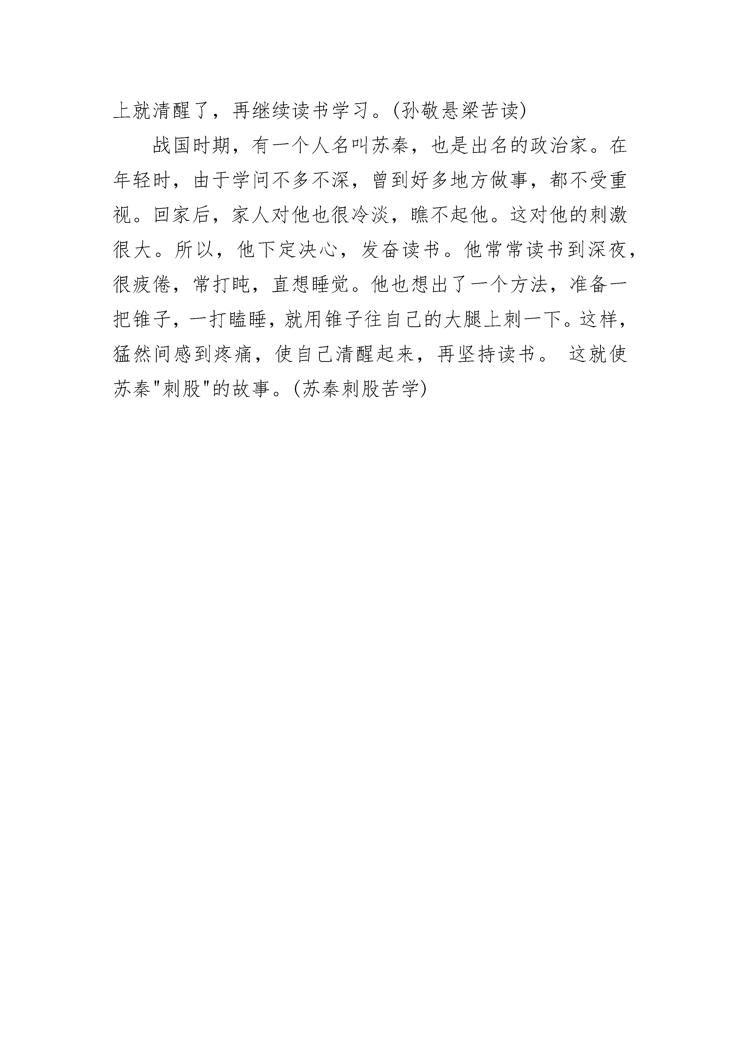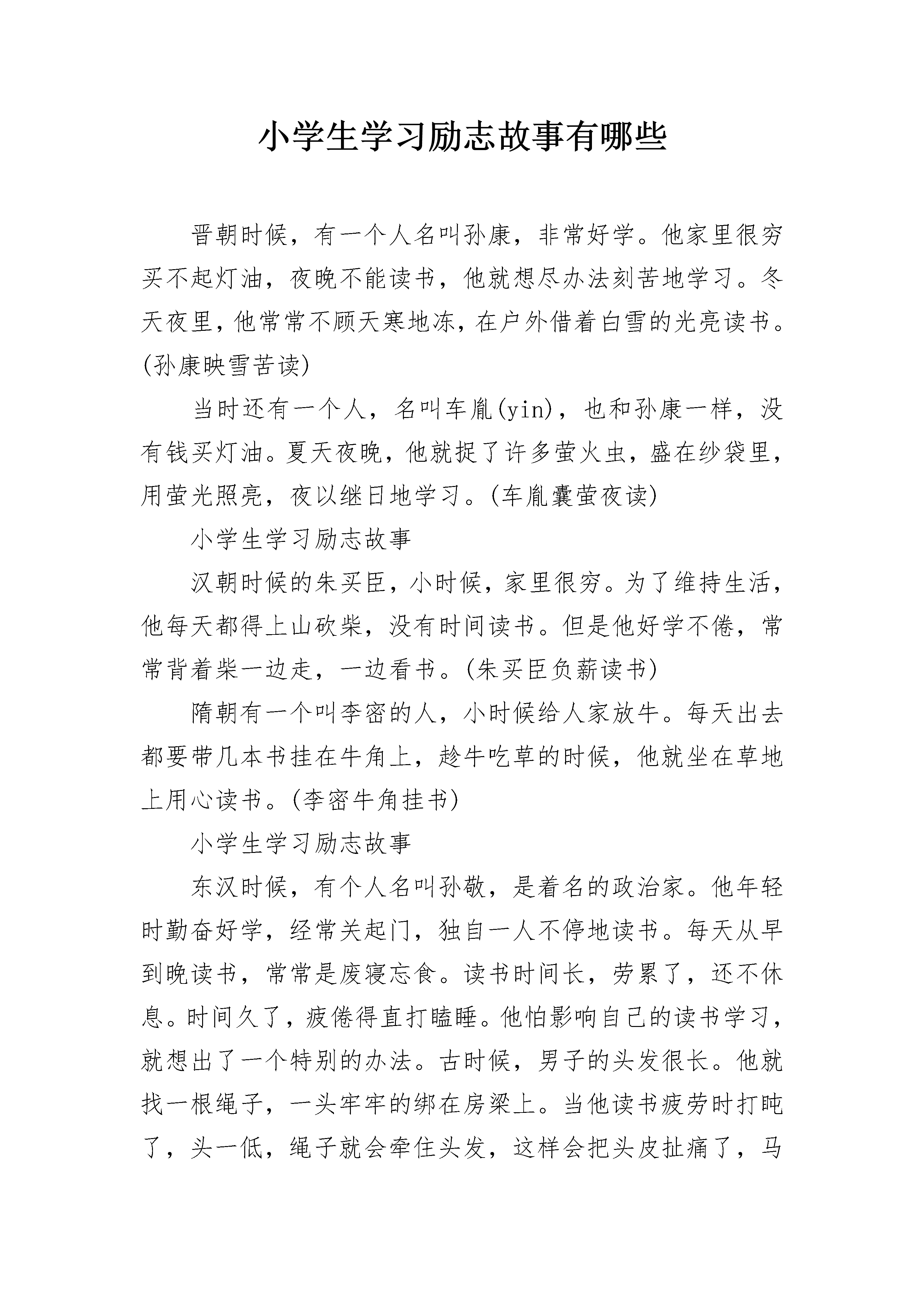 小学生学习励志故事有哪些晋朝时候,有一个人名叫孙康,非常好学。他家里很穷买不起灯油,夜晚不能读书,他就想尽办法刻苦地学习。冬天夜里,他常常不顾天寒地冻,在户外借着白雪的光亮读书。(孙康映雪苦读)当时还有一个人,名叫车胤(yin),也和孙康一样,没有钱买灯油。夏天夜晚,他就捉了许多萤火虫,盛在纱袋里,用萤光照亮,夜以继日地学习。(车胤囊萤夜读)小学生学习励志故事汉朝时候的朱买臣,小时候,家里很穷。为了维持生活,他每天都得上山砍柴,没有时间读书。但是他好学不倦,常常背着柴一边走,一边看书。(朱买臣负薪读书)隋朝有一个叫李密的人,小时候给人家放牛。每天出去都要带几本书挂在牛角上,趁牛吃草的时候,他就坐在草地上用心读书。(李密牛角挂书)小学生学习励志故事东汉时候,有个人名叫孙敬,是着名的政治家。他年轻时勤奋好学,经常关起门,独自一人不停地读书。每天从早到晚读书,常常是废寝忘食。读书时间长,劳累了,还不休息。时间久了,疲倦得直打瞌睡。他怕影响自己的读书学习,就想出了一个特别的办法。古时候,男子的头发很长。他就找一根绳子,一头牢牢的绑在房梁上。当他读书疲劳时打盹了,头一低,绳子就会牵住头发,这样会把头皮扯痛了,马上就清醒了,再继续读书学习。(孙敬悬梁苦读)战国时期,有一个人名叫苏秦,也是出名的政治家。在年轻时,由于学问不多不深,曾到好多地方做事,都不受重视。回家后,家人对他也很冷淡,瞧不起他。这对他的刺激很大。所以,他下定决心,发奋读书。他常常读书到深夜,很疲倦,常打盹,直想睡觉。他也想出了一个方法,准备一把锥子,一打瞌睡,就用锥子往自己的大腿上刺一下。这样,猛然间感到疼痛,使自己清醒起来,再坚持读书。这就使苏秦"刺股"的故事。(苏秦刺股苦学)