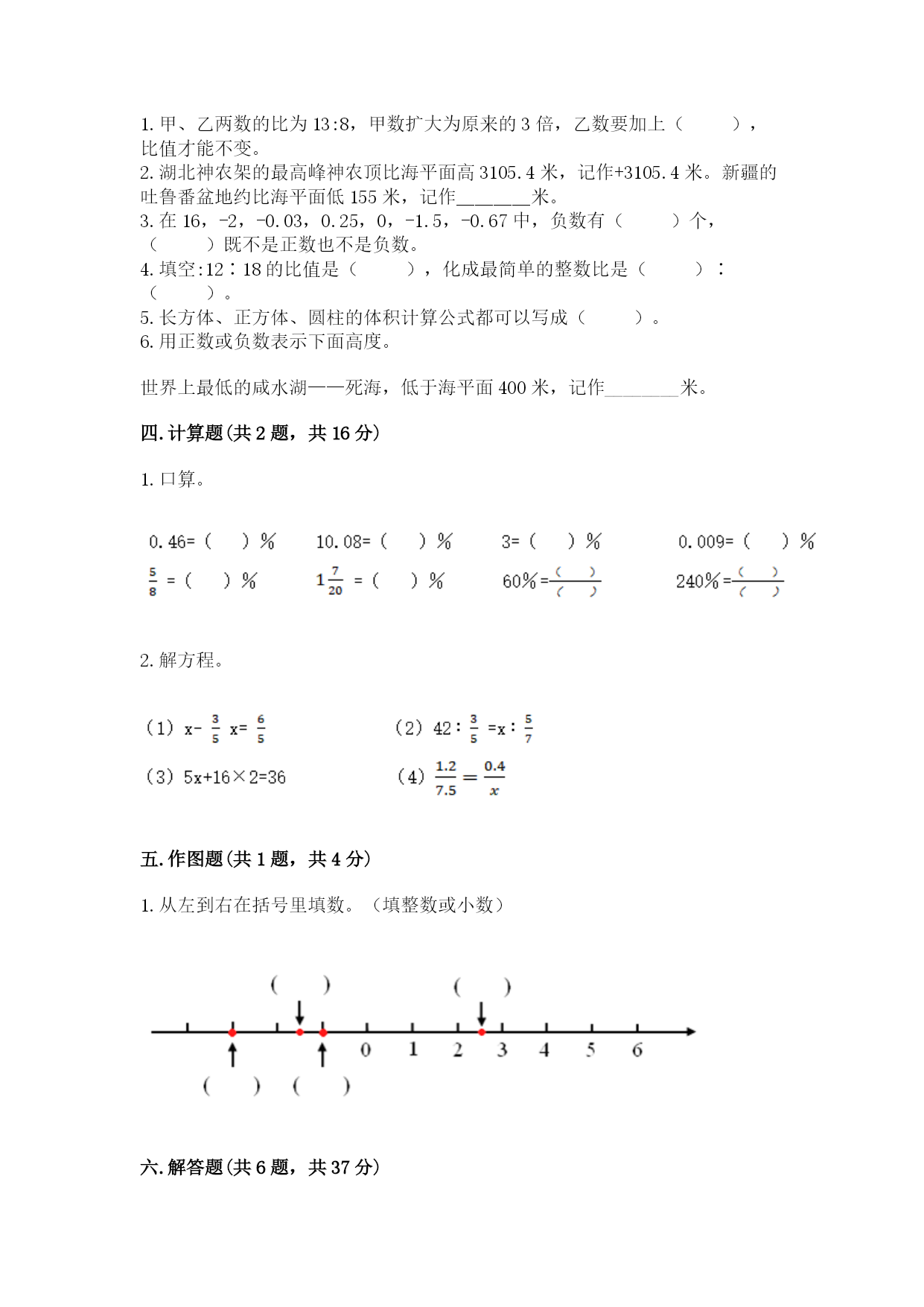青岛版六年级下册数学期末测试卷一.选择题(共6题,共12分)1.如果存入3000元在存折上记作+3000元,那么取出500元应在存折上记作()元。A.500B.﹣500C.﹣30002.某商场将一种商品按标价的九折售出,仍可获利10%。若此商品的标价为33元,那么该商品的进价为()。A.27元B.29元C.30.2元3.一个高12厘米的圆锥形容器,盛满水后倒入和它等底、高是8厘米的圆柱形容器里,该圆柱水面的高是()厘米。A.3B.12C.44.关于“0”的说法正确的是()。A.0是正数B.0是负数C.0既不是正数,也不是负数5.从圆柱的正面看,看到的轮廓是一个正方形,说明圆柱的()相等。A.底半径和高B.底面直径和高C.底周长和高6.2020年,小军的爸爸每月工资6000元,按规定收入超过5000元的部分按3%的税率缴纳个人所得税,小军的爸爸每月应缴纳个人所得税的算式为()。A.6000×3%B.5000×3%C.(6000-5000)×3%二.判断题(共6题,共12分)1.定价100元的商品,先提价20%,再降价20%,还是原价。()2.长方形的周长一定时,长和宽成反比例。()3.出盐率一定,出盐的重量和海水的重量成正比例。()4.一个圆锥的侧面展开图是一个三角形。()5.我们学过的数,都能用直线上的点表示出来。()6.不带负号的数一定是正数。()三.填空题(共6题,共11分)1.甲、乙两数的比为13:8,甲数扩大为原来的3倍,乙数要加上(),比值才能不变。2.湖北神农架的最高峰神农顶比海平面高3105.4米,记作+3105.4米。新疆的吐鲁番盆地约比海平面低155米,记作________米。3.在16,-2,-0.03,0.25,0,-1.5,-0.67中,负数有()个,()既不是正数也不是负数。4.填空:12∶18的比值是(),化成最简单的整数比是()∶()。5.长方体、正方体、圆柱的体积计算公式都可以写成()。6.用正数或负数表示下面高度。世界上最低的咸水湖——死海,低于海平面400米,记作________米。四.计算题(共2题,共16分)1.口算。2.解方程。五.作图题(共1题,共4分)1.从左到右在括号里填数。(填整数或小数)六.解答题(共6题,共37分)1.某商场冰箱五月份销售量是80台,后来举行了促销活动,六月份的销售量是110台。六月份比五月份增长了百分之几?2.某产品的包装袋上标明重量是100±3克,实际测量时,测得产品的实际重量是104克,那么这件产品合格吗?为什么?3.一个圆锥形的煤堆,底面直径是8米,高1.4米,如果每立方米煤重2500千克,这堆煤共有多少千克?4.王林参加射击比赛,打了20组子弹,每组10发。有10发子弹没有打中目标,请你算一算,王林射击的命中率是多少?5.一只股票7月份比6月份上涨了15%,8月份又比7月份下降了15%。请问这只股票8月份的股份和6月份比是上涨了还是下降了?变化幅度是多少?6.下表是部分城市同一天的气温情况。(1)哪个城市的气温最高?哪个城市的气温最低?(2)把各个城市的最低气温从低到高排列出来。(3)把各个城市的最高温从高到低排列出来。参考答案一.选择题1.B2.A3.C4.C5.B6.C二.判断题1.×2.×3.√4.×5.√6.×三.填空题1.162.-1553.4;04.;2;35.V=Sh6.-400四.计算题1.46;1008;300;0.9;62.5;1.35;;2.(1)3(2)50(3)(4)2.5五.作图题1.解:这些数字如下:-3,-1.5,-1,+2.5六.解答题1.(110-80)÷80=30÷80=0.375=37.5%答:六月份比五月份增长了37.5%。2.不合格,超重。3.煤堆的半径为:8÷2=4(米),煤堆的体积:×3.14×42×1.4=×3.14×16×1.4≈23.45(立方米)煤堆的重量:23.45×2500=58625(千克)答:这堆煤共有58625千克。4.(20×10-10)÷(20×10)×100%=190÷200×100%=95%答:王林射击的命中率是95%。5.解:假设6月份股价为“1”。7月份:1×(1+15%)=1.158月份:1.15×(1-15%)=0.97758月份和6月份相比下降了,变化幅度是下降了1-0.9775=0.0225,即下降了2.25%。6.(1)解:22℃>12℃>5℃>3℃>0℃>-3℃,13℃>0℃>-1℃>-5℃>-15℃>-20℃答:广州的气温最高.拉萨的气温最低。(2)解:-20℃<-15℃<-5℃<-1℃<0℃<13℃(3)解:22℃>12℃>5℃>3℃>0℃>-3℃
