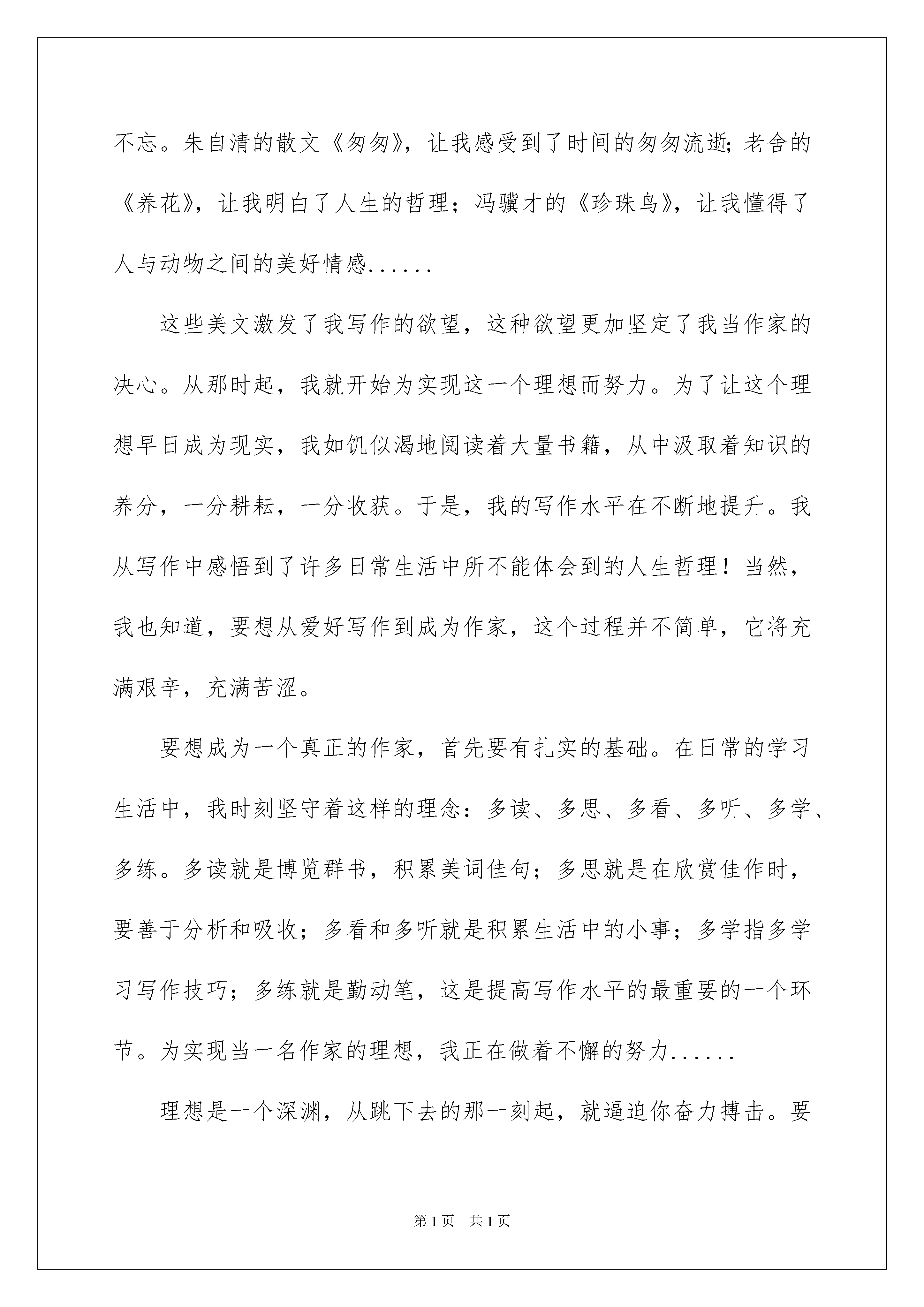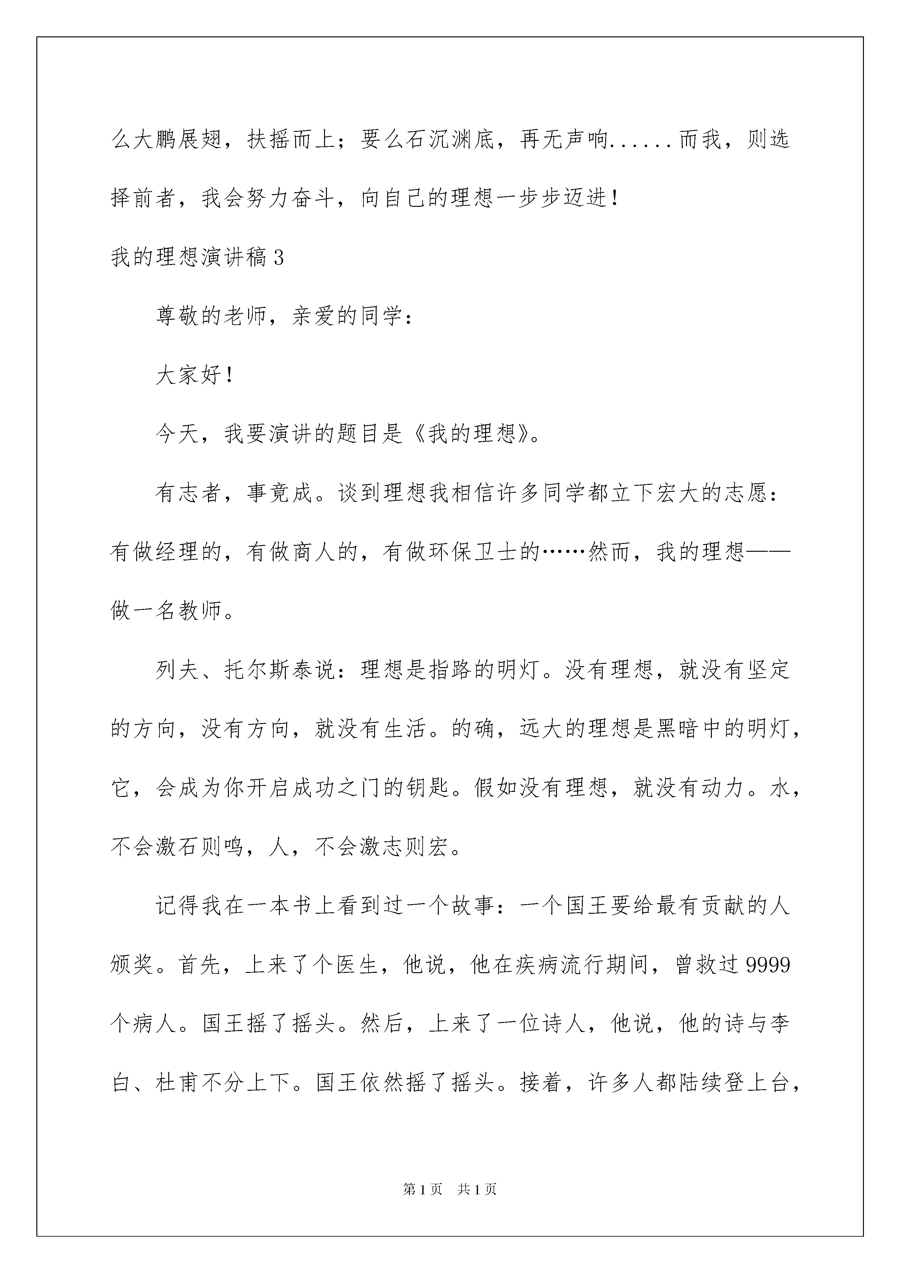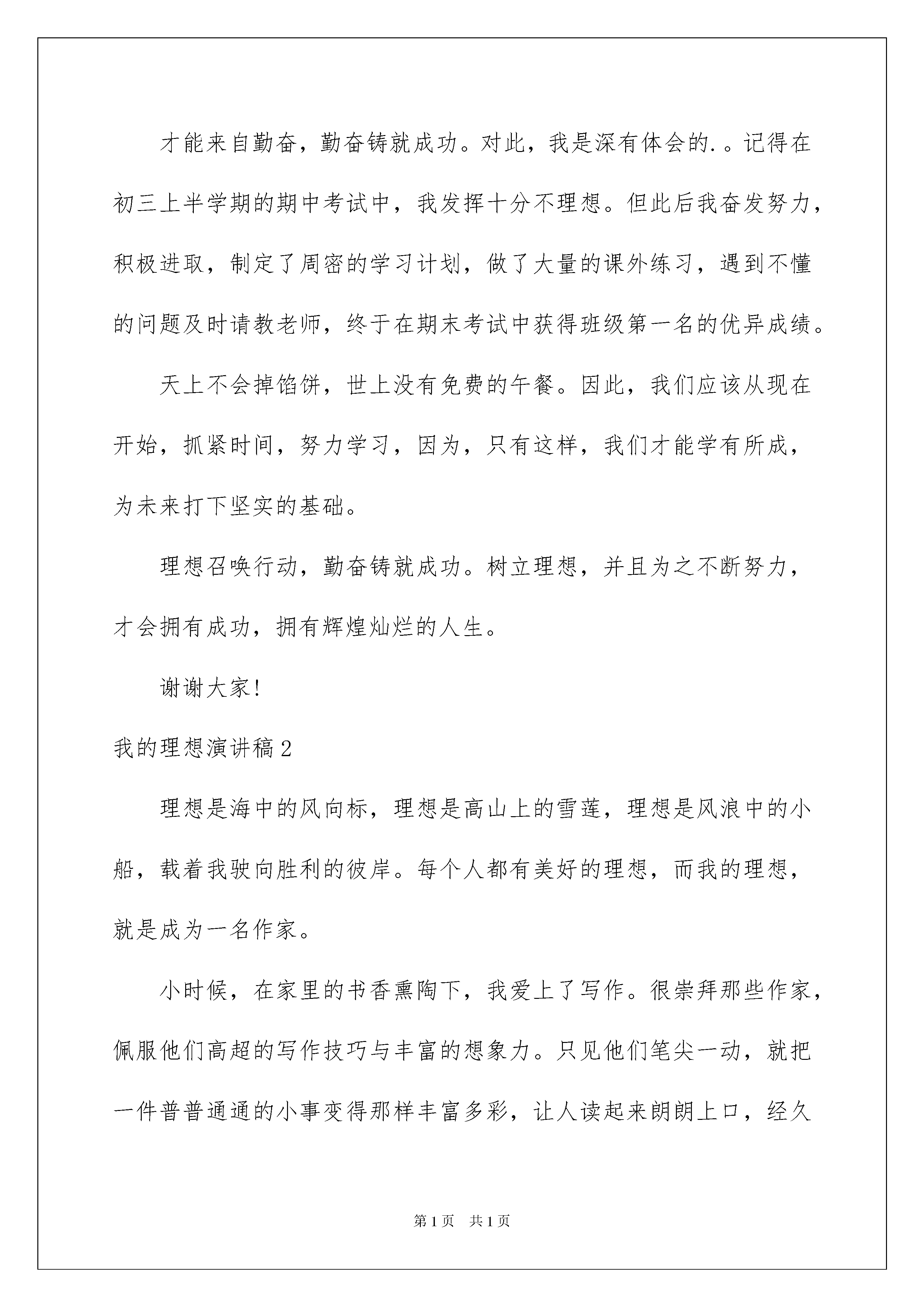 2022我的理想演讲稿(集锦15篇)我的理想演讲稿(集锦15篇)演讲稿以发表意见,表达观点为主,是为演讲而事先准备好的文稿。在充满活力,日益开放的今天,演讲稿使用的情况越来越多,相信很多朋友都对写演讲稿感到非常苦恼吧,以下是我整理的我的理想演讲稿,欢迎阅读与收藏。我的理想演讲稿1各位老师,各位同学:大家好!很高兴能与大家相聚在国旗下。理想是什么?理想是石,敲出星星之火;理想是火,点燃熄灭的灯;理想是灯,照亮夜行的路;理想是路,引你走到黎明。是理想,召唤着你,让你不断进取,不断奋斗,不断前进;是理想,指引着你,让你获取成功,走向辉煌。有了理想,你就有了前进的方向;有了理想,你就有了前进的动力。记得曾经读到过这么一篇文章:1岁时,他的梦想是成为歌手;2岁时,他的梦想是唱响全美;3岁时,他的梦想是成为全能的音乐家;4岁时,他的梦想是成为的音乐大师。他就是西方近代音乐之父——昆西,琼斯。是理想,召唤着他,鞭策着他,让他不断努力,不断进取,从一个无名小卒逐步成长起来,最后功成名就,成为大师。由此可见,理想能够召唤行动,让人成功。因此,作为祖国未来的接班人的我们,是不是从现在起就应该树立自己的理想呢?好的开始是成功的一半,树立了理想,你就已经迈进了成功的第一步。然而,光有理想是不够的,更重要的是要勤奋努力。因为,勤奋铸就成功。“天才是百分之一的灵感,加百分之九十九的汗水。”“罗马并非一日造成,成功并非一蹴而就。”不错,要实现自己的理想,就必须付出自己辛勤的汗水。因为“春华秋实”,只有努力,才能收获。在学术上,凡古今中外,无一例外。爱因斯坦花了整整七年的时间,建立起了相对论的理论基础,而爱迪生为了寻找做电灯灯丝的材料,通宵达旦地工作,摘录了4万多页资料,试验过16多种矿物和6多种植物,最后使电灯发出耀眼的光芒。而伟大的药物学家李时珍更是花了27年时间,才编成1多万字的巨著《本草纲目》。才能来自勤奋,勤奋铸就成功。对此,我是深有体会的.。记得在初三上半学期的期中考试中,我发挥十分不理想。但此后我奋发努力,积极进取,制定了周密的学习计划,做了大量的课外练习,遇到不懂的问题及时请教老师,终于在期末考试中获得班级第一名的优异成绩。天上不会掉馅饼,世上没有免费的午餐。因此,我们应该从现在开始,抓紧时间,努力学习,因为,只有这样,我们才能学有所成,为未来打下坚实的基础。理想召唤行动,勤奋铸就成功。树立理想,并且为之不断努力,才会拥有成功,拥有辉煌灿烂的人生。谢谢大家!我的理想演讲稿2理想是海中的风向标,理想是高山上的雪莲,理想是风浪中的小船,载着我驶向胜利的彼岸。每个人都有美好的理想,而我的理想,就是成为一名作家。小时候,在家里的书香熏陶下,我爱上了写作。很崇拜那些作家,佩服他们高超的写作技巧与丰富的想象力。只见他们笔尖一动,就把一件普普通通的小事变得那样丰富多彩,让人读起来朗朗上口,经久不忘。朱自清的散文《匆匆》,让我感受到了时间的匆匆流逝;老舍的《养花》,让我明白了人生的哲理;冯骥才的《珍珠鸟》,让我懂得了人与动物之间的美好情感......这些美文激发了我写作的欲望,这种欲望更加坚定了我当作家的决心。从那时起,我就开始为实现这一个理想而努力。为了让这个理想早日成为现实,我如饥似渴地阅读着大量书籍,从中汲取着知识的养分,一分耕耘,一分收获。于是,我的写作水平在不断地提升。我从写作中感悟到了许多日常生活中所不能体会到的人生哲理!当然,我也知道,要想从爱好写作到成为作家,这个过程并不简单,它将充满艰辛,充满苦涩。要想成为一个真正的作家,首先要有扎实的基础。在日常的学习生活中,我时刻坚守着这样的理念:多读、多思、多看、多听、多学、多练。多读就是博览群书,积累美词佳句;多思就是在欣赏佳作时,要善于分析和吸收;多看和多听就是积累生活中的小事;多学指多学习写作技巧;多练就是勤动笔,这是提高写作水平的最重要的一个环节。为实现当一名作家的理想,我正在做着不懈的努力......理想是一个深渊,从跳下去的那一刻起,就逼迫你奋力搏击。要么大鹏展翅,扶摇而上;要么石沉渊底,再无声响......而我,则选择前者,我会努力奋斗,向自己的理想一步步迈进!我的理想演讲稿3尊敬的老师,亲爱的同学:大家好!今天,我要演讲的题目是《我的理想》。有志者,事竟成。谈到理想我相信许多同学都立下宏大的志愿:有做经理的,有做商人的,有做环保卫士的……然而,我的理想——做一名教师。列夫、托尔斯泰说:理想是指路的明灯。没有理想,就没有坚定的方向,没有方向,就没有生活。的确,远大的理想是黑暗中的明灯,它,会成为你开启成功之门的钥匙。假如没有理想,就