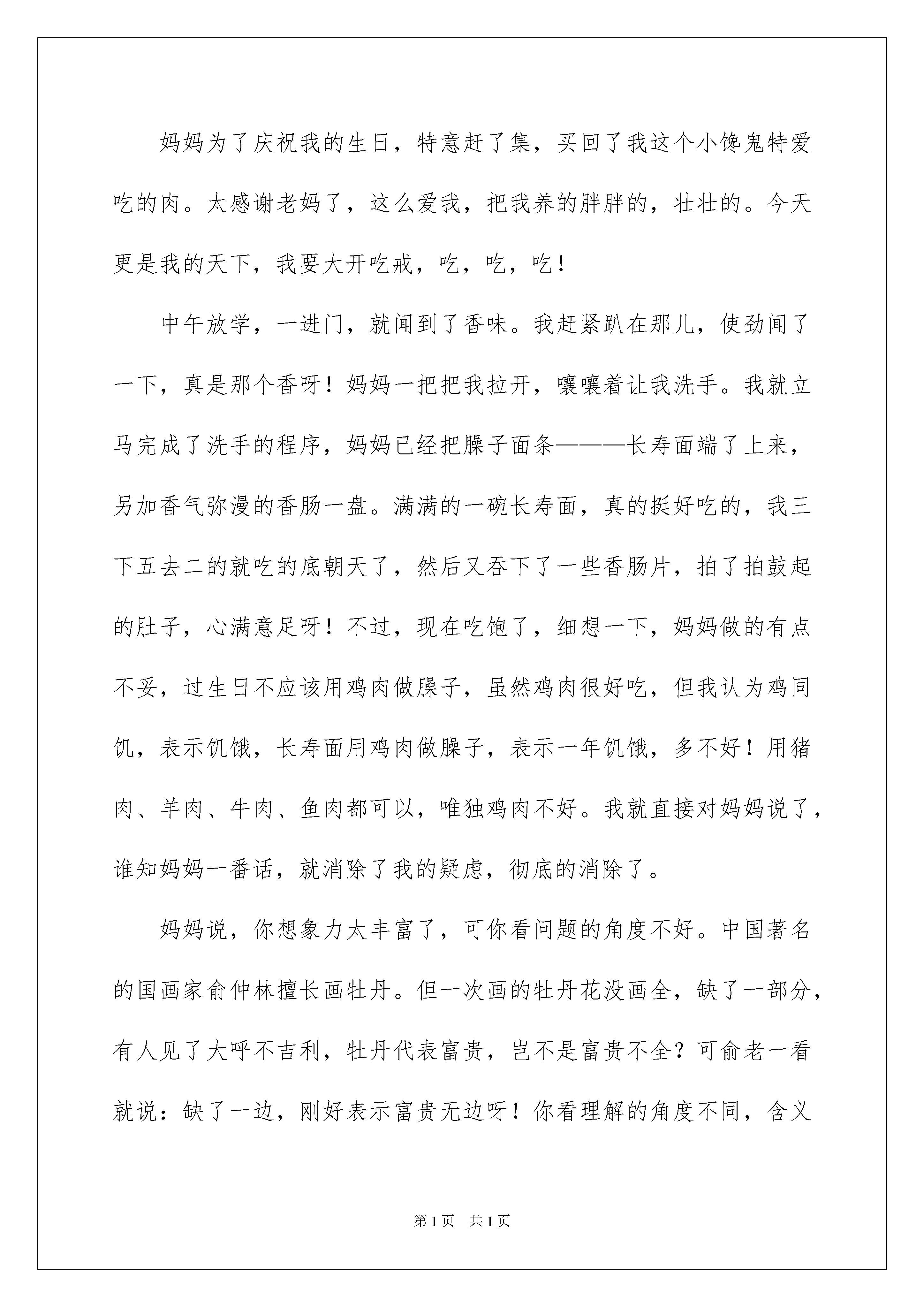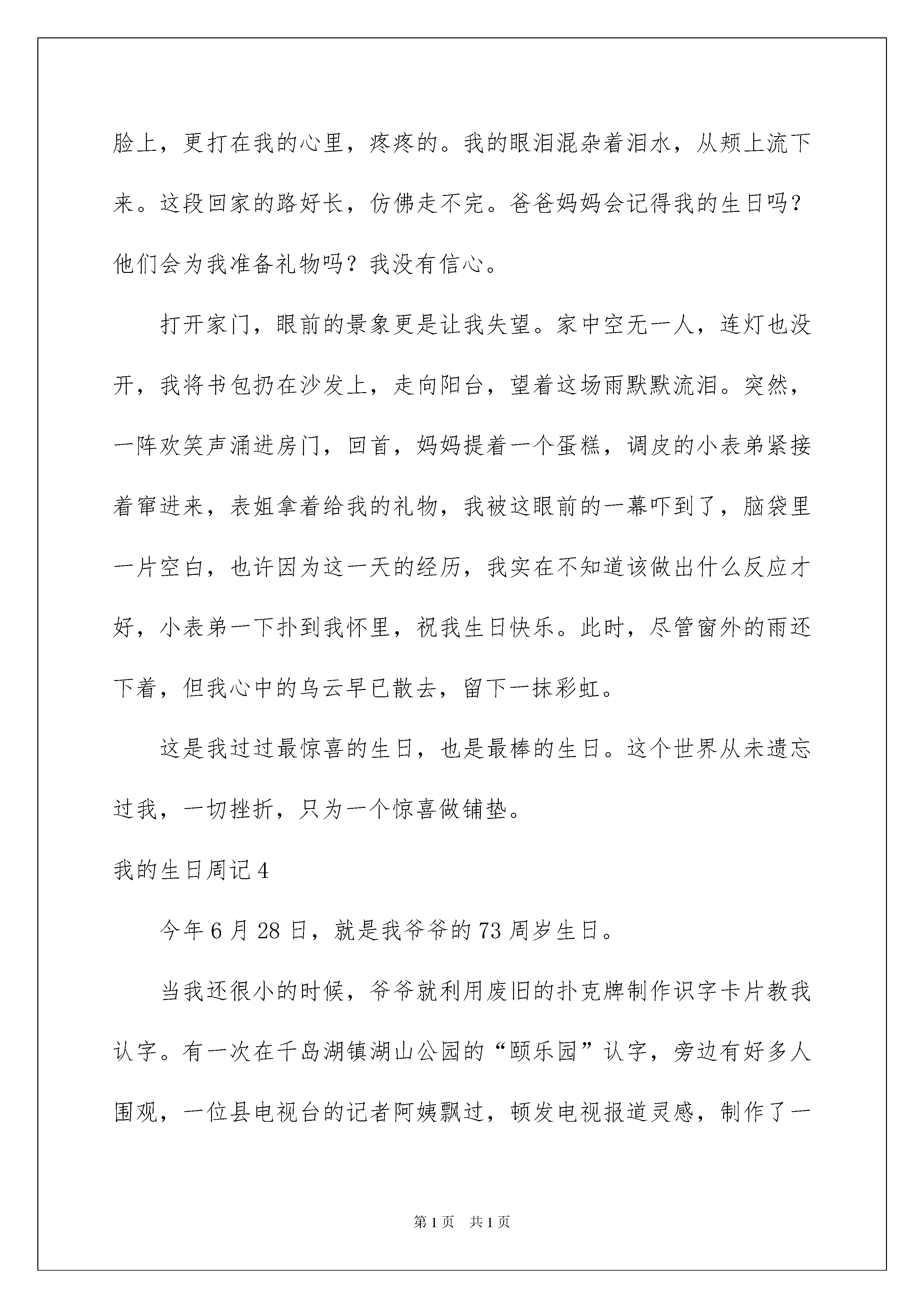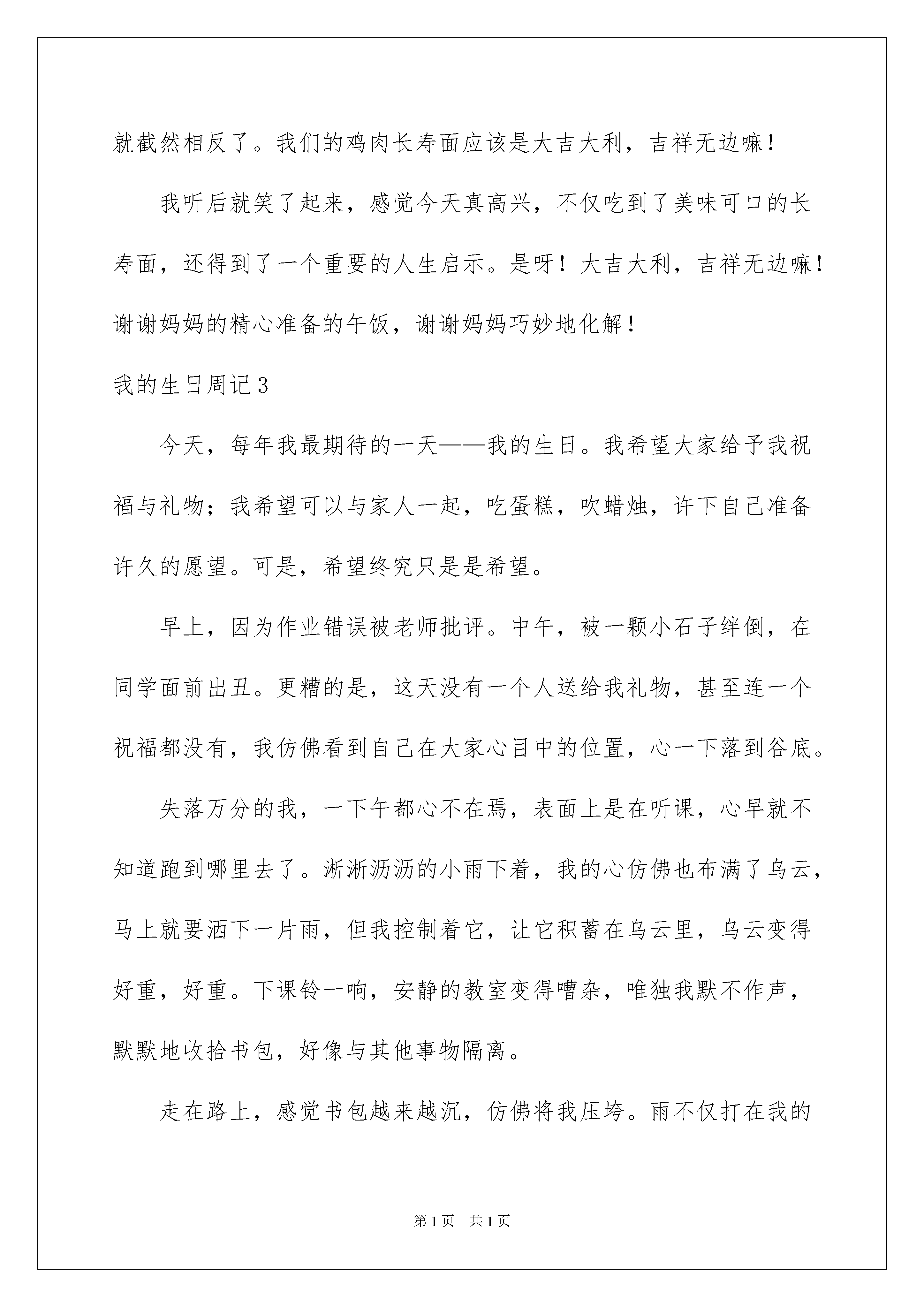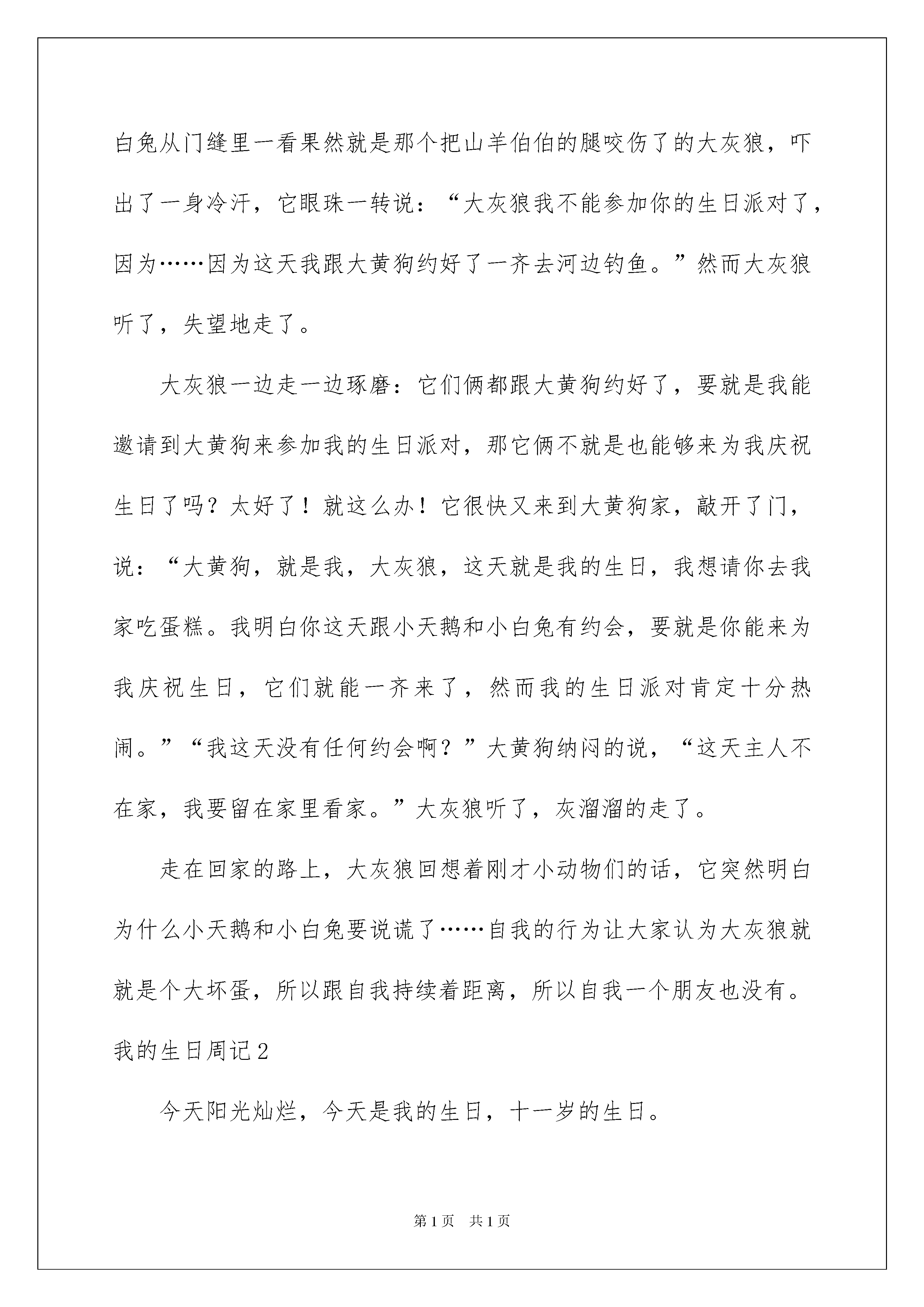 2022我的生日周记我的生日周记时间真是转瞬即逝,一周又过去了,我们一定有印象深刻的事情,是时候好好地记录在周记中了。怎样写好周记呢?下面是我为大家整理的我的生日周记,欢迎阅读与收藏。我的生日周记1这天,就是大灰狼的生日,一大早它就买好蛋糕,把房间打扫得干干净净,因为它准备邀请几位动物朋友好好庆祝一下。大灰狼兴致勃勃的来找小天鹅。它来到小天鹅家,敲了敲门,说:“天鹅妹妹,就是我,大灰狼,这天就是我的生日,我想请你去我家吃蛋糕。”小天鹅心想:昨日它刚把小鸡吃了,我可不去它家。等了片刻,门没有开,只听到从里面传来小天鹅颤抖的回答:“大灰狼我不能参加你的生日派对了,因为……因为这天我跟大黄狗约好了一齐去游泳。”大灰狼听了,只好离开。它又兴高采烈地来到小白兔家。它敲了敲门,说:“白兔弟弟,就是我,大灰狼,这天就是我的生日,我想请你去我家吃蛋糕。”小白兔从门缝里一看果然就是那个把山羊伯伯的腿咬伤了的大灰狼,吓出了一身冷汗,它眼珠一转说:“大灰狼我不能参加你的生日派对了,因为……因为这天我跟大黄狗约好了一齐去河边钓鱼。”然而大灰狼听了,失望地走了。大灰狼一边走一边琢磨:它们俩都跟大黄狗约好了,要就是我能邀请到大黄狗来参加我的生日派对,那它俩不就是也能够来为我庆祝生日了吗?太好了!就这么办!它很快又来到大黄狗家,敲开了门,说:“大黄狗,就是我,大灰狼,这天就是我的生日,我想请你去我家吃蛋糕。我明白你这天跟小天鹅和小白兔有约会,要就是你能来为我庆祝生日,它们就能一齐来了,然而我的生日派对肯定十分热闹。”“我这天没有任何约会啊?”大黄狗纳闷的说,“这天主人不在家,我要留在家里看家。”大灰狼听了,灰溜溜的走了。走在回家的路上,大灰狼回想着刚才小动物们的话,它突然明白为什么小天鹅和小白兔要说谎了……自我的行为让大家认为大灰狼就就是个大坏蛋,所以跟自我持续着距离,所以自我一个朋友也没有。我的生日周记2今天阳光灿烂,今天是我的生日,十一岁的生日。妈妈为了庆祝我的生日,特意赶了集,买回了我这个小馋鬼特爱吃的肉。太感谢老妈了,这么爱我,把我养的胖胖的,壮壮的。今天更是我的天下,我要大开吃戒,吃,吃,吃!中午放学,一进门,就闻到了香味。我赶紧趴在那儿,使劲闻了一下,真是那个香呀!妈妈一把把我拉开,嚷嚷着让我洗手。我就立马完成了洗手的程序,妈妈已经把臊子面条———长寿面端了上来,另加香气弥漫的香肠一盘。满满的一碗长寿面,真的挺好吃的,我三下五去二的就吃的底朝天了,然后又吞下了一些香肠片,拍了拍鼓起的肚子,心满意足呀!不过,现在吃饱了,细想一下,妈妈做的有点不妥,过生日不应该用鸡肉做臊子,虽然鸡肉很好吃,但我认为鸡同饥,表示饥饿,长寿面用鸡肉做臊子,表示一年饥饿,多不好!用猪肉、羊肉、牛肉、鱼肉都可以,唯独鸡肉不好。我就直接对妈妈说了,谁知妈妈一番话,就消除了我的疑虑,彻底的消除了。妈妈说,你想象力太丰富了,可你看问题的角度不好。中国著名的国画家俞仲林擅长画牡丹。但一次画的牡丹花没画全,缺了一部分,有人见了大呼不吉利,牡丹代表富贵,岂不是富贵不全?可俞老一看就说:缺了一边,刚好表示富贵无边呀!你看理解的角度不同,含义就截然相反了。我们的鸡肉长寿面应该是大吉大利,吉祥无边嘛!我听后就笑了起来,感觉今天真高兴,不仅吃到了美味可口的长寿面,还得到了一个重要的人生启示。是呀!大吉大利,吉祥无边嘛!谢谢妈妈的精心准备的午饭,谢谢妈妈巧妙地化解!我的生日周记3今天,每年我最期待的一天——我的生日。我希望大家给予我祝福与礼物;我希望可以与家人一起,吃蛋糕,吹蜡烛,许下自己准备许久的愿望。可是,希望终究只是是希望。早上,因为作业错误被老师批评。中午,被一颗小石子绊倒,在同学面前出丑。更糟的是,这天没有一个人送给我礼物,甚至连一个祝福都没有,我仿佛看到自己在大家心目中的位置,心一下落到谷底。失落万分的我,一下午都心不在焉,表面上是在听课,心早就不知道跑到哪里去了。淅淅沥沥的小雨下着,我的心仿佛也布满了乌云,马上就要洒下一片雨,但我控制着它,让它积蓄在乌云里,乌云变得好重,好重。下课铃一响,安静的教室变得嘈杂,唯独我默不作声,默默地收拾书包,好像与其他事物隔离。走在路上,感觉书包越来越沉,仿佛将我压垮。雨不仅打在我的脸上,更打在我的心里,疼疼的。我的眼泪混杂着泪水,从颊上流下来。这段回家的路好长,仿佛走不完。爸爸妈妈会记得我的生日吗?他们会为我准备礼物吗?我没有信心。打开家门,眼前的景象更是让我失望。家中空无一人,连灯也没开,我将书包扔在沙发上,走向阳台,望着这场雨默默流泪。突然,一阵欢笑声涌进房门,回首,妈妈提着一个蛋糕,调