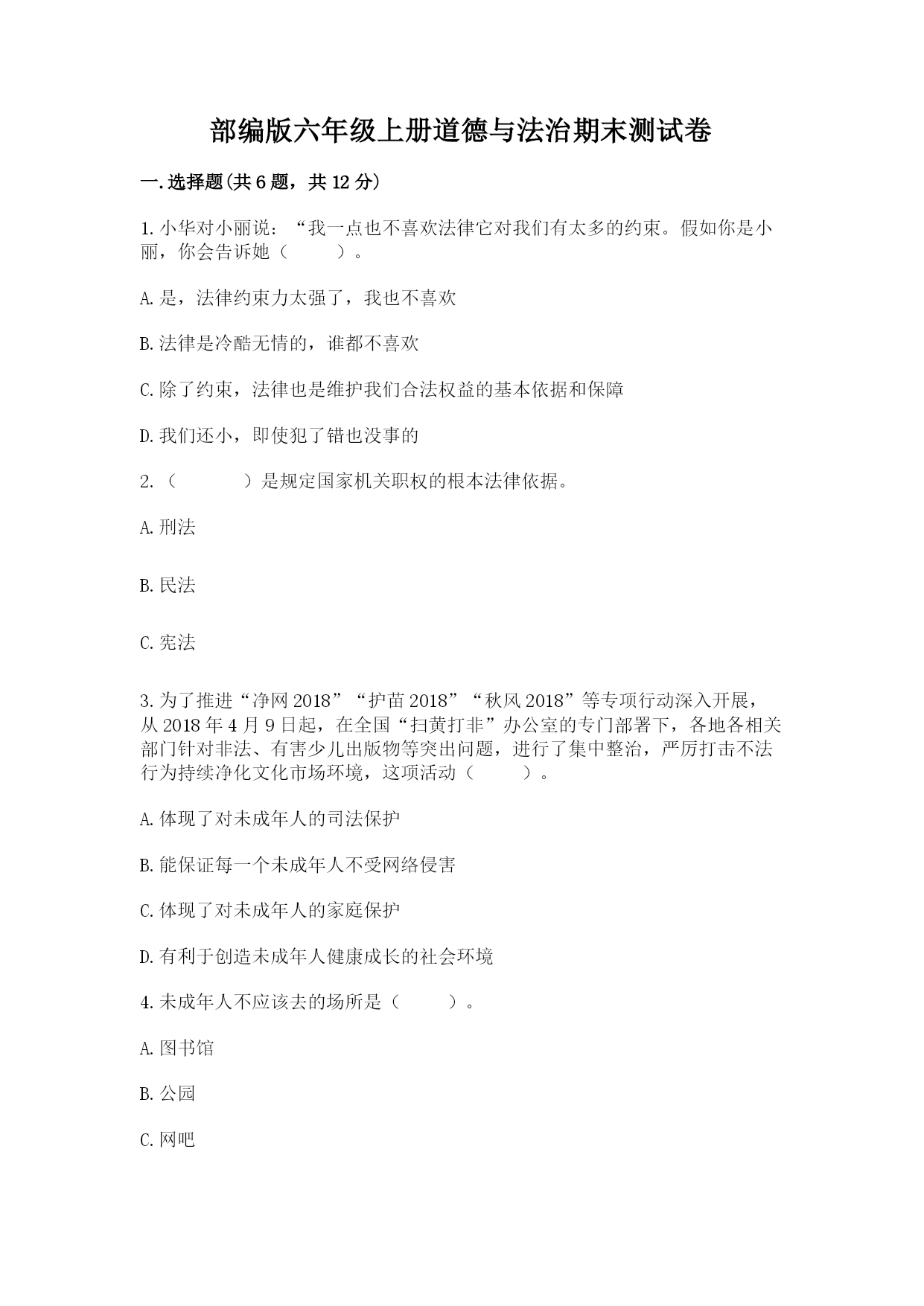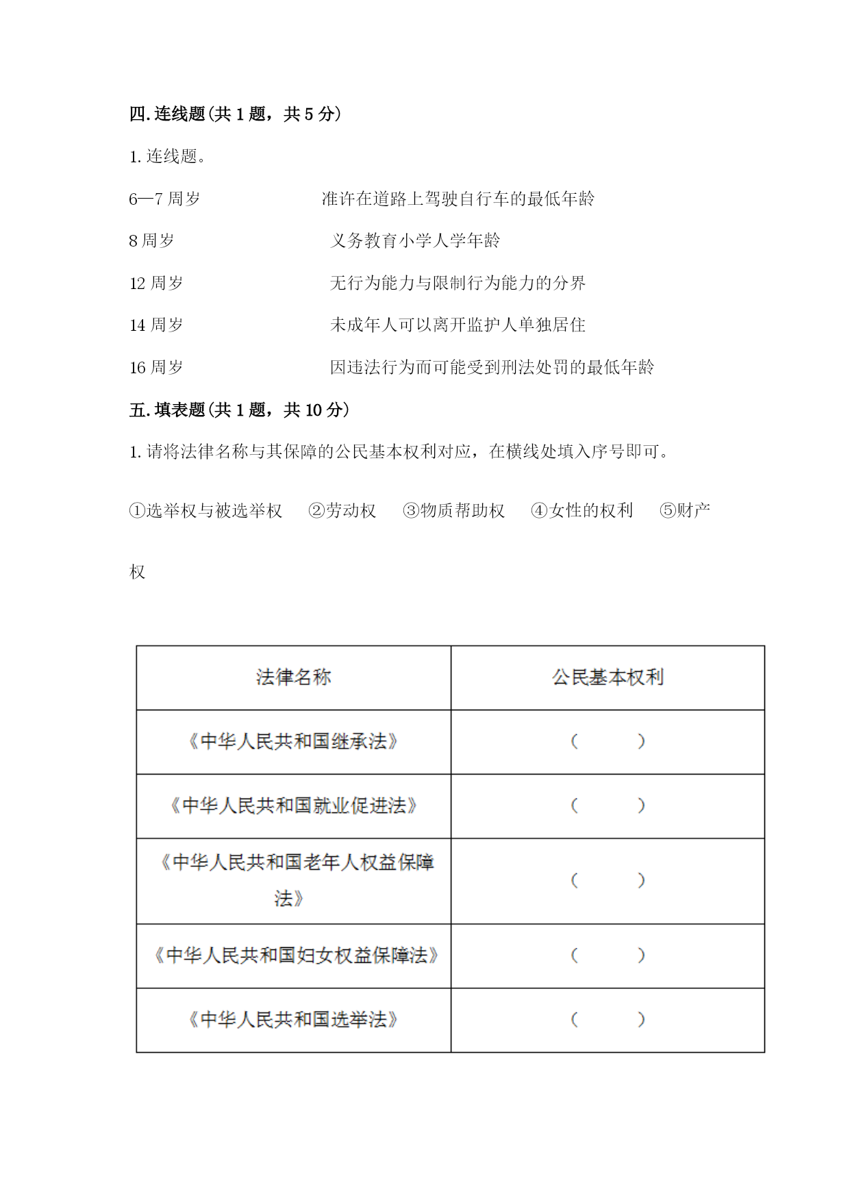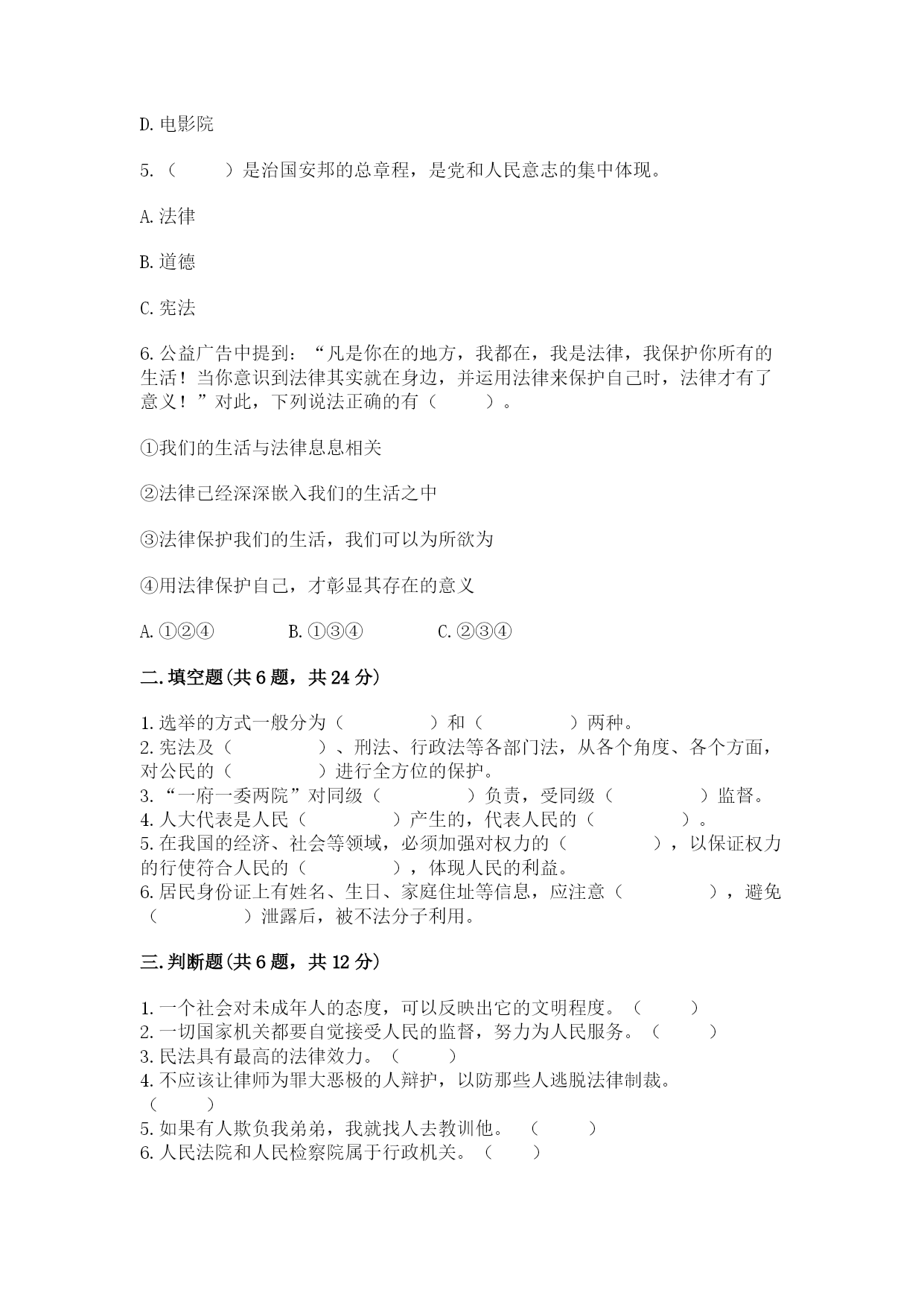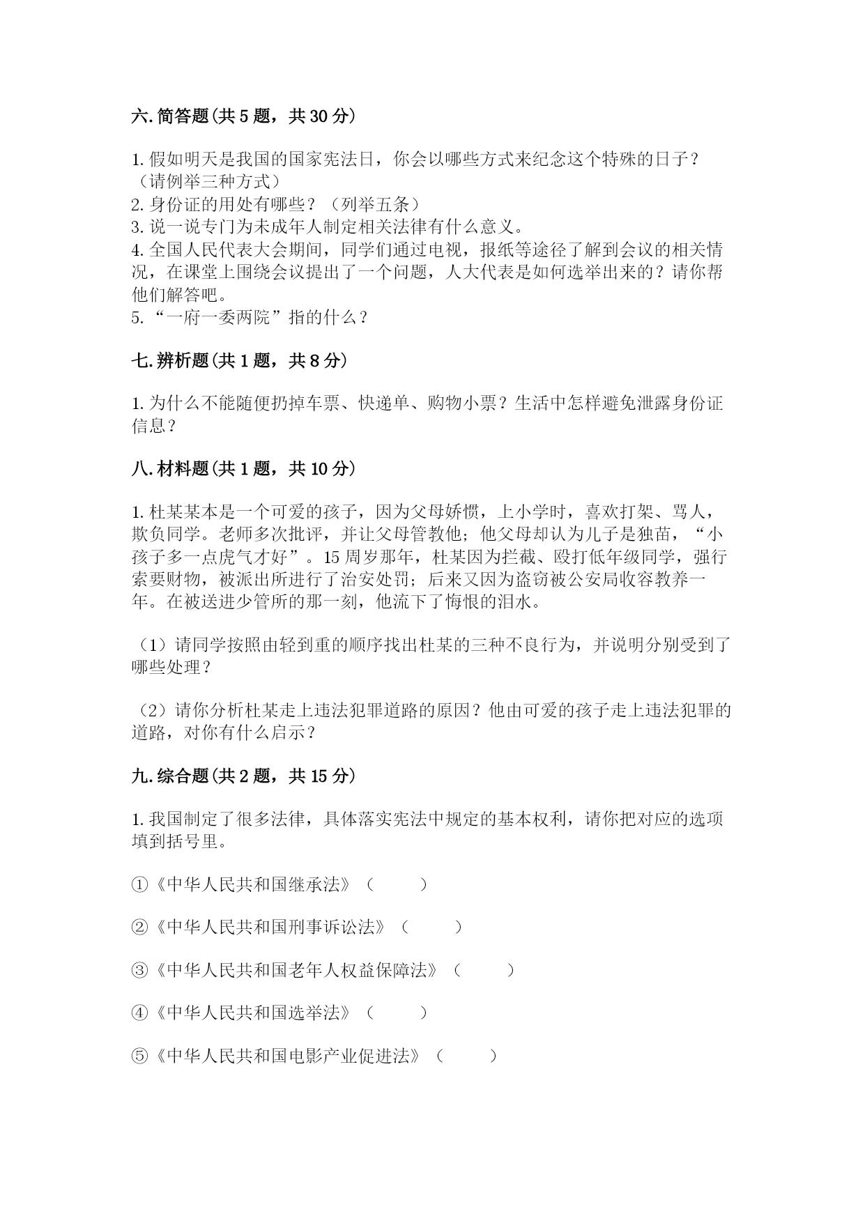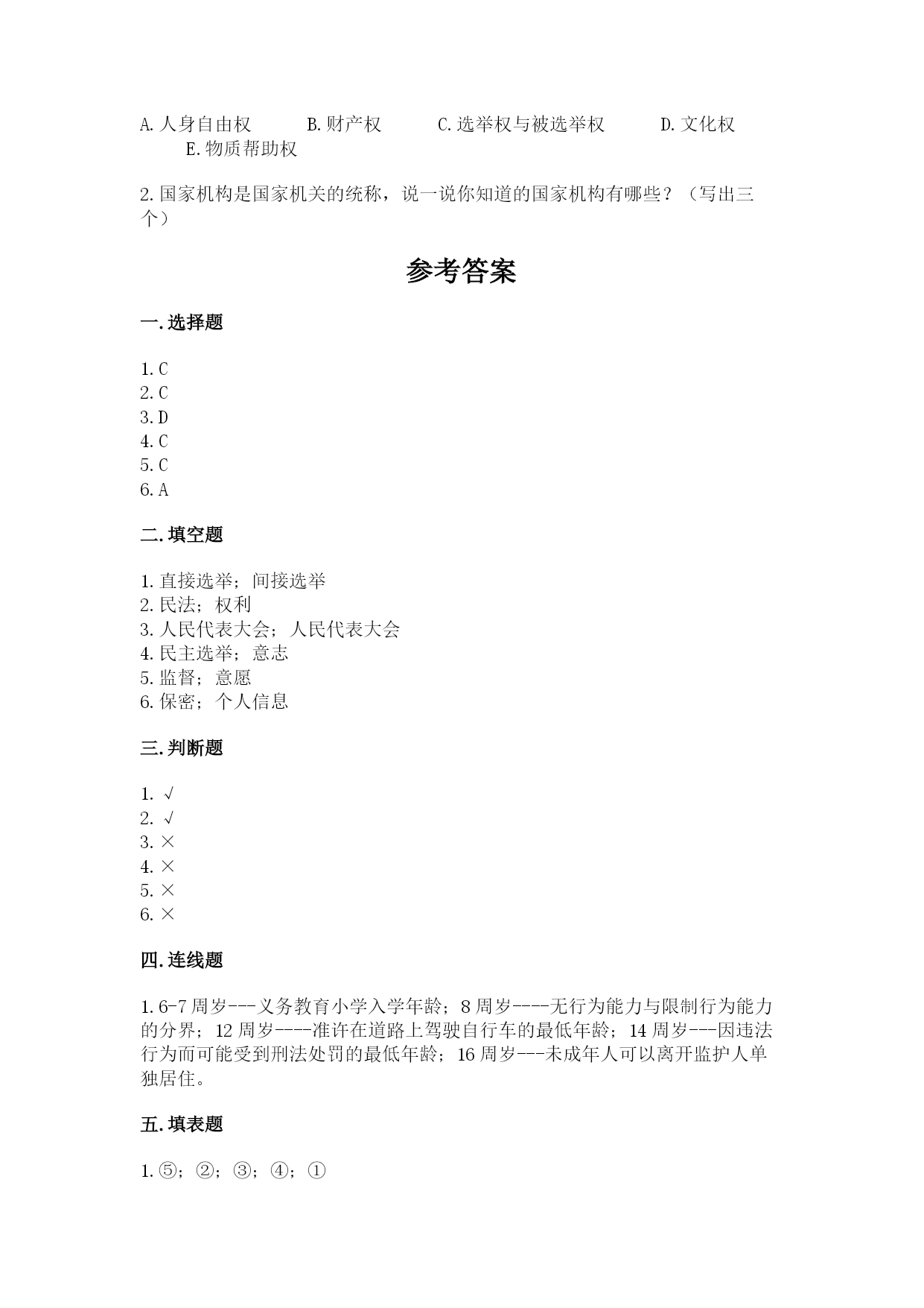 部编版六年级上册道德与法治期末测试卷一.选择题(共6题,共12分)1.小华对小丽说:“我一点也不喜欢法律它对我们有太多的约束。假如你是小丽,你会告诉她()。A.是,法律约束力太强了,我也不喜欢B.法律是冷酷无情的,谁都不喜欢C.除了约束,法律也是维护我们合法权益的基本依据和保障D.我们还小,即使犯了错也没事的2.()是规定国家机关职权的根本法律依据。A.刑法B.民法C.宪法3.为了推进“净网2018”“护苗2018”“秋风2018”等专项行动深入开展,从2018年4月9日起,在全国“扫黄打非”办公室的专门部署下,各地各相关部门针对非法、有害少儿出版物等突出问题,进行了集中整治,严厉打击不法行为持续净化文化市场环境,这项活动()。A.体现了对未成年人的司法保护B.能保证每一个未成年人不受网络侵害C.体现了对未成年人的家庭保护D.有利于创造未成年人健康成长的社会环境4.未成年人不应该去的场所是()。A.图书馆B.公园C.网吧D.电影院5.()是治国安邦的总章程,是党和人民意志的集中体现。A.法律B.道德C.宪法6.公益广告中提到:“凡是你在的地方,我都在,我是法律,我保护你所有的生活!当你意识到法律其实就在身边,并运用法律来保护自己时,法律才有了意义!”对此,下列说法正确的有()。①我们的生活与法律息息相关②法律已经深深嵌入我们的生活之中③法律保护我们的生活,我们可以为所欲为④用法律保护自己,才彰显其存在的意义A.①②④B.①③④C.②③④二.填空题(共6题,共24分)1.选举的方式一般分为()和()两种。2.宪法及()、刑法、行政法等各部门法,从各个角度、各个方面,对公民的()进行全方位的保护。3.“一府一委两院”对同级()负责,受同级()监督。4.人大代表是人民()产生的,代表人民的()。5.在我国的经济、社会等领域,必须加强对权力的(),以保证权力的行使符合人民的(),体现人民的利益。6.居民身份证上有姓名、生日、家庭住址等信息,应注意(),避免()泄露后,被不法分子利用。三.判断题(共6题,共12分)1.一个社会对未成年人的态度,可以反映出它的文明程度。()2.一切国家机关都要自觉接受人民的监督,努力为人民服务。()3.民法具有最高的法律效力。()4.不应该让律师为罪大恶极的人辩护,以防那些人逃脱法律制裁。()5.如果有人欺负我弟弟,我就找人去教训他。()6.人民法院和人民检察院属于行政机关。()四.连线题(共1题,共5分)1.连线题。6—7周岁准许在道路上驾驶自行车的最低年龄8周岁义务教育小学人学年龄12周岁无行为能力与限制行为能力的分界14周岁未成年人可以离开监护人单独居住16周岁因违法行为而可能受到刑法处罚的最低年龄五.填表题(共1题,共10分)1.请将法律名称与其保障的公民基本权利对应,在横线处填入序号即可。①选举权与被选举权②劳动权③物质帮助权④女性的权利⑤财产权六.简答题(共5题,共30分)1.假如明天是我国的国家宪法日,你会以哪些方式来纪念这个特殊的日子?(请例举三种方式)2.身份证的用处有哪些?(列举五条)3.说一说专门为未成年人制定相关法律有什么意义。4.全国人民代表大会期间,同学们通过电视,报纸等途径了解到会议的相关情况,在课堂上围绕会议提出了一个问题,人大代表是如何选举出来的?请你帮他们解答吧。5.“一府一委两院”指的什么?七.辨析题(共1题,共8分)1.为什么不能随便扔掉车票、快递单、购物小票?生活中怎样避免泄露身份证信息?八.材料题(共1题,共10分)1.杜某某本是一个可爱的孩子,因为父母娇惯,上小学时,喜欢打架、骂人,欺负同学。老师多次批评,并让父母管教他;他父母却认为儿子是独苗,“小孩子多一点虎气才好”。15周岁那年,杜某因为拦截、殴打低年级同学,强行索要财物,被派出所进行了治安处罚;后来又因为盗窃被公安局收容教养一年。在被送进少管所的那一刻,他流下了悔恨的泪水。(1)请同学按照由轻到重的顺序找出杜某的三种不良行为,并说明分别受到了哪些处理?(2)请你分析杜某走上违法犯罪道路的原因?他由可爱的孩子走上违法犯罪的道路,对你有什么启示?九.综合题(共2题,共15分)1.我国制定了很多法律,具体落实宪法中规定的基本权利,请你把对应的选项填到括号里。①《中华人民共和国继承法》()②《中华人民共和国刑事诉讼法》()③《中华人民共和国老年人权益保障法》()④《中华人民共和国选举法》()⑤《中华人民共和国电影产业促进法》()A.人身自由权B.财产权C.选举权与被选举权D.文化权E.物质帮助权2.国家机构是国家机关的统称,说一说你知道的国家机构有哪些?(写出三个)参考答案一.选择题1.C2.C3.D4.C5.C6.A二.填空题1.直接选举;间接选举2.民法;权利3.人民代表大会;人民代表大会4.民主选举;意志
