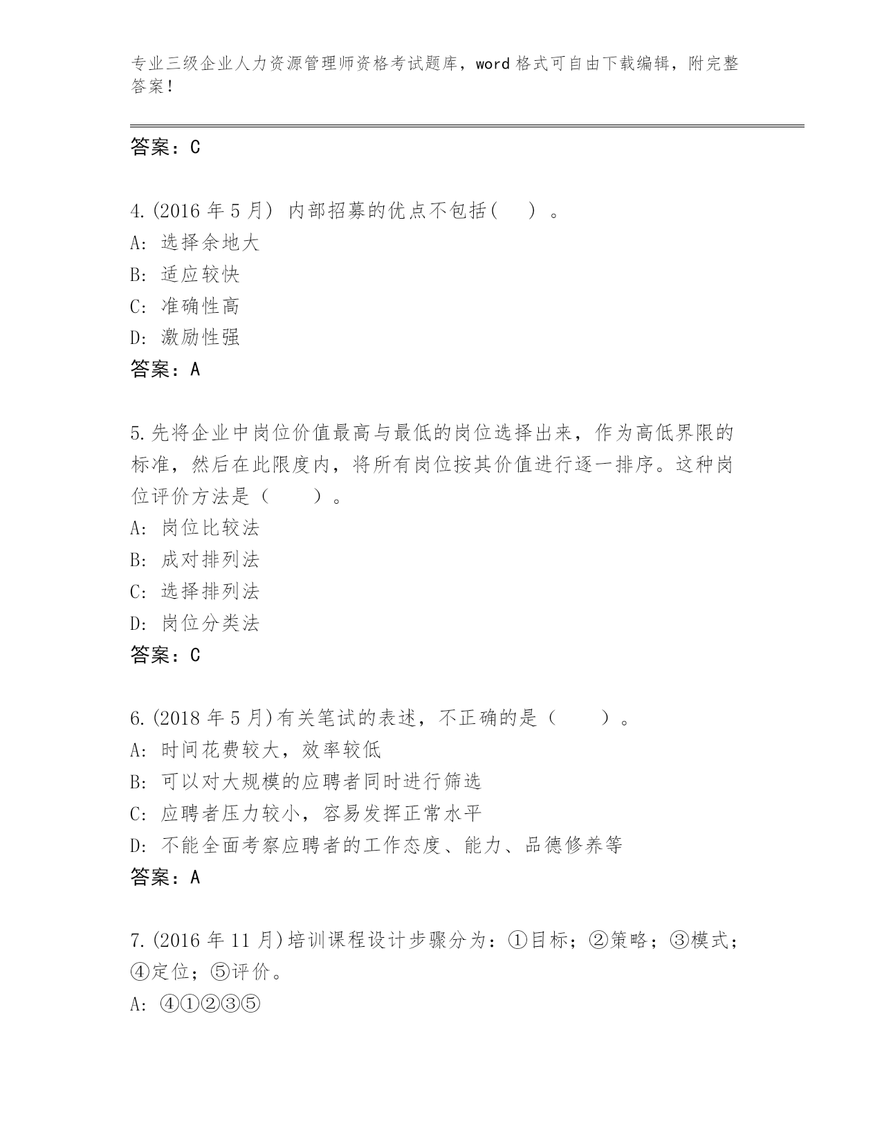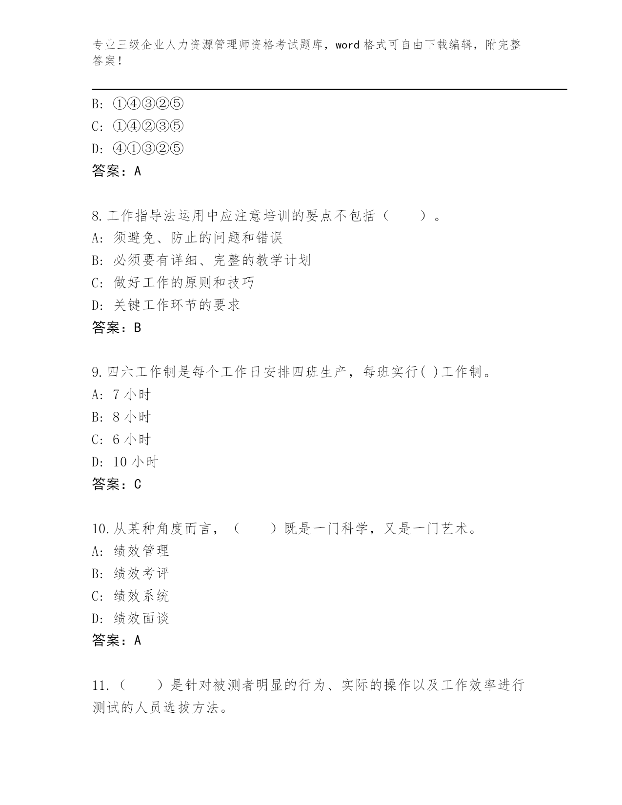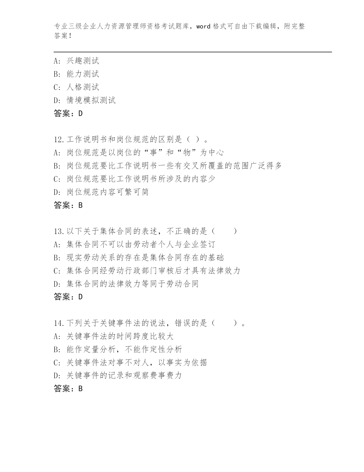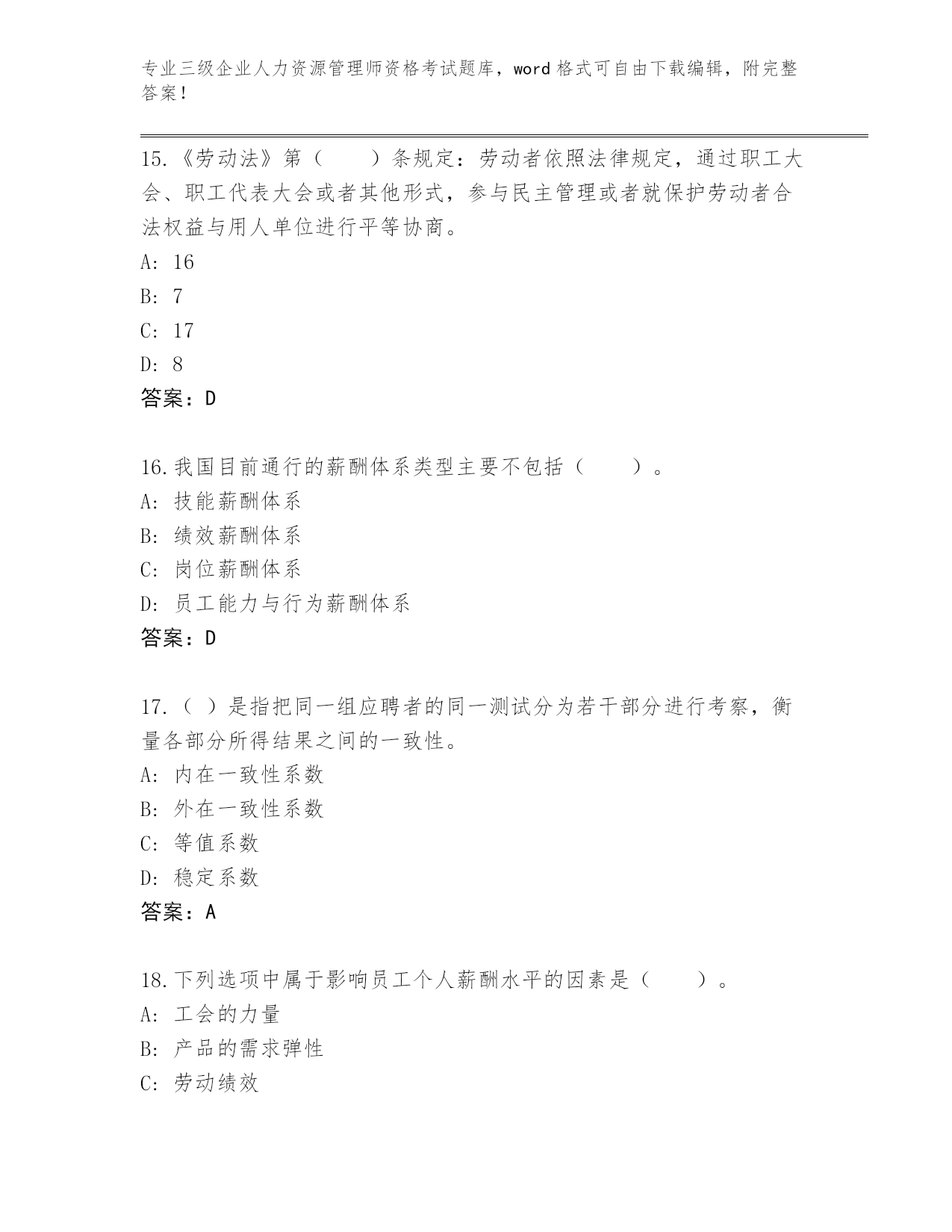 专业三级企业人力资源管理师资格考试题库,word格式可自由下载编辑,附完整答案!湖南省完整版三级企业人力资源管理师资格考试内部题库带答案(巩固)第I部分单选题(100题)1.劳动争议的实质是劳动关系主体的利益差别而导致的()冲突。A:能力B:权力C:合作D:利益答案:D2.(2015年5月)培训课程内容应以()为出发点去选择并组合。A:实现培训课程目标B:满足培训需求C:提高组织和个人的绩效D:有效利用培训资源答案:A3.设区的市级劳动能力鉴定委员会收到劳动能力鉴定申请后,应当从其建立的医疗卫生专家库中随机抽取3名或者()名相关专家组成专家组,由专家组提出鉴定意见。A:17B:11C:5D:15答案:C4.(2016年5月)内部招募的优点不包括()。A:选择余地大B:适应较快C:准确性高D:激励性强答案:A5.先将企业中岗位价值最高与最低的岗位选择出来,作为高低界限的标准,然后在此限度内,将所有岗位按其价值进行逐一排序。这种岗位评价方法是()。A:岗位比较法B:成对排列法C:选择排列法D:岗位分类法答案:C6.(2018年5月)有关笔试的表述,不正确的是()。A:时间花费较大,效率较低B:可以对大规模的应聘者同时进行筛选C:应聘者压力较小,容易发挥正常水平D:不能全面考察应聘者的工作态度、能力、品德修养等答案:A7.(2016年11月)培训课程设计步骤分为:①目标;②策略;③模式;④定位;⑤评价。A:④①②③⑤B:①④③②⑤C:①④②③⑤D:④①③②⑤答案:A8.工作指导法运用中应注意培训的要点不包括()。A:须避免、防止的问题和错误B:必须要有详细、完整的教学计划C:做好工作的原则和技巧D:关键工作环节的要求答案:B9.四六工作制是每个工作日安排四班生产,每班实行()工作制。A:7小时B:8小时C:6小时D:10小时答案:C10.从某种角度而言,()既是一门科学,又是一门艺术。A:绩效管理B:绩效考评C:绩效系统D:绩效面谈答案:A11.()是针对被测者明显的行为、实际的操作以及工作效率进行测试的人员选拔方法。A:兴趣测试B:能力测试C:人格测试D:情境模拟测试答案:D12.工作说明书和岗位规范的区别是()。A:岗位规范是以岗位的“事”和“物”为中心B:岗位规范要比工作说明书一些有交叉所覆盖的范围广泛得多C:岗位规范要比工作说明书所涉及的内容少D:岗位规范内容可繁可简答案:B13.以下关于集体合同的表述,不正确的是()A:集体合同不可以由劳动者个人与企业签订B:现实劳动关系的存在是集体合同存在的基础C:集体合同经劳动行政部门审核后才具有法律效力D:集体合同的法律效力等同于劳动合同答案:D14.下列关于关键事件法的说法,错误的是()。A:关键事件法的时间跨度比较大B:能作定量分析,不能作定性分析C:关键事件法对事不对人,以事实为依据D:关键事件的记录和观察费事费力答案:B15.《劳动法》第()条规定:劳动者依照法律规定,通过职工大会、职工代表大会或者其他形式,参与民主管理或者就保护劳动者合法权益与用人单位进行平等协商。A:16B:7C:17D:8答案:D16.我国目前通行的薪酬体系类型主要不包括()。A:技能薪酬体系B:绩效薪酬体系C:岗位薪酬体系D:员工能力与行为薪酬体系答案:D17.()是指把同一组应聘者的同一测试分为若干部分进行考察,衡量各部分所得结果之间的一致性。A:内在一致性系数B:外在一致性系数C:等值系数D:稳定系数答案:A18.下列选项中属于影响员工个人薪酬水平的因素是()。A:工会的力量B:产品的需求弹性C:劳动绩效D:企业的薪酬策略答案:C19.在采用零基定员法核定定员人数时,最关键的环节是()A:核定各岗位的工作任务量B:核定各岗位的名称C:核定各岗位的职责D:核定各岗位的权限答案:A20.确保人力资源费用预算合理性的参照指标不包括()。A:最低工资标准B:劳动力市场价位C:工资指导线D:消费者物价指数答案:B21.确定人工费支出极限的方法,不包括()。A:损益分歧点基准法B:劳动分配率基准法C:销售净额基准法D:成本收益基准法答案:D22.(2016年11月)培训项目规划中较容易被企业忽略的是()。A:培训成本的预算B:项目的评估规划C:培训内容的开发D:培训资源的筹备答案:B23.重大事故指造成10人以上30人以下死亡,或者50人以上100人以下重伤,或者5000万元以上()以下直接经济损失的事故。A:9000万元B:1亿元C:7000万元D:8000万元答案:B24.在岗位评价中,()是指岗位的劳动卫生状况。A:劳动技能B:劳动责任C:劳动环境D:劳动强度答案:C25.满足成就需要的行为不包括()A:解决一个复杂问题B:发现和使用更好的方法完成工作C:比竞争者更出色D:影响他人并改变他们的态度和行为