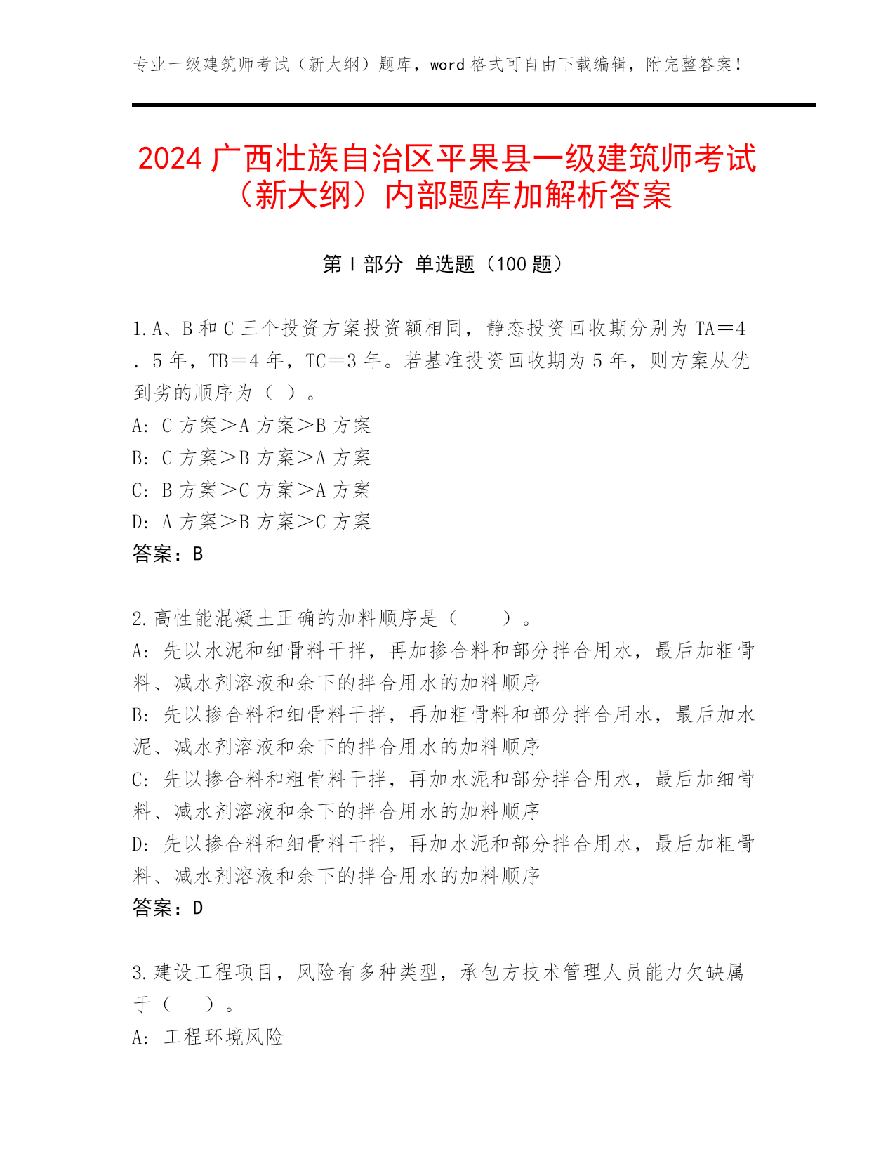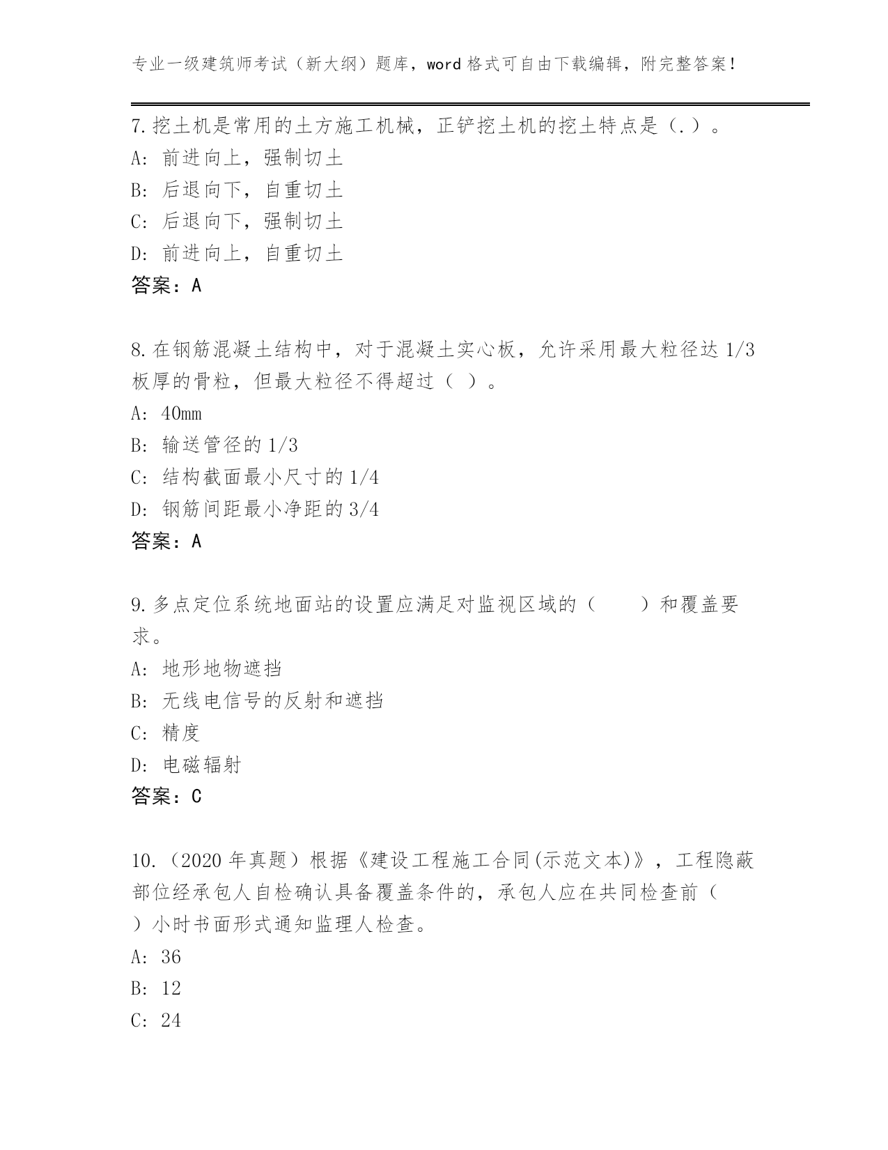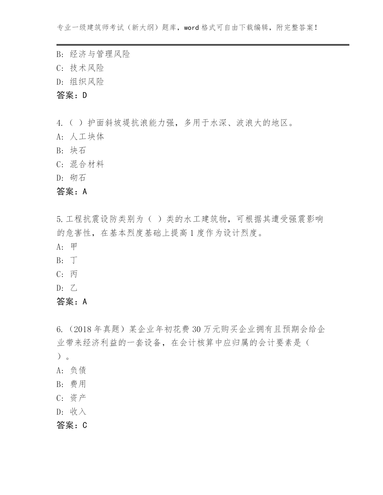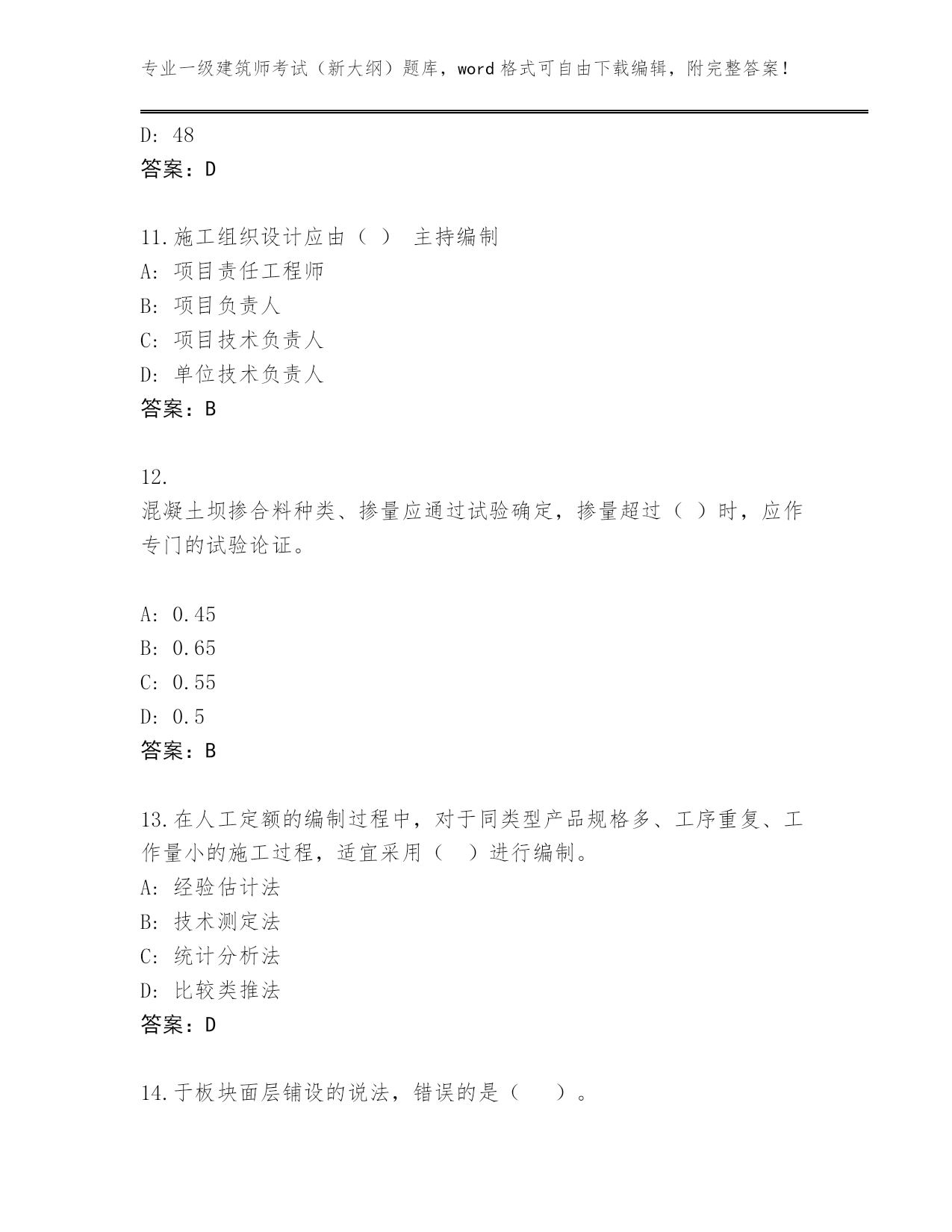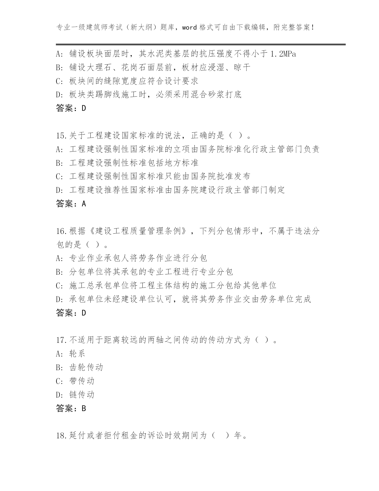 专业一级建筑师考试(新大纲)题库,word格式可自由下载编辑,附完整答案!2024广西壮族自治区平果县一级建筑师考试(新大纲)内部题库加解析答案第I部分单选题(100题)1.A、B和C三个投资方案投资额相同,静态投资回收期分别为TA=4.5年,TB=4年,TC=3年。若基准投资回收期为5年,则方案从优到劣的顺序为()。A:C方案>A方案>B方案B:C方案>B方案>A方案C:B方案>C方案>A方案D:A方案>B方案>C方案答案:B2.高性能混凝土正确的加料顺序是()。A:先以水泥和细骨料干拌,再加掺合料和部分拌合用水,最后加粗骨料、减水剂溶液和余下的拌合用水的加料顺序B:先以掺合料和细骨料干拌,再加粗骨料和部分拌合用水,最后加水泥、减水剂溶液和余下的拌合用水的加料顺序C:先以掺合料和粗骨料干拌,再加水泥和部分拌合用水,最后加细骨料、减水剂溶液和余下的拌合用水的加料顺序D:先以掺合料和细骨料干拌,再加水泥和部分拌合用水,最后加粗骨料、减水剂溶液和余下的拌合用水的加料顺序答案:D3.建设工程项目,风险有多种类型,承包方技术管理人员能力欠缺属于()。A:工程环境风险B:经济与管理风险C:技术风险D:组织风险答案:D4.()护面斜坡堤抗浪能力强,多用于水深、波浪大的地区。A:人工块体B:块石C:混合材料D:砌石答案:A5.工程抗震设防类别为()类的水工建筑物,可根据其遭受强震影响的危害性,在基本烈度基础上提高1度作为设计烈度。A:甲B:丁C:丙D:乙答案:A6.(2018年真题)某企业年初花费30万元购买企业拥有且预期会给企业带来经济利益的一套设备,在会计核算中应归属的会计要素是()。A:负债B:费用C:资产D:收入答案:C7.挖土机是常用的土方施工机械,正铲挖土机的挖土特点是(.)。A:前进向上,强制切土B:后退向下,自重切土C:后退向下,强制切土D:前进向上,自重切土答案:A8.在钢筋混凝土结构中,对于混凝土实心板,允许采用最大粒径达1/3板厚的骨粒,但最大粒径不得超过()。A:40mmB:输送管径的1/3C:结构截面最小尺寸的1/4D:钢筋间距最小净距的3/4答案:A9.多点定位系统地面站的设置应满足对监视区域的()和覆盖要求。A:地形地物遮挡B:无线电信号的反射和遮挡C:精度D:电磁辐射答案:C10.(2020年真题)根据《建设工程施工合同(示范文本)》,工程隐蔽部位经承包人自检确认具备覆盖条件的,承包人应在共同检查前()小时书面形式通知监理人检查。A:36B:12C:24D:48答案:D11.施工组织设计应由()主持编制A:项目责任工程师B:项目负责人C:项目技术负责人D:单位技术负责人答案:B12.混凝土坝掺合料种类、掺量应通过试验确定,掺量超过()时,应作专门的试验论证。A:0.45B:0.65C:0.55D:0.5答案:B13.在人工定额的编制过程中,对于同类型产品规格多、工序重复、工作量小的施工过程,适宜采用()进行编制。A:经验估计法B:技术测定法C:统计分析法D:比较类推法答案:D14.于板块面层铺设的说法,错误的是()。A:铺设板块面层时,其水泥类基层的抗压强度不得小于1.2MPaB:铺设大理石、花岗石面层前,板材应浸湿、晾干C:板块间的缝隙宽度应符合设计要求D:板块类踢脚线施工时,必须采用混合砂浆打底答案:D15.关于工程建设国家标准的说法,正确的是()。A:工程建设强制性国家标准的立项由国务院标准化行政主管部门负责B:工程建设强制性标准包括地方标准C:工程建设强制性国家标准只能由国务院批准发布D:工程建设推荐性国家标准由国务院建设行政主管部门制定答案:A16.根据《建设工程质量管理条例》,下列分包情形中,不属于违法分包的是()。A:专业作业承包人将劳务作业进行分包B:分包单位将其承包的专业工程进行专业分包C:施工总承包单位将工程主体结构的施工分包给其他单位D:承包单位未经建设单位认可,就将其劳务作业交由劳务单位完成答案:D17.不适用于距离较远的两轴之间传动的传动方式为()。A:轮系B:齿轮传动C:带传动D:链传动答案:B18.延付或者拒付租金的诉讼时效期间为()年。A:2B:3C:4D:20答案:B19.关于厂站水处理工艺管线的特点,说法有误的是()。A:水流性能好B:抗弯性能好C:抗腐蚀性能高D:抗地层变位性好答案:B20.根据《公路工程设计施工总承包管理办法》,招标人应当合理确定投标文件的编制时间,自招标文件开始发售之日起至投标人提交投标文件截止时间止,不得少于()天。A:15B:60C:25D:10答案:B21.机场围界视频监控图像信号应选用()进行传输。A:六类双绞线B:屏蔽双绞线C:光缆D:超五类双绞线答案:C22.根据《安全生产许可证条例》,安全生产许可证的有效期为()年。A:5B:2C:3D: