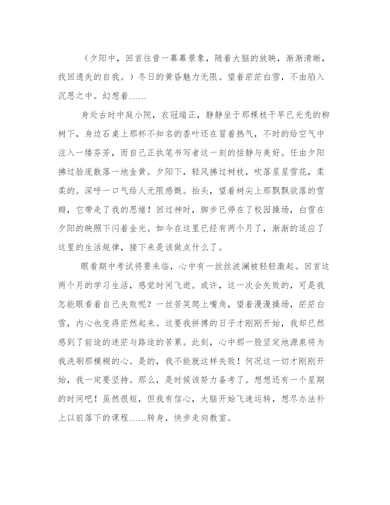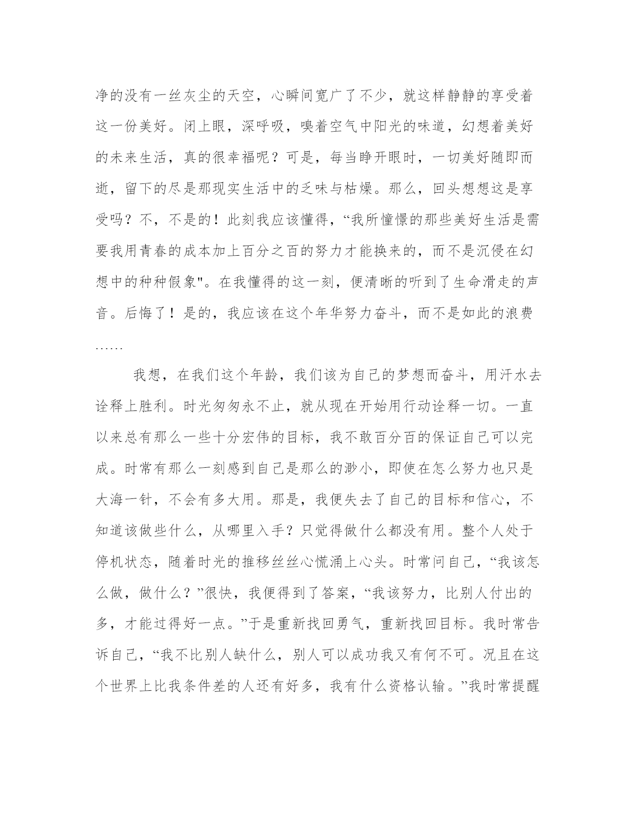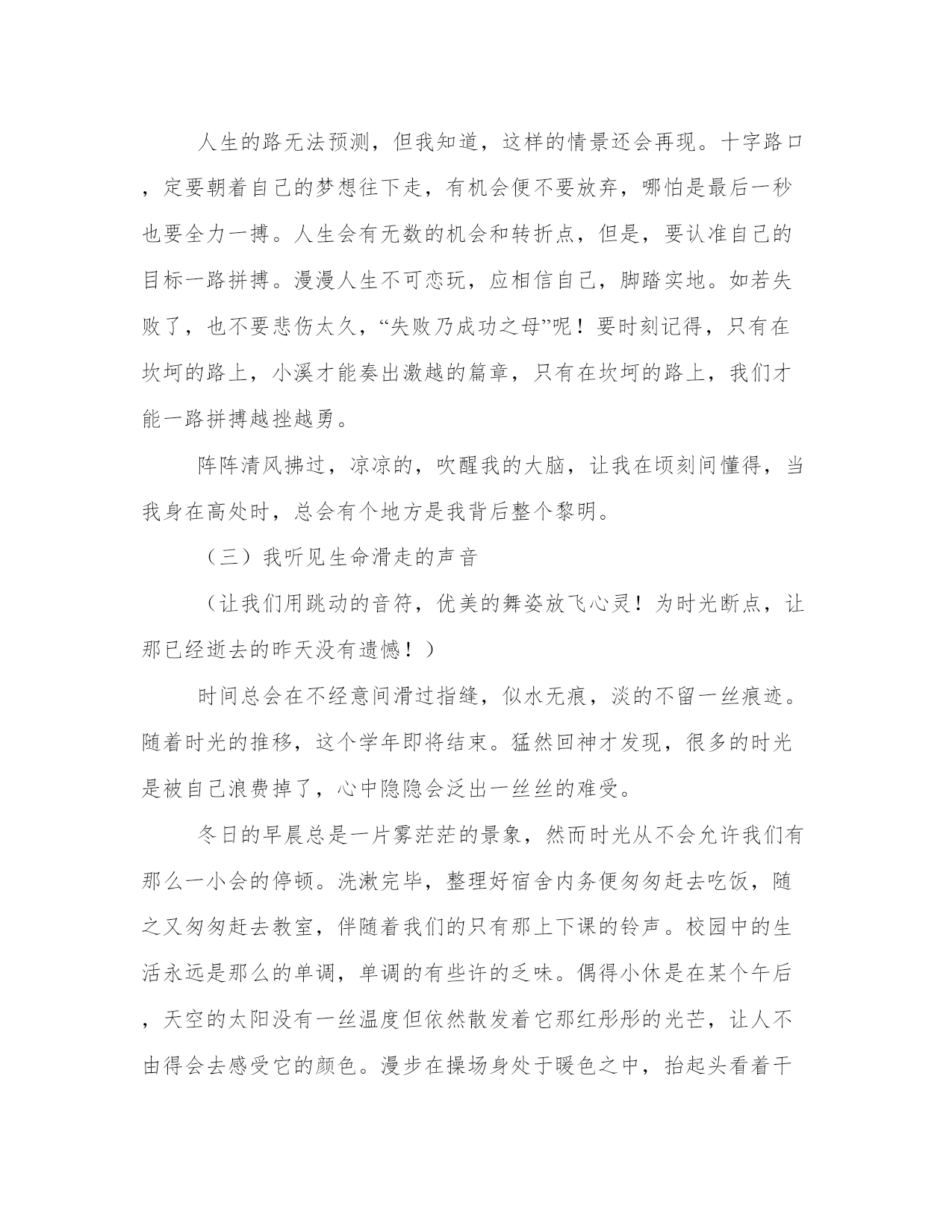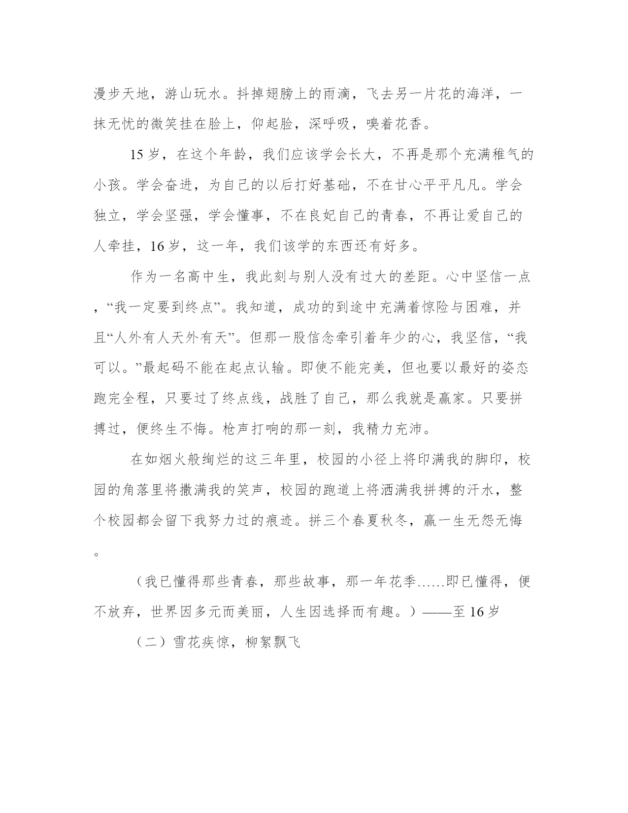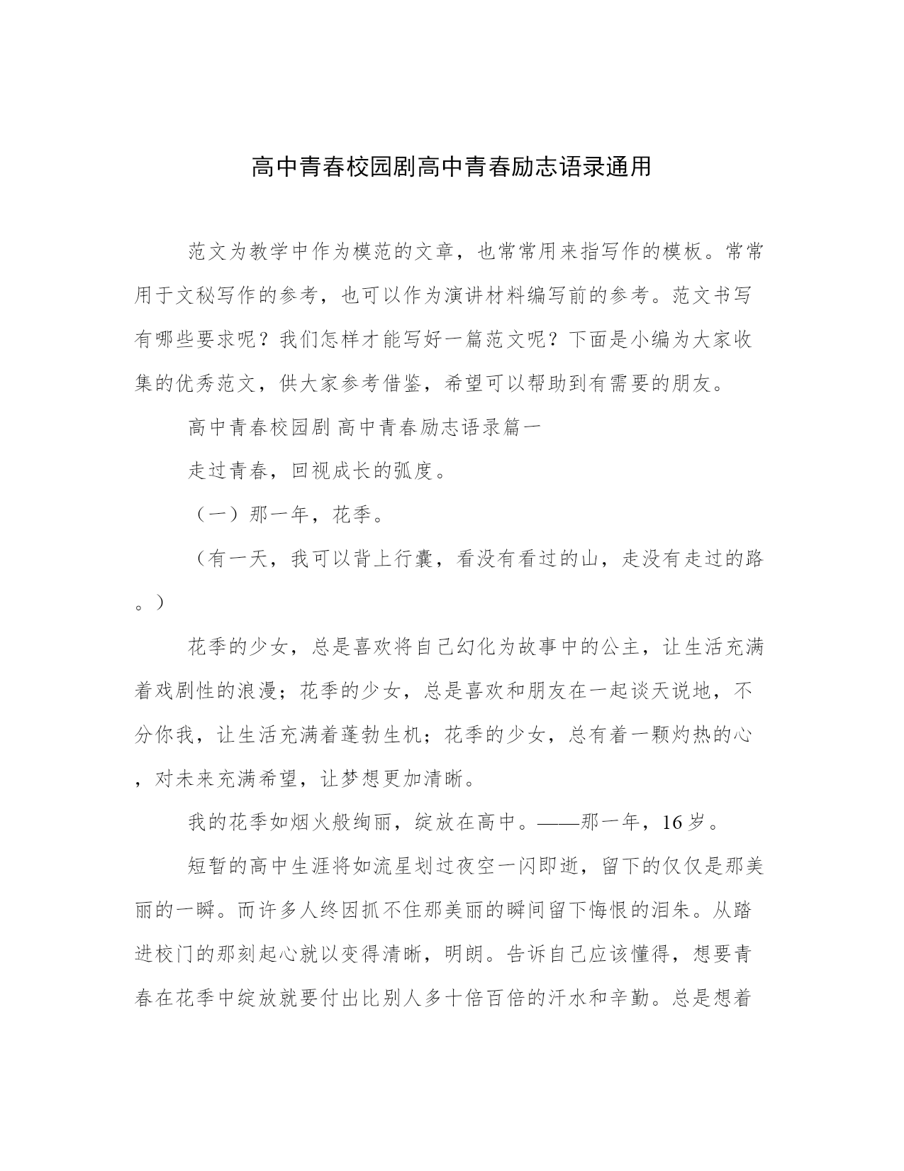 高中青春校园剧高中青春励志语录通用范文为教学中作为模范的文章,也常常用来指写作的模板。常常用于文秘写作的参考,也可以作为演讲材料编写前的参考。范文书写有哪些要求呢?我们怎样才能写好一篇范文呢?下面是小编为大家收集的优秀范文,供大家参考借鉴,希望可以帮助到有需要的朋友。高中青春校园剧高中青春励志语录篇一走过青春,回视成长的弧度。(一)那一年,花季。(有一天,我可以背上行囊,看没有看过的山,走没有走过的路。)花季的少女,总是喜欢将自己幻化为故事中的公主,让生活充满着戏剧性的浪漫;花季的少女,总是喜欢和朋友在一起谈天说地,不分你我,让生活充满着蓬勃生机;花季的少女,总有着一颗灼热的心,对未来充满希望,让梦想更加清晰。我的花季如烟火般绚丽,绽放在高中。——那一年,16岁。短暂的高中生涯将如流星划过夜空一闪即逝,留下的仅仅是那美丽的一瞬。而许多人终因抓不住那美丽的瞬间留下悔恨的泪朱。从踏进校门的那刻起心就以变得清晰,明朗。告诉自己应该懂得,想要青春在花季中绽放就要付出比别人多十倍百倍的汗水和辛勤。总是想着漫步天地,游山玩水。抖掉翅膀上的雨滴,飞去另一片花的海洋,一抹无忧的微笑挂在脸上,仰起脸,深呼吸,嗅着花香。15岁,在这个年龄,我们应该学会长大,不再是那个充满稚气的小孩。学会奋进,为自己的以后打好基础,不在甘心平平凡凡。学会独立,学会坚强,学会懂事,不在良妃自己的青春,不再让爱自己的人牵挂,16岁,这一年,我们该学的东西还有好多。作为一名高中生,我此刻与别人没有过大的差距。心中坚信一点,“我一定要到终点”。我知道,成功的到途中充满着惊险与困难,并且“人外有人天外有天”。但那一股信念牵引着年少的心,我坚信,“我可以。”最起码不能在起点认输。即使不能完美,但也要以最好的姿态跑完全程,只要过了终点线,战胜了自己,那么我就是赢家。只要拼搏过,便终生不悔。枪声打响的那一刻,我精力充沛。在如烟火般绚烂的这三年里,校园的小径上将印满我的脚印,校园的角落里将撒满我的笑声,校园的跑道上将洒满我拼搏的汗水,整个校园都会留下我努力过的痕迹。拼三个春夏秋冬,赢一生无怨无悔。(我已懂得那些青春,那些故事,那一年花季……即已懂得,便不放弃,世界因多元而美丽,人生因选择而有趣。)——至16岁(二)雪花疾惊,柳絮飘飞(夕阳中,回首往昔一幕幕景象,随着大脑的放映,渐渐清晰,找回遗失的自我。)冬日的黄昏魅力无限。望着茫茫白雪,不由陷入沉思之中。幻想着……身处古时中庭小院,衣冠端正,静静坐于那棵枝干早已光秃的柳树下,身边石桌上那杯不知名的香叶还在冒着热气,不时的给空气中注入一缕芬芳,而自己正执笔书写者这一刻的恬静与美好。任由夕阳拂过脸庞散落一地金黄。夕阳下,轻风拂过树枝,吹落星星雪花,柔柔的。深呼一口气给人无限感慨。抬头,望着树尖上那飘飘欲落的雪瓣,它带走了我的思绪!回过神时,脚步已停在了校园操场,白雪在夕阳的映照下闪着金光。如今在这里已经有两个月了,渐渐的适应了这里的生活规律,接下来是该做点什么了。眼看期中考试将要来临,心中有一丝丝波澜被轻轻激起。回首这两个月的学习生活,感觉时间飞逝。或许,这一次会失败的,可是我怎能眼看着自己失败呢?一丝苦笑爬上嘴角,望着漫漫操场,茫茫白雪,内心也变得茫然起来。这要我拼搏的日子才刚刚开始,我却已然感到了前途的迷茫与路途的苦累。此刻,心中那一股坚定地源泉将为我洗刷那模糊的心。是的,我不能就这样失败!何况这一切才刚刚开始,我一定要坚持。那么,是时候该努力备考了。想想还有一个星期的时间吧!虽然很短,但我有信心,大脑开始飞速运转,想尽办法补上以前落下的课程……转身,快步走向教室。人生的路无法预测,但我知道,这样的情景还会再现。十字路口,定要朝着自己的梦想往下走,有机会便不要放弃,哪怕是最后一秒也要全力一搏。人生会有无数的机会和转折点,但是,要认准自己的目标一路拼搏。漫漫人生不可恋玩,应相信自己,脚踏实地。如若失败了,也不要悲伤太久,“失败乃成功之母”呢!要时刻记得,只有在坎坷的路上,小溪才能奏出激越的篇章,只有在坎坷的路上,我们才能一路拼搏越挫越勇。阵阵清风拂过,凉凉的,吹醒我的大脑,让我在顷刻间懂得,当我身在高处时,总会有个地方是我背后整个黎明。(三)我听见生命滑走的声音(让我们用跳动的音符,优美的舞姿放飞心灵!为时光断点,让那已经逝去的昨天没有遗憾!)时间总会在不经意间滑过指缝,似水无痕,淡的不留一丝痕迹。随着时光的推移,这个学年即将结束。猛然回神才发现,很多的时光是被自己浪费掉了,心中隐隐会泛出一丝丝的难受。冬日的早晨总是一片雾茫茫的景象,然而时光从不会允许我们有那么一小会的停顿。洗漱完毕,整理好宿舍内务便匆匆赶去吃饭,随之又匆匆赶去教室,伴随着我们的只有那上下课的铃声。校园中的生活永远是那么的单调,单调的有些许的乏味。偶得小休是在某个午