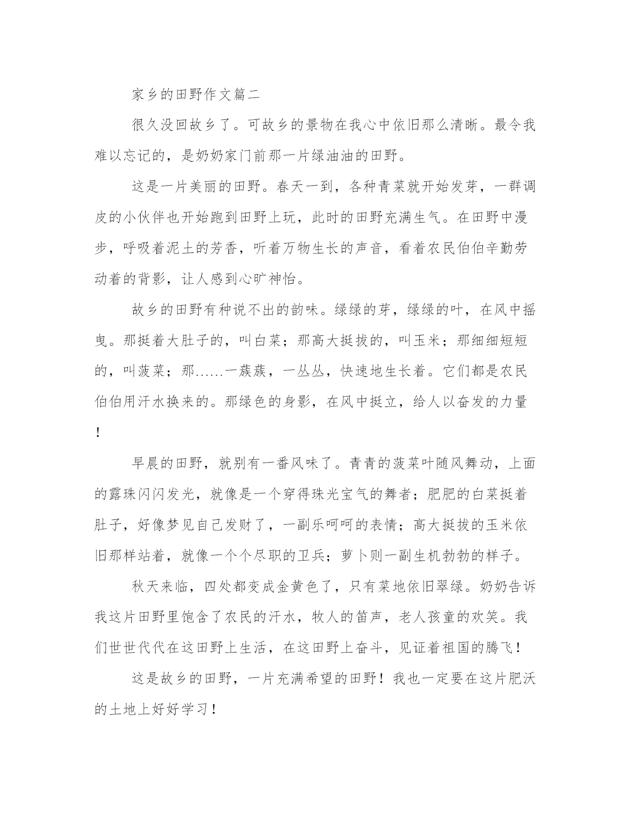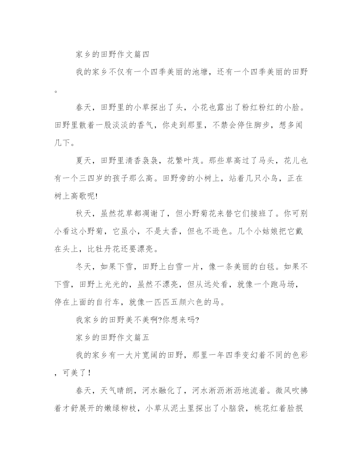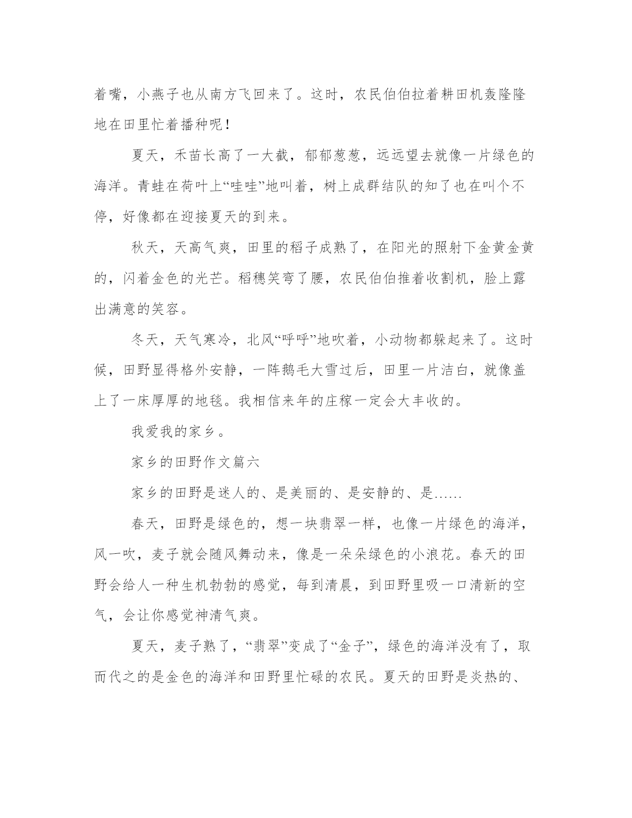 最新家乡的田野作文八篇(通用)在日常学习、工作或生活中,大家总少不了接触作文或者范文吧,通过文章可以把我们那些零零散散的思想,聚集在一块。大家想知道怎么样才能写一篇比较优质的范文吗?这里我整理了一些优秀的范文,希望对大家有所帮助,下面我们就来了解一下吧。家乡的田野作文篇一春天,农民们开始种花生、棉花、地瓜、大稻……田地里的小草也探出头来,好像在给农民伯伯加油鼓劲,到处充满生机。春姑娘还用美丽的花儿给田野编了一个漂亮的花环,让田野更加美丽。夏天,农民们收获了许多小麦。收完小麦,他们又开始播种黄灿灿的玉米,总是忙的顾不上吃饭。夏姑娘给玉米和其他的植物充足的阳光,让它们长得非常茂盛。秋天,田野变成了五彩缤纷的,各种各样的农作物都成熟了,农民们都在忙着丰收呢!秋姑娘等他们收完农作物,接着给田野穿上了金子做的衣裳,田野被她打扮得可漂亮了!冬天,田野被冬姑娘变成了白色,用雪花给它做了一床暖和的被子。田野睡一个冬天后,还要继续长出秧苗、花生……春天时,它的被子将要化成一滴滴的小水滴,滋润田野里的农作物。你看,这就是我家乡的田野,它是不是很美?我觉得,它是全世界最美的地方。家乡的田野作文篇二很久没回故乡了。可故乡的景物在我心中依旧那么清晰。最令我难以忘记的,是奶奶家门前那一片绿油油的田野。这是一片美丽的田野。春天一到,各种青菜就开始发芽,一群调皮的小伙伴也开始跑到田野上玩,此时的田野充满生气。在田野中漫步,呼吸着泥土的芳香,听着万物生长的声音,看着农民伯伯辛勤劳动着的背影,让人感到心旷神怡。故乡的田野有种说不出的韵味。绿绿的芽,绿绿的叶,在风中摇曳。那挺着大肚子的,叫白菜;那高大挺拔的,叫玉米;那细细短短的,叫菠菜;那……一蔟蔟,一丛丛,快速地生长着。它们都是农民伯伯用汗水换来的。那绿色的身影,在风中挺立,给人以奋发的力量!早晨的田野,就别有一番风味了。青青的菠菜叶随风舞动,上面的露珠闪闪发光,就像是一个穿得珠光宝气的舞者;肥肥的白菜挺着肚子,好像梦见自己发财了,一副乐呵呵的表情;高大挺拔的玉米依旧那样站着,就像一个个尽职的卫兵;萝卜则一副生机勃勃的样子。秋天来临,四处都变成金黄色了,只有菜地依旧翠绿。奶奶告诉我这片田野里饱含了农民的汗水,牧人的笛声,老人孩童的欢笑。我们世世代代在这田野上生活,在这田野上奋斗,见证着祖国的腾飞!这是故乡的田野,一片充满希望的田野!我也一定要在这片肥沃的土地上好好学习!家乡的田野作文篇三我的家乡,没有茂密的树林,没有浩荡的洪流,没有高高的山谷,但有那一望无际的田野。我家乡的田野,是那么的美丽,是那么的迷人,又是那么的广阔和富饶!我爱家乡的田野!春天,田野的边上盛开了五颜六色的花儿,蝴蝶在花丛中飞舞嬉戏;田中嫩绿的麦苗经过严冬的百般磨练,终于在春光的照耀下,在春雨的滋润下,把积蓄了一个冬天的力量释放了出来,他们拼命的向上蹿,站在田野边似乎听到了他们蹭蹭向上长的声音,还闻到一股麦苗和泥土混在一起的清香,真令人陶醉啊!夏天,田野里变的更加热闹起来。有亭亭玉立的玉米、高粱,像是守卫田野的卫兵:有矮小的花生,就像哈利。波特里面的小地精;还有开了一树花儿的棉花……轰隆隆,轰隆隆,一阵雨过,田野中的精灵们像是换上了一身更加鲜艳、青翠的衣服,真是美丽有趣极了。秋天,玉米、花生、豆子、棉花、高梁、都成熟了。远远望去,遍地黄金。一切都是那样的美妙。当然,最美的还是秋天的落叶,看,那树叶像一只只五彩的蝴蝶飞向田野,把田野装点的更加迷人。冬天,一片片雪花洒落人间,就像给这田野披上了一层厚厚的被子。走在田间的小路上,看着满是皑皑白雪的田野,感觉家乡的田野真是广阔啊。啊,家乡的田野,我爱你!爱你的美丽,爱你的迷人,爱你的广阔和富饶。我走到天涯海角都不会忘记你的!家乡的田野作文篇四我的家乡不仅有一个四季美丽的池塘,还有一个四季美丽的田野。春天,田野里的小草探出了头,小花也露出了粉红粉红的小脸。田野里散着一股淡淡的香气,你走到那里,不禁会停住脚步,想多闻几下。夏天,田野里清香袅袅,花繁叶茂。那些草高过了马头,花儿也有一个三四岁的孩子那么高。田野旁的小树上,站着几只小鸟,正在树上高歌呢!秋天,虽然花草都凋谢了,但小野菊花来替它们接班了。你可别小看这小野菊,它虽小,不是太香,但也不逊色。几个小姑娘把它戴在头上,比牡丹花还要漂亮。冬天,如果下雪,田野上白雪一片,像一条美丽的白毯。如果不下雪,田野上光光的,虽然不漂亮,但从远处看,就像一个跑马场,停在上面的自行车,就像一匹匹五颜六色的马。我家乡的田野美不美啊?你想来吗?家乡的田野作文篇五我的家乡有一大片宽阔的田野,那里一年四季变幻着不同的色彩,可美了!春天,天气晴朗,河水融化了,河水淅沥淅沥地流着。微风吹拂着才舒展开的嫩绿柳枝,小草从泥土里探出了小脑袋,桃花红着脸抿着嘴,小燕子也从南方飞回来了。这时,
