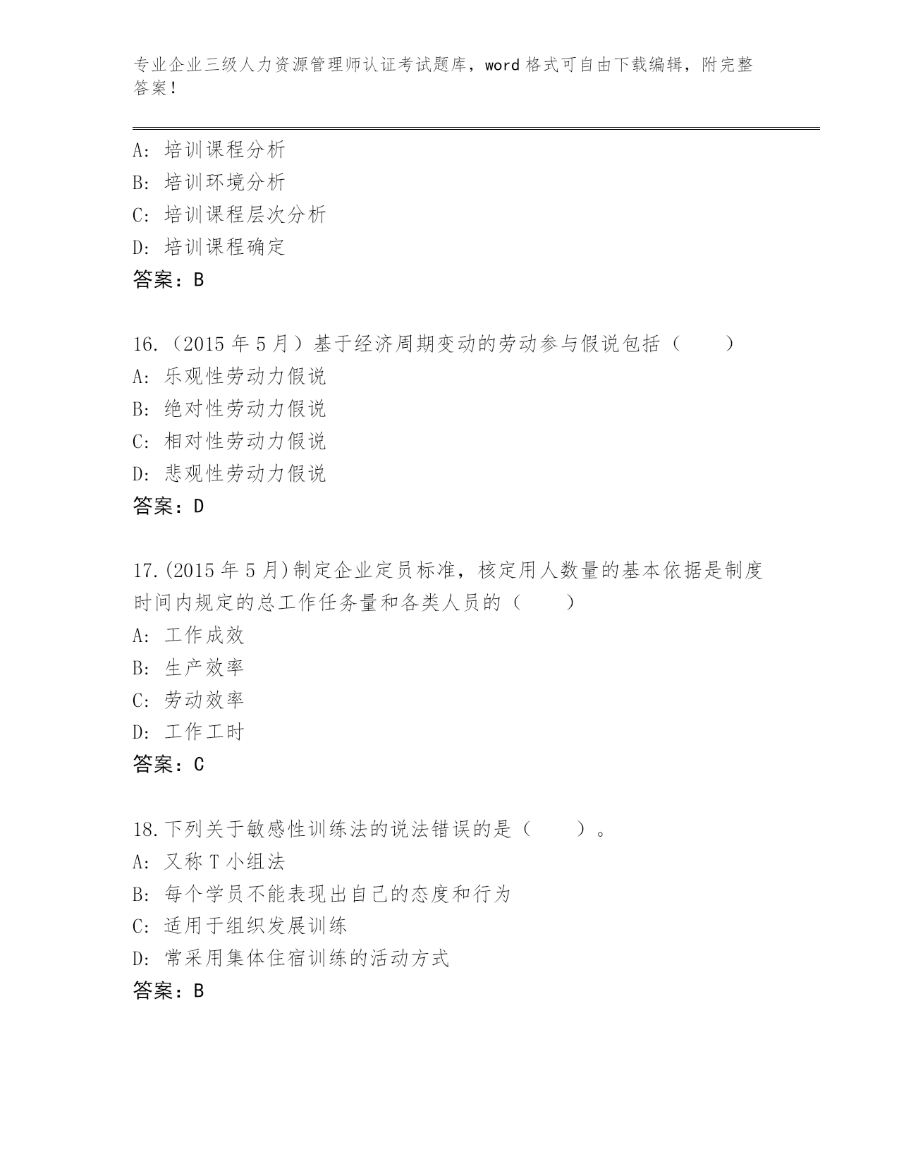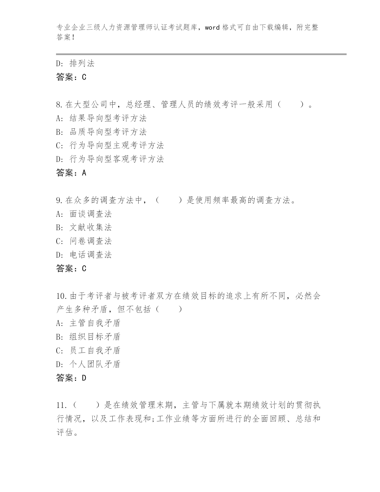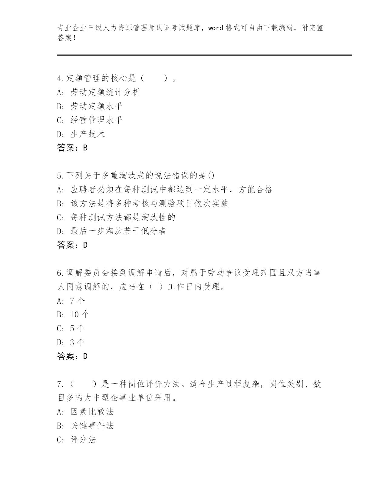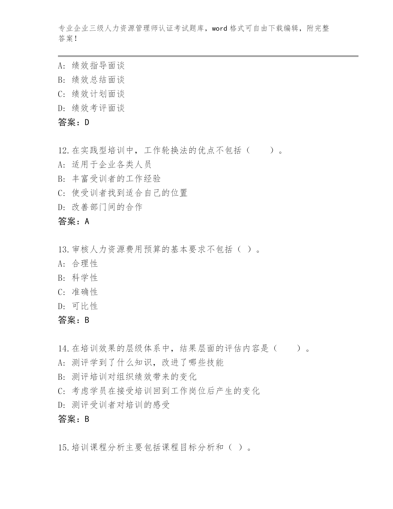 专业企业三级人力资源管理师认证考试题库,word格式可自由下载编辑,附完整答案!2024年贵州省平坝区企业三级人力资源管理师认证考试题库附答案(基础题)第I部分单选题(100题)1.关于提高笔试的有效性应注意的问题说法错误的是()。A:评分要有标准答案B:命题是否恰当C:阅卷及成绩复核D:确定评阅计分规则答案:A2.岗位薪酬体系的设计步骤包括:①确定薪酬策略;②岗位等级划分;③环境分析;④岗位评价;⑤岗位分析;⑥市场薪酬调查;⑦实施与反馈;⑧确定薪酬结构与水平。排序正确的是()。A:③①②④⑤⑦⑥⑧B:③①⑤②④⑥⑦⑧C:①②⑤③④⑥⑧⑦D:③①⑤④②⑥⑧⑦答案:D3.以下关于劳动定员与劳动定额的表述,不正确的是()A:劳动定额采用的劳动时间单位是“工时”、“工日”B:二者的应用范围相同C:二者的计量单位不同D:二者的内涵完全一致答案:B4.定额管理的核心是()。A:劳动定额统计分析B:劳动定额水平C:经营管理水平D:生产技术答案:B5.下列关于多重淘汰式的说法错误的是()A:应聘者必须在每种测试中都达到一定水平,方能合格B:该方法是将多种考核与测验项目依次实施C:每种测试方法都是淘汰性的D:最后一步淘汰若干低分者答案:D6.调解委员会接到调解申请后,对属于劳动争议受理范围且双方当事人同意调解的,应当在()工作日内受理。A:7个B:10个C:5个D:3个答案:D7.()是一种岗位评价方法。适合生产过程复杂,岗位类别、数目多的大中型企事业单位采用。A:因素比较法B:关键事件法C:评分法D:排列法答案:C8.在大型公司中,总经理、管理人员的绩效考评一般采用()。A:结果导向型考评方法B:品质导向型考评方法C:行为导向型主观考评方法D:行为导向型客观考评方法答案:A9.在众多的调查方法中,()是使用频率最高的调查方法。A:面谈调查法B:文献收集法C:问卷调查法D:电话调查法答案:C10.由于考评者与被考评者双方在绩效目标的追求上有所不同,必然会产生多种矛盾,但不包括()A:主管自我矛盾B:组织目标矛盾C:员工自我矛盾D:个人团队矛盾答案:D11.()是在绩效管理末期,主管与下属就本期绩效计划的贯彻执行情况,以及工作表现和;工作业绩等方面所进行的全面回顾、总结和评估。A:绩效指导面谈B:绩效总结面谈C:绩效计划面谈D:绩效考评面谈答案:D12.在实践型培训中,工作轮换法的优点不包括()。A:适用于企业各类人员B:丰富受训者的工作经验C:使受训者找到适合自己的位置D:改善部门间的合作答案:A13.审核人力资源费用预算的基本要求不包括()。A:合理性B:科学性C:准确性D:可比性答案:B14.在培训效果的层级体系中,结果层面的评估内容是()。A:测评学到了什么知识,改进了哪些技能B:测评培训对组织绩效带来的变化C:考虑学员在接受培训回到工作岗位后产生的变化D:测评受训者对培训的感受答案:B15.培训课程分析主要包括课程目标分析和()。A:培训课程分析B:培训环境分析C:培训课程层次分析D:培训课程确定答案:B16.(2015年5月)基于经济周期变动的劳动参与假说包括()A:乐观性劳动力假说B:绝对性劳动力假说C:相对性劳动力假说D:悲观性劳动力假说答案:D17.(2015年5月)制定企业定员标准,核定用人数量的基本依据是制度时间内规定的总工作任务量和各类人员的()A:工作成效B:生产效率C:劳动效率D:工作工时答案:C18.下列关于敏感性训练法的说法错误的是()。A:又称T小组法B:每个学员不能表现出自己的态度和行为C:适用于组织发展训练D:常采用集体住宿训练的活动方式答案:B19.(2018年5月)内部招募的主要方法不包括()。A:广告法B:布告法C:档案法D:推荐法答案:A20.以经验与感觉为基础的学习风格属于()。A:理论型学习B:反思型学习C:应用型学习D:主动型学习答案:D21.某地区最低收入组人均每月生活费用支出为200元,每一就业者赡养系数为2,a为工资整数额,则该地区月最低工资标准为()。A:200+aB:240+aC:150+aD:400+a答案:D22.公文处理模拟法又称()测试,它是经过多年实践检验的一种有效的管理人员的测评方法。A:公文筐B:文件筐C:文件夹D:事件簿答案:A23.下列关于企业组织机构设置的分工协作原则的描述正确的是()。A:不能主动打破分工界限B:任何一级组织只能有一个人负责C:有责无权或责大权小,会导致负不了责任D:做到分工合理、协作明确答案:D24.制定、实施内部劳动规则同时也是用人单位对()和用人单位财产投资者的义务。A:集体B:国家C:企业D:投资答案:B25.(2018年11月)()是指把同一(组)应聘者进行的同一测试分为若干部分加以考察,各部分所得结果之间的一致性。A:外在一致性系数B