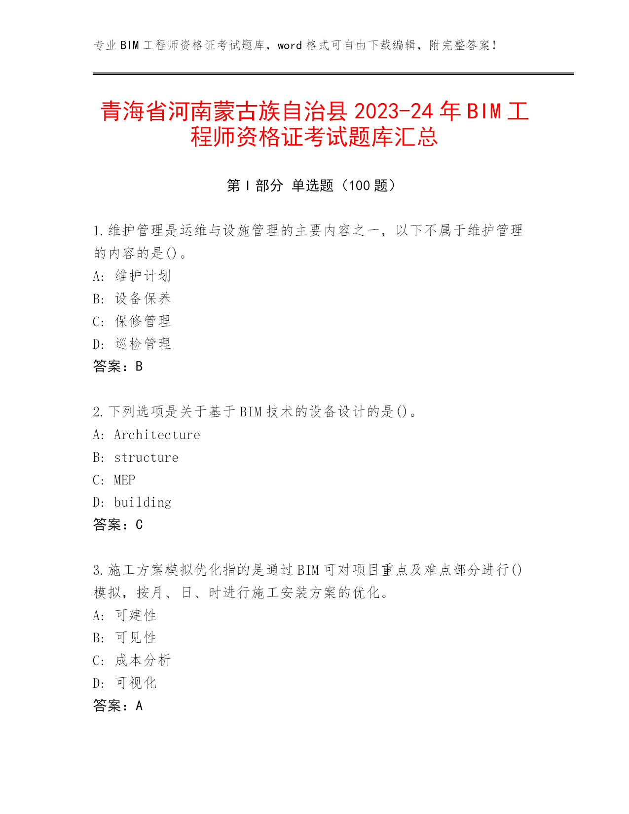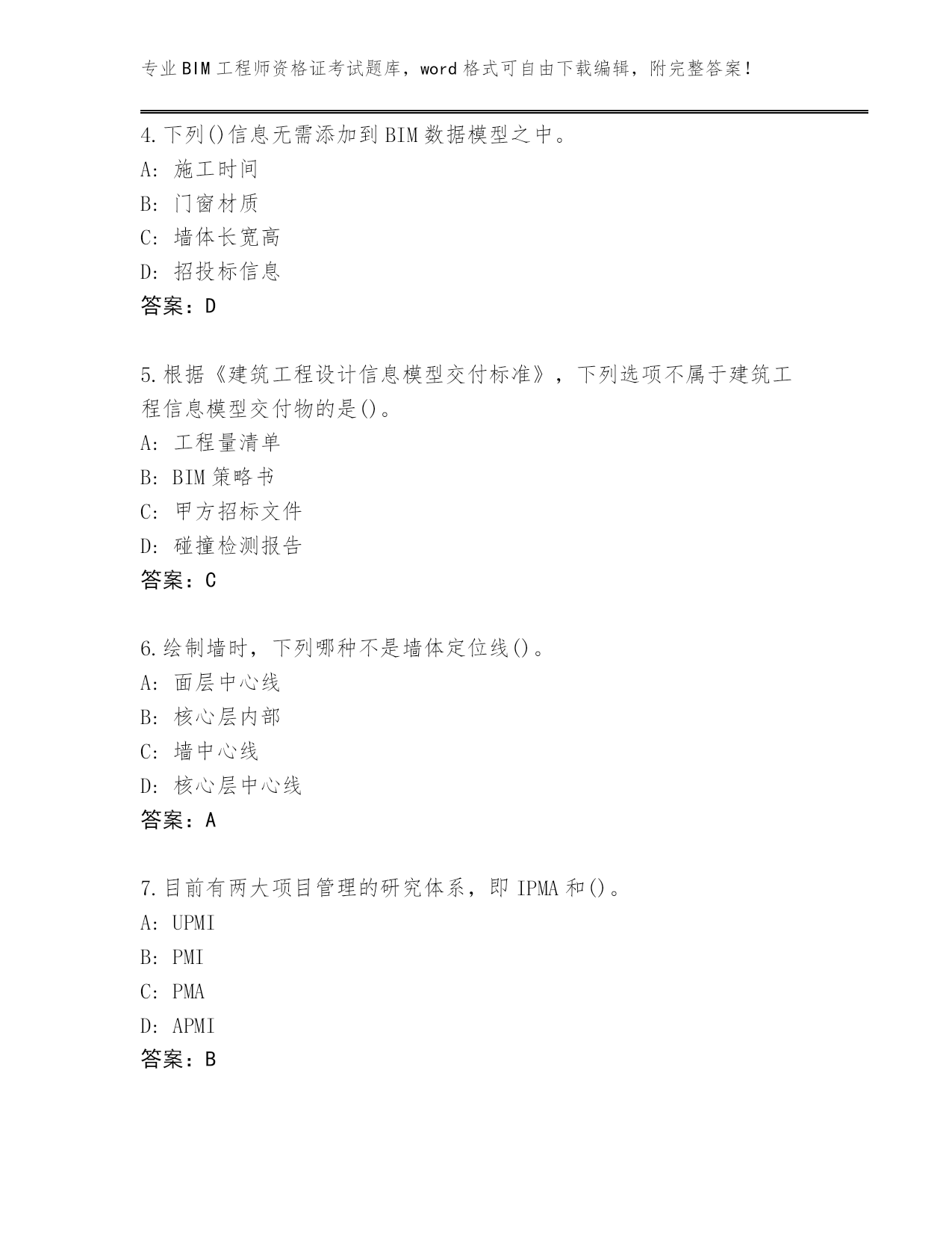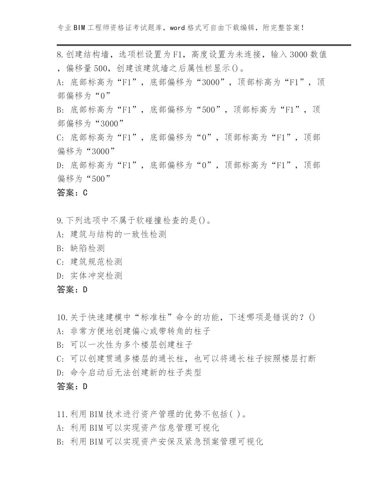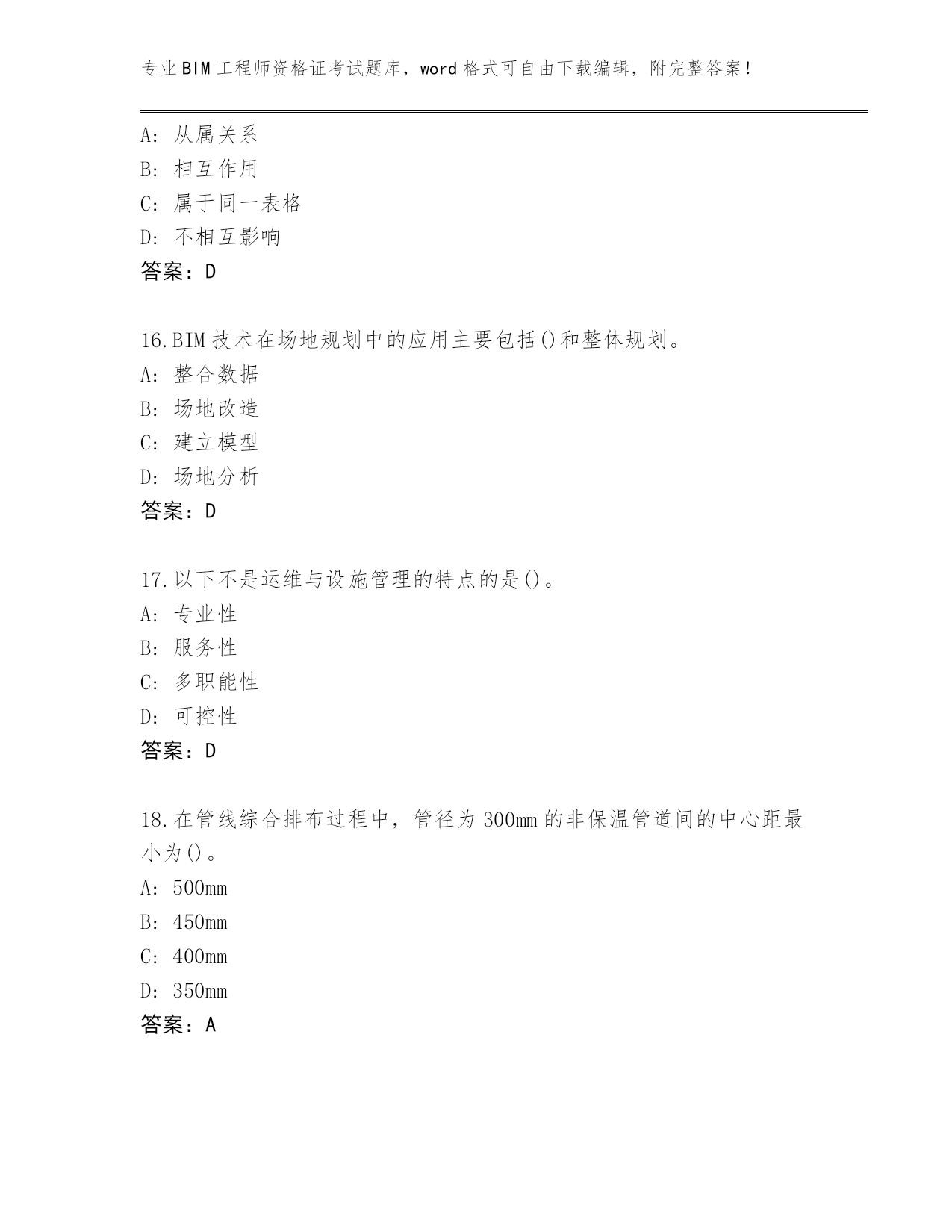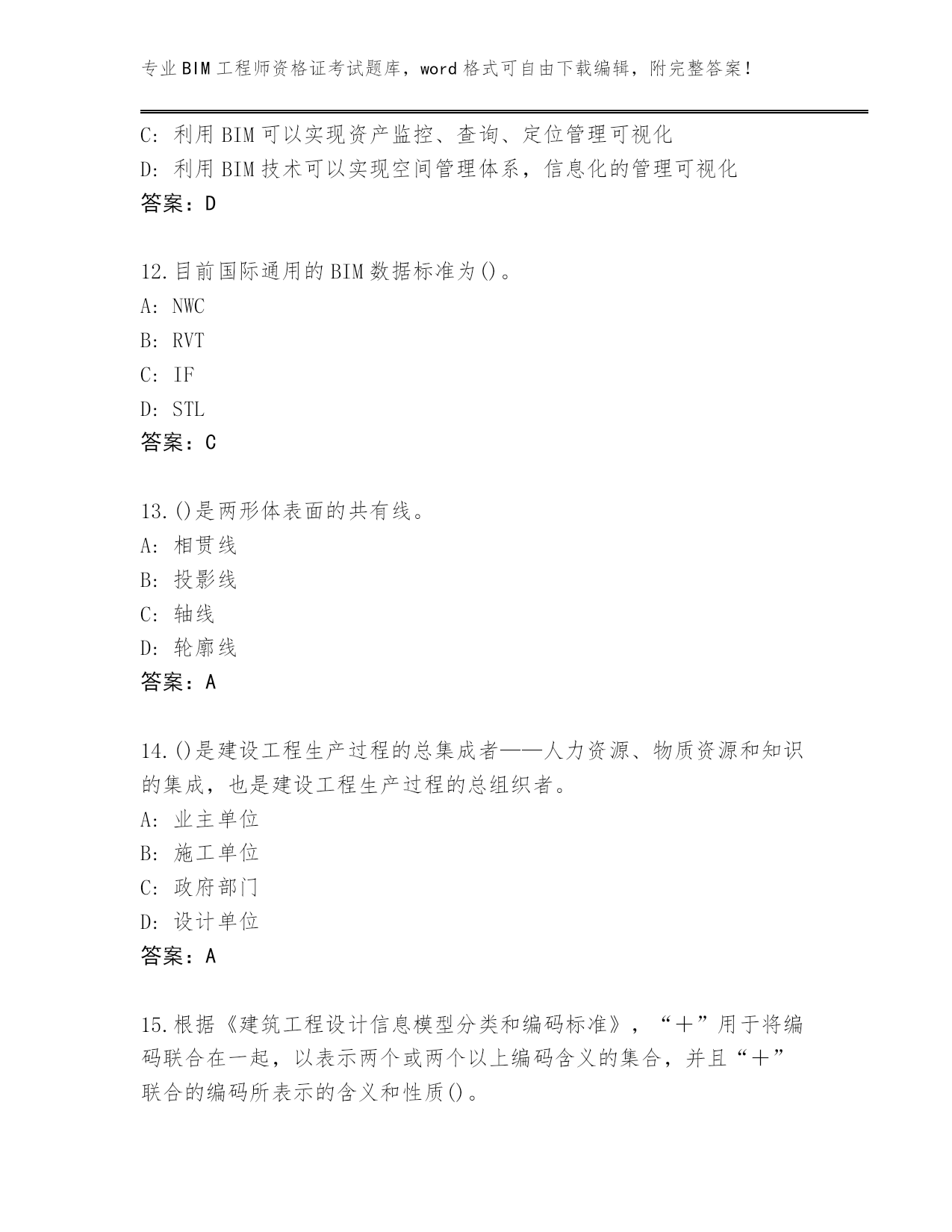 专业BIM工程师资格证考试题库,word格式可自由下载编辑,附完整答案!青海省河南蒙古族自治县2023-24年BIM工程师资格证考试题库汇总第I部分单选题(100题)1.维护管理是运维与设施管理的主要内容之一,以下不属于维护管理的内容的是()。A:维护计划B:设备保养C:保修管理D:巡检管理答案:B2.下列选项是关于基于BIM技术的设备设计的是()。A:ArchitectureB:structureC:MEPD:building答案:C3.施工方案模拟优化指的是通过BIM可对项目重点及难点部分进行()模拟,按月、日、时进行施工安装方案的优化。A:可建性B:可见性C:成本分析D:可视化答案:A4.下列()信息无需添加到BIM数据模型之中。A:施工时间B:门窗材质C:墙体长宽高D:招投标信息答案:D5.根据《建筑工程设计信息模型交付标准》,下列选项不属于建筑工程信息模型交付物的是()。A:工程量清单B:BIM策略书C:甲方招标文件D:碰撞检测报告答案:C6.绘制墙时,下列哪种不是墙体定位线()。A:面层中心线B:核心层内部C:墙中心线D:核心层中心线答案:A7.目前有两大项目管理的研究体系,即IPMA和()。A:UPMIB:PMIC:PMAD:APMI答案:B8.创建结构墙,选项栏设置为F1,高度设置为未连接,输入3000数值,偏移量500,创建该建筑墙之后属性栏显示()。A:底部标高为“F1”,底部偏移为“3000”,顶部标高为“F1”,顶部偏移为“0”B:底部标高为“F1”,底部偏移为“500”,顶部标高为“F1”,顶部偏移为“3000”C:底部标高为“F1”,底部偏移为“0”,顶部标高为“F1”,顶部偏移为“3000”D:底部标高为“F1”,底部偏移为“0”,顶部标高为“F1”,顶部偏移为“500”答案:C9.下列选项中不属于软碰撞检查的是()。A:建筑与结构的一致性检测B:缺陷检测C:建筑规范检测D:实体冲突检测答案:D10.关于快速建模中“标准柱”命令的功能,下述哪项是错误的?()A:非常方便地创建偏心或带转角的柱子B:可以一次性为多个楼层创建柱子C:可以创建贯通多楼层的通长柱,也可以将通长柱子按照楼层打断D:命令启动后无法创建新的柱子类型答案:D11.利用BIM技术进行资产管理的优势不包括()。A:利用BIM可以实现资产信息管理可视化B:利用BIM可以实现资产安保及紧急预案管理可视化C:利用BIM可以实现资产监控、查询、定位管理可视化D:利用BIM技术可以实现空间管理体系,信息化的管理可视化答案:D12.目前国际通用的BIM数据标准为()。A:NWCB:RVTC:IFD:STL答案:C13.()是两形体表面的共有线。A:相贯线B:投影线C:轴线D:轮廓线答案:A14.()是建设工程生产过程的总集成者——人力资源、物质资源和知识的集成,也是建设工程生产过程的总组织者。A:业主单位B:施工单位C:政府部门D:设计单位答案:A15.根据《建筑工程设计信息模型分类和编码标准》,“+”用于将编码联合在一起,以表示两个或两个以上编码含义的集合,并且“+”联合的编码所表示的含义和性质()。A:从属关系B:相互作用C:属于同一表格D:不相互影响答案:D16.BIM技术在场地规划中的应用主要包括()和整体规划。A:整合数据B:场地改造C:建立模型D:场地分析答案:D17.以下不是运维与设施管理的特点的是()。A:专业性B:服务性C:多职能性D:可控性答案:D18.在管线综合排布过程中,管径为300mm的非保温管道间的中心距最小为()。A:500mmB:450mmC:400mmD:350mm答案:A19.目前,BIM与3D打印技术的集成应用主要有三种模式,其中不包括()。A:基于BIM的整体建筑3D打印B:基于BIM的建筑场地3D打印C:基于BIM的模型微缩3D打印D:基于BIM的复杂构件3D打印答案:B20.目前的设计方式多为()设计,各专业分工作业,依赖人工协调项目内容和分段,这也导致设计往往存在专业间的碰撞。A:独立式B:隔断式C:关联式D:连续式答案:B21.在系统浏览器列设置中,以下哪些不可以在电气列中勾选显示?()A:配电系统B:尺寸C:系统类型D:长度答案:B22.关于门的标记,说法正确的是()。A:当整个门可见时,会显示门标记。如果部分门被遮蔽,则门标记还是可见B:复制并粘贴门时,标记中的门编号也不会递增C:仅当整个门可见时,才会显示门标记。如果部分门被遮蔽,则门标记不可见D:当放置相同类型的门时,标记中的门编号不会递增答案:C23.Revit中创建第一个标高1F之后,复制1F标高到上方5000处,生成的新标高名称为()。A:以上都不对B:1GC:2FD:2G答案:B24.下列哪项不是Revit提供的基础形式?()A:基础