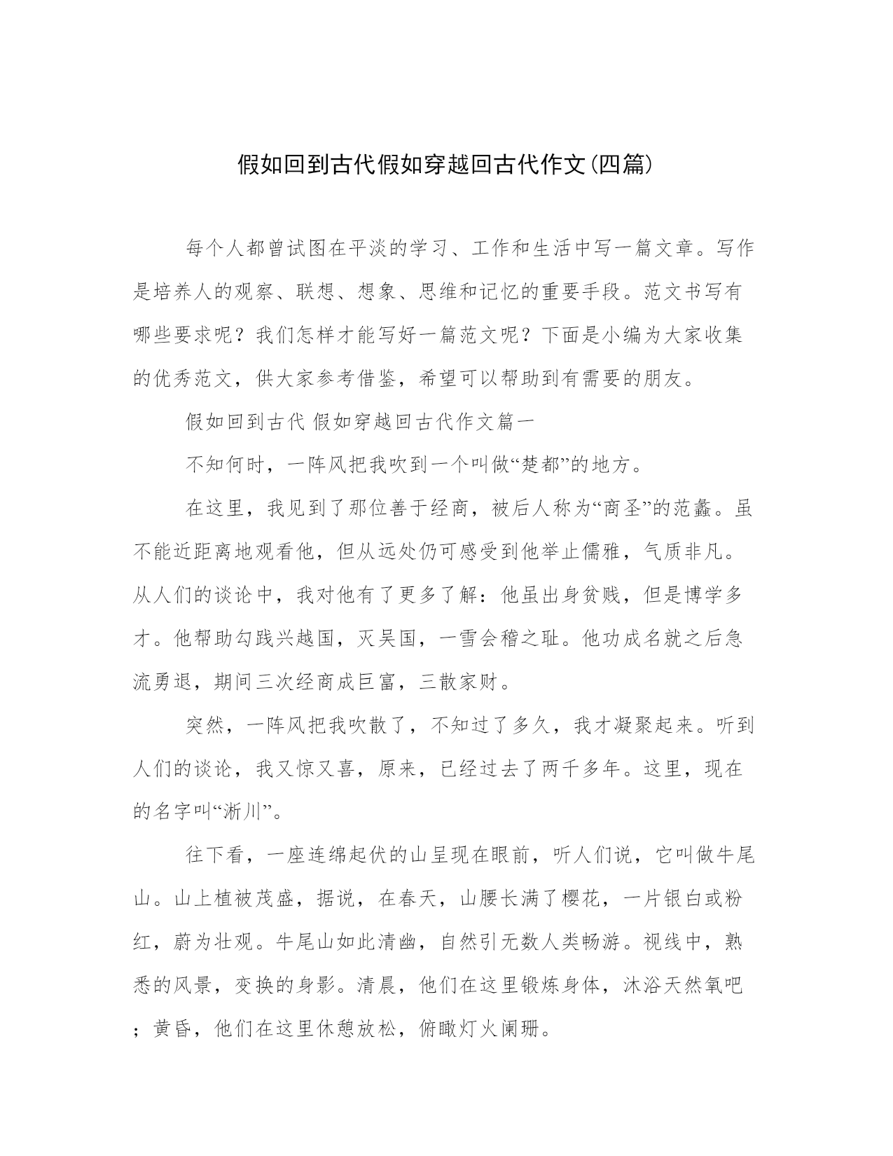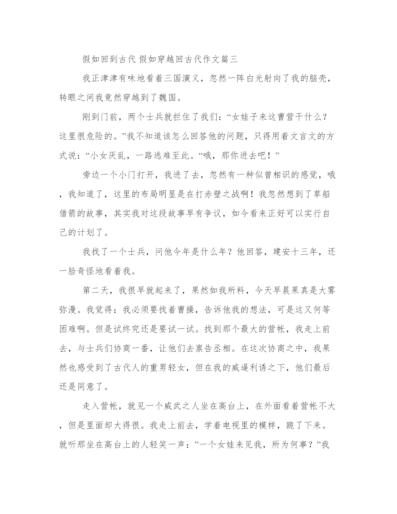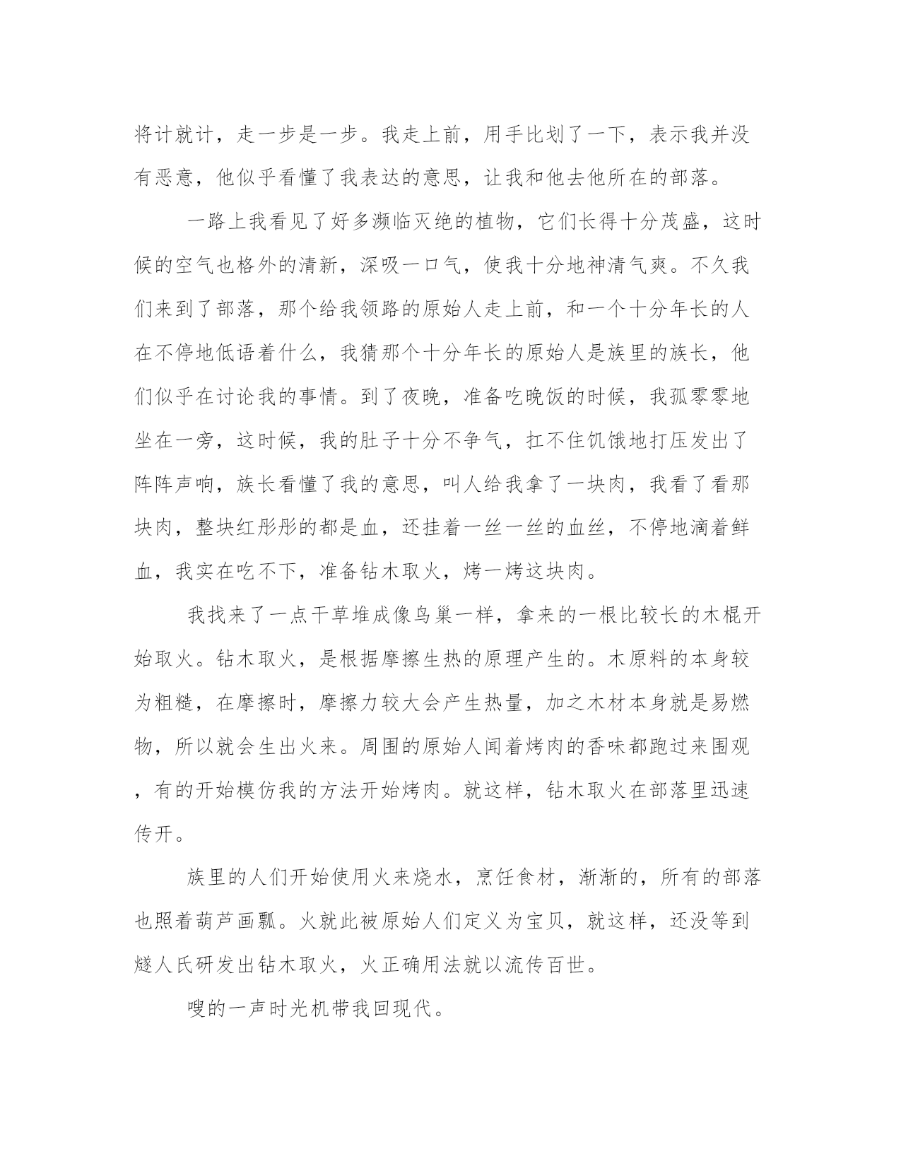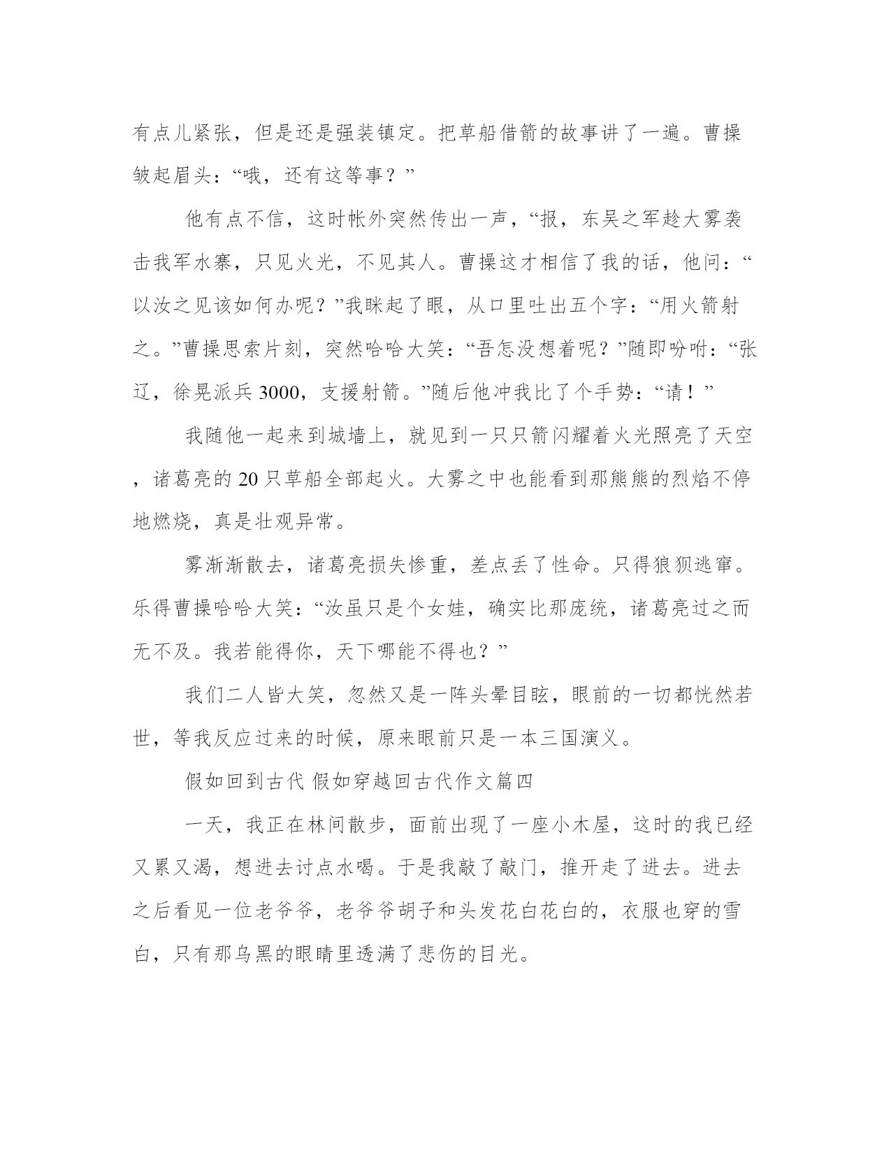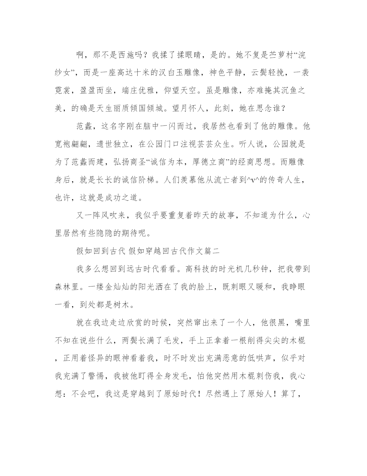 假如回到古代假如穿越回古代作文(四篇)每个人都曾试图在平淡的学习、工作和生活中写一篇文章。写作是培养人的观察、联想、想象、思维和记忆的重要手段。范文书写有哪些要求呢?我们怎样才能写好一篇范文呢?下面是小编为大家收集的优秀范文,供大家参考借鉴,希望可以帮助到有需要的朋友。假如回到古代假如穿越回古代作文篇一不知何时,一阵风把我吹到一个叫做“楚都”的地方。在这里,我见到了那位善于经商,被后人称为“商圣”的范蠡。虽不能近距离地观看他,但从远处仍可感受到他举止儒雅,气质非凡。从人们的谈论中,我对他有了更多了解:他虽出身贫贱,但是博学多才。他帮助勾践兴越国,灭吴国,一雪会稽之耻。他功成名就之后急流勇退,期间三次经商成巨富,三散家财。突然,一阵风把我吹散了,不知过了多久,我才凝聚起来。听到人们的谈论,我又惊又喜,原来,已经过去了两千多年。这里,现在的名字叫“淅川”。往下看,一座连绵起伏的山呈现在眼前,听人们说,它叫做牛尾山。山上植被茂盛,据说,在春天,山腰长满了樱花,一片银白或粉红,蔚为壮观。牛尾山如此清幽,自然引无数人类畅游。视线中,熟悉的风景,变换的身影。清晨,他们在这里锻炼身体,沐浴天然氧吧;黄昏,他们在这里休憩放松,俯瞰灯火阑珊。啊,那不是西施吗?我揉了揉眼睛,是的。她不复是苎萝村“浣纱女”,而是一座高达十米的汉白玉雕像,神色平静,云鬓轻挽,一袭霓裳,盈盈而坐,端庄优雅,仰望天空。虽是雕像,亦难掩其沉鱼之美,的确是天生丽质倾国倾城。望月怀人,此刻,她在思念谁?范蠡,这名字刚在脑中一闪而过,我居然也看到了他的雕像。他宽袍翩翩,遗世独立,在公园门口注视芸芸众生。听人说,公园就是为了范蠡而建,弘扬商圣“诚信为本,厚德立商”的经商思想。而雕像身后,就是长长的诚信阶梯。人们羡慕他从流亡者到^v^的传奇人生,也许,这就是成功之道。又一阵风吹来,我似乎要重复着昨天的故事,不知道为什么,心里居然有些隐隐的期待呢。假如回到古代假如穿越回古代作文篇二我多么想回到远古时代看看。高科技的时光机几秒钟,把我带到森林里。一缕金灿灿的阳光洒在了我的脸上,既刺眼又暖和,我睁眼一看,到处都是树木。就在我边走边欣赏的时候,突然窜出来了一个人,他很黑,嘴里不知在说些什么,两鬓长满了毛发,手上正拿着一根削得尖尖的木棍,正用着怪异的眼神看着我,时不时发出充满恶意的低哄声,似乎对我充满了警惕,我被他盯得全身发毛,怕他突然用木棍刺伤我,我心想:不会吧,我这是穿越到了原始时代!尽然遇上了原始人!算了,将计就计,走一步是一步。我走上前,用手比划了一下,表示我并没有恶意,他似乎看懂了我表达的意思,让我和他去他所在的部落。一路上我看见了好多濒临灭绝的植物,它们长得十分茂盛,这时候的空气也格外的清新,深吸一口气,使我十分地神清气爽。不久我们来到了部落,那个给我领路的原始人走上前,和一个十分年长的人在不停地低语着什么,我猜那个十分年长的原始人是族里的族长,他们似乎在讨论我的事情。到了夜晚,准备吃晚饭的时候,我孤零零地坐在一旁,这时候,我的肚子十分不争气,扛不住饥饿地打压发出了阵阵声响,族长看懂了我的意思,叫人给我拿了一块肉,我看了看那块肉,整块红彤彤的都是血,还挂着一丝一丝的血丝,不停地滴着鲜血,我实在吃不下,准备钻木取火,烤一烤这块肉。我找来了一点干草堆成像鸟巢一样,拿来的一根比较长的木棍开始取火。钻木取火,是根据摩擦生热的原理产生的。木原料的本身较为粗糙,在摩擦时,摩擦力较大会产生热量,加之木材本身就是易燃物,所以就会生出火来。周围的原始人闻着烤肉的香味都跑过来围观,有的开始模仿我的方法开始烤肉。就这样,钻木取火在部落里迅速传开。族里的人们开始使用火来烧水,烹饪食材,渐渐的,所有的部落也照着葫芦画瓢。火就此被原始人们定义为宝贝,就这样,还没等到燧人氏研发出钻木取火,火正确用法就以流传百世。嗖的一声时光机带我回现代。假如回到古代假如穿越回古代作文篇三我正津津有味地看着三国演义,忽然一阵白光射向了我的脑壳,转眼之间我竟然穿越到了魏国。刚到门前,两个士兵就拦住了我们:“女娃子来这曹营干什么?这里很危险的。”我不知道该怎么回答他的问题,只得用着文言文的方式说:“小女厌乱,一路逃难至此。“哦,那你进去吧!”旁边一个小门打开,我进了去,忽然有一种似曾相识的感觉,哦,我知道了,这里的布局明显是在打赤壁之战啊!我忽然想到了草船借箭的故事,其实我对这段故事早有争议,如今看来正好可以实行自己的计划了。我找了一个士兵,问他今年是什么年?他回答,建安十三年,还一脸奇怪地看着我。第二天,我很早就起来了,果然如我所料,今天早晨果真是大雾弥漫。我觉得:我必须要找着曹操,告诉他我的想法,可是这又何等困难啊。但是试终究还是要试一试。找到那个最大的营帐,我走上前去,与士兵们协商一番,让他们去禀告丞相。在这次协商之中,我果