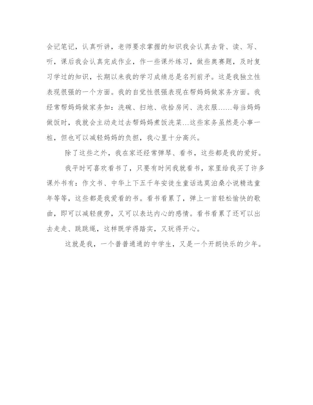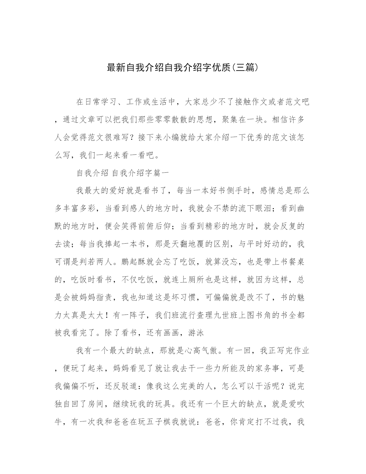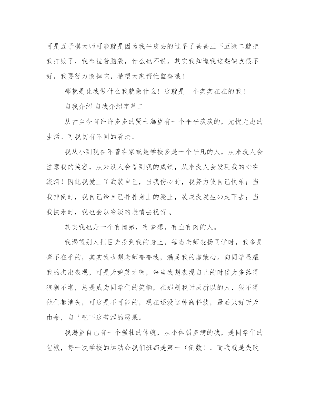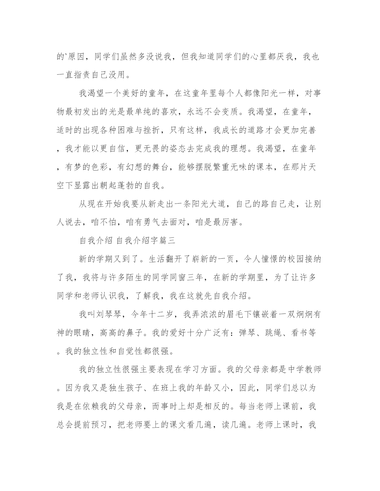 最新自我介绍自我介绍字优质(三篇)在日常学习、工作或生活中,大家总少不了接触作文或者范文吧,通过文章可以把我们那些零零散散的思想,聚集在一块。相信许多人会觉得范文很难写?接下来小编就给大家介绍一下优秀的范文该怎么写,我们一起来看一看吧。自我介绍自我介绍字篇一我最大的爱好就是看书了,每当一本好书侧手时,感情总是那么多丰富多彩,当看到感人的地方时,我就会不禁的流下眼泪;看到幽默的地方时,便会笑得前俯后仰;当看到精彩的地方时,就会反复的去读;每当我捧起一本书,那是天翻地覆的区别,与平时好动的,我可谓是判若两人。鹏起酥就会忘了吃饭,就算没忘,也是带上书餐桌的,吃饭时看书,不仅吃饭,就连上厕所也是这样,就因为这样,总是会被妈妈指责,我也知道这是坏习惯,可偏偏就是改不了,书的魅力太真是太大!有一阵子,我们班流行查理九世班上图书角的书全都被我看完了。除了看书,还有画画,游泳我有一个最大的缺点,那就是心高气傲。有一回,我正写完作业,便玩了起来,妈妈看见了就让我去干一些力所能及的家务事,可是我偏偏不听,还反驳道:像我这么完美的人,怎么可以干活呢?说完独自回了房间,继续玩我的玩具。我还有一个巨大的缺点,就是爱吹牛,有一次我和爸爸在玩五子棋我就说:爸爸,你肯定打不过我,我可是五子棋大师可能就是因为我牛皮去的过早了爸爸三下五除二就把我打败了,我耷拉着脑袋,什么也不说。其实我知道我这些缺点很不好,我要努力改掉它,希望大家帮忙监督哦!那就是让我做什么我就做什么!这就是一个实实在在的我!自我介绍自我介绍字篇二从古至今有许许多多的贤士渴望有一个平平淡淡的,无忧无虑的生活。可我切有不同的看法。我从小到现在不管在家或是学校多是一个平凡的人,从来没人会注意我的笑容,从来没人会看到我的成绩,从来没人会发现我的心在流泪!因此我爱上了武装自己,当我伤心时,我努力使自己快乐;当我摔倒时,我自己给自己扑扑身上的泥土,装成没发生の走下去;当我快乐时,我也会以冷淡的表情去祝贺。其实我也是一个有情感,有梦想,有血有肉的人。我渴望别人把目光投到我的身上,每当老师表扬同学时,我多是毫不在乎的,其实我也想老师夸夸我,满足我的虚荣心。向同学显耀我的杰出表现,可是天妒英才啊,每当我想表现自己的时候大多落得狼狈不堪,总是成为同学们的笑柄,在那刻我讨厌所以的人,狠不得他们都消失,可这是不可能的,现在还没这种高科技,最后只好听天由命,自己吃下这苦涩的恶果。我渴望自己有一个强壮的体魄,从小体弱多病的我,是同学们的包袱,每一次学校的运动会我们班都是第一(倒数)。而我就是失败的`原因,同学们虽然多没说我,但我知道同学们的心里都厌我,我也一直指责自己没用。我渴望一个美好的童年,在这童年里每个人都像阳光一样,对事物最初发出的光是最单纯的喜欢,永远不会变质。我渴望,在童年,适时的出现各种困难与挫折,只有这样,我成长的道路才会更加完善,我才能以更自信,更无畏的姿态去完成我的理想。我渴望,在童年,有梦的色彩,有幻想的舞台,能够摆脱繁重无味的课本,在那片天空下显露出朝起蓬勃的自我。从现在开始我要从新走出一条阳光大道,自己的路自己走,让别人说去,咱不怕,咱有勇气去面对,咱是最厉害。自我介绍自我介绍字篇三新的学期又到了。生活翻开了崭新的一页,令人憧憬的校园接纳了我,我将与许多陌生的同学同窗三年,在新的学期里,为了让许多同学和老师认识我,了解我,我在这就先自我介绍。我叫刘琴琴,今年十二岁,我弄浓浓的眉毛下镶嵌着一双炯炯有神的眼睛,高高的鼻子。我的爱好十分广泛有:弹琴、跳绳、看书等。我的独立性和自觉性都很强。我的独立性很强主要表现在学习方面。我的父母亲都是中学教师。因为我又是独生孩子、在班上我的年龄又小,因此,同学们总以为我是在依赖我的父母亲,而事时上却是相反的。每当老师上课前,我总会提前预习,把老师要上的课文看几遍,读几遍。老师上课时,我会记笔记,认真听讲,老师要求掌握的知识我会认真去背、读、写、听,课后我会认真完成作业,作一些课外练习,做些奥赛题,及时复习学过的知识,长期以来我的学习成绩总是名列前矛。这是我独立性表现很强的一个方面。我的自觉性很强表现在帮妈妈做家务方面。我经常帮妈妈做家务如:洗碗、扫地、收拾房间、洗衣服……每当妈妈做饭时,我就会主动走过去帮妈妈煮饭洗菜…这些家务虽然是小事一桩,但也可以减轻妈妈的负担,我心里十分高兴。除了这些之外,我在家还经常弹琴、看书,这些都是我的爱好。我平时可喜欢看书了,只要有时间我就看书,家里给我买了许多课外书有:作文书、中华上下五千年安徒生童话选莫泊桑小说精选童年等等,这些都是我爱看的书。看书看累了,弹上一首轻松愉快的歌曲,即可以减轻疲劳,又可以表达内心的感情。看书看累了还可以出去走走、跳跳绳,这样既学得踏实,又玩得开心。这就是我,一个普普通通的中学生,又是一个开朗快乐的少年。