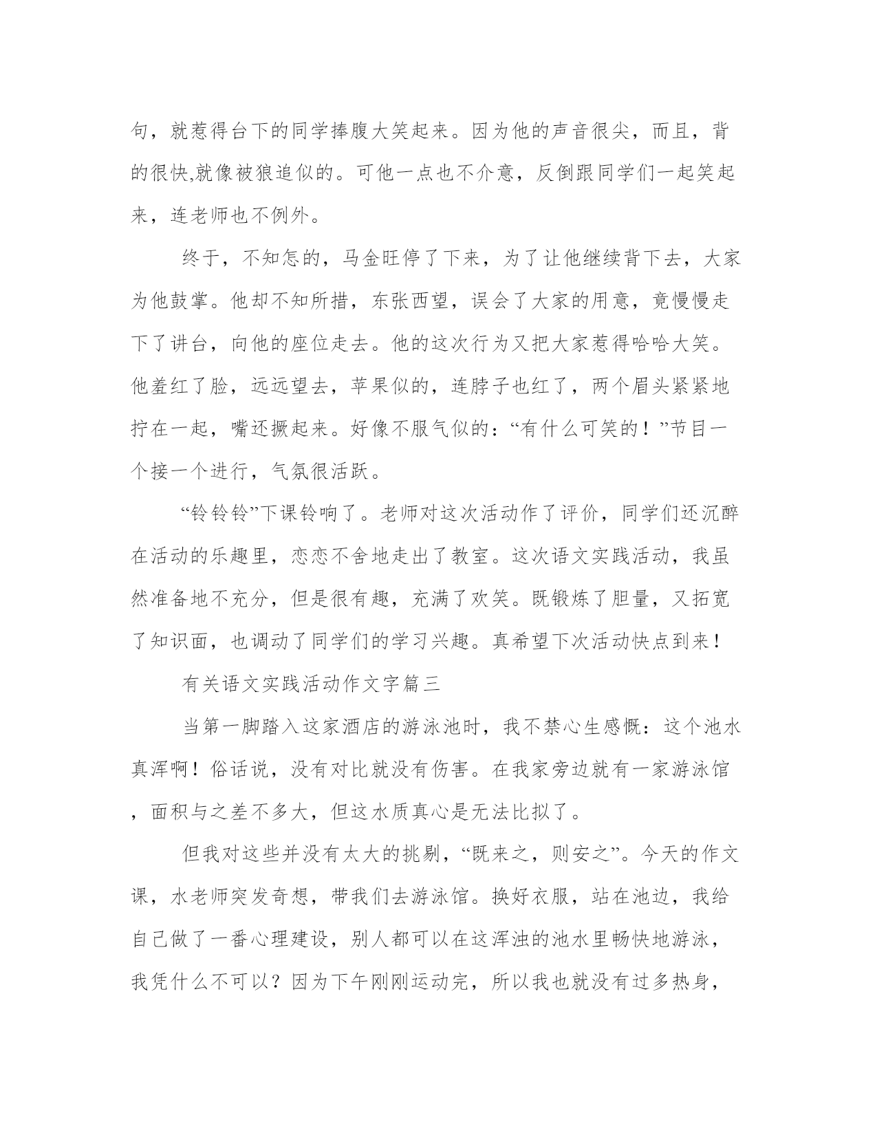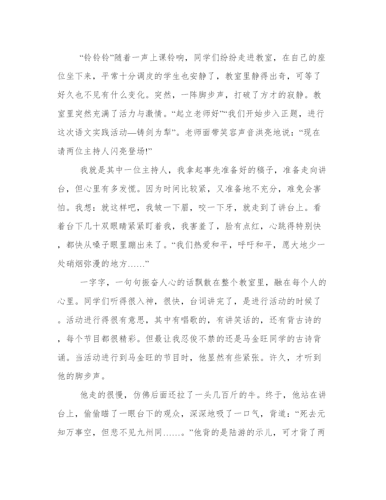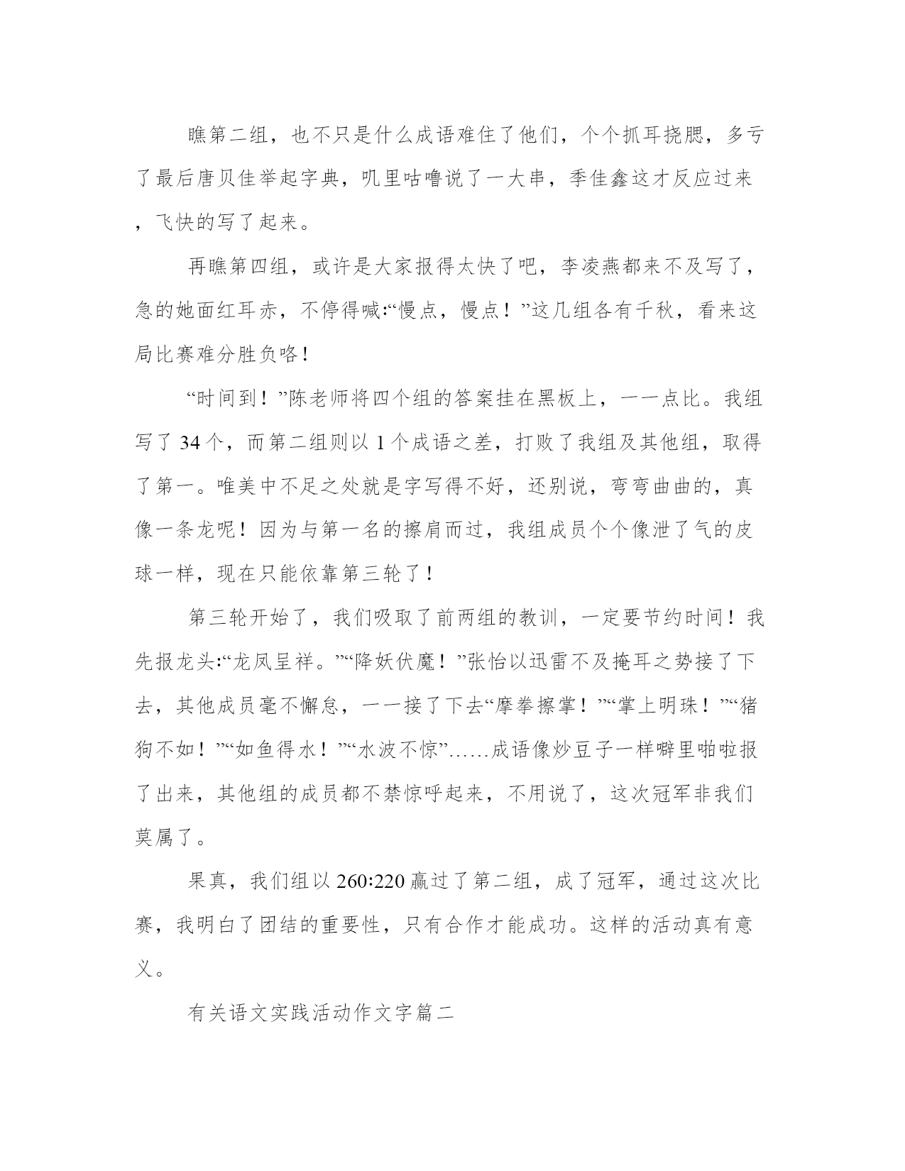 2023年有关语文实践活动作文字实用(三篇)在日常学习、工作或生活中,大家总少不了接触作文或者范文吧,通过文章可以把我们那些零零散散的思想,聚集在一块。范文怎么写才能发挥它最大的作用呢?这里我整理了一些优秀的范文,希望对大家有所帮助,下面我们就来了解一下吧。有关语文实践活动作文字篇一这次的比赛分三个环节,一、自由抢接成语,二、小组合作限时成语接龙,三、小组内成语接龙展示。我们组都信心满满的,因为小爱因斯坦——张焱敏博士在我们这儿呢!我们组成员可谓是个个高枕无忧啊!不过第一轮,我组未进入状态,只得了40分,呜呜,白白把第一名的机会让给了第二组。第二轮是小组限时合作成语接龙,陈老师说这次可以查工具书。我组同学聚在一起,发誓非争个第一不可。老师出题了∶“人山人海。”我组迅速思考起来∶“海底捞针——针锋相对——对牛弹琴——情同手足——足智多谋——谋权篡位——蔚为壮观——鳏寡孤独——独一无二——二龙戏珠……”我组思绪如涌泉,妙笔下生花,查工具书的查工具书,写字的写字,好生忙啊!我见组员思绪不断,下面应该没什么问题了吧。我趁空闲之处,向四处张望,嘻嘻,其他几组真有趣!瞧第二组,也不只是什么成语难住了他们,个个抓耳挠腮,多亏了最后唐贝佳举起字典,叽里咕噜说了一大串,季佳鑫这才反应过来,飞快的写了起来。再瞧第四组,或许是大家报得太快了吧,李凌燕都来不及写了,急的她面红耳赤,不停得喊∶“慢点,慢点!”这几组各有千秋,看来这局比赛难分胜负咯!“时间到!”陈老师将四个组的答案挂在黑板上,一一点比。我组写了34个,而第二组则以1个成语之差,打败了我组及其他组,取得了第一。唯美中不足之处就是字写得不好,还别说,弯弯曲曲的,真像一条龙呢!因为与第一名的擦肩而过,我组成员个个像泄了气的皮球一样,现在只能依靠第三轮了!第三轮开始了,我们吸取了前两组的教训,一定要节约时间!我先报龙头∶“龙凤呈祥。”“降妖伏魔!”张怡以迅雷不及掩耳之势接了下去,其他成员毫不懈怠,一一接了下去“摩拳擦掌!”“掌上明珠!”“猪狗不如!”“如鱼得水!”“水波不惊”……成语像炒豆子一样噼里啪啦报了出来,其他组的成员都不禁惊呼起来,不用说了,这次冠军非我们莫属了。果真,我们组以260∶220赢过了第二组,成了冠军,通过这次比赛,我明白了团结的重要性,只有合作才能成功。这样的活动真有意义。有关语文实践活动作文字篇二“铃铃铃”随着一声上课铃响,同学们纷纷走进教室,在自己的座位坐下来,平常十分调皮的学生也安静了,教室里静得出奇,可等了好久也不见有什么变化。突然,一阵脚步声,打破了方才的寂静。教室里突然充满了活力与激情。“起立老师好”“我们开始步入正题,进行这次语文实践活动—铸剑为犁”。老师面带笑容声音洪亮地说:“现在请两位主持人闪亮登场!”我就是其中一位主持人,我拿起事先准备好的稿子,准备走向讲台,但心里有多发慌。因为时间比较紧,又准备地不充分,难免会害怕。我想:就这样吧,我皱一下眉,咬一下牙,就走到了讲台上。看着台下几十双眼睛紧紧盯着我,我害羞了,脸有点红,心跳得特别快,都快从嗓子眼里蹦出来了。“我们热爱和平,呼吁和平,愿大地少一处硝烟弥漫的地方……”一字字,一句句振奋人心的话飘散在整个教室里,融在每个人的心里。同学们听得很入神,很快,台词讲完了,是进行活动的时候了。活动进行得很有意思,其中有唱歌的,有讲笑话的,还有背古诗的,每个节目都很精彩。但最让我忍俊不禁的还是马金旺同学的古诗背诵。当活动进行到马金旺的节目时,他显然有些紧张。许久,才听到他的脚步声。他走的很慢,仿佛后面还拉了一头几百斤的牛。终于,他站在讲台上,偷偷瞄了一眼台下的观众,深深地吸了一口气,背道:“死去元知万事空,但悲不见九州同……。”他背的是陆游的示儿,可才背了两句,就惹得台下的同学捧腹大笑起来。因为他的声音很尖,而且,背的很快,就像被狼追似的。可他一点也不介意,反倒跟同学们一起笑起来,连老师也不例外。终于,不知怎的,马金旺停了下来,为了让他继续背下去,大家为他鼓掌。他却不知所措,东张西望,误会了大家的用意,竟慢慢走下了讲台,向他的座位走去。他的这次行为又把大家惹得哈哈大笑。他羞红了脸,远远望去,苹果似的,连脖子也红了,两个眉头紧紧地拧在一起,嘴还撅起来。好像不服气似的:“有什么可笑的!”节目一个接一个进行,气氛很活跃。“铃铃铃”下课铃响了。老师对这次活动作了评价,同学们还沉醉在活动的乐趣里,恋恋不舍地走出了教室。这次语文实践活动,我虽然准备地不充分,但是很有趣,充满了欢笑。既锻炼了胆量,又拓宽了知识面,也调动了同学们的学习兴趣。真希望下次活动快点到来!有关语文实践活动作文字篇三当第一脚踏入这家酒店的游泳池时,我不禁心生感慨:这个池水真浑啊!俗话说,没有对比就没有伤害。在我家旁边就有一家游泳馆,面积与之差不多大,但这水质真心