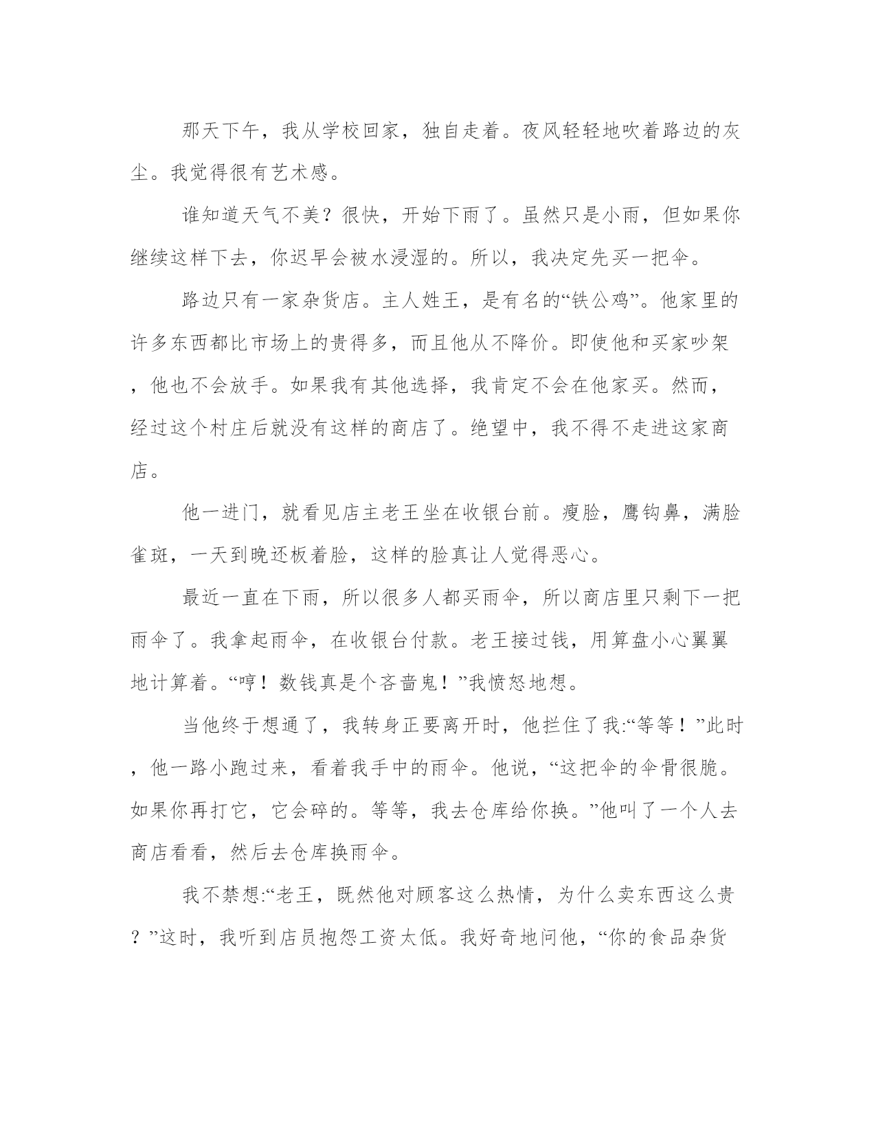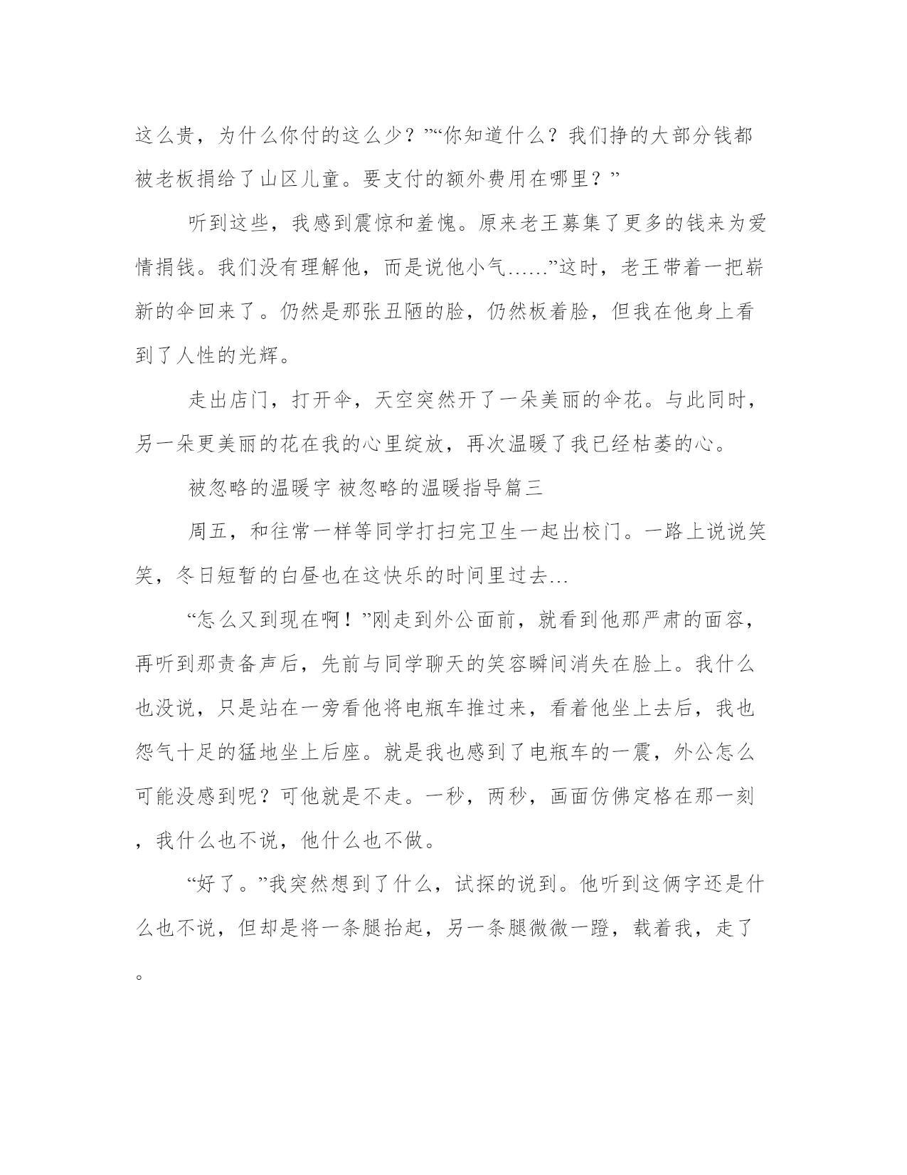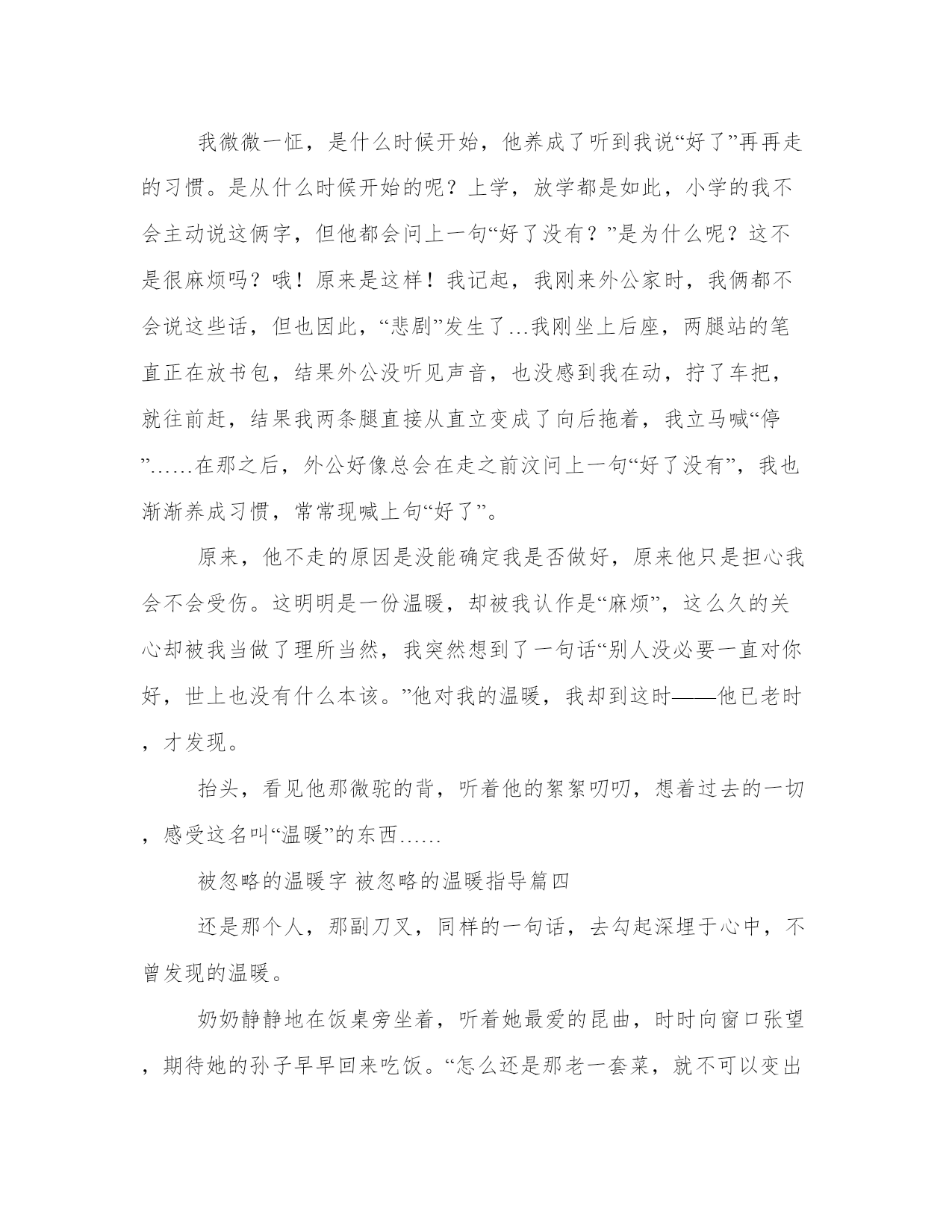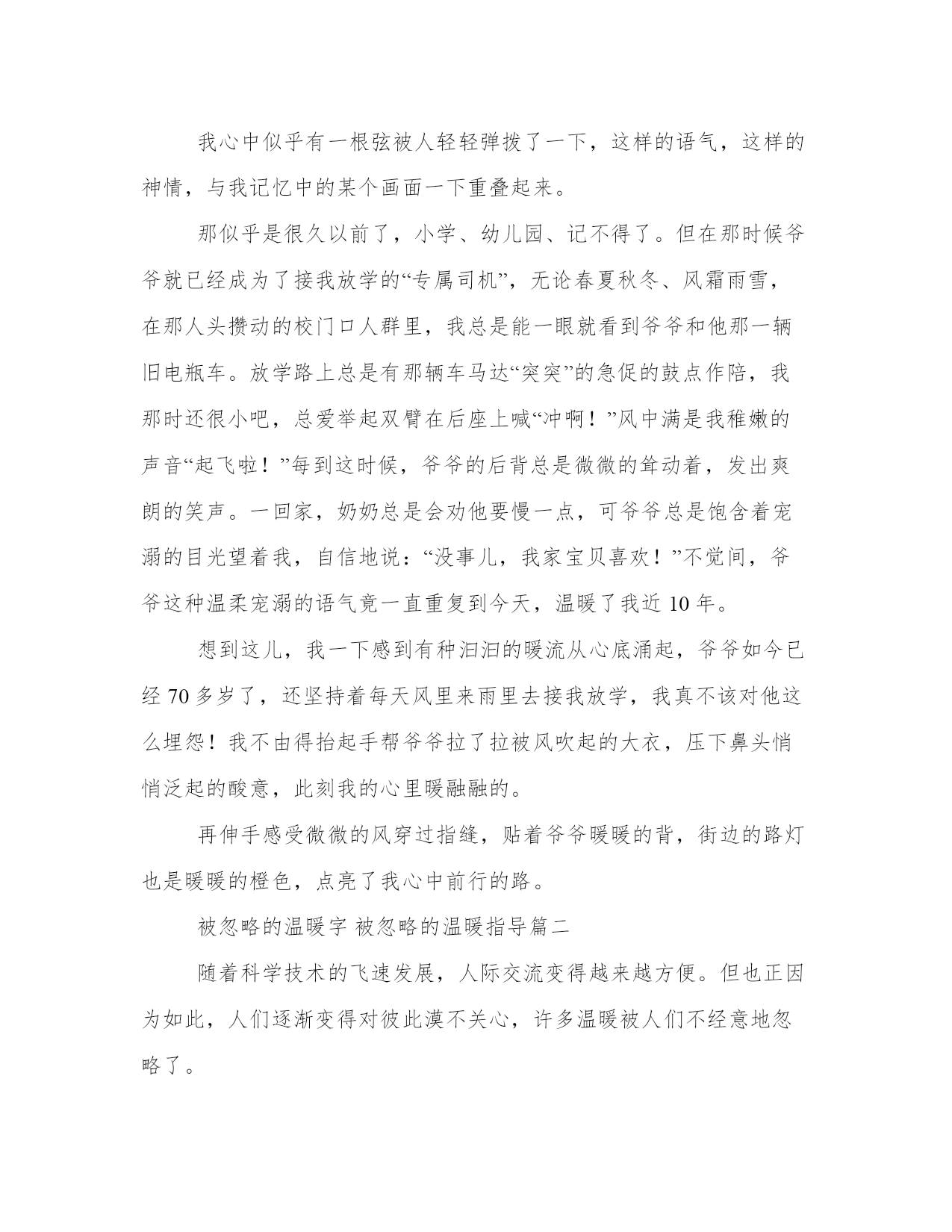 最新被忽略的温暖字被忽略的温暖指导(优秀五篇)人的记忆力会随着岁月的流逝而衰退,写作可以弥补记忆的不足,将曾经的人生经历和感悟记录下来,也便于保存一份美好的回忆。那么我们该如何写一篇较为完美的范文呢?接下来小编就给大家介绍一下优秀的范文该怎么写,我们一起来看一看吧。被忽略的温暖字被忽略的温暖指导篇一时值数九寒冬,天黑的时刻总是赶在我放学之前,日复一日,记不清已经多少次这样踏出校门——肩上是沉甸甸的书包,心里只觉得喘不过气来。一出校门,我照例看到了昏黄路灯下爷爷那模糊的脸,那上头尽是岁月留下的沧桑。我什么也不说,跨上车后座,爷爷乐呵呵地发出一声吆喝:“走咯!”只听爷爷那辆颇有些年纪的旧电瓶车马达发出富有节奏的“突突”的声音,一路向前。我不去管耳边拂过的寒风,脑海中尽是今天晚上的作业,语文背书、数学刷题、英语卷子……一项一项细细数过,我的心中充斥着一股特别的烦闷。当我觉察到被旁边的一辆自行车给超过了,积压在我心里的烦躁情绪一下涌出来,“怎么走这么慢!”我的语气满是戾气,“不知道我作业很多吗?晚上还能不能睡觉了?”被我埋怨的爷爷却好像没听出我的恼怒,仍然笑呵呵地说“慢点好啊,慢点安全。”我心中似乎有一根弦被人轻轻弹拨了一下,这样的语气,这样的神情,与我记忆中的某个画面一下重叠起来。那似乎是很久以前了,小学、幼儿园、记不得了。但在那时候爷爷就已经成为了接我放学的“专属司机”,无论春夏秋冬、风霜雨雪,在那人头攒动的校门口人群里,我总是能一眼就看到爷爷和他那一辆旧电瓶车。放学路上总是有那辆车马达“突突”的急促的鼓点作陪,我那时还很小吧,总爱举起双臂在后座上喊“冲啊!”风中满是我稚嫩的声音“起飞啦!”每到这时候,爷爷的后背总是微微的耸动着,发出爽朗的笑声。一回家,奶奶总是会劝他要慢一点,可爷爷总是饱含着宠溺的目光望着我,自信地说:“没事儿,我家宝贝喜欢!”不觉间,爷爷这种温柔宠溺的语气竟一直重复到今天,温暖了我近10年。想到这儿,我一下感到有种汩汩的暖流从心底涌起,爷爷如今已经70多岁了,还坚持着每天风里来雨里去接我放学,我真不该对他这么埋怨!我不由得抬起手帮爷爷拉了拉被风吹起的大衣,压下鼻头悄悄泛起的酸意,此刻我的心里暖融融的。再伸手感受微微的风穿过指缝,贴着爷爷暖暖的背,街边的路灯也是暖暖的橙色,点亮了我心中前行的路。被忽略的温暖字被忽略的温暖指导篇二随着科学技术的飞速发展,人际交流变得越来越方便。但也正因为如此,人们逐渐变得对彼此漠不关心,许多温暖被人们不经意地忽略了。那天下午,我从学校回家,独自走着。夜风轻轻地吹着路边的灰尘。我觉得很有艺术感。谁知道天气不美?很快,开始下雨了。虽然只是小雨,但如果你继续这样下去,你迟早会被水浸湿的。所以,我决定先买一把伞。路边只有一家杂货店。主人姓王,是有名的“铁公鸡”。他家里的许多东西都比市场上的贵得多,而且他从不降价。即使他和买家吵架,他也不会放手。如果我有其他选择,我肯定不会在他家买。然而,经过这个村庄后就没有这样的商店了。绝望中,我不得不走进这家商店。他一进门,就看见店主老王坐在收银台前。瘦脸,鹰钩鼻,满脸雀斑,一天到晚还板着脸,这样的脸真让人觉得恶心。最近一直在下雨,所以很多人都买雨伞,所以商店里只剩下一把雨伞了。我拿起雨伞,在收银台付款。老王接过钱,用算盘小心翼翼地计算着。“哼!数钱真是个吝啬鬼!”我愤怒地想。当他终于想通了,我转身正要离开时,他拦住了我:“等等!”此时,他一路小跑过来,看着我手中的雨伞。他说,“这把伞的伞骨很脆。如果你再打它,它会碎的。等等,我去仓库给你换。”他叫了一个人去商店看看,然后去仓库换雨伞。我不禁想:“老王,既然他对顾客这么热情,为什么卖东西这么贵?”这时,我听到店员抱怨工资太低。我好奇地问他,“你的食品杂货这么贵,为什么你付的这么少?”“你知道什么?我们挣的大部分钱都被老板捐给了山区儿童。要支付的额外费用在哪里?”听到这些,我感到震惊和羞愧。原来老王募集了更多的钱来为爱情捐钱。我们没有理解他,而是说他小气……”这时,老王带着一把崭新的伞回来了。仍然是那张丑陋的脸,仍然板着脸,但我在他身上看到了人性的光辉。走出店门,打开伞,天空突然开了一朵美丽的伞花。与此同时,另一朵更美丽的花在我的心里绽放,再次温暖了我已经枯萎的心。被忽略的温暖字被忽略的温暖指导篇三周五,和往常一样等同学打扫完卫生一起出校门。一路上说说笑笑,冬日短暂的白昼也在这快乐的时间里过去…“怎么又到现在啊!”刚走到外公面前,就看到他那严肃的面容,再听到那责备声后,先前与同学聊天的笑容瞬间消失在脸上。我什么也没说,只是站在一旁看他将电瓶车推过来,看着他坐上去后,我也怨气十足的猛地坐上后座。就是我也感到了电瓶车的一震,外公怎么可能没感到呢?可他就是不走。一秒,两秒,画面仿佛定格在那一刻,我什么也不说,他什