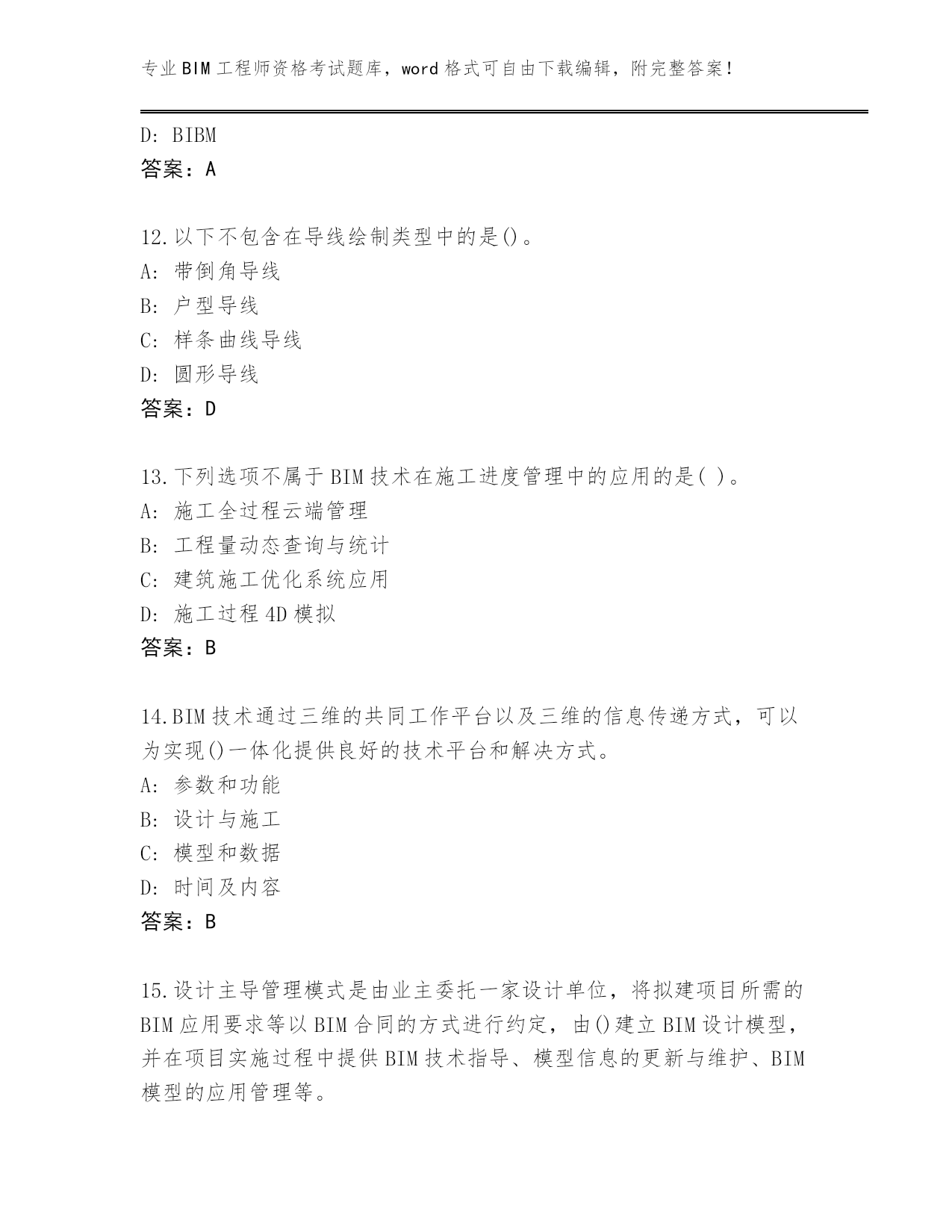专业BIM工程师资格考试题库,word格式可自由下载编辑,附完整答案!2024年山东省宁阳县BIM工程师资格考试通关秘籍题库A4版第I部分单选题(100题)1.下面哪一项不属于桥梁模型的连接节点?()A:鞍座B:桥塔C:桥台D:承台答案:B2.()指的是基于BIM模型中的空间信息,实现对疏散线路和环境危险之间隐藏关系的识别,从而降低应急决策制定的不确定性。A:租赁管理B:公共安全管理C:资产管理D:能耗管理答案:B3.管线优化时,机电专业从上到下在管廊的垂直分布顺序是()。A:电气—暖通—给水排水B:电气—给水排水—暖通C:暖通—给水排水—电气D:暖通—电气—给水排水答案:D4.下列关于IFC标准介绍正确的是()。A:IFC标准是开放的建筑产品数据表达与交换的国际标准B:IFC标准是多家厂商软件间的数据交换基础C:IFC标准是一种计算机语言D:IFC标准是我国自定义标准答案:A5.BIM教育类工程师主要可分为高校讲师及()。A:战略制定人员B:信息应用人员C:培训机构讲师D:产品研发人员答案:C6.钢筋翻样是在()的基础上进行钢筋的详细设计。A:建筑模型B:结构模型C:机电模型D:场地模型答案:B7.根据《建筑工程设计信息模型分类和编码标准》,何情况下,均应保持这样一个规则:无论使用大于号还是小于号,符号开口的方向()概念更重要的那个分类物项。A:宜朝向B:可背向C:必须背向D:必须朝向答案:D8.下列四项IFC框架层中能被其中另外三层引用,属于IFC模型结构中最基本的是()。A:核心层B:资源层C:领域层D:共享层答案:B9.BIM技术在场地规划中的应用主要包括场地分析和()。A:场地模拟B:整体规划C:景观策划D:建筑物定位答案:B10.通常情况下对族文件管理时,一级根目录是参考什么分类的?()A:族类型B:族的用途C:族类别D:族的形式答案:C11.信息技术的发展使基于BIM的物联网资产管理系统可以通过在()的资产标签芯片中注入依用户需要的详细参数信息和定期提醒设置,同时结合三维虚拟实体的BIM技术使资产在智慧建筑物中的定位和相关参数信息一目了然,可以精确定位、快速查阅。A:RFIDB:IFRTC:RGIBD:BIBM答案:A12.以下不包含在导线绘制类型中的是()。A:带倒角导线B:户型导线C:样条曲线导线D:圆形导线答案:D13.下列选项不属于BIM技术在施工进度管理中的应用的是()。A:施工全过程云端管理B:工程量动态查询与统计C:建筑施工优化系统应用D:施工过程4D模拟答案:B14.BIM技术通过三维的共同工作平台以及三维的信息传递方式,可以为实现()一体化提供良好的技术平台和解决方式。A:参数和功能B:设计与施工C:模型和数据D:时间及内容答案:B15.设计主导管理模式是由业主委托一家设计单位,将拟建项目所需的BIM应用要求等以BIM合同的方式进行约定,由()建立BIM设计模型,并在项目实施过程中提供BIM技术指导、模型信息的更新与维护、BIM模型的应用管理等。A:业主单位B:设计单位C:施工单位D:咨询单位答案:B16.BIM在虚拟施工管理中的应用不包括()。A:专项施工管理B:施工过程模拟C:深化设计D:场地布置模拟答案:C17.下列选项中,不属于Revit族的分类有()。A:体量族B:内建族C:可载人族D:系统族答案:A18.在Revit软件中,布置墙垛、装饰柱应采用()。A:钢柱B:构造柱C:建筑柱D:结构柱答案:C19.下列哪项不是链接CAD界面后可选择的颜色显示方式?()A:彩色B:保留C:反选D:黑白答案:A20.关于门的标记,说法错误的是?()A:复制并粘贴门时,标记中的门编号也不会递增B:以上均是C:当整个门可见时,会显示门标记。如果部分门被遮蔽,则门标记还是可见D:当放置相同类型的门时,标记中的门编号不会递增答案:B21.方案设计阶段的BIM应用主要是利用BIM技术对项目的()进行验证,对下一步深化工作进行推导和方案细化。A:经济性B:持续性C:合理性D:可行性答案:D22.模型详细程度用详细等级(LOD)划分,基础在LOD()不用表示。A:100B:以上均不正确C:100和200D:100、200和300答案:A23.关于模型拆分原则表述错误的是()。A:按照房间使用属性拆分B:按照楼层拆分C:按照专业拆分,如土建模型、机电模型、幕墙模型D:按照楼号拆分答案:A24.基于BIM技术的高度可视化、协同性和()的特性,建筑师在概念设计阶段可实现在设计思路上的快速精确表达的同时实现与各领域工程师无障碍信息交流与传递,从而实现了设计初期的质量、信息管理的可视化和协同化。A:易操控性B:兼容性C:集成性D:参数化答案:D25.工作集协作模式的使用条件是()。A:需要有服务器存储设备及同一网络,建立统