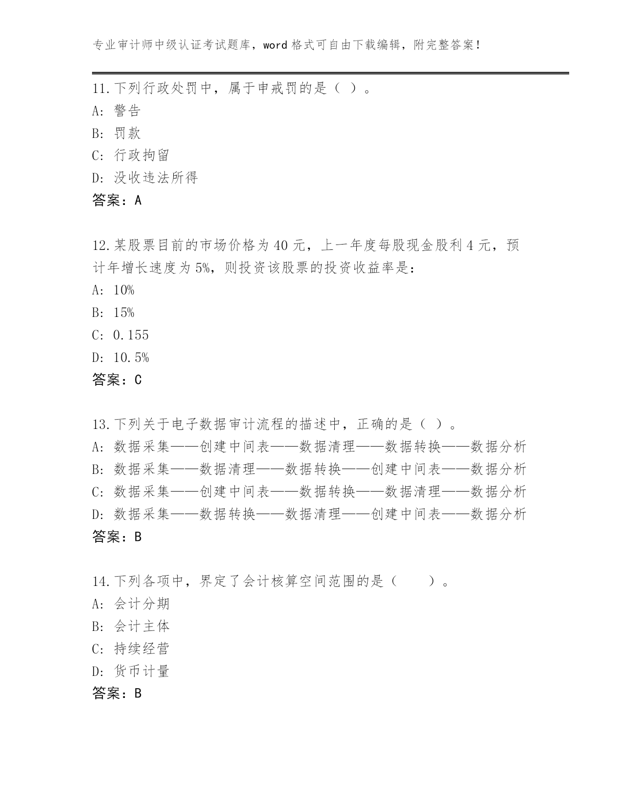 专业审计师中级认证考试题库,word格式可自由下载编辑,附完整答案!山西省侯马市2023-2024年审计师中级认证考试王牌题库(网校专用)第I部分单选题(100题)1.已知无风险报酬率为4%,某投资项目的风险报酬系数为12%,标准离差率为40%,则该投资项目的必要投资报酬率是()A:0.064B:0.088C:0.136D:0.16答案:B2.用于评价企业盈利能力的总资产报酬率指标中的“报酬”是指()。A:利润总额B:营业利润C:息税前利润D:净利润答案:C3.被审计单位作出了不恰当会计估计,但所涉金额远远低于重要性水平,在不考虑其他因素的情况下,注册会计师应出具的审计报告类型是()A:无保留意见的审计报告B:否定意见的审计报告C:保留意见的审计报告D:带强调事项段的无保留意见的审计报告答案:A4.审计人员从总体规模数量为1000,账面金额为1000000元存货项目中,抽取规模为100的样本,经过对这100个样本逐一实施审计程序后得到样本实际审定金额为90000元,账面金额为100000元。采用单位均值估计抽样方法,估计的总体实际金额为()元。A:910000B:890000C:1000000D:900000答案:D5.社会审计人员在财务报表审计中对内部控制进行初评后,认为应该测试内部控制有效的情况是()。A:内部控制风险极低B:内部控制的设置极不健全C:管理当局极不重视内部控制建立工作D:难以对内部控制的健全性做出评价答案:A6.下列有关财务预算的表述中,正确的是()。A:财务预算报表只能反映企业部分业务情况B:财务预算报表主要服务于企业外部利益相关者C:财务预算报表主要服务于企业管理者D:财务预算报表与实际财务报表的作用相同答案:C7.下列哪一项不属于内部审计报告的基本要素的是()。A:正文B:审计依据C:收件人D:标题答案:B8.某企业的变动成本率为60%,资本成本为10%,年度赊销收入为1000万元,平均收账期为30天,一年按360天计算,则该企业应收账款的机会成本是:A:7万元B:17万元C:5万元D:12万元答案:C9.对审计全过程中各种风险因素进行充分评估分析的为基础的审计取证模式是()。A:账目基础审计B:制度基础审计C:风险基础审计D:数据基础审计答案:C10.审计业务活动及其相关的职能活动是()。A:审计管理的客体B:审计管理的主体C:审计管理的特征D:审计管理的内容答案:A11.下列行政处罚中,属于申戒罚的是()。A:警告B:罚款C:行政拘留D:没收违法所得答案:A12.某股票目前的市场价格为40元,上一年度每股现金股利4元,预计年增长速度为5%,则投资该股票的投资收益率是:A:10%B:15%C:0.155D:10.5%答案:C13.下列关于电子数据审计流程的描述中,正确的是()。A:数据采集——创建中间表——数据清理——数据转换——数据分析B:数据采集——数据清理——数据转换——创建中间表——数据分析C:数据采集——创建中间表——数据转换——数据清理——数据分析D:数据采集——数据转换——数据清理——创建中间表——数据分析答案:B14.下列各项中,界定了会计核算空间范围的是()。A:会计分期B:会计主体C:持续经营D:货币计量答案:B15.甲公司接受一项设备安装劳务,该劳务可以一次完成。同行业劳务收入标准为110000元,但双方合同总价款规定为100000元,实际发生安装成本60000元。该安装劳务属于甲公司的主营业务,假设不考虑相关税费,甲公司应确认的主营业务收入的金额为()元。A:0B:60000C:100000D:110000答案:C16.审计证据的适当性指的是()A:可靠性和相关性B:经济性和可靠性C:经济性和相关性D:可分性和可靠性答案:A17.下列各项中,符合消费税纳税义务发生时间规定的是()。A:采取分期收款方式销售的应税消费品,纳税义务发生时间为实际收到销售款的当天B:进口的应税消费品,纳税义务发生时间为报关进口的当天C:采取预收货款结算方式的,为收到预收款的当天D:采取赊销方式销售化妆品,合同规定收款日为10月2日,实际收到货款为11月2日,其纳税义务发生时间为11月2日答案:B18.对所采集到的被审计单位的源数据,进行一系列的操作,使之规范化的过程是指()。A:数据采集B:数据分析C:数据清理D:数据转换答案:C19.企业不应低估负债或费用、高估资产或收益,体现的会计信息质量要求是:A:实质重于形式B:可理解性C:重要性D:谨慎性答案:D20.下列取证方法中,不适合进行审计抽样的是()。A:分析B:函证C:检查实物资产D:重新计算答案:A21.下列关于风险报酬率的计算公式,正确的是()。A:风险报酬率=风险报酬系数×期望收益率B:风险报酬率=风险报酬系数×标准离差率C:风险报酬率=