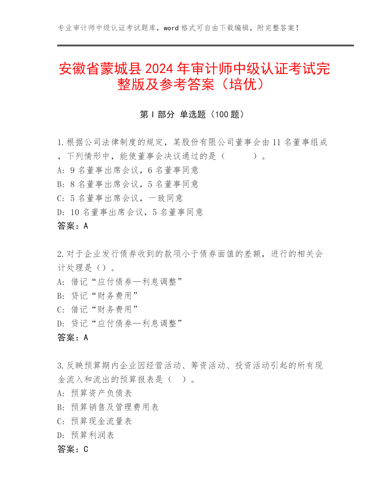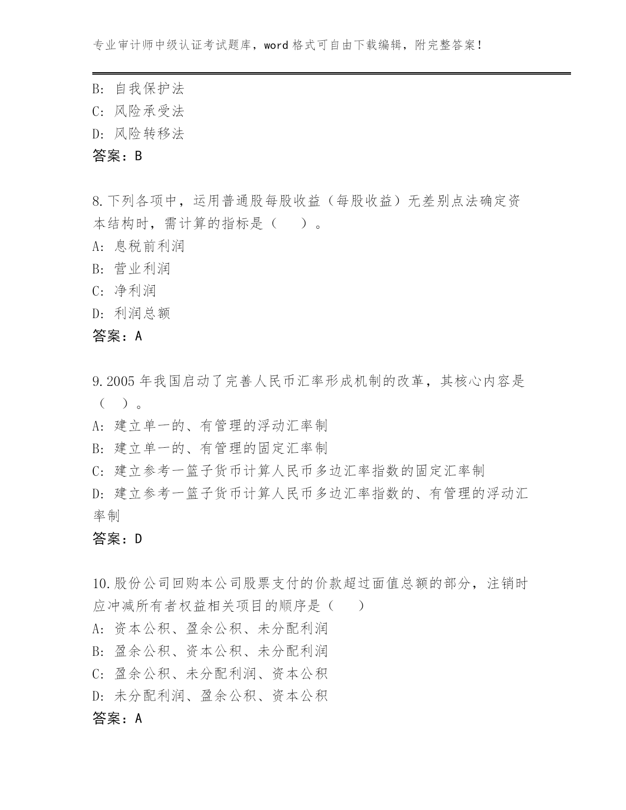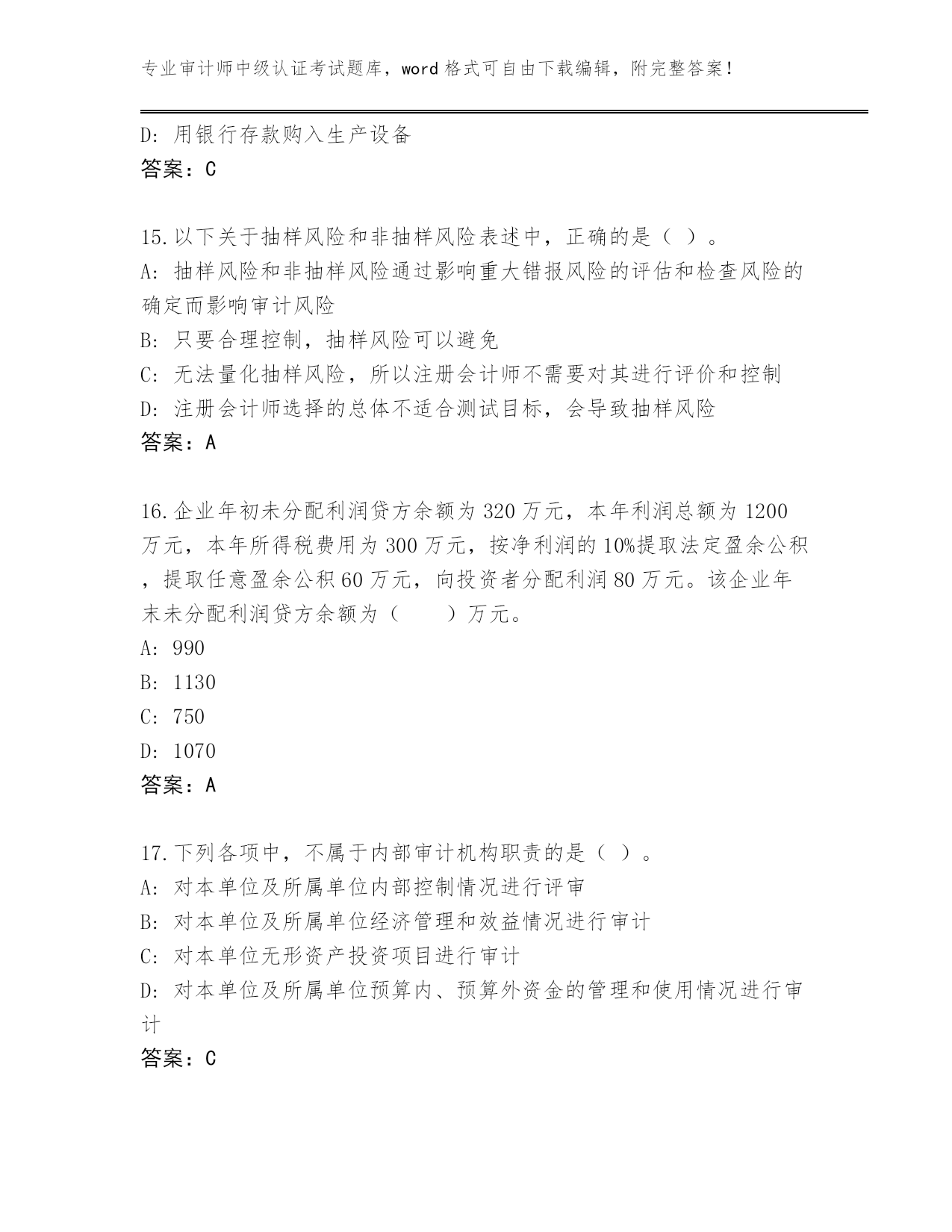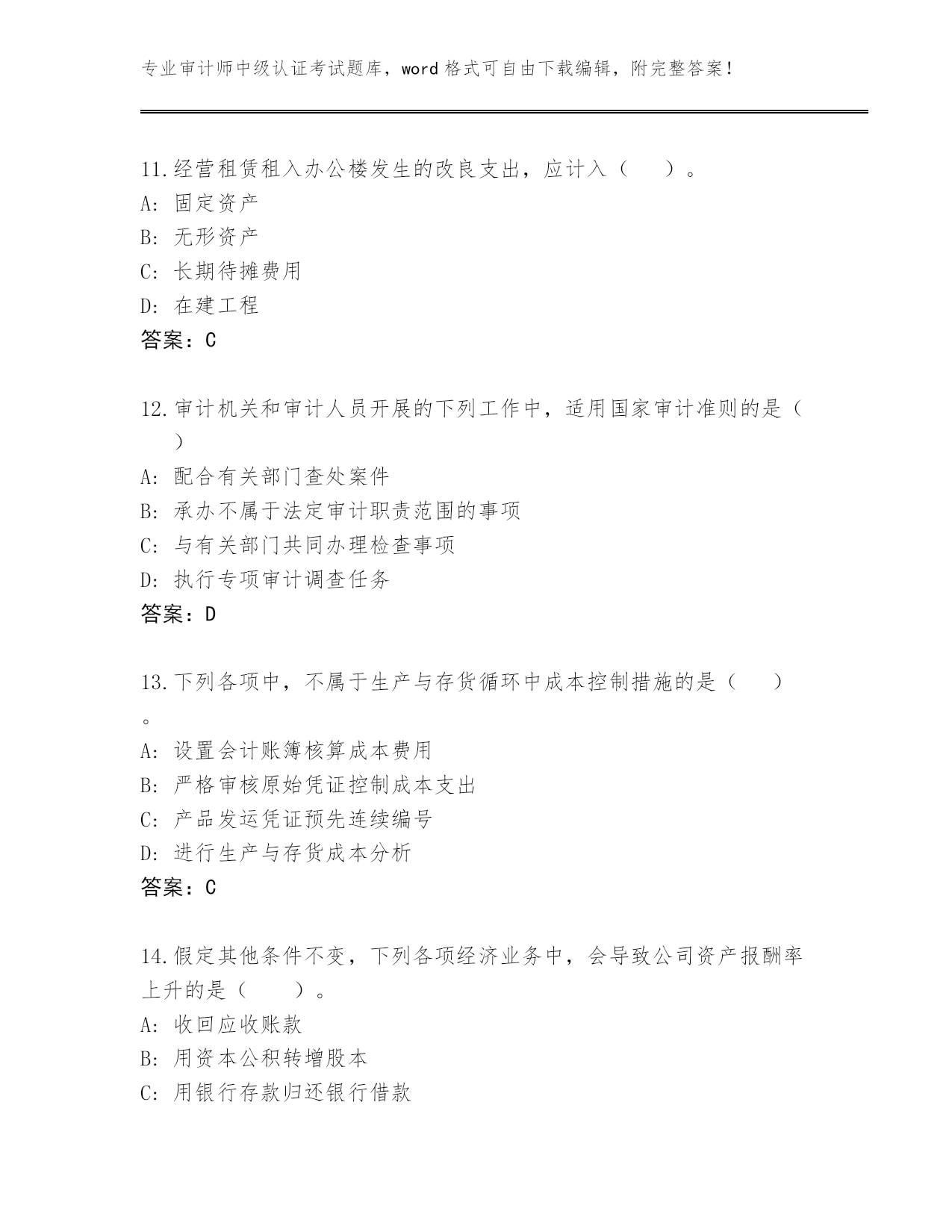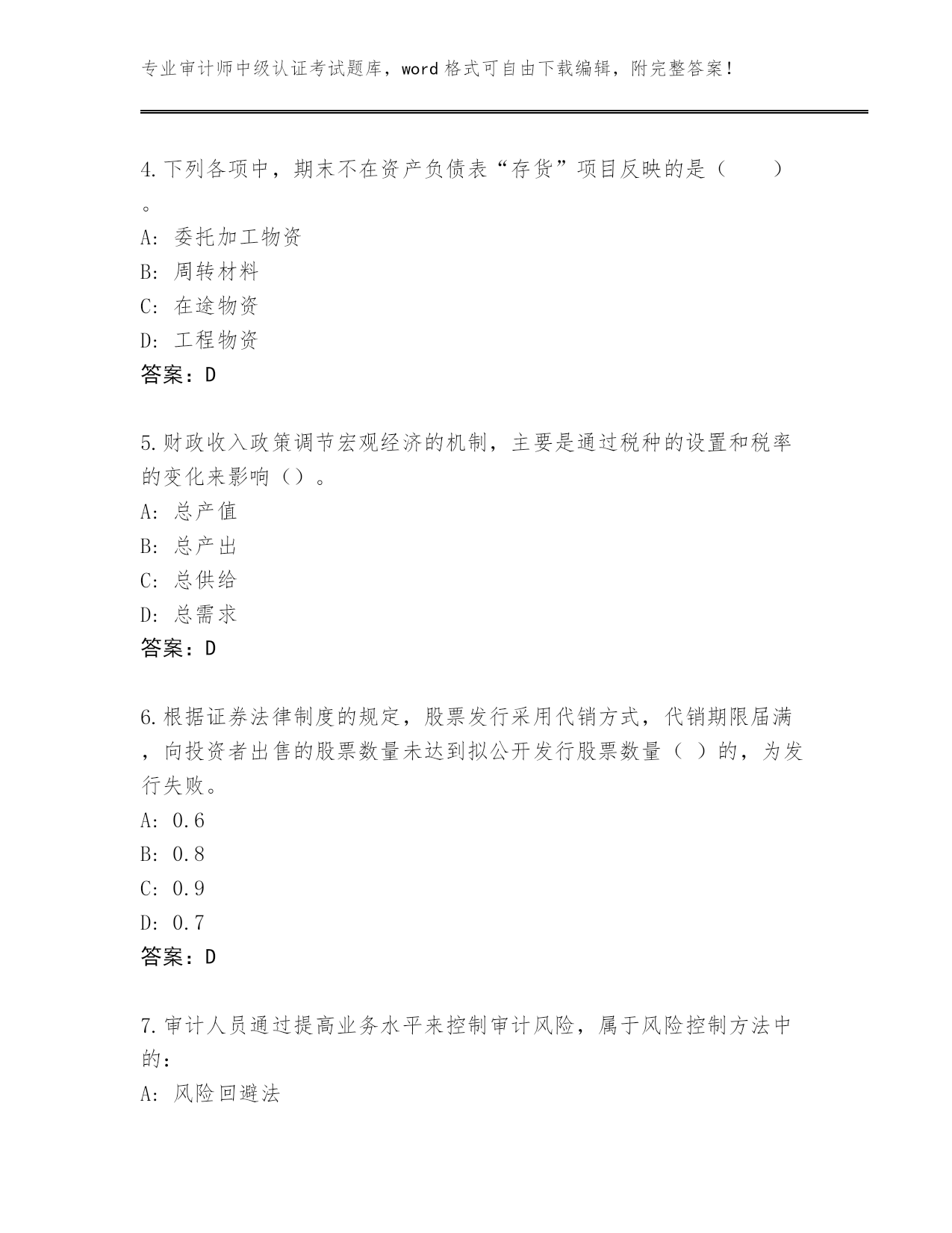 专业审计师中级认证考试题库,word格式可自由下载编辑,附完整答案!安徽省蒙城县2024年审计师中级认证考试完整版及参考答案(培优)第I部分单选题(100题)1.根据公司法律制度的规定,某股份有限公司董事会由11名董事组成,下列情形中,能使董事会决议通过的是()。A:9名董事出席会议,6名董事同意B:8名董事出席会议,5名董事同意C:5名董事出席会议,一致同意D:10名董事出席会议,5名董事同意答案:A2.对于企业发行债券收到的款项小于债券面值的差额,进行的相关会计处理是()。A:借记“应付债券—利息调整”B:贷记“财务费用”C:借记“财务费用”D:贷记“应付债券—利息调整”答案:A3.反映预算期内企业因经营活动、筹资活动、投资活动引起的所有现金流入和流出的预算报表是()。A:预算资产负债表B:预算销售及管理费用表C:预算现金流量表D:预算利润表答案:C4.下列各项中,期末不在资产负债表“存货”项目反映的是()。A:委托加工物资B:周转材料C:在途物资D:工程物资答案:D5.财政收入政策调节宏观经济的机制,主要是通过税种的设置和税率的变化来影响()。A:总产值B:总产出C:总供给D:总需求答案:D6.根据证券法律制度的规定,股票发行采用代销方式,代销期限届满,向投资者出售的股票数量未达到拟公开发行股票数量()的,为发行失败。A:0.6B:0.8C:0.9D:0.7答案:D7.审计人员通过提高业务水平来控制审计风险,属于风险控制方法中的:A:风险回避法B:自我保护法C:风险承受法D:风险转移法答案:B8.下列各项中,运用普通股每股收益(每股收益)无差别点法确定资本结构时,需计算的指标是()。A:息税前利润B:营业利润C:净利润D:利润总额答案:A9.2005年我国启动了完善人民币汇率形成机制的改革,其核心内容是()。A:建立单一的、有管理的浮动汇率制B:建立单一的、有管理的固定汇率制C:建立参考一篮子货币计算人民币多边汇率指数的固定汇率制D:建立参考一篮子货币计算人民币多边汇率指数的、有管理的浮动汇率制答案:D10.股份公司回购本公司股票支付的价款超过面值总额的部分,注销时应冲减所有者权益相关项目的顺序是()A:资本公积、盈余公积、未分配利润B:盈余公积、资本公积、未分配利润C:盈余公积、未分配利润、资本公积D:未分配利润、盈余公积、资本公积答案:A11.经营租赁租入办公楼发生的改良支出,应计入()。A:固定资产B:无形资产C:长期待摊费用D:在建工程答案:C12.审计机关和审计人员开展的下列工作中,适用国家审计准则的是()A:配合有关部门查处案件B:承办不属于法定审计职责范围的事项C:与有关部门共同办理检查事项D:执行专项审计调查任务答案:D13.下列各项中,不属于生产与存货循环中成本控制措施的是()。A:设置会计账簿核算成本费用B:严格审核原始凭证控制成本支出C:产品发运凭证预先连续编号D:进行生产与存货成本分析答案:C14.假定其他条件不变,下列各项经济业务中,会导致公司资产报酬率上升的是()。A:收回应收账款B:用资本公积转增股本C:用银行存款归还银行借款D:用银行存款购入生产设备答案:C15.以下关于抽样风险和非抽样风险表述中,正确的是()。A:抽样风险和非抽样风险通过影响重大错报风险的评估和检查风险的确定而影响审计风险B:只要合理控制,抽样风险可以避免C:无法量化抽样风险,所以注册会计师不需要对其进行评价和控制D:注册会计师选择的总体不适合测试目标,会导致抽样风险答案:A16.企业年初未分配利润贷方余额为320万元,本年利润总额为1200万元,本年所得税费用为300万元,按净利润的10%提取法定盈余公积,提取任意盈余公积60万元,向投资者分配利润80万元。该企业年末未分配利润贷方余额为()万元。A:990B:1130C:750D:1070答案:A17.下列各项中,不属于内部审计机构职责的是()。A:对本单位及所属单位内部控制情况进行评审B:对本单位及所属单位经济管理和效益情况进行审计C:对本单位无形资产投资项目进行审计D:对本单位及所属单位预算内、预算外资金的管理和使用情况进行审计答案:C18.下列年金中,只能计算现值、不能计算终值的是()A:永续年金B:普通年金C:预付年金D:延递年金答案:A19.在审计过程中,由于审计程序设计和使用不当,审计方法选择不合理,审计人员工作疏忽等原因造成的审计风险属于()。A:信赖不足风险B:抽样风险C:非抽样风险D:误拒风险答案:C20.把技术进步看作是生产要素之一的国际贸易理论是()A:新贸易理论B:绝对优势学说C:比较成本理论D:相对优势学说答案:A21.下列关于计算机技术对审计产生影响的表述,错误的是()A:审计的信息化程度越来越高B:信息系统成为审计对象的重要组成部分C:审